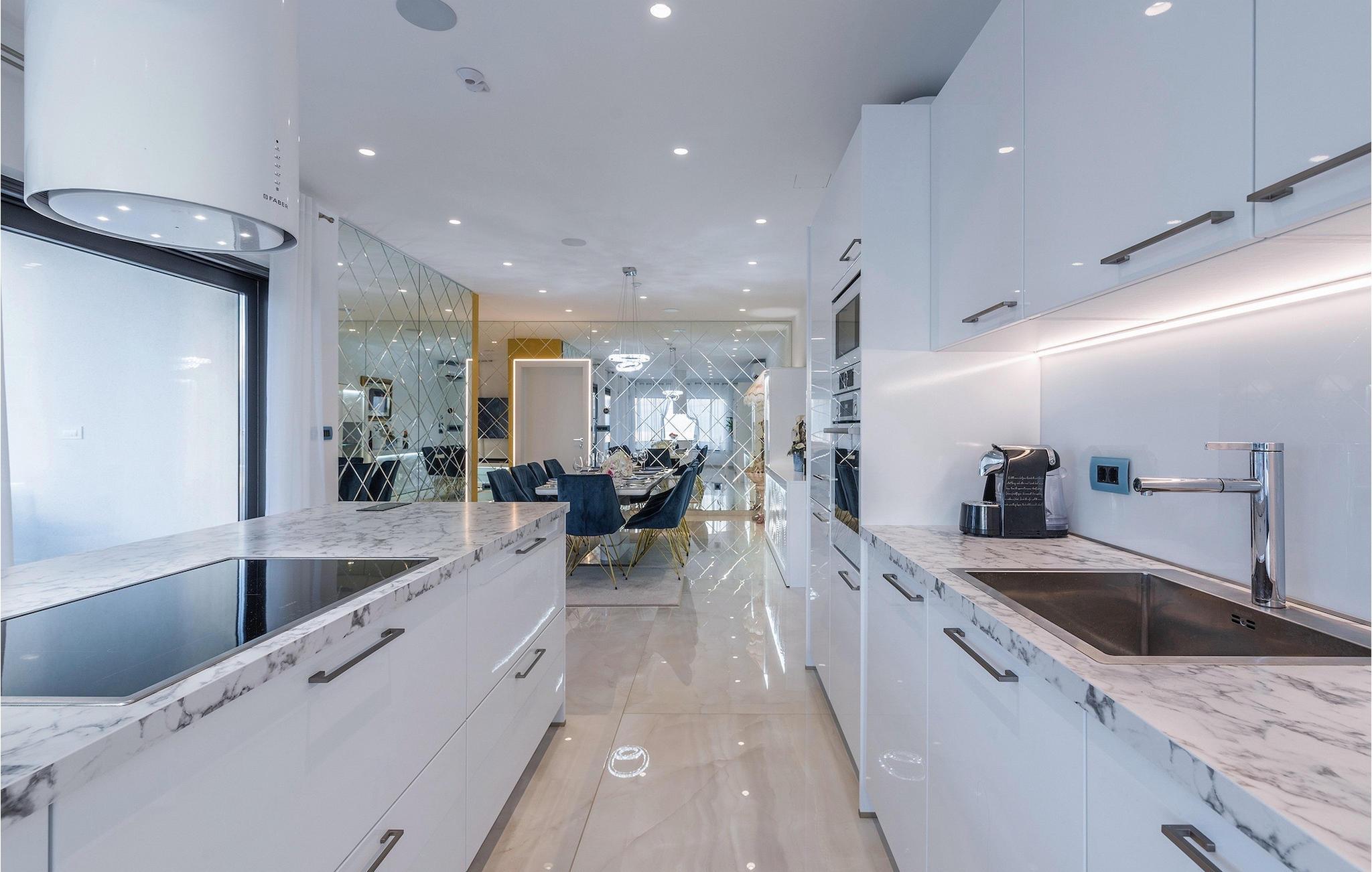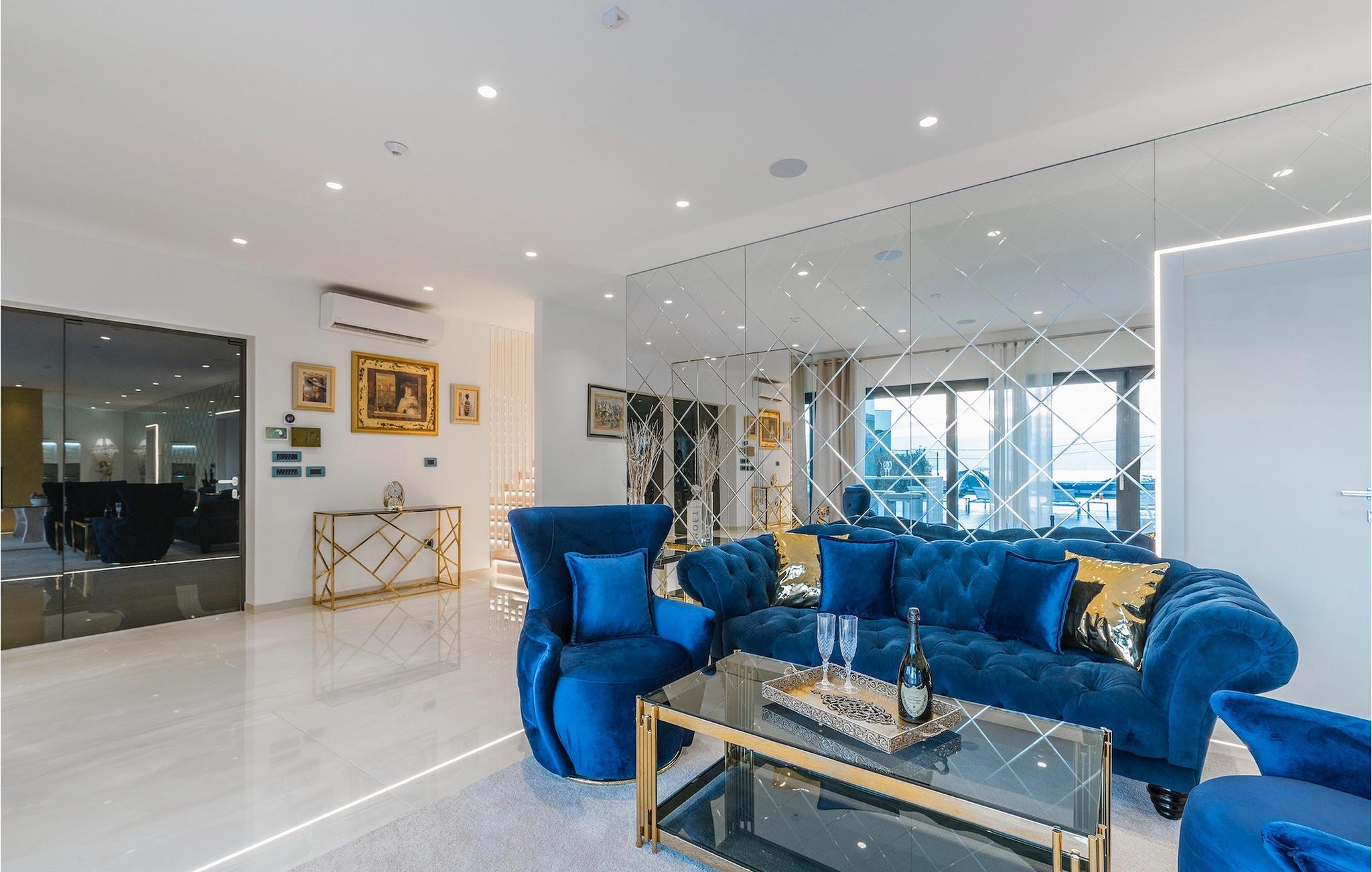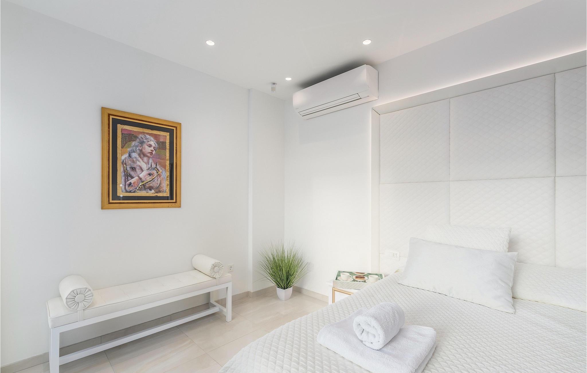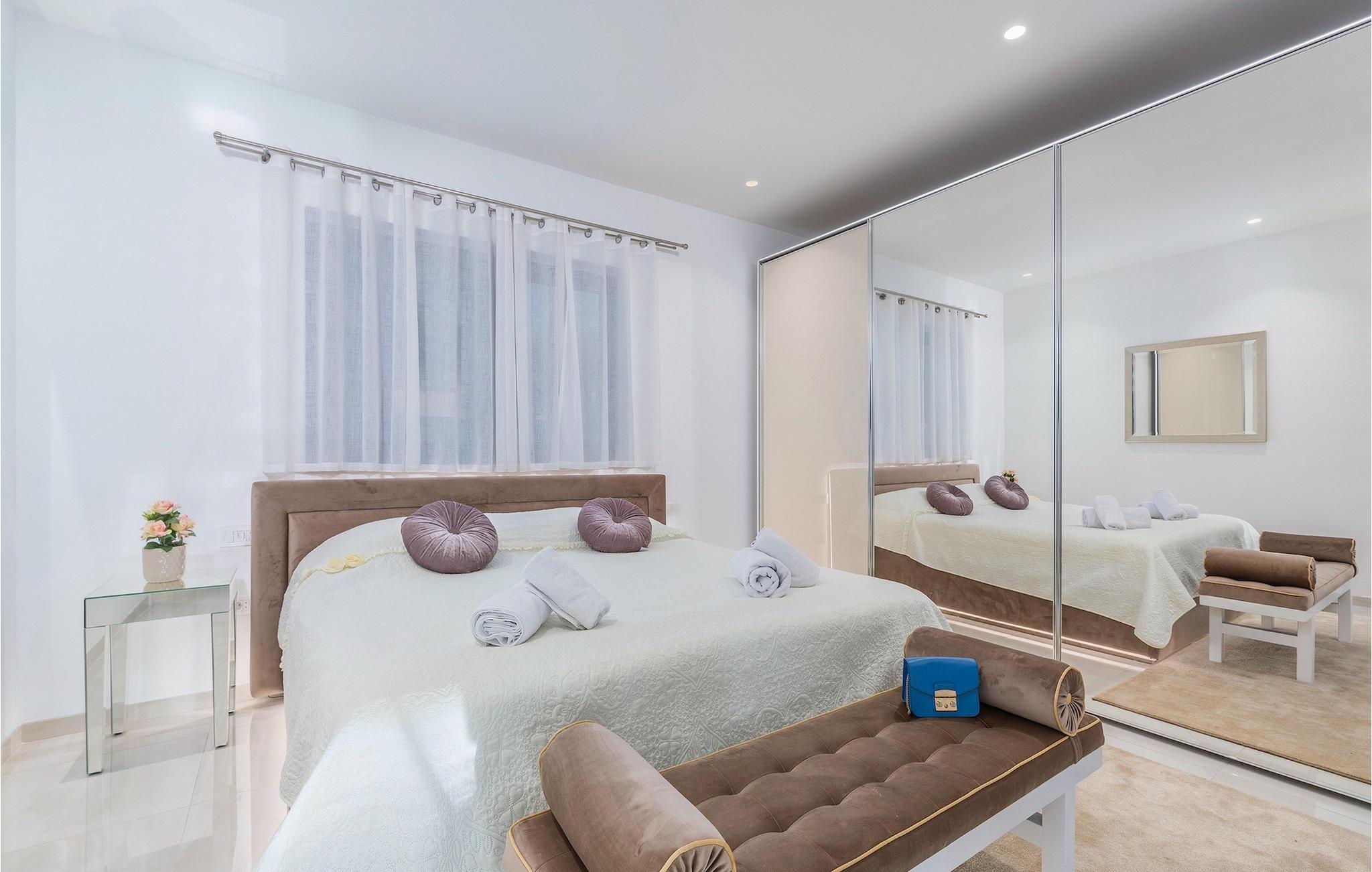 Går du inn i villaen via terrassen, kommer du inn i den moderne, lyse stuen med spiseplass og fullt utstyrt kjøkken. Interiøret er møblert og innredet med mange interessante detaljer, og er også en wow-effekt! I første etasje er det to store, komfortable soverom med dobbeltsenger. Ytterligere tre elegante soverom i andre etasje lover avslappende søvn og vakre drømmer. Alle soverommene er individuelt og smakfullt innredet og har eget, vakkert bad, TV og klimaanlegg.