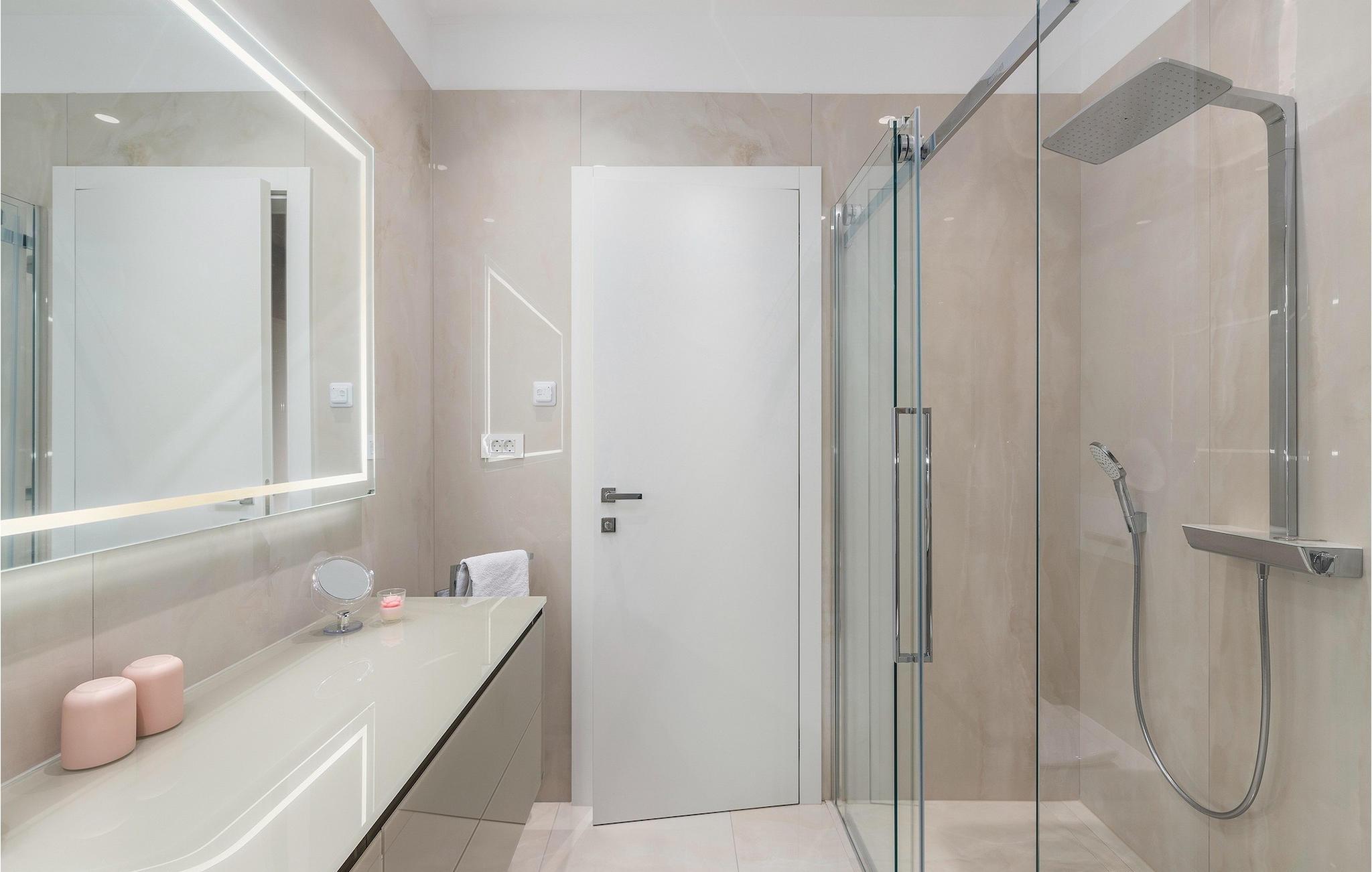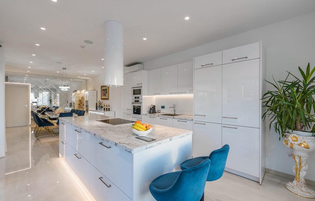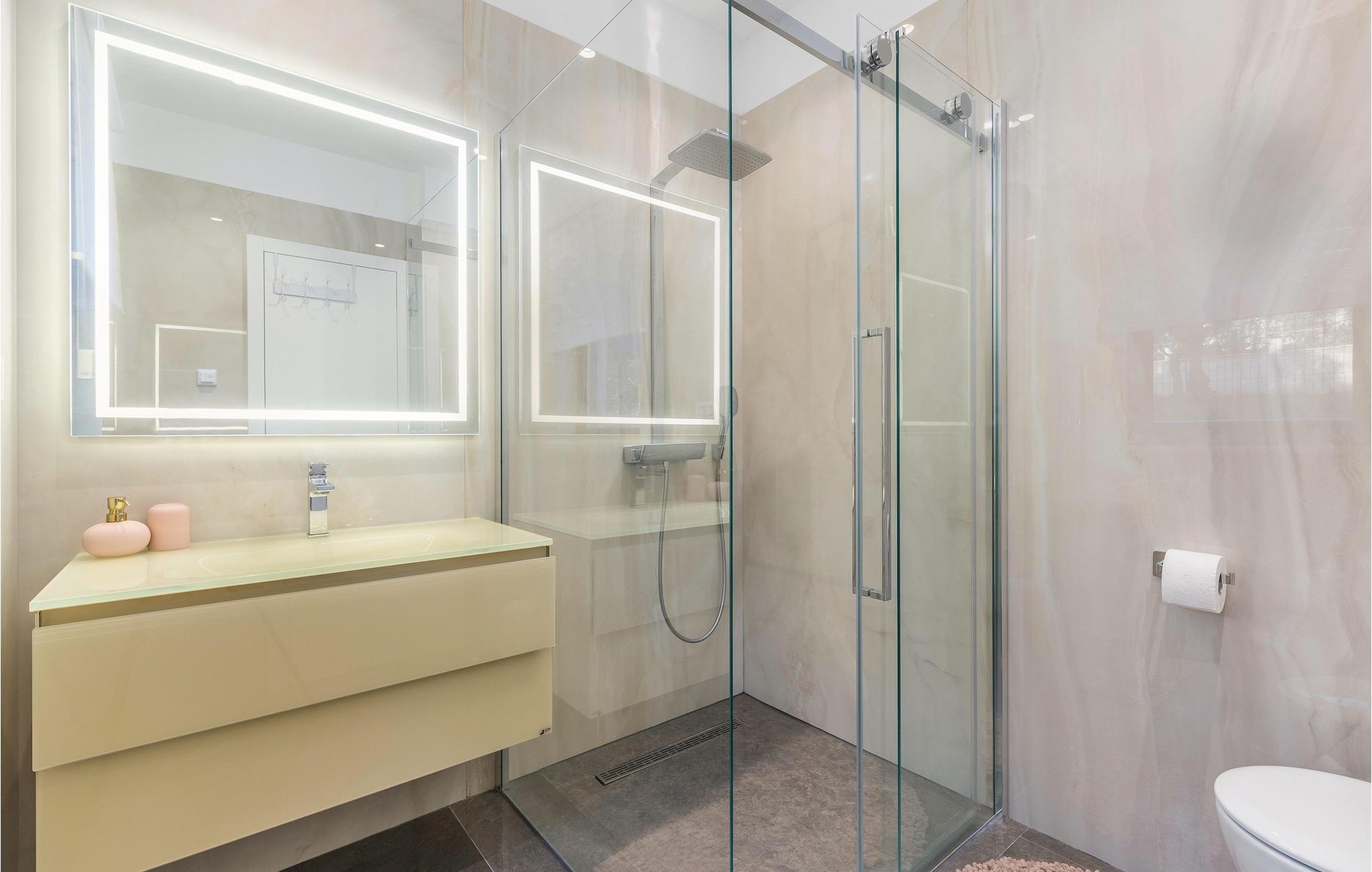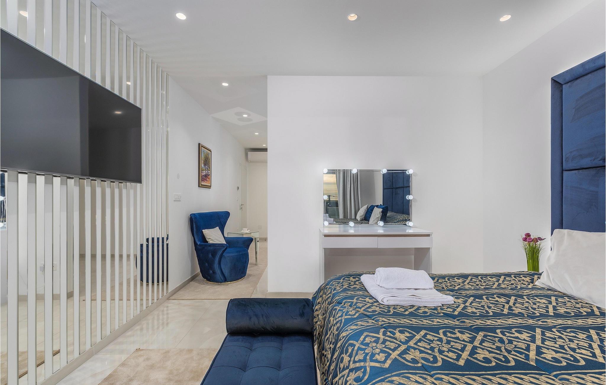 Går du inn i villaen via terrassen, kommer du inn i den moderne, lyse stuen med spiseplass og fullt utstyrt kjøkken. Interiøret er møblert og innredet med mange interessante detaljer, og er også en wow-effekt! I første etasje er det to store, komfortable soverom med dobbeltsenger. Ytterligere tre elegante soverom i andre etasje lover avslappende søvn og vakre drømmer. Alle soverommene er individuelt og smakfullt innredet og har eget, vakkert bad, TV og klimaanlegg.