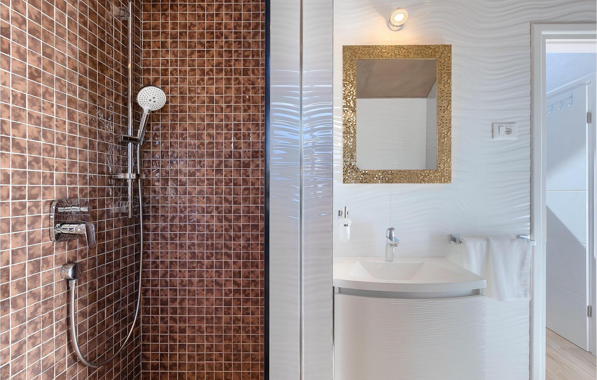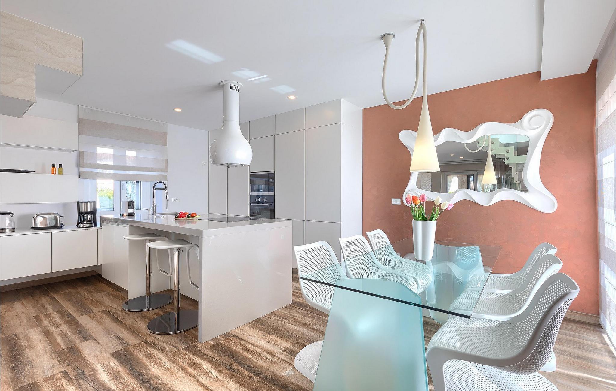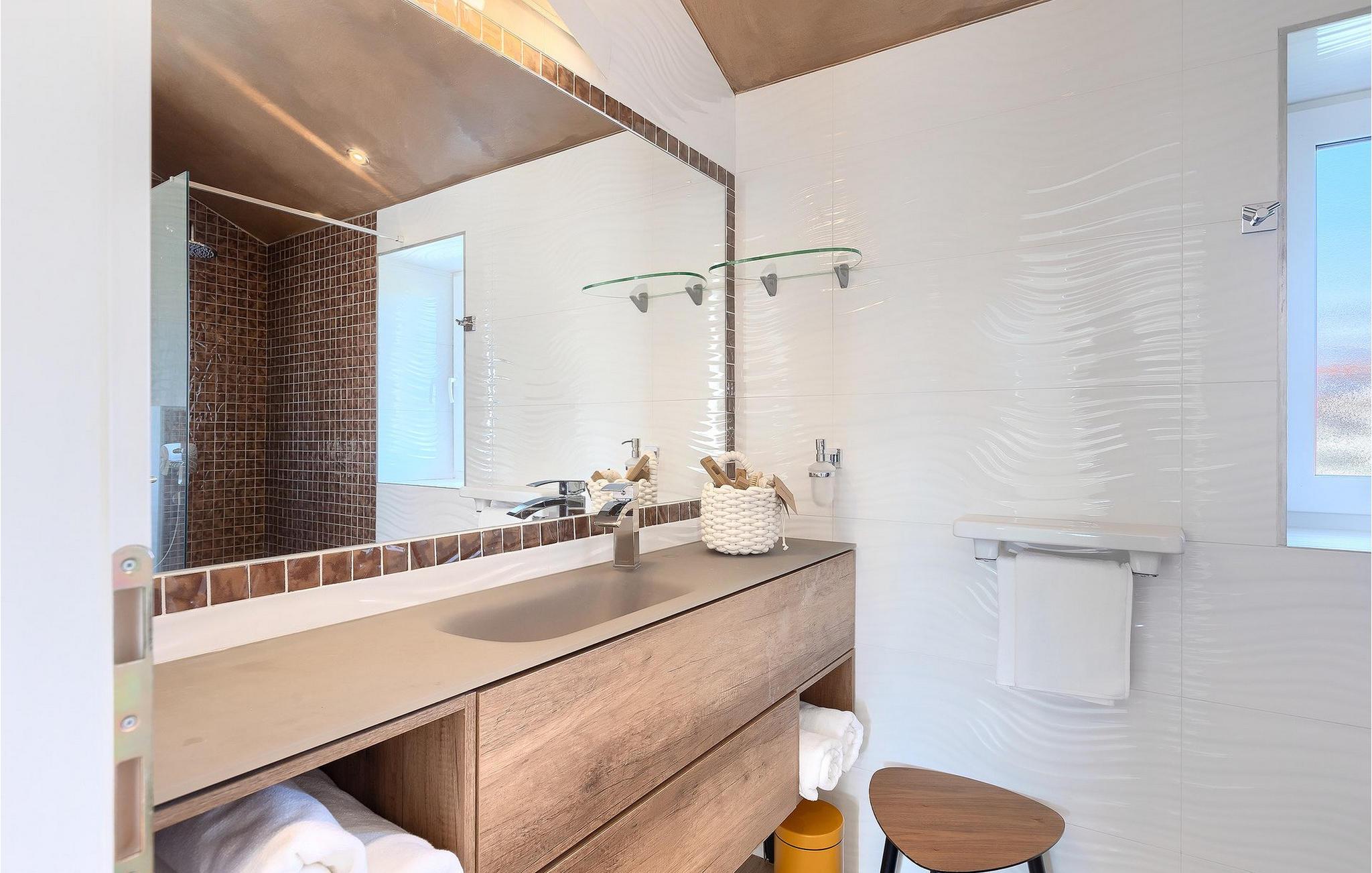 Herfra kommer du inn i det moderne, lyse og fullt klimatiserte interiøret, der stue, spisestue og det velutstyrte kjøkkenet ligger på ett plan sammen med gjestetoalett og vaskerom. I øverste etasje kan du tilbringe rolige netter i 3 komfortable soverom, inkludert 2 bad med dusj. To av soverommene har komfortable dobbeltsenger, mens barnerommet har to enkeltsenger og en uttrekkbar ekstraseng.