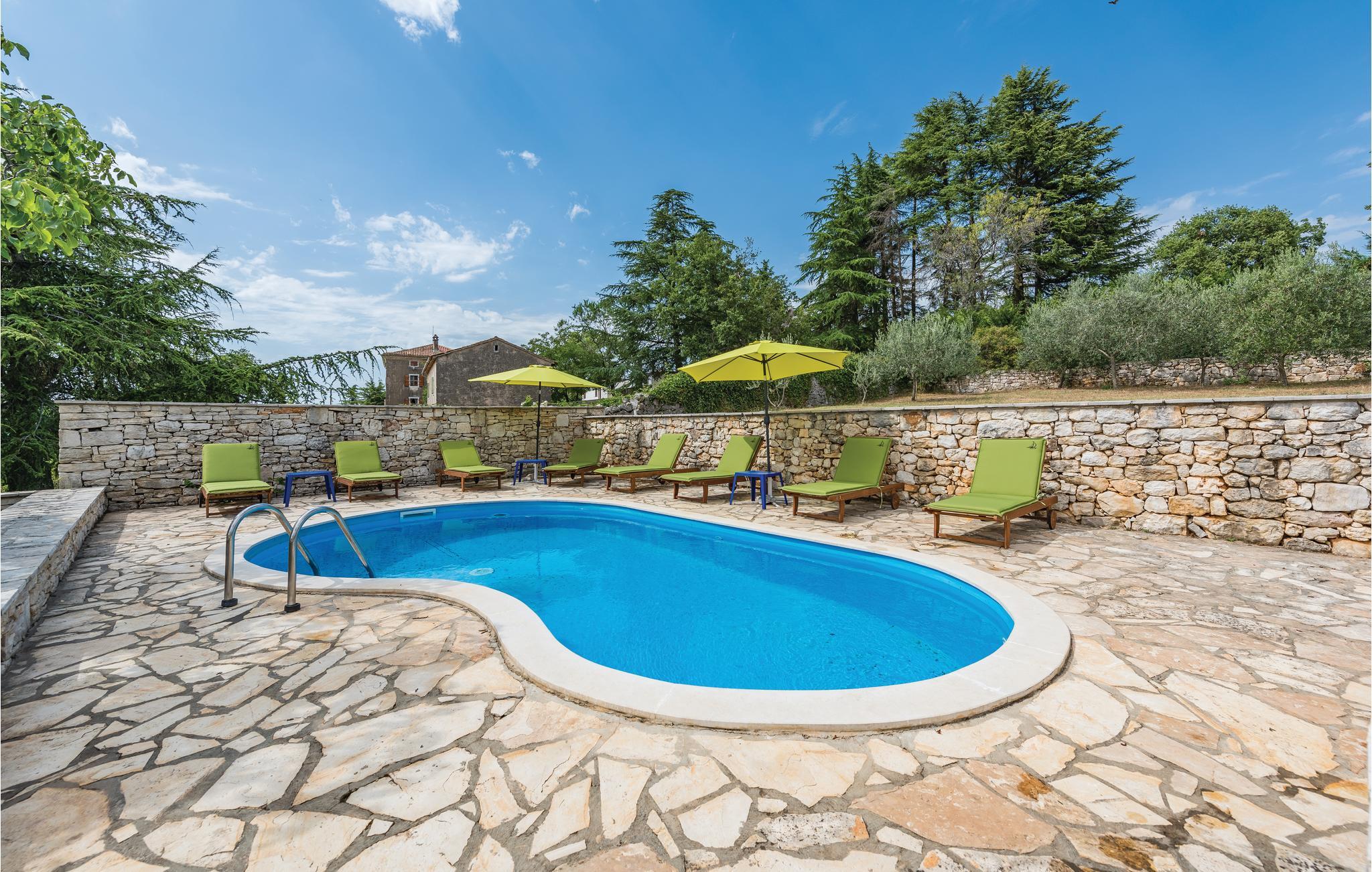 Dette vakre, tradisjonelle feriehuset venter på deg på en høyde i landsbyen Markovac. Det er romslig og komfortabelt og designet i landets typiske stil. I første etasje er det en tradisjonell taverna for felles måltider og sosialt samvær, som kalles "Istarska Konoba" på kroatisk. På grunn av den tradisjonelle konstruksjonen er det et behagelig klima i huset, ettersom varmen knapt trenger gjennom steinveggene. Soverommene, stuen og badet ligger i øverste etasje. Gårdsplassen er lagt ut i flere platåer, med svømmebassenget på det øvre platået.
