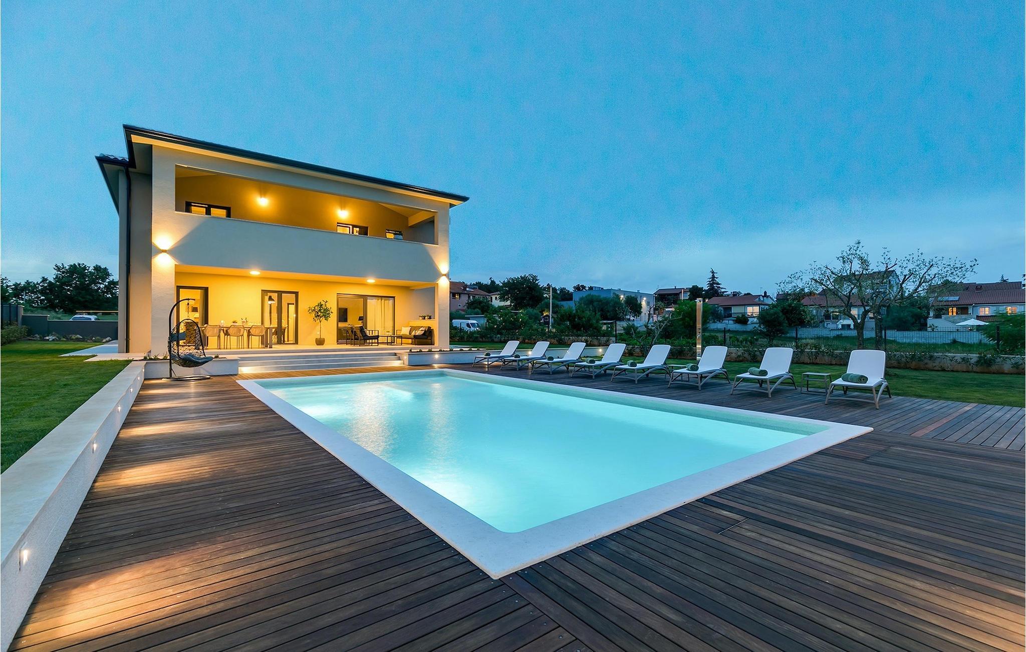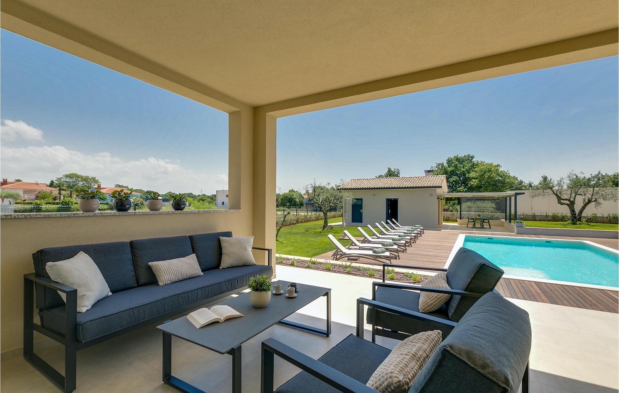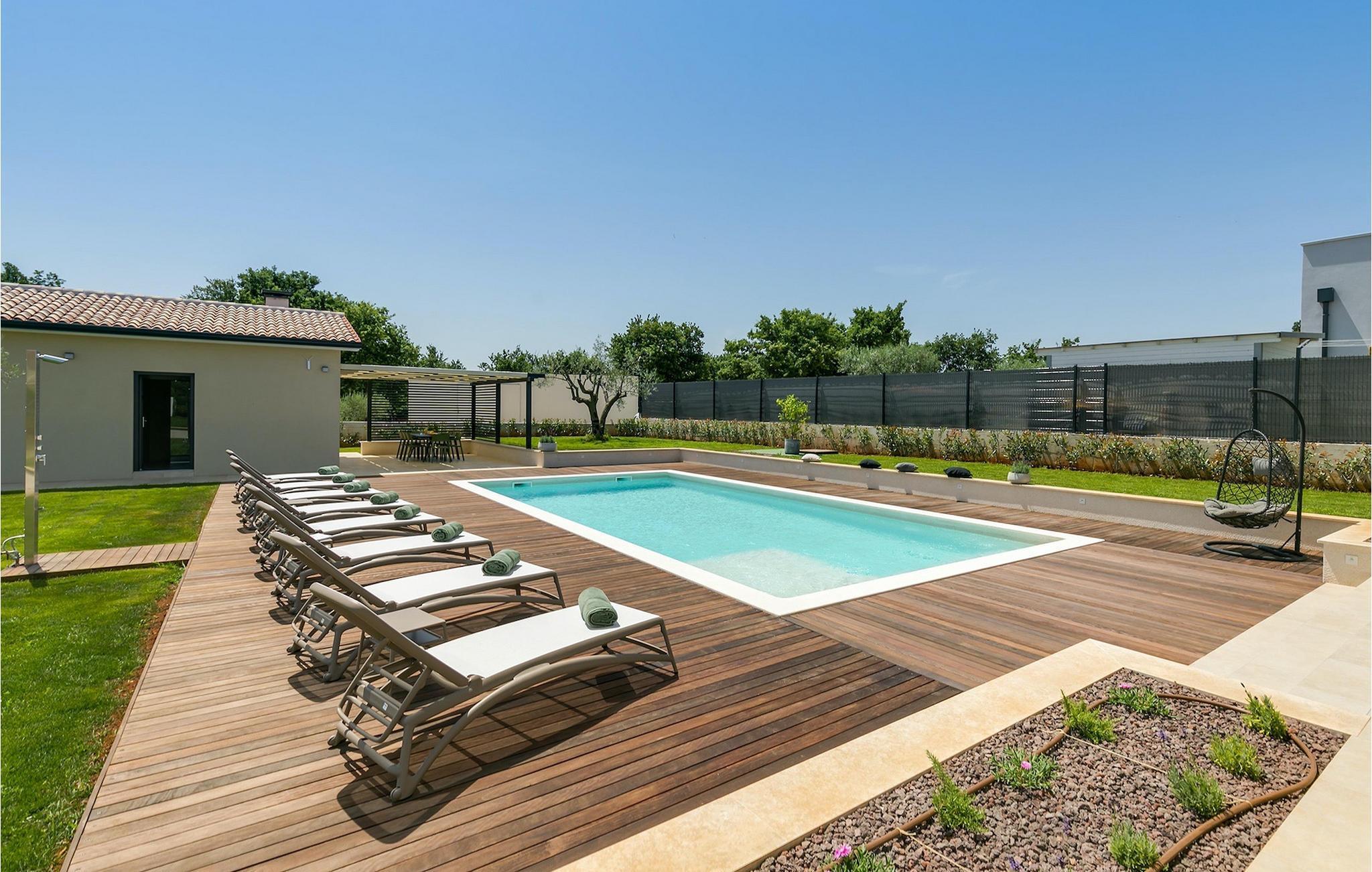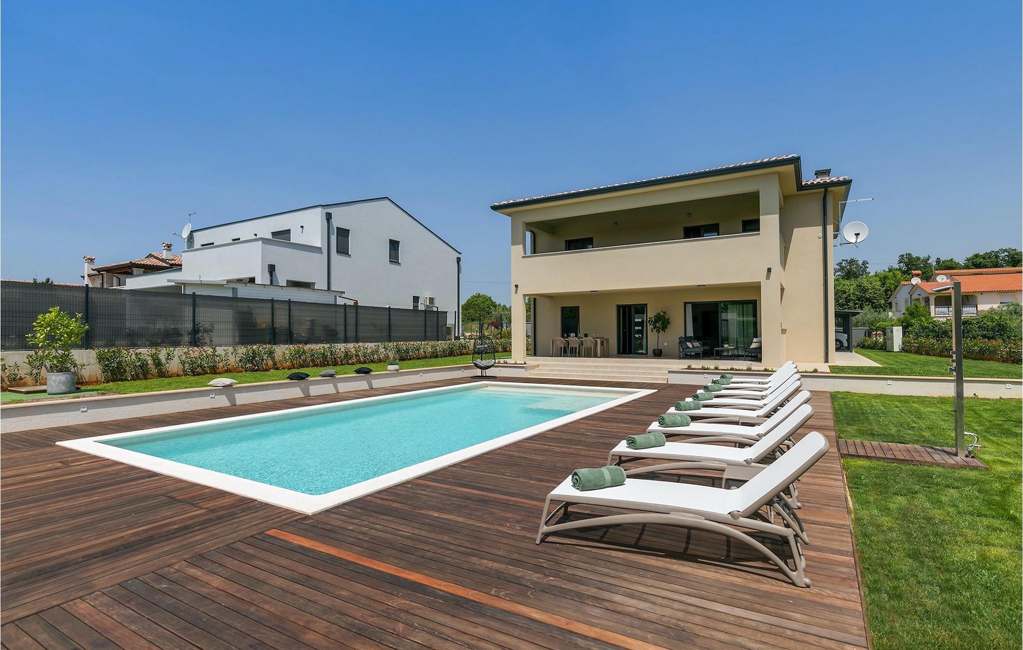 Alle soverommene har klimaanlegg og TV, og tre av soverommene ligger i første etasje. Første etasje har åpen planløsning med en koselig stue og direkte utgang til uteområdet og det store bassenget. Stuen går over i den lyse og omsorgsfullt utformede spisestuen. Her finner du også et svært moderne kjøkken som er fullt utstyrt for alle kulinariske behov. For enkelhets skyld er det et soverom til med eget bad i første etasje. Uteserveringen er perfekt for avslappende stunder mens familie og venner nyter de lokalt inspirerte rettene som tilberedes på sommerkjøkkenet. Det store bassenget sørger for forfriskninger på varme dager. Ikke kast bort tiden - bestill ferien i denne moderne drømmevillaen nå! Villa Amoroso ligger bare en kort kjøretur fra Porec, en av de største kystbyene i Istria. Porec er definitivt mer enn bare sol og sjø - det er en by med en lang og rik historie som går helt tilbake til Romerriket. Når du er i Porec, bør du besøke Eufrasius-basilikaen, et enestående eksempel på tidlig bysantinsk arkitektur i Middelhavsområdet. Basilikaen har stått på UNESCOs verdensarvliste siden 1997. Ta en spasertur gjennom byens smale gater, besøk byens museer og gallerier og nyt den avslappede byatmosfæren. De nærmeste strendene ligger bare 4 km fra villaen, og du kan velge mellom en rekke strender avhengig av hva du foretrekker. Porec byr også på mange restauranter og barer - valget er ditt! Gå ikke glipp av å besøke det indre av Istria, med sine mange middelalderbyer som ligger på åsene, som Motovun, Buzet og Groznjan. Ta en fottur gjennom de mange vingårdene og olivenlundene og nyt Istrias natur.