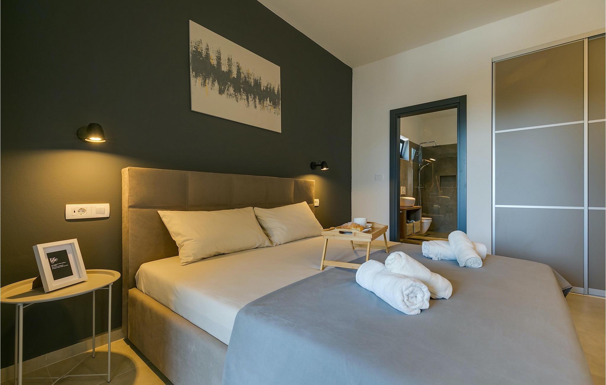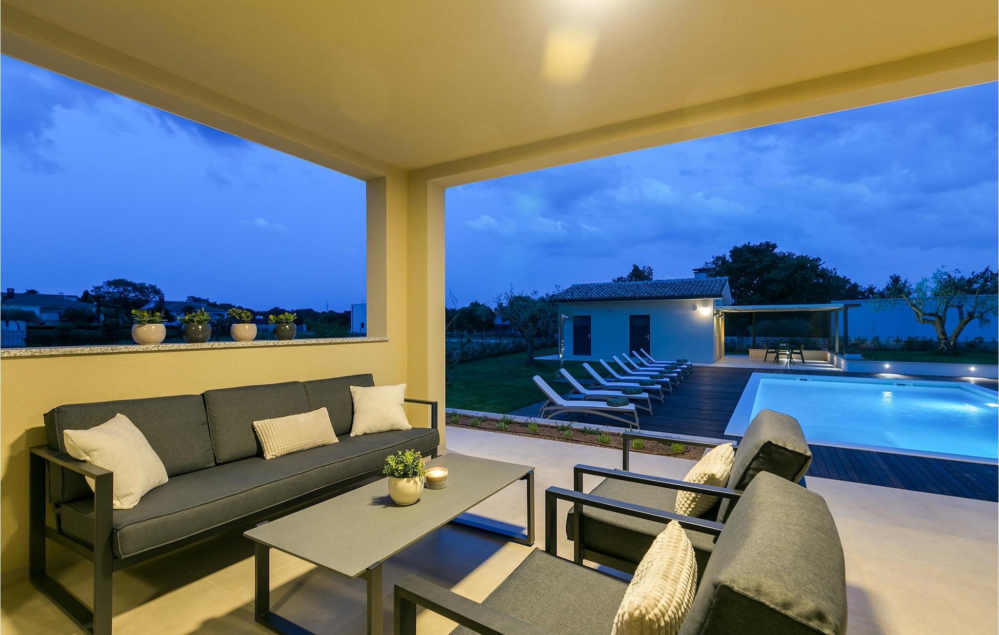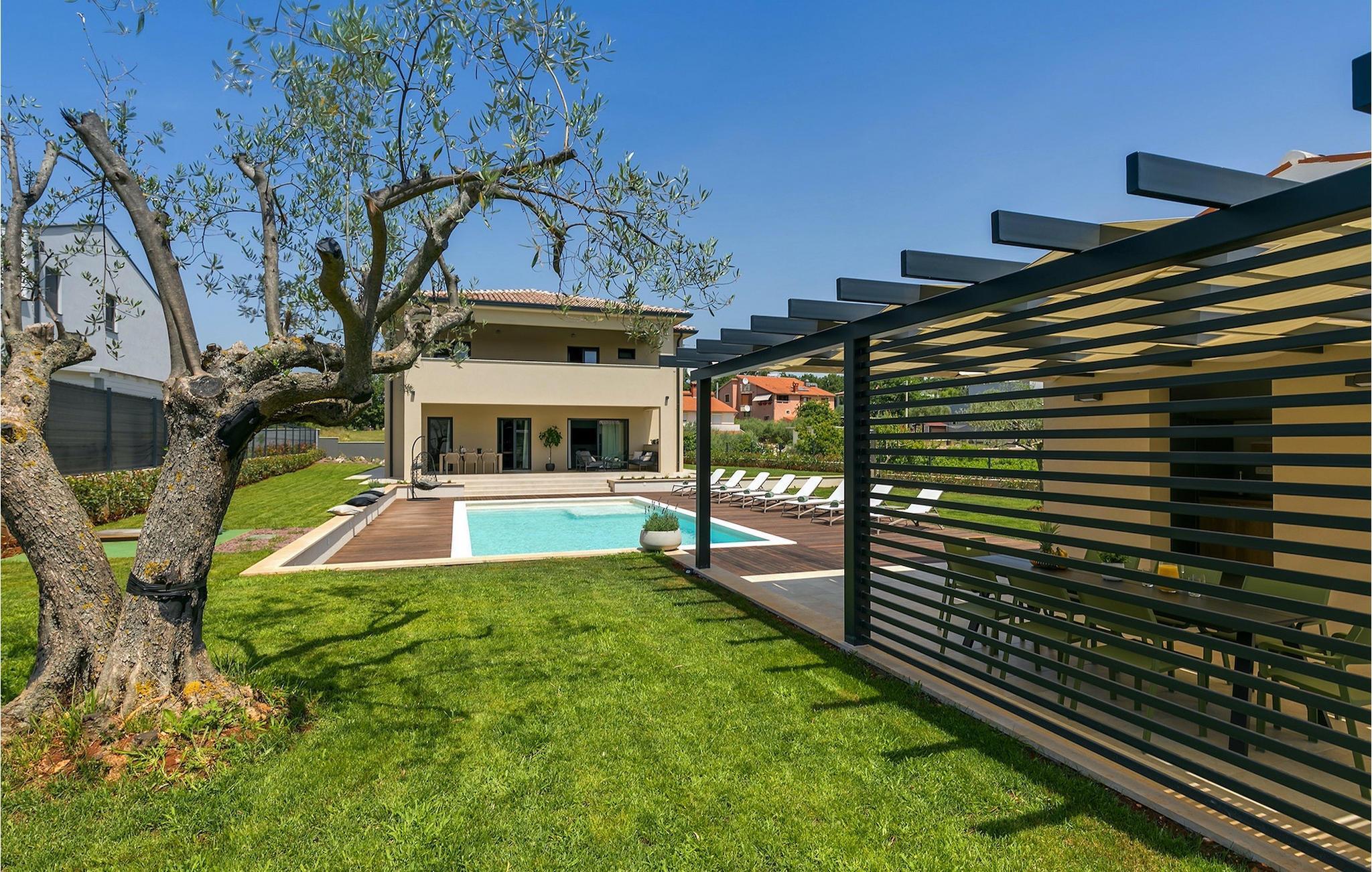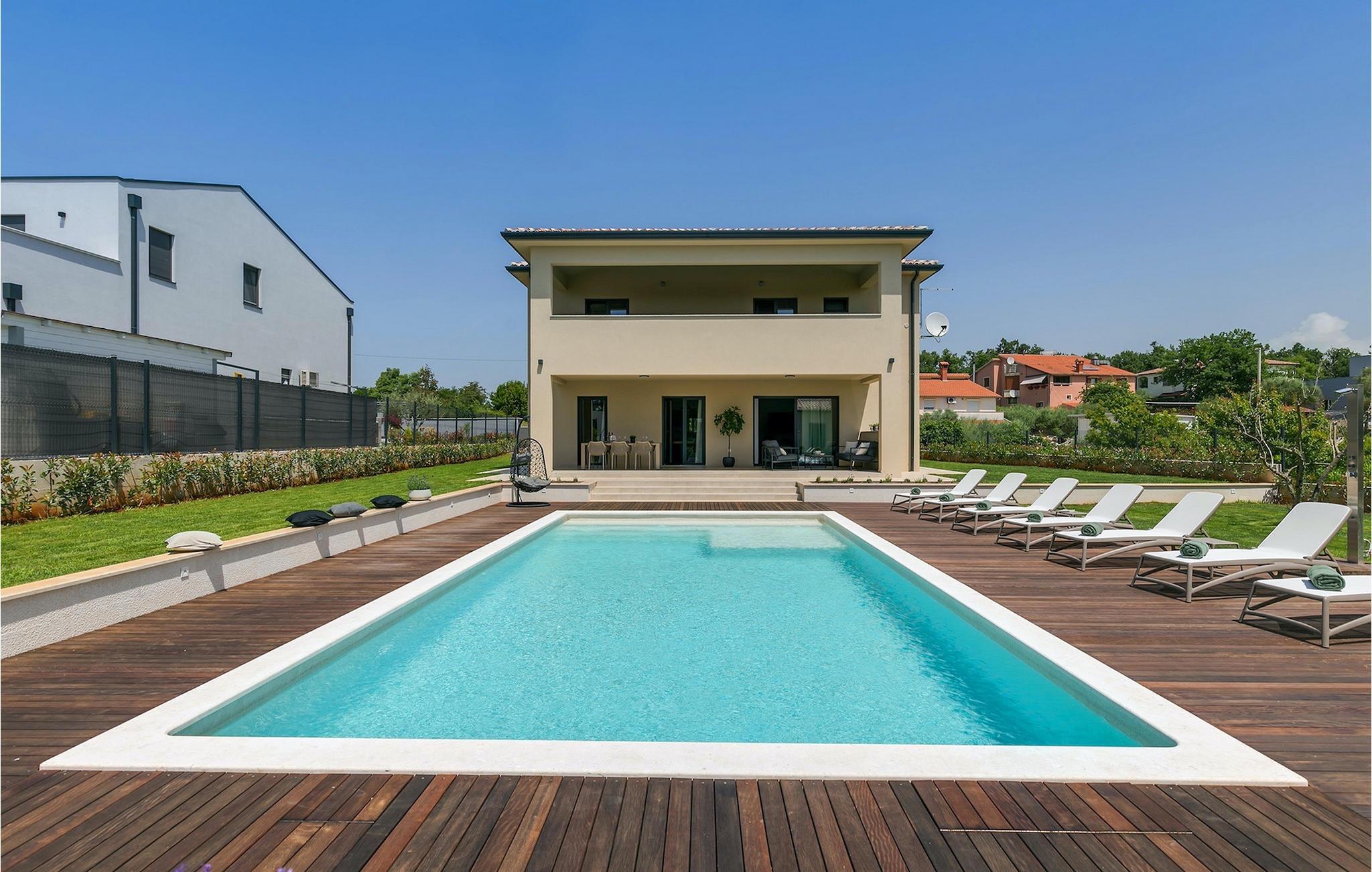Alle soverommene har klimaanlegg og TV, og tre av soverommene ligger i første etasje. Første etasje har åpen planløsning med en koselig stue og direkte utgang til uteområdet og det store bassenget. Stuen går over i den lyse og omsorgsfullt utformede spisestuen. Her finner du også et svært moderne kjøkken som er fullt utstyrt for alle kulinariske behov. For enkelhets skyld er det et soverom til med eget bad i første etasje. Uteserveringen er perfekt for avslappende stunder mens familie og venner nyter de lokalt inspirerte rettene som tilberedes på sommerkjøkkenet. Det store bassenget sørger for forfriskninger på varme dager. Ikke kast bort tiden - bestill ferien i denne moderne drømmevillaen nå! Villa Amoroso ligger bare en kort kjøretur fra Porec, en av de største kystbyene i Istria. Porec er definitivt mer enn bare sol og sjø - det er en by med en lang og rik historie som går helt tilbake til Romerriket. Når du er i Porec, bør du besøke Eufrasius-basilikaen, et enestående eksempel på tidlig bysantinsk arkitektur i Middelhavsområdet. Basilikaen har stått på UNESCOs verdensarvliste siden 1997. Ta en spasertur gjennom byens smale gater, besøk byens museer og gallerier og nyt den avslappede byatmosfæren. De nærmeste strendene ligger bare 4 km fra villaen, og du kan velge mellom en rekke strender avhengig av hva du foretrekker. Porec byr også på mange restauranter og barer - valget er ditt! Gå ikke glipp av å besøke det indre av Istria, med sine mange middelalderbyer som ligger på åsene, som Motovun, Buzet og Groznjan. Ta en fottur gjennom de mange vingårdene og olivenlundene og nyt Istrias natur.