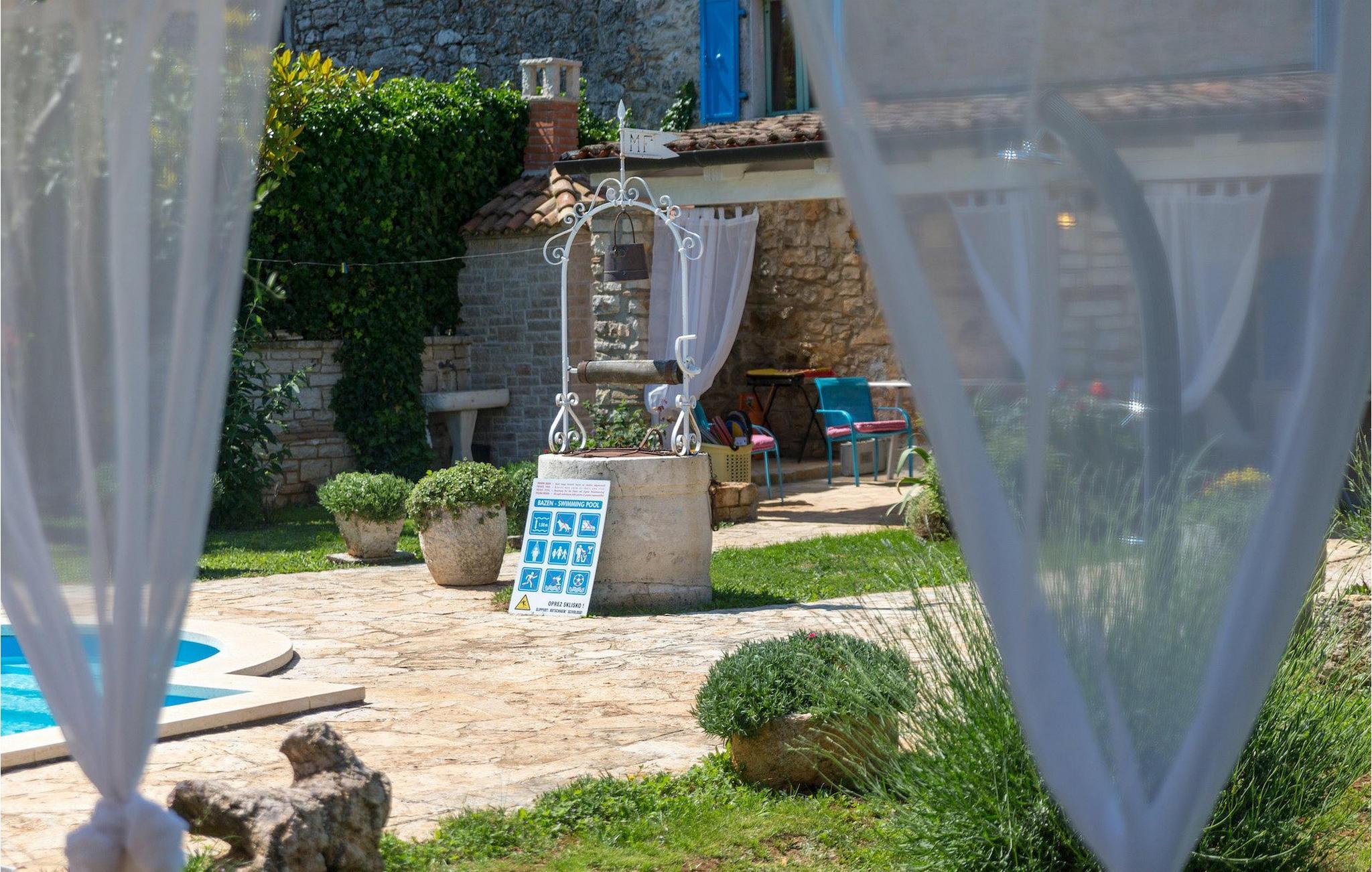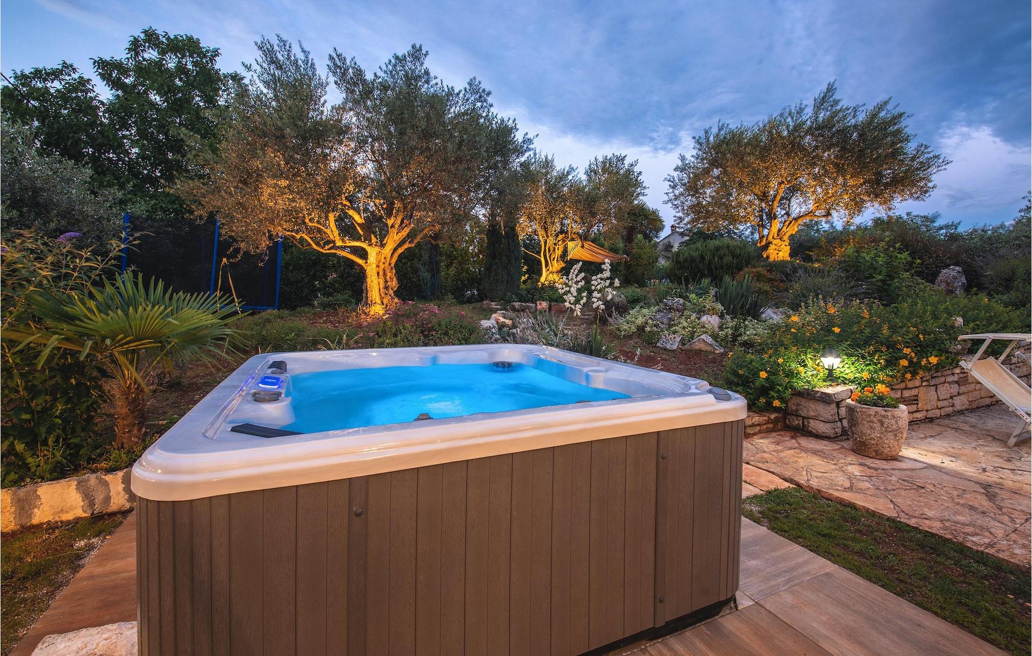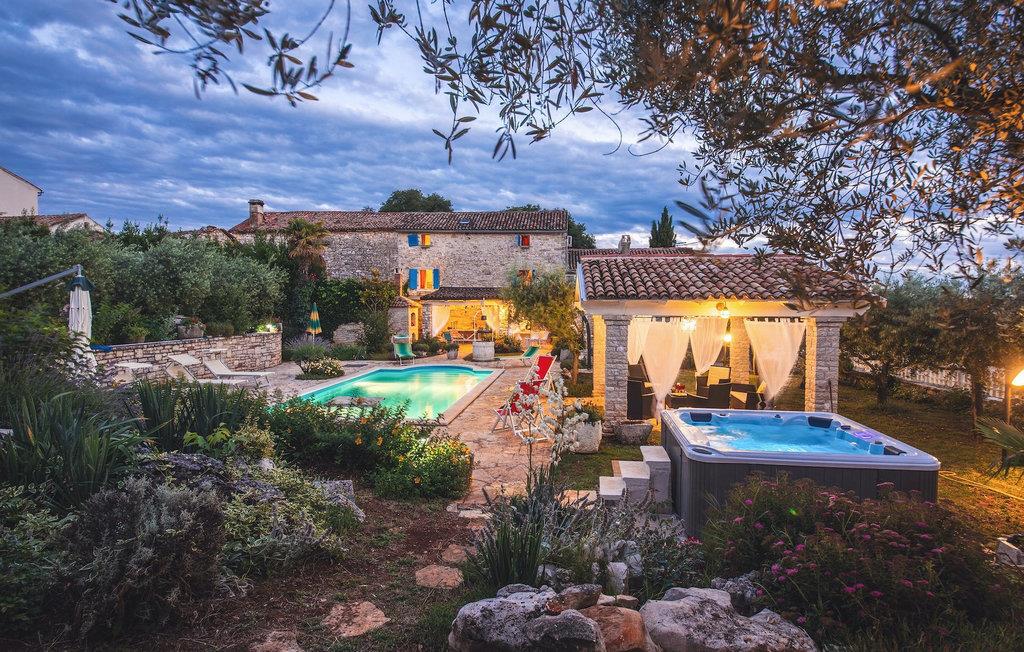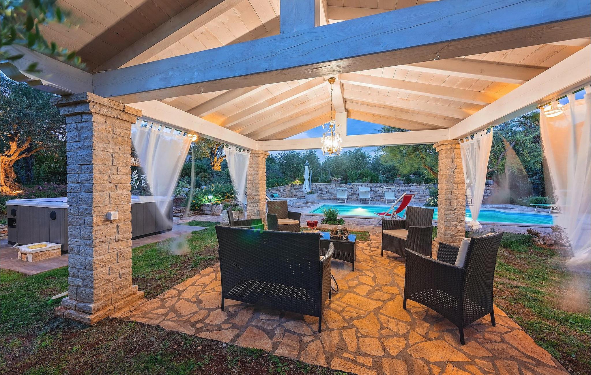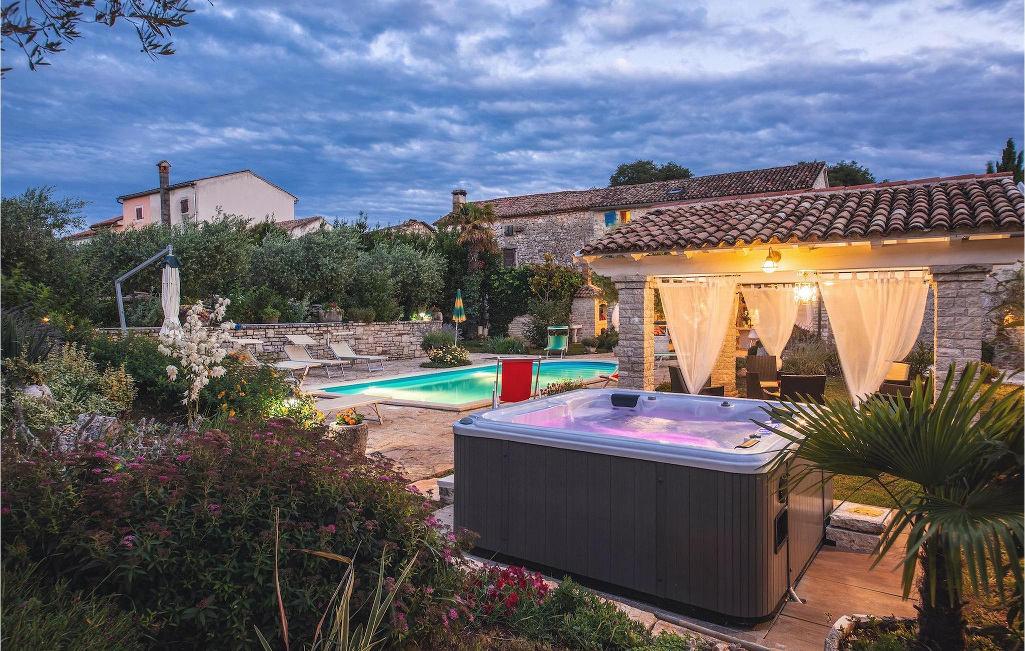 Den vakkert vedlikeholdte hagen med basseng er absolutt et av plusspoengene ved denne villaen. Den romslige terrassen er det perfekte stedet å nyte det istriske klimaet, slappe av i det innbydende utendørs boblebadet, lese en bok og bare nyte en velfortjent ferie.