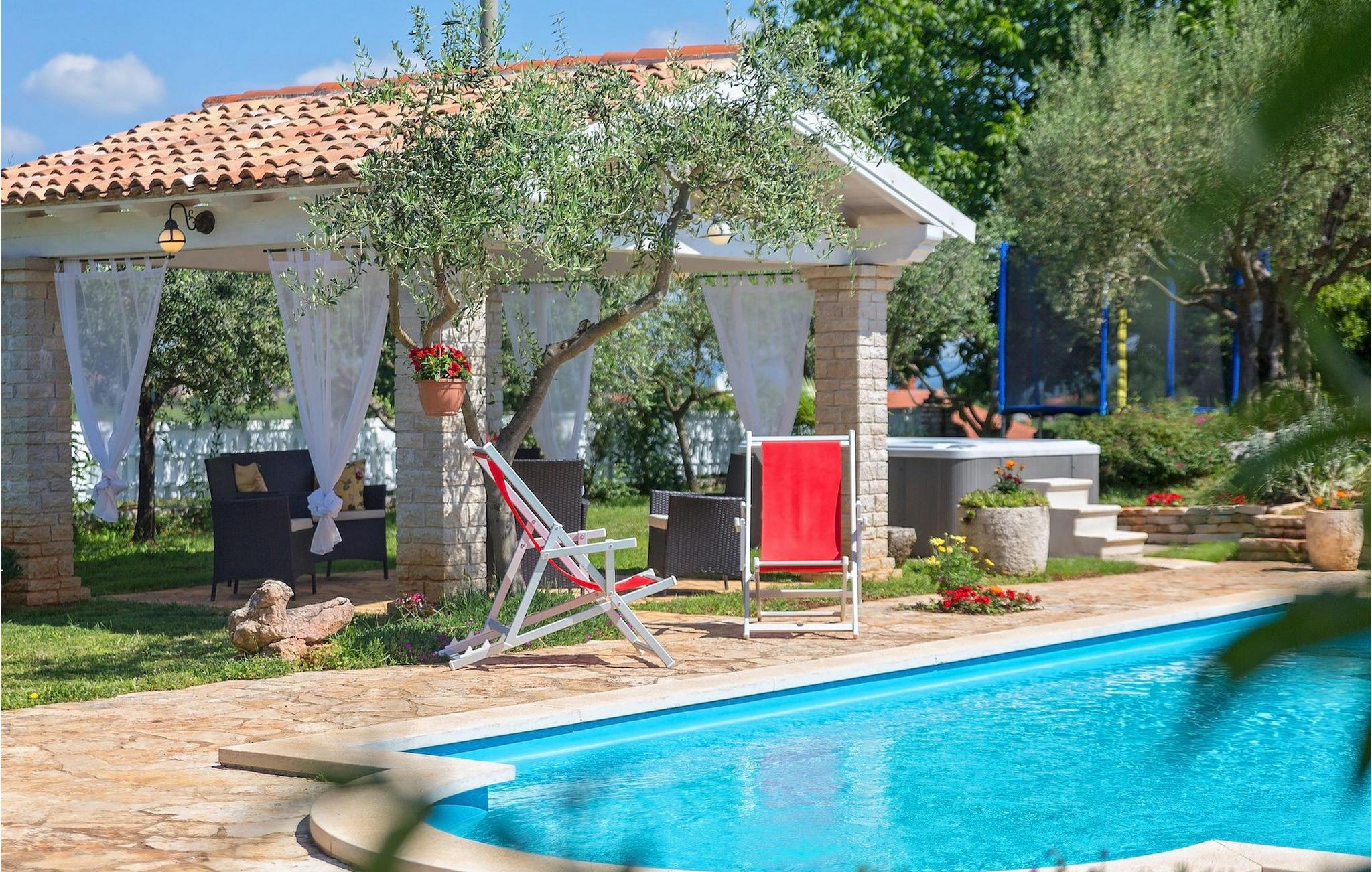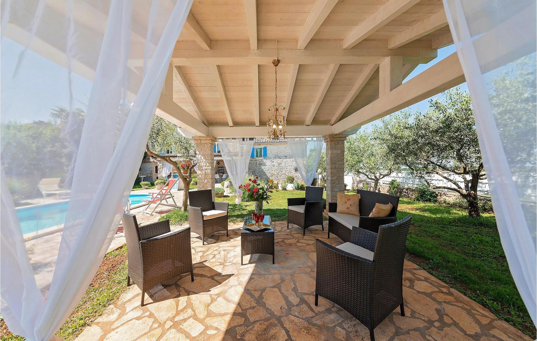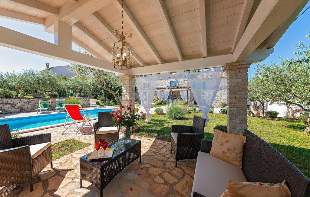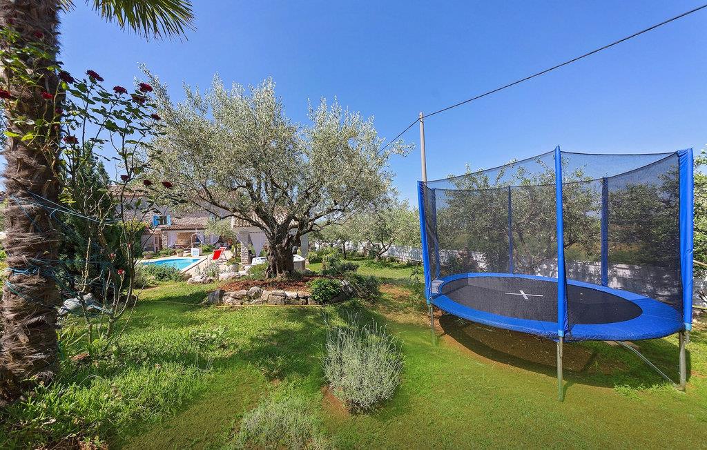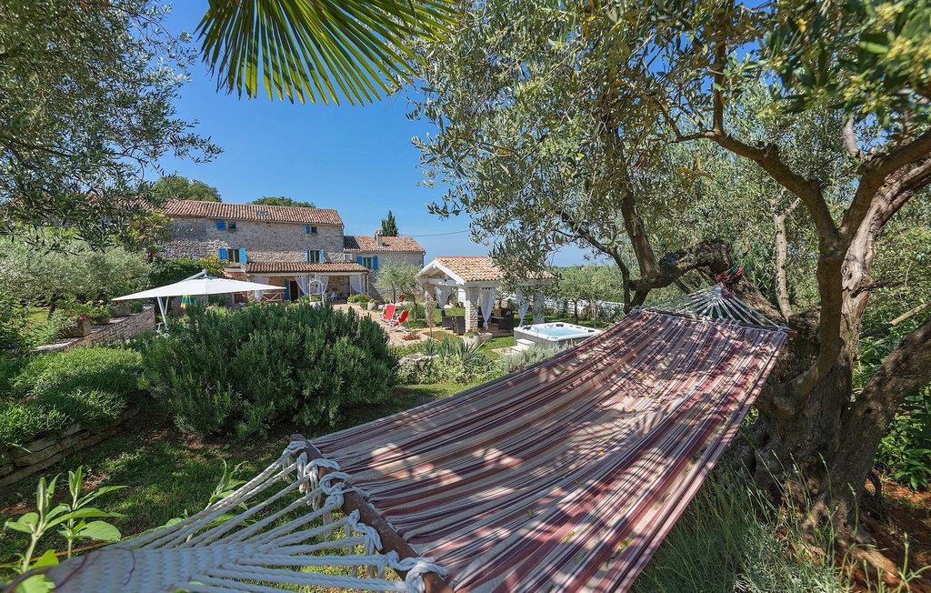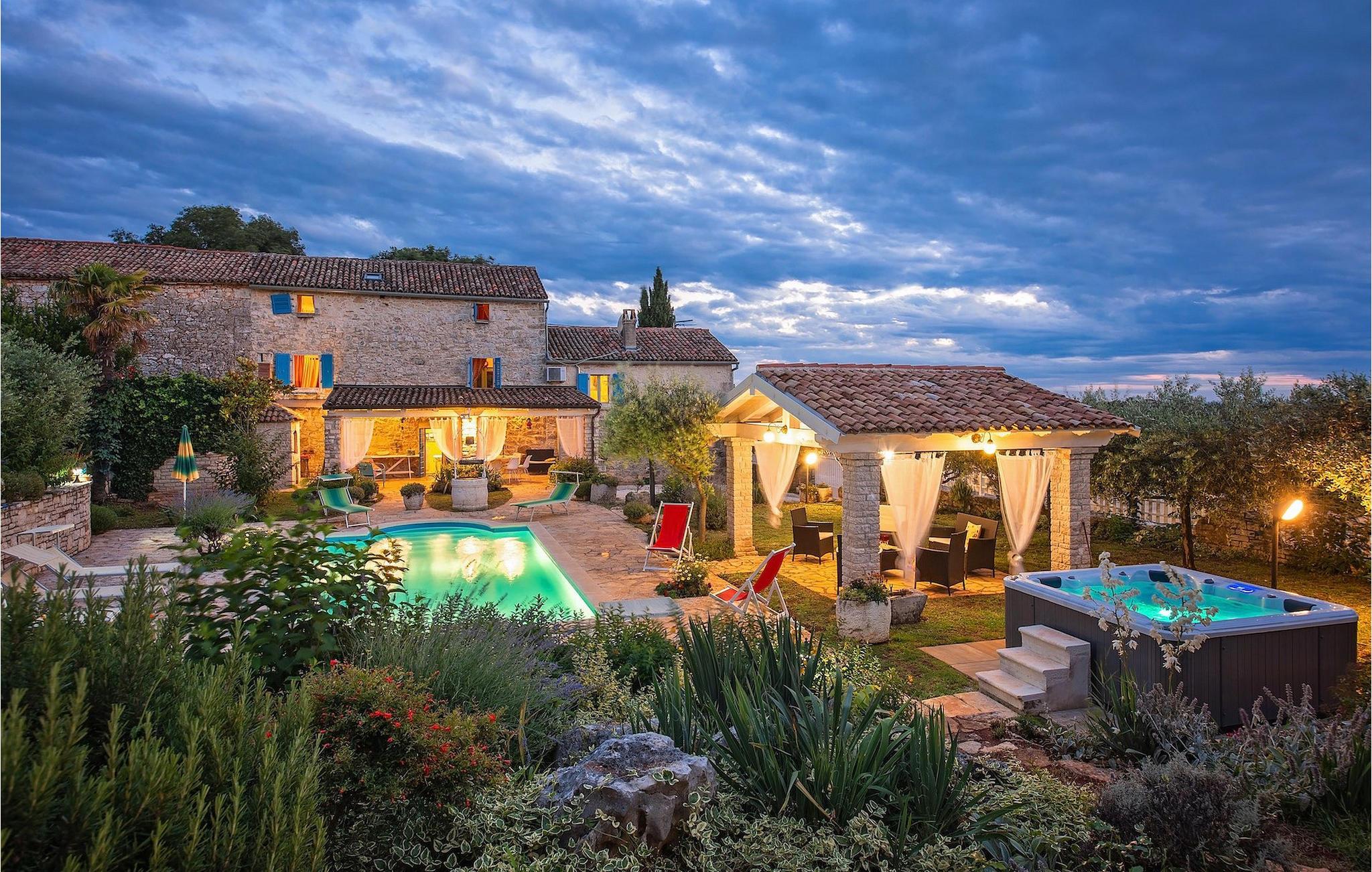 Den vakkert vedlikeholdte hagen med basseng er absolutt et av plusspoengene ved denne villaen. Den romslige terrassen er det perfekte stedet å nyte det istriske klimaet, slappe av i det innbydende utendørs boblebadet, lese en bok og bare nyte en velfortjent ferie.