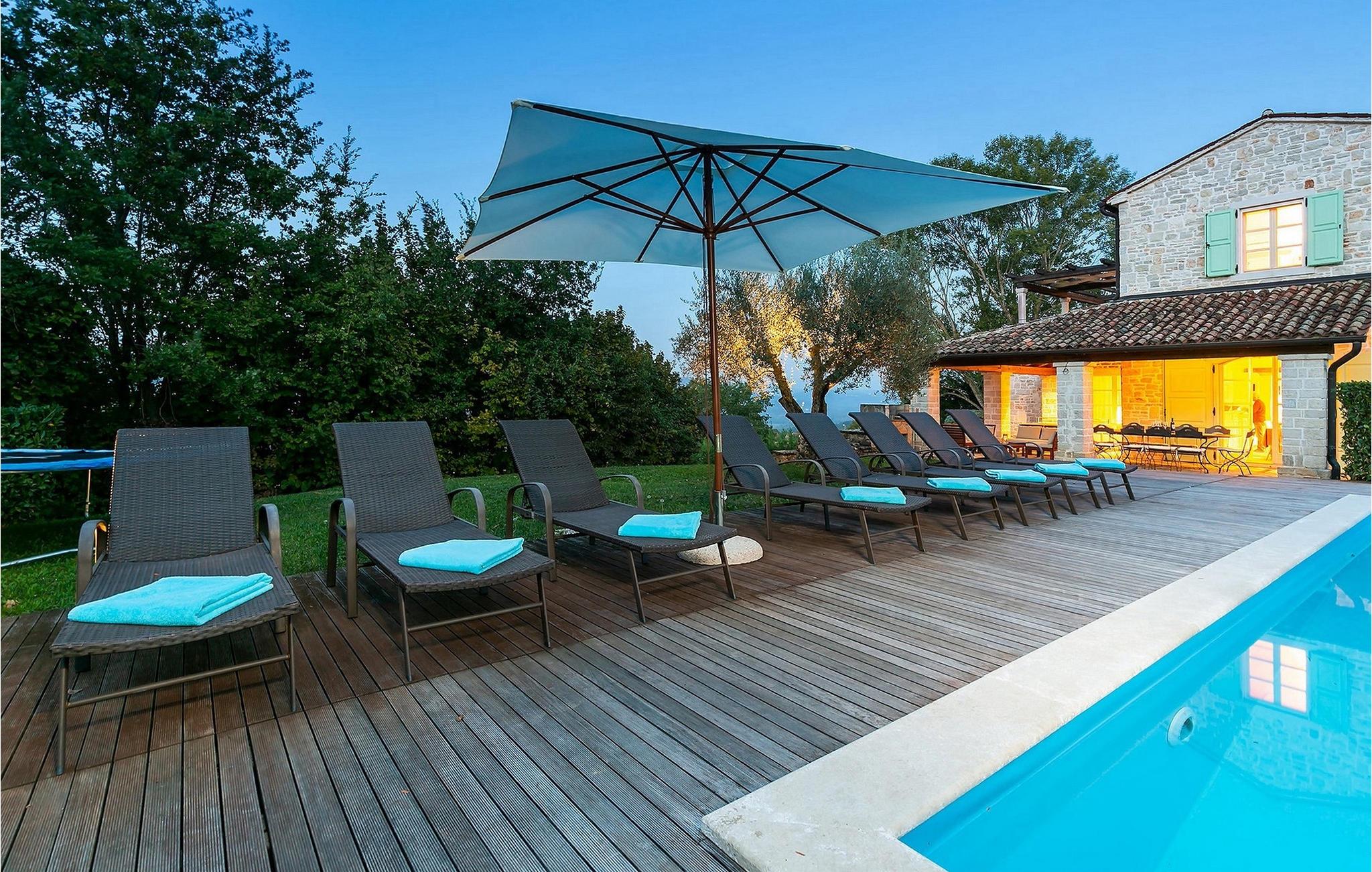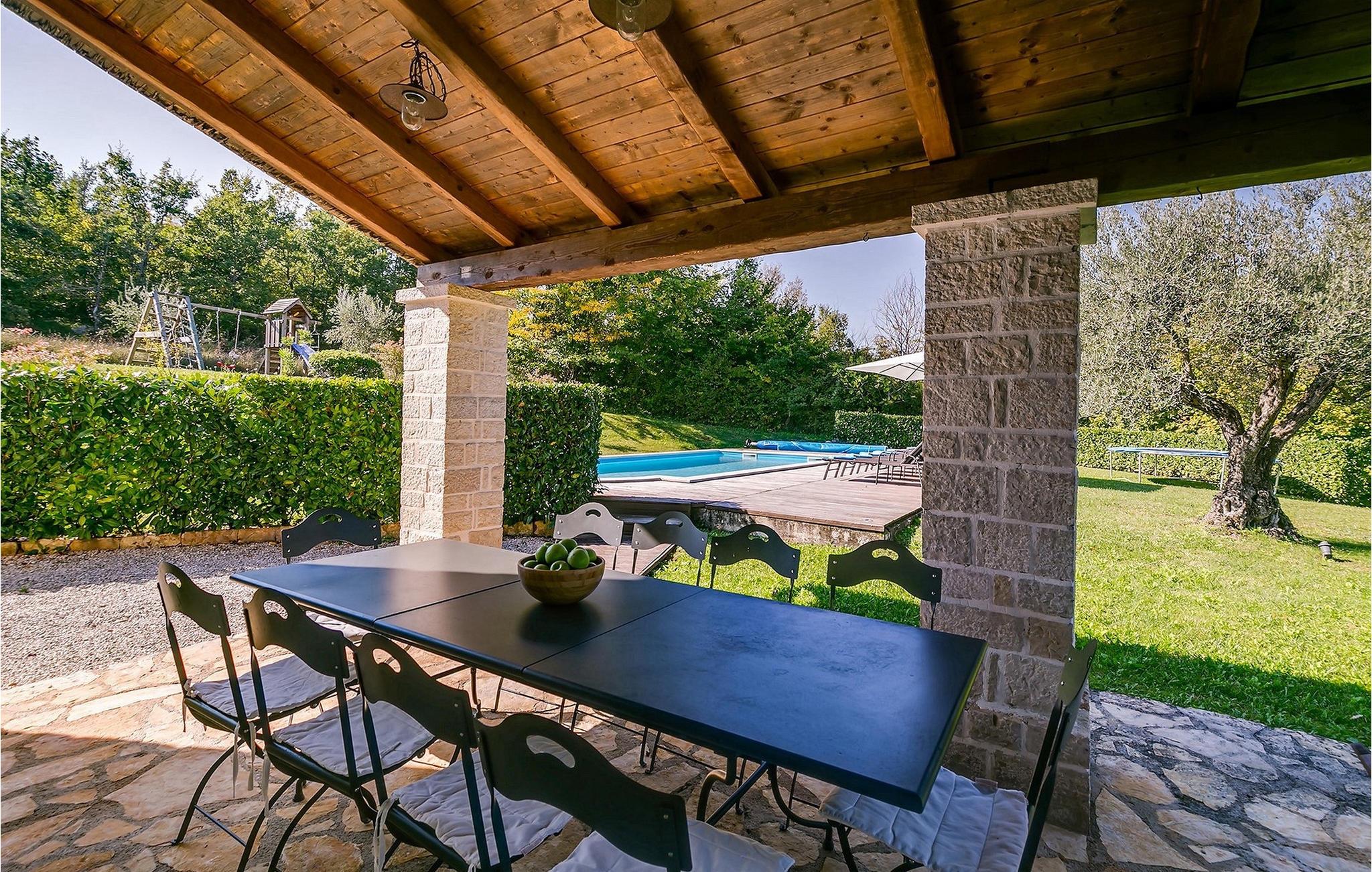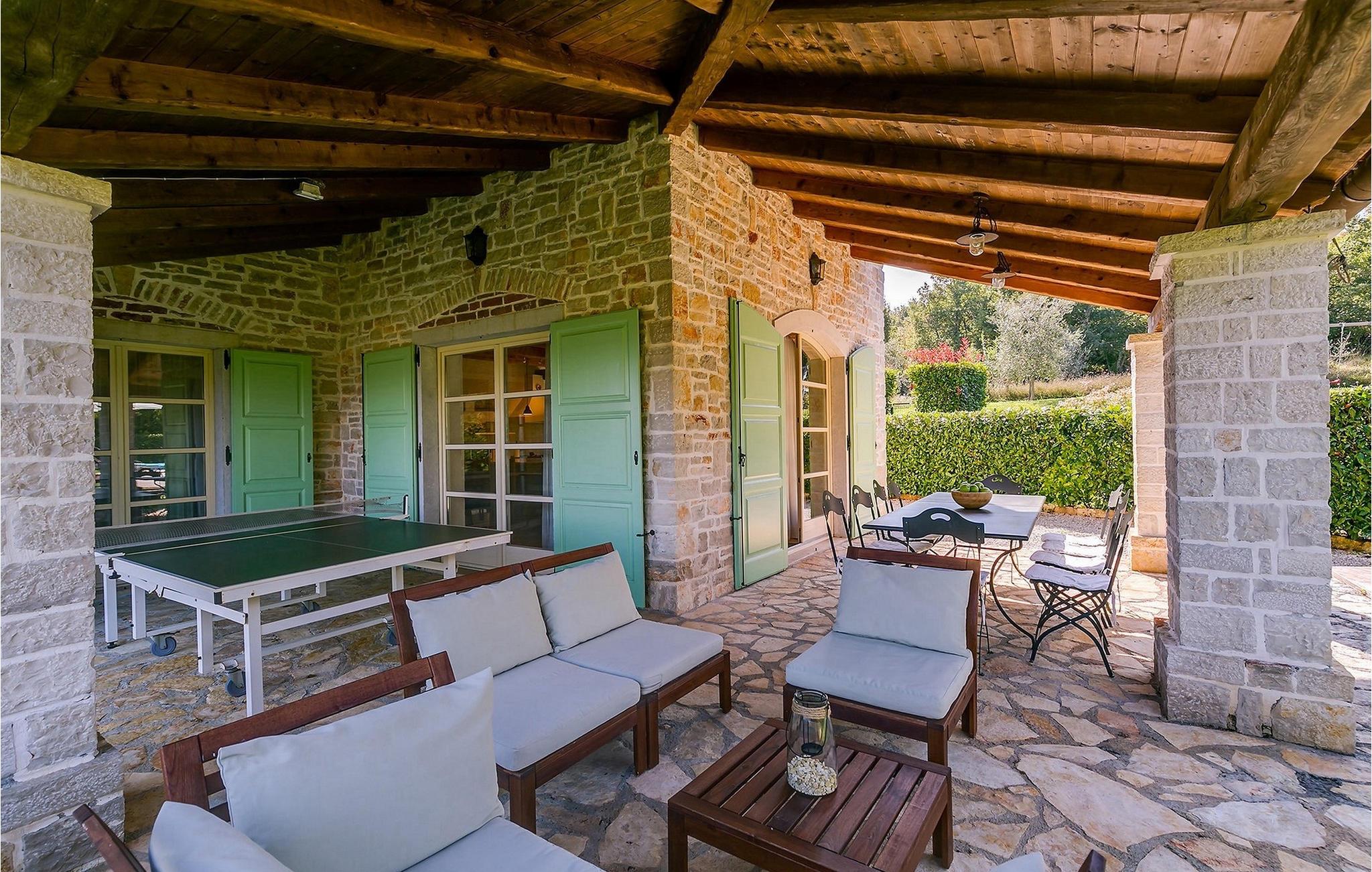 Den vakre steinvillaen Casa Bella ligger i en liten landsby i Istria, omgitt av uberørt natur i et fortryllende landskap. Foran villaen ligger et romslig basseng omgitt av en flott hage og en vakker, overbygd terrasse med spisebord og grill, der du kan tilbringe hyggelige stunder med familie og venner på varme sommerkvelder.