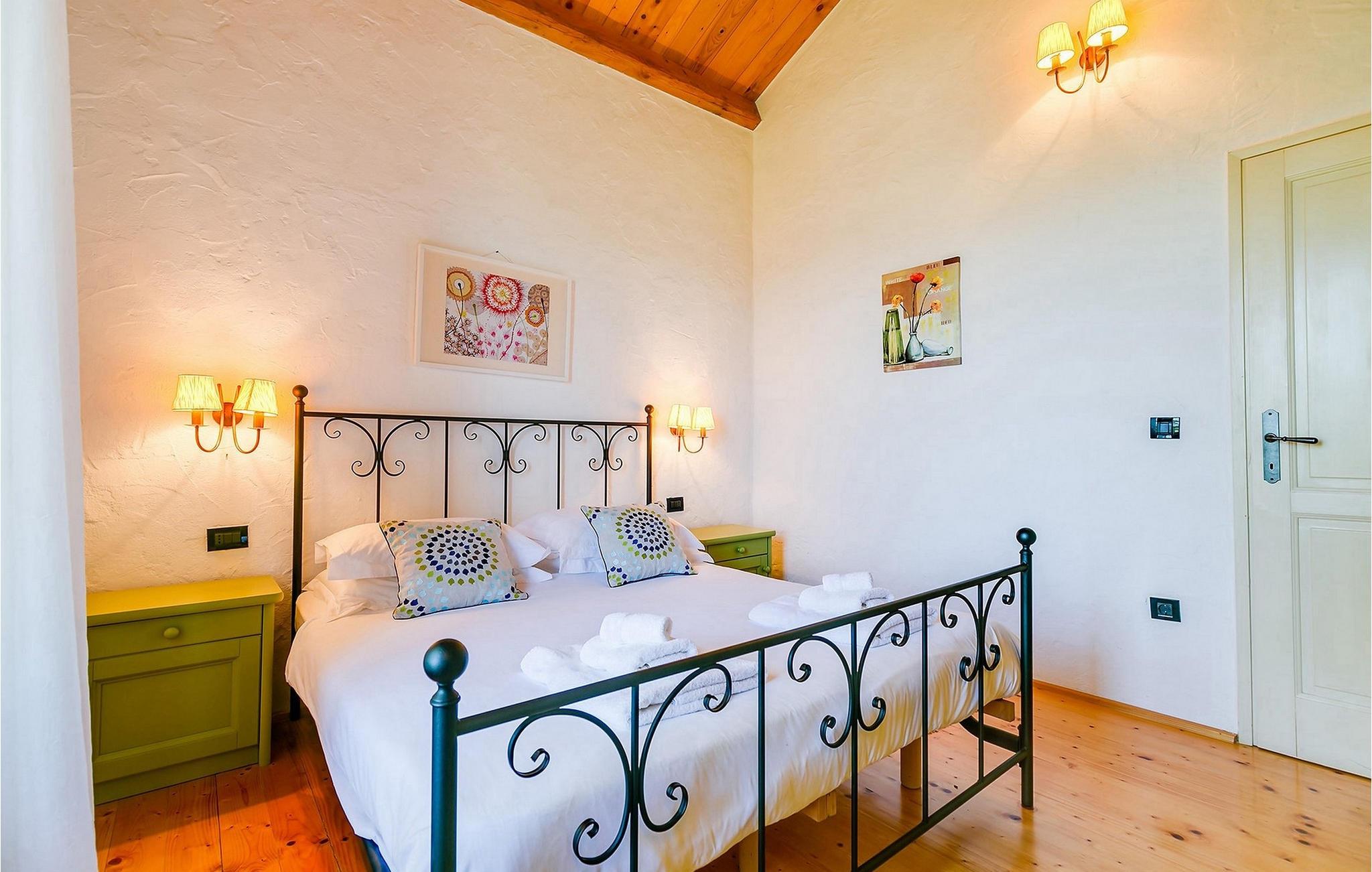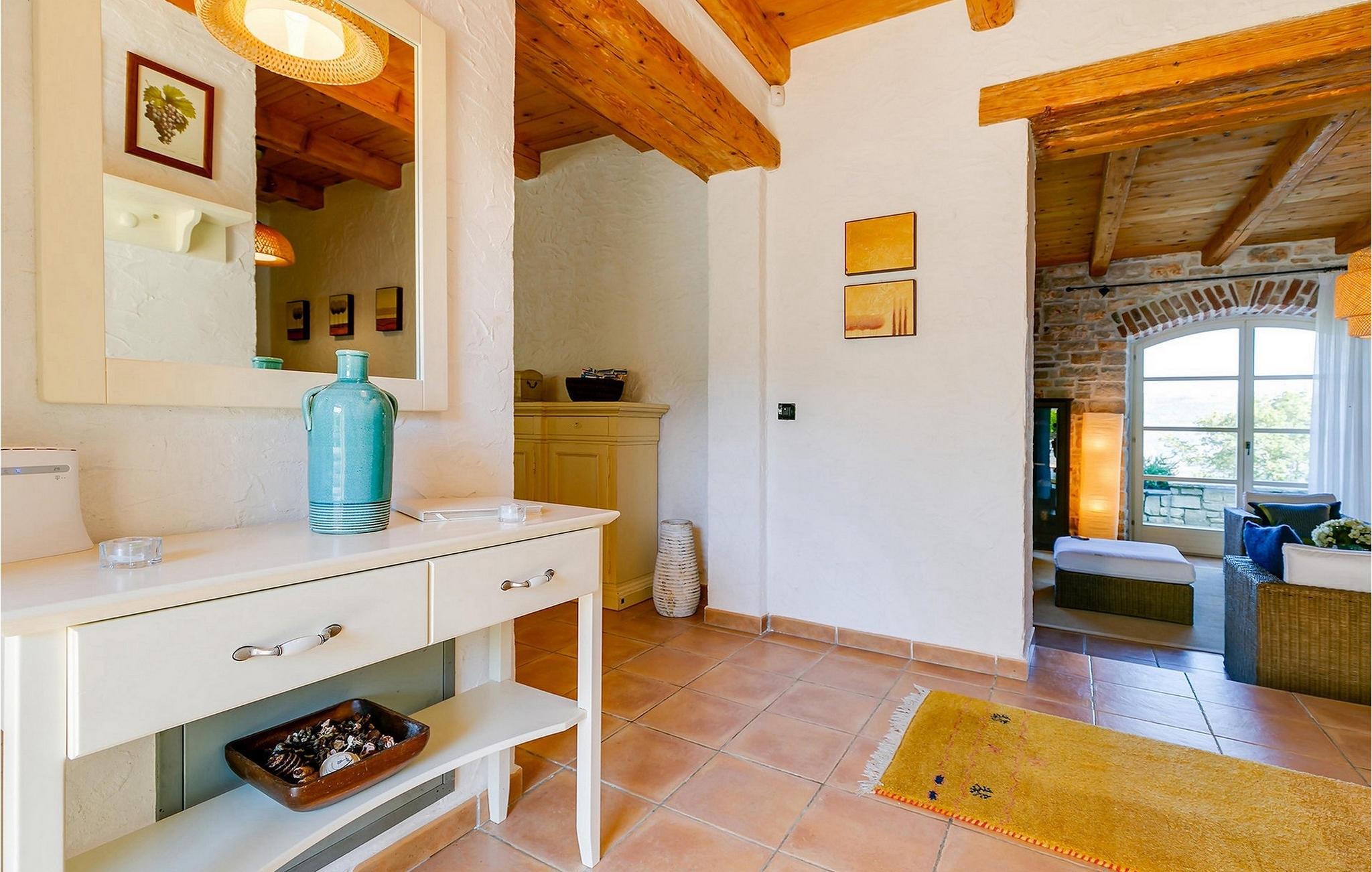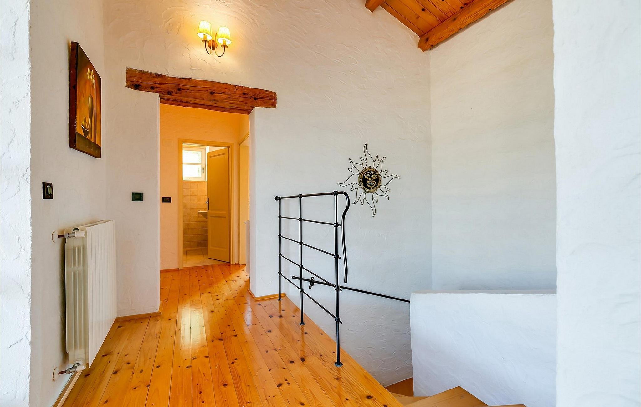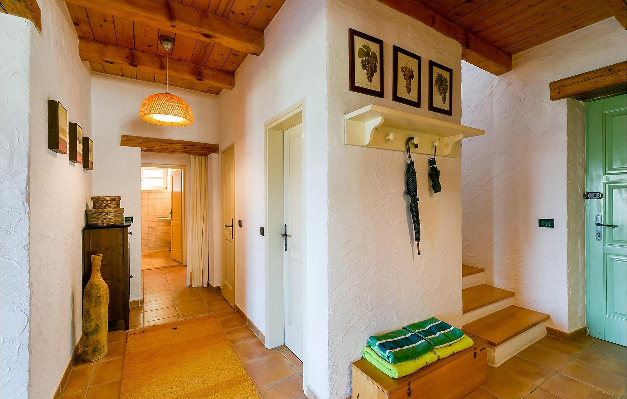 Interiøret i villaen utstråler en hyggelig atmosfære og istrisk sjarm. Villaen er fordelt på to etasjer. Første etasje har en stue med peis og et sjarmerende kjøkken med spiseplass. I samme etasje er det to vakkert innredede soverom, et bad og et separat toalett. Fra stuen og kjøkkenet har du utgang til en vakker terrasse hvor du kan nyte morgenkaffen med utsikt over de eventyrlige omgivelsene og den uberørte naturen. I øverste etasje er det ytterligere 2 soverom med bad og et soverom med eget bad. I samme etasje finner du en romslig terrasse med fantastisk utsikt over omgivelsene. For familiens yngste er det lekeplass og bordtennisbord.