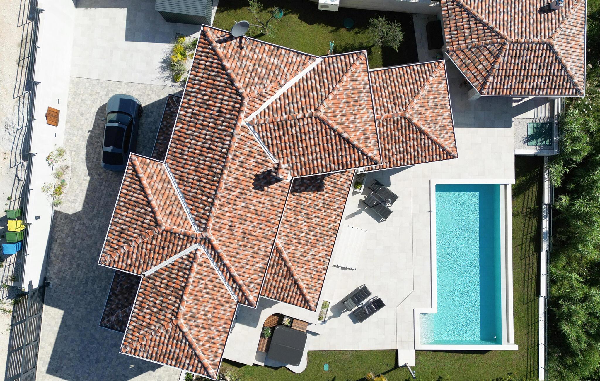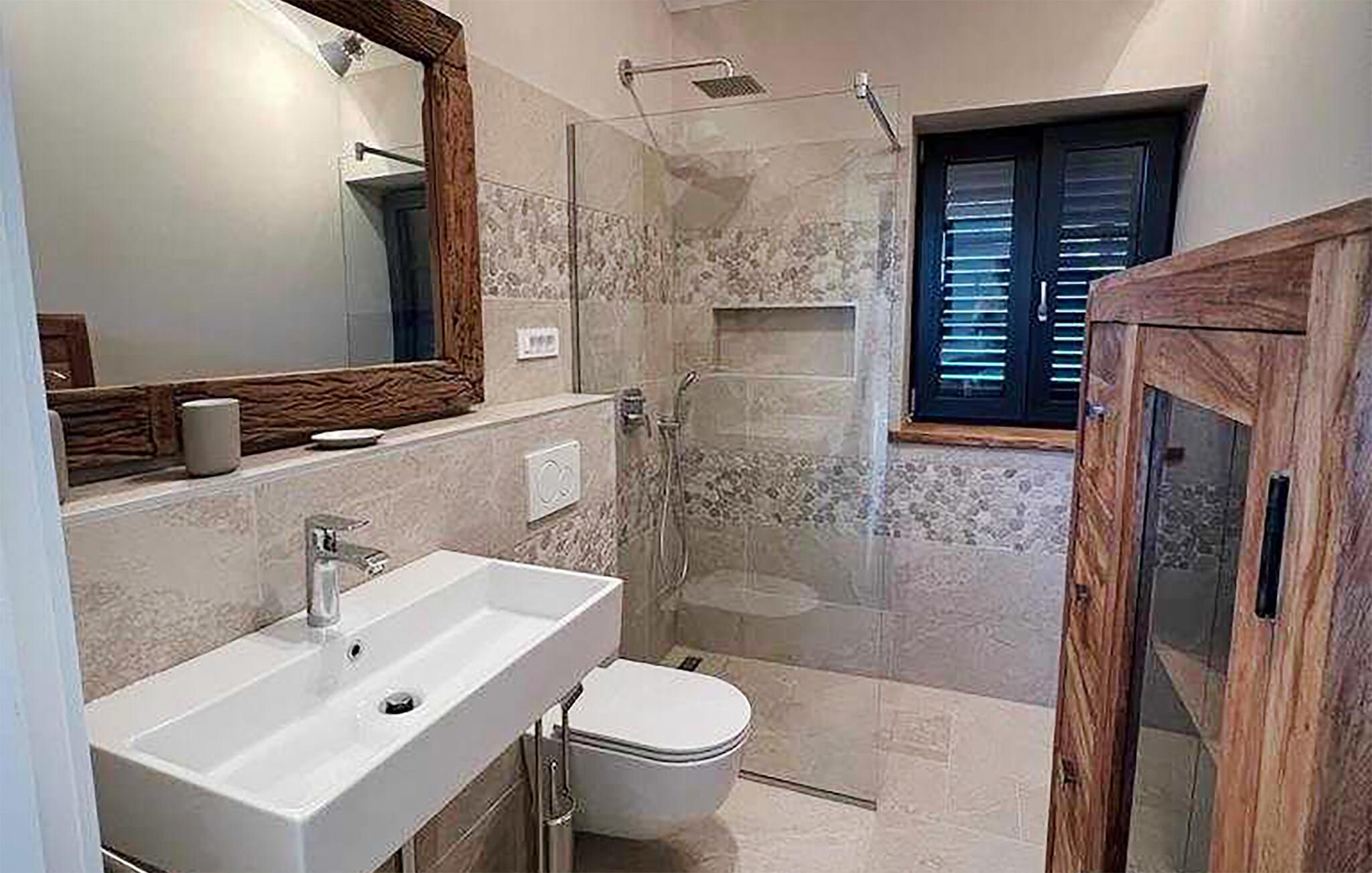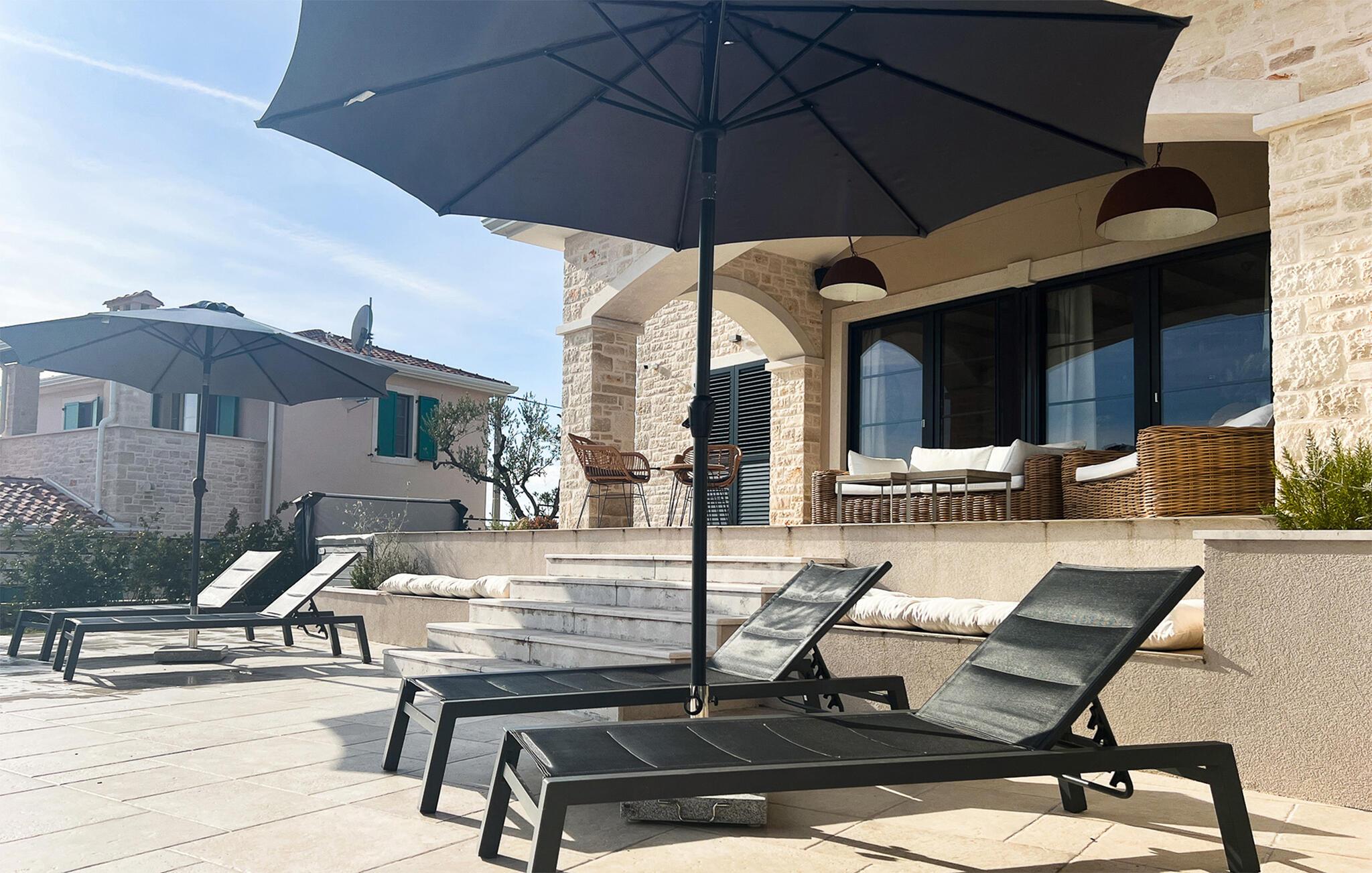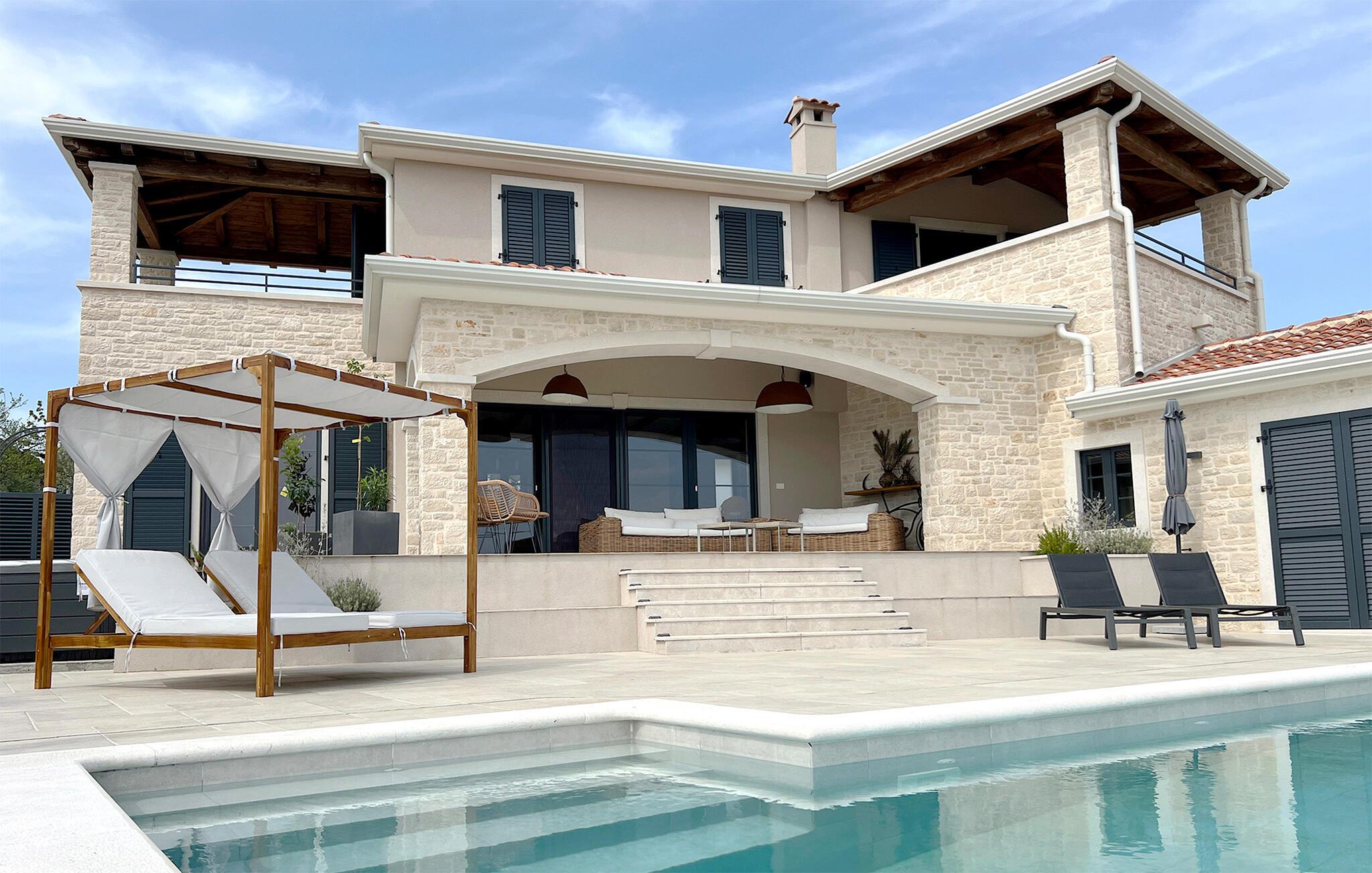 Denne vakre villaen i den pittoreske landsbyen Vizinada er det perfekte stedet å slappe av og nyte en velfortjent ferie! Villa BaseCamp er ideell for 6 personer. Den består av 3 soverom med dobbeltseng. Alle soverommene har aircondition, TV og eget bad for maksimal komfort for alle gjester. Ett av de tre soverommene ligger i første etasje og er delvis tilgjengelig, noe som gjør det egnet for eldre eller funksjonshemmede gjester. Første etasje har åpen planløsning og består av et fullt utstyrt kjøkken, spisestue og stue. Noen få trinn ned finner du det andre soverommet med eget bad. Det tredje soverommet ligger i øverste etasje og har utgang til den vakre, overbygde terrassen. Hvert rom er individuelt og kreativt utformet med stor sans for detaljer, og villaen ligger på en 750 m2 stor tomt. Høydepunktet er definitivt det vakre private bassenget og bassengområdet, som innbyr til avslapping! En utendørs gassgrill er tilgjengelig for tilberedning av måltider i det fri.