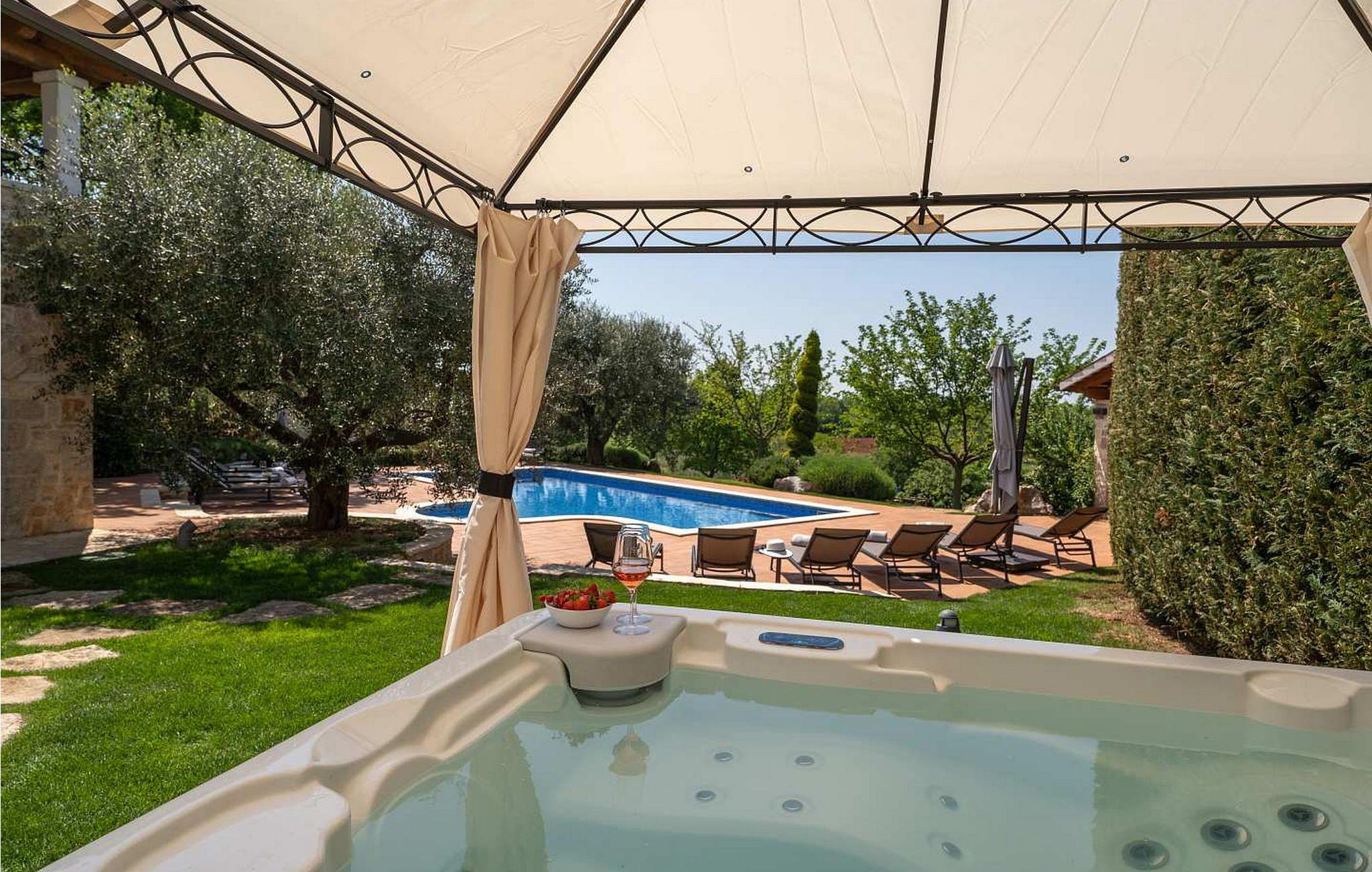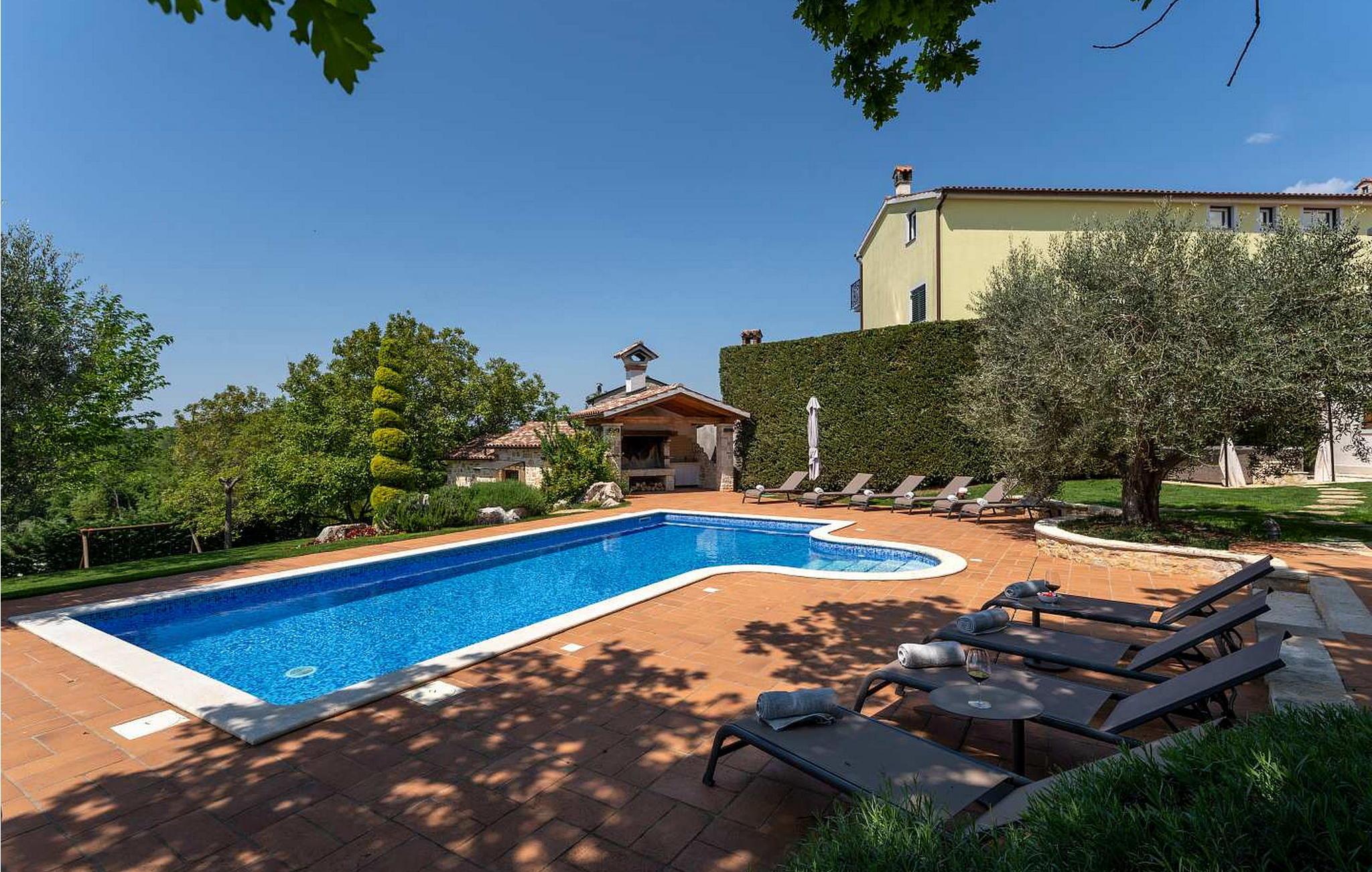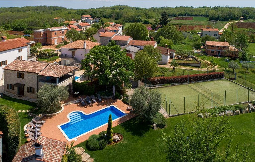 Denne elegante og komfortable eiendommen i Vizinada-området tilbyr et luksuriøst tilfluktssted. Eiendommen ligger på en inngjerdet tomt og eies av en kjent vinprodusentfamilie som er kjent for å produsere noen av de beste vinene i Kroatia. Eiendommen består av to vakkert renoverte steinhus, et svømmebasseng med boblebad, en multifunksjonell idrettsplass og rikelig med parkeringsplasser.