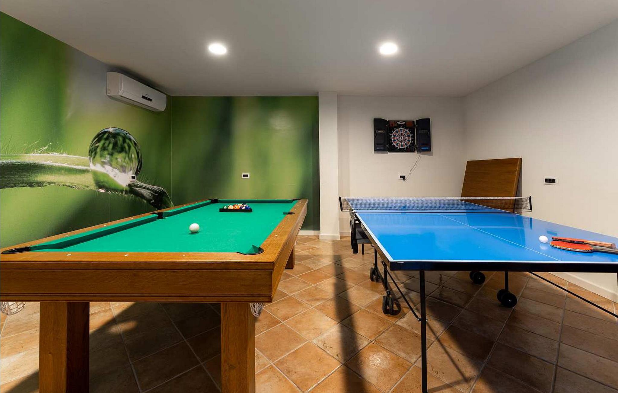 Uteområdet er perfekt for bespisning og underholdning, og har en overbygd spiseplass med TV, en grillpeis og en stor lekeplass for barn. Et innendørs biljardbord og bordtennisbord holder gjestene aktive.