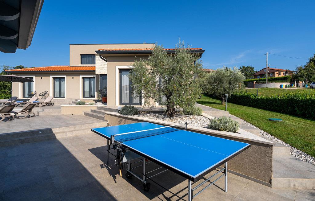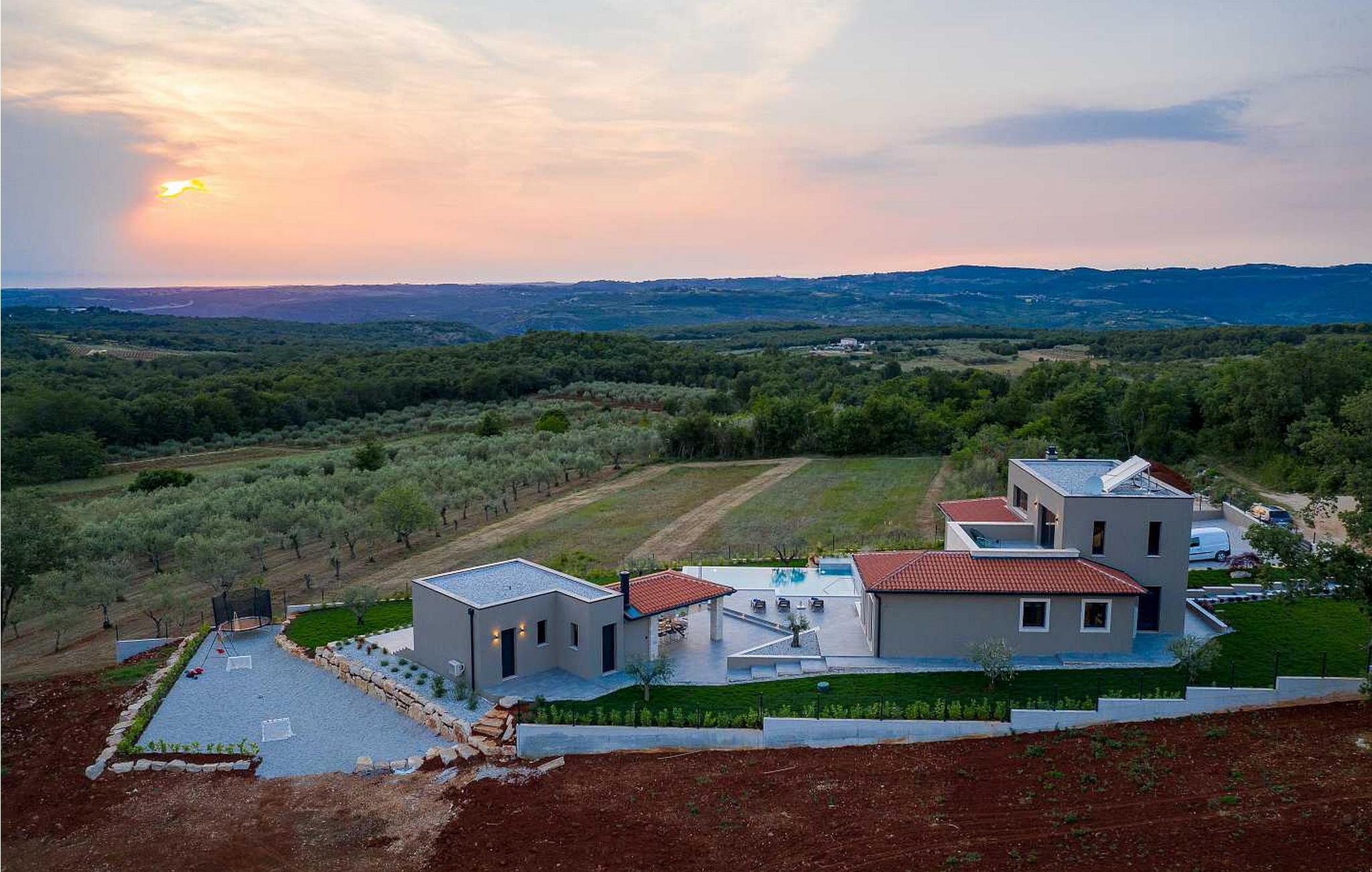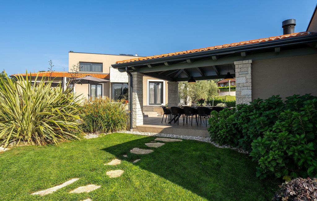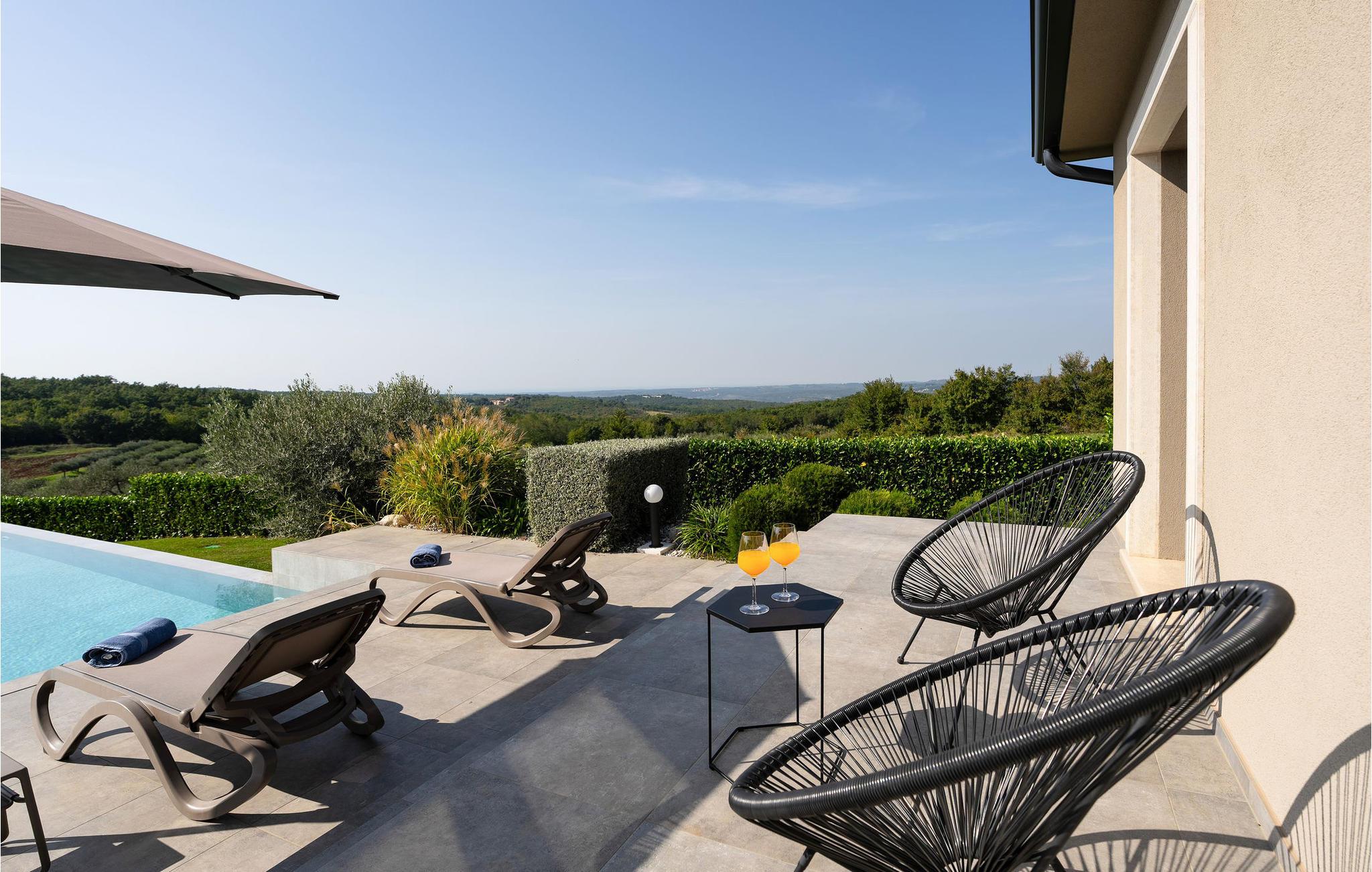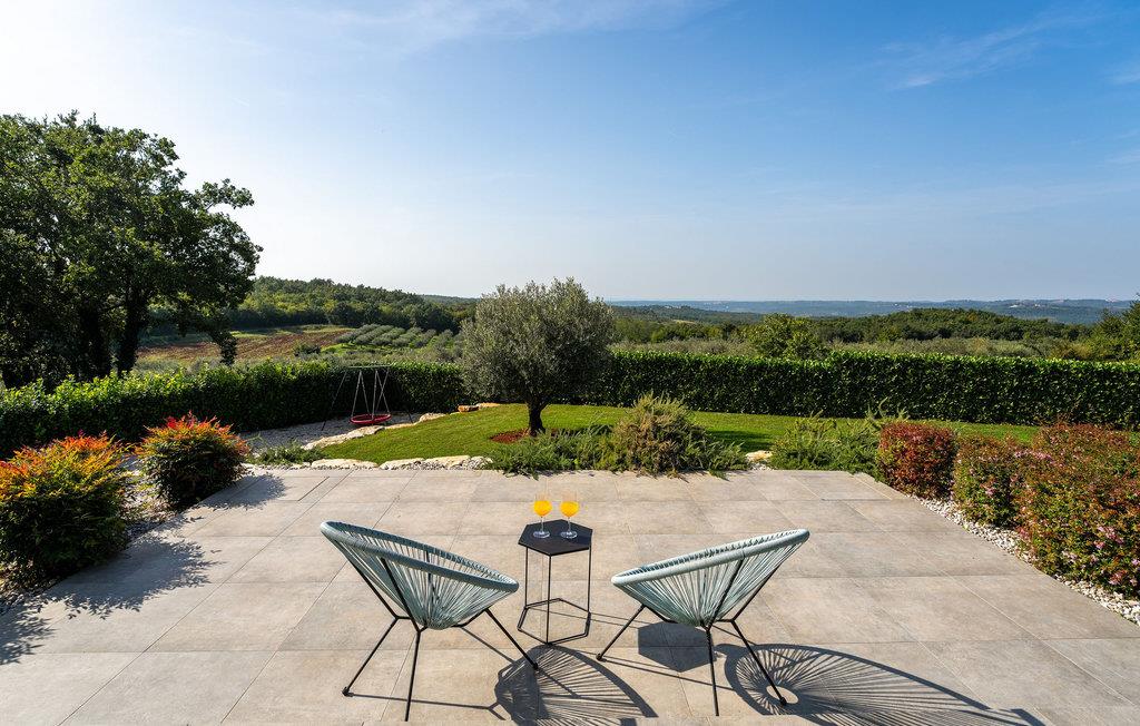 På klare dager kan du også se toppene i Alpene. På den inngjerdede tomten på 1900 kvm har gjestene tilgang til et basseng på 49 kvm, sommerkjøkken, overbygd terrasse med spisebord for uteservering, badminton-/volleyballbane, trampoline og husker for barn. Nærmeste butikk, kaffebar og minibank ligger i byen Vizinada, 3 km unna, mens pizzeriaen og en typisk taverna ligger bare 4 km fra huset. Omtrent 500 meter fra huset ligger en vinvei og en olivenoljevei. Feriebyen Lanterna, som byr på vakre og velholdte stein- og klippestrender, ligger bare 16 km fra villaen. For sykkelentusiaster går sykkel- og turstien Parenzana rett foran huset og strekker seg fra Koper til Trieste. Frem til begynnelsen av 1900-tallet var dette en av de viktigste jernbanelinjene i Istria.