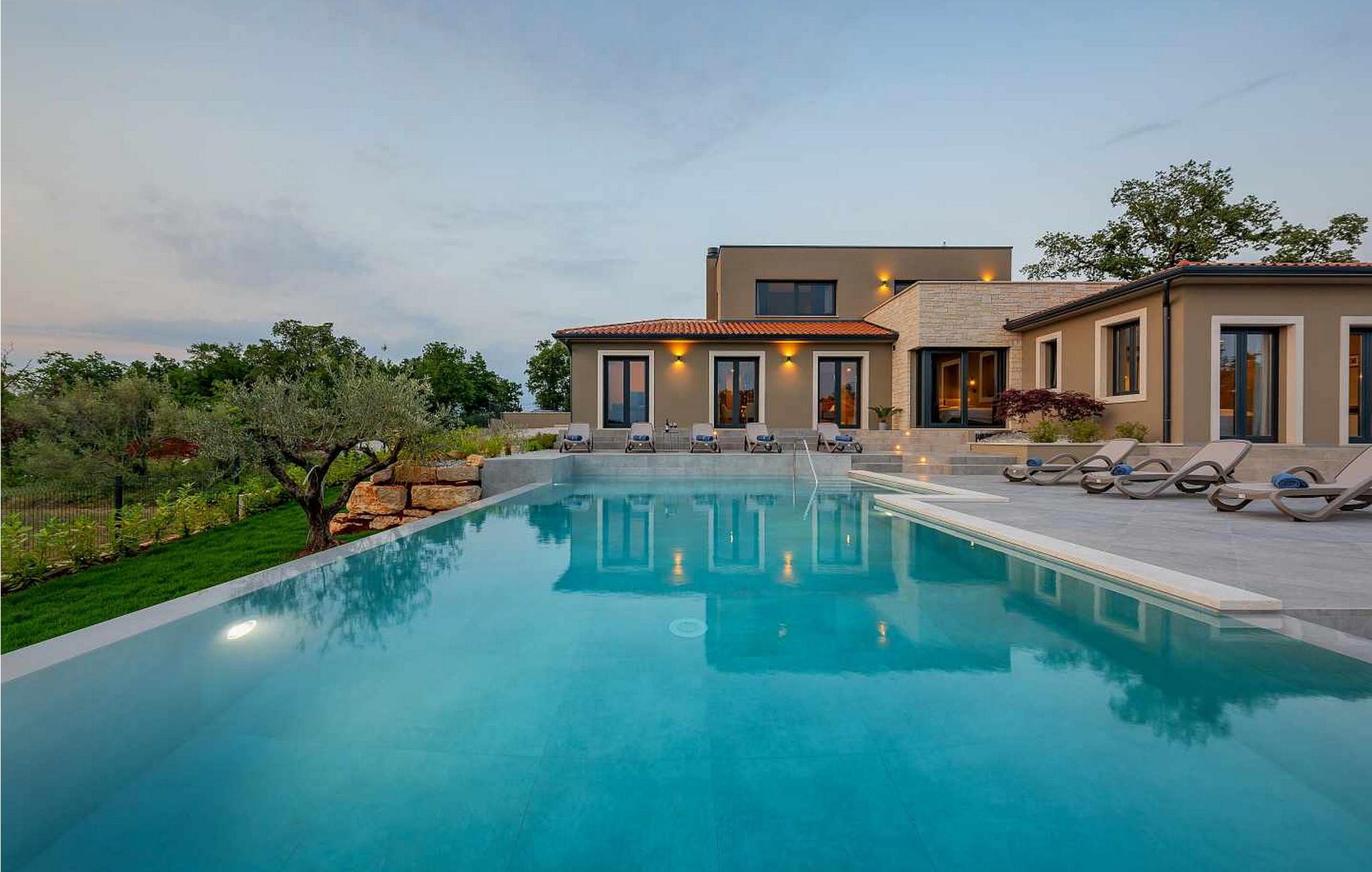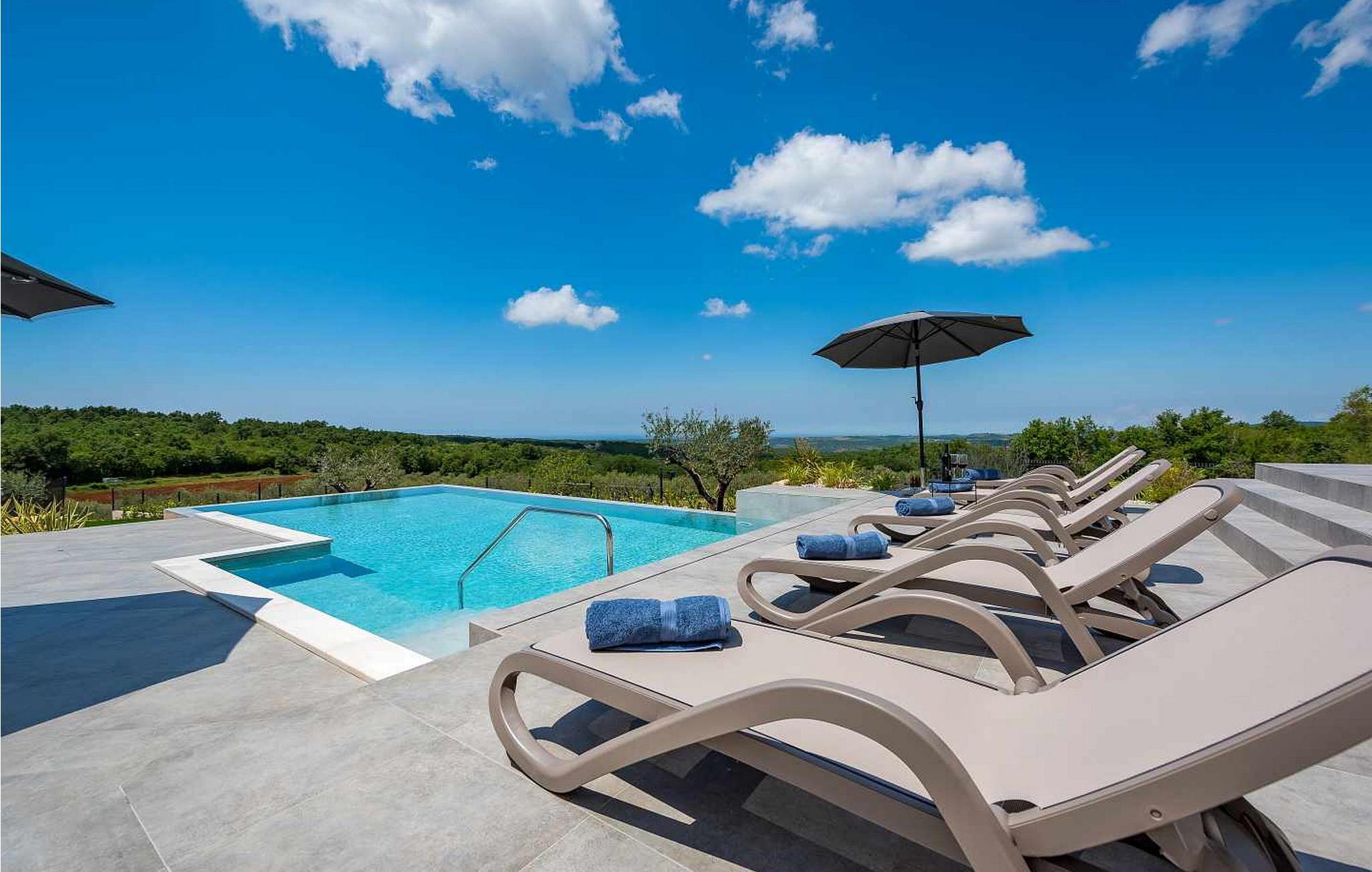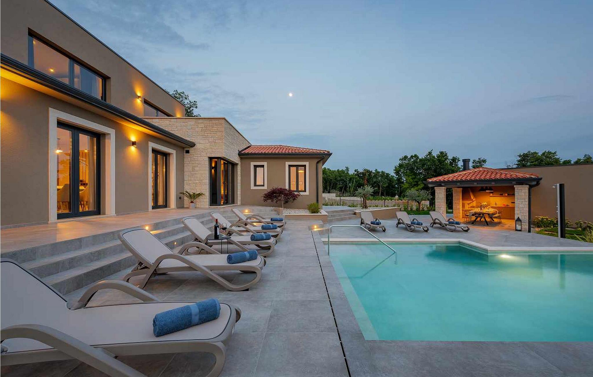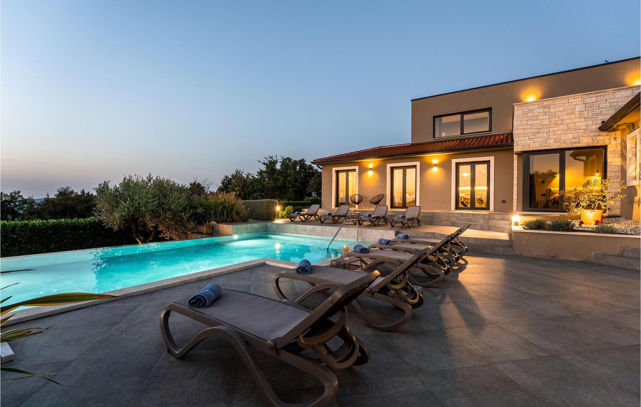 På klare dager kan du også se toppene i Alpene. På den inngjerdede tomten på 1900 kvm har gjestene tilgang til et basseng på 49 kvm, sommerkjøkken, overbygd terrasse med spisebord for uteservering, badminton-/volleyballbane, trampoline og husker for barn. Nærmeste butikk, kaffebar og minibank ligger i byen Vizinada, 3 km unna, mens pizzeriaen og en typisk taverna ligger bare 4 km fra huset. Omtrent 500 meter fra huset ligger en vinvei og en olivenoljevei. Feriebyen Lanterna, som byr på vakre og velholdte stein- og klippestrender, ligger bare 16 km fra villaen. For sykkelentusiaster går sykkel- og turstien Parenzana rett foran huset og strekker seg fra Koper til Trieste. Frem til begynnelsen av 1900-tallet var dette en av de viktigste jernbanelinjene i Istria.