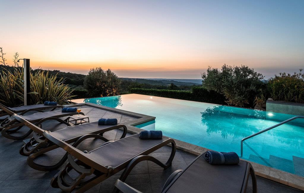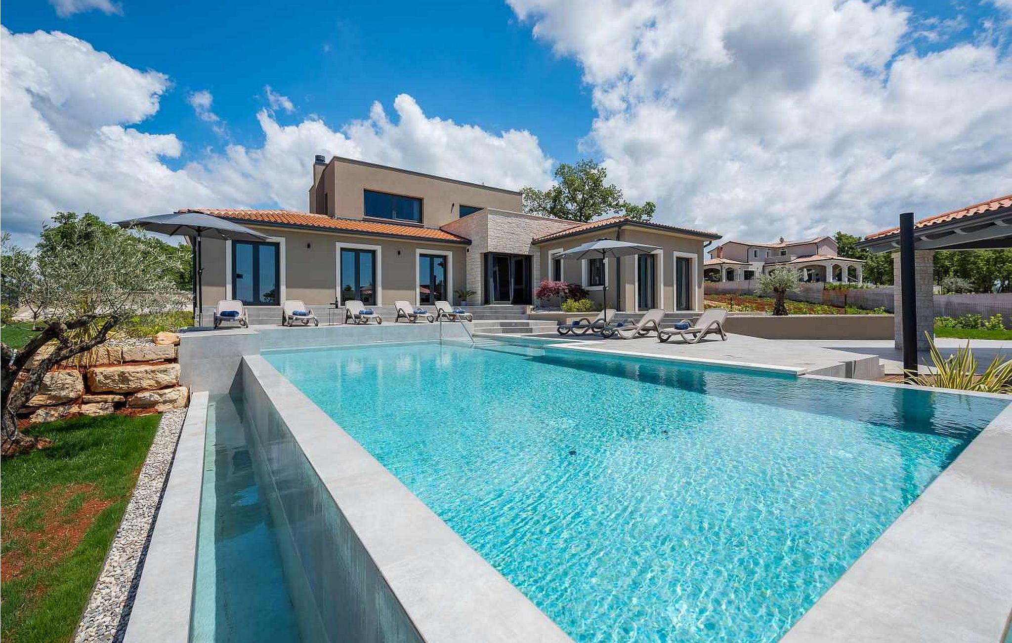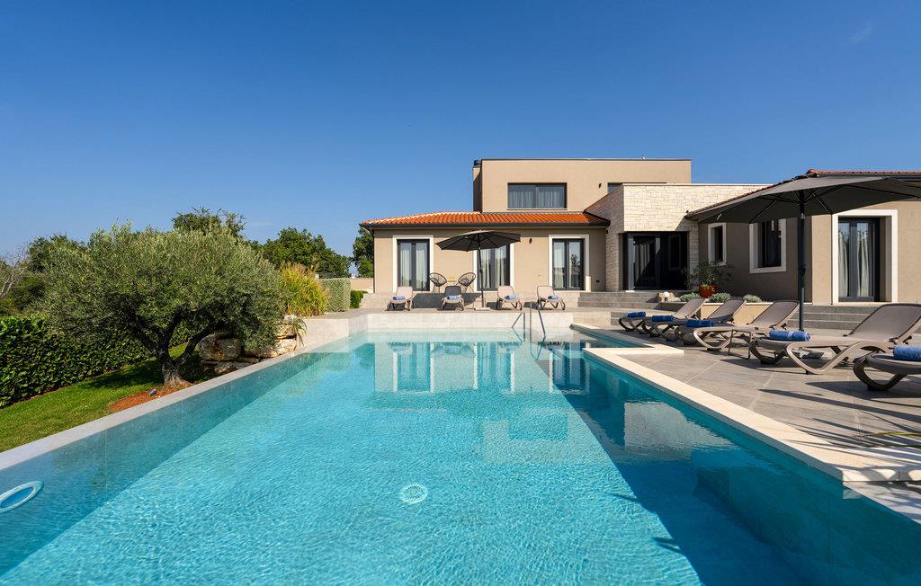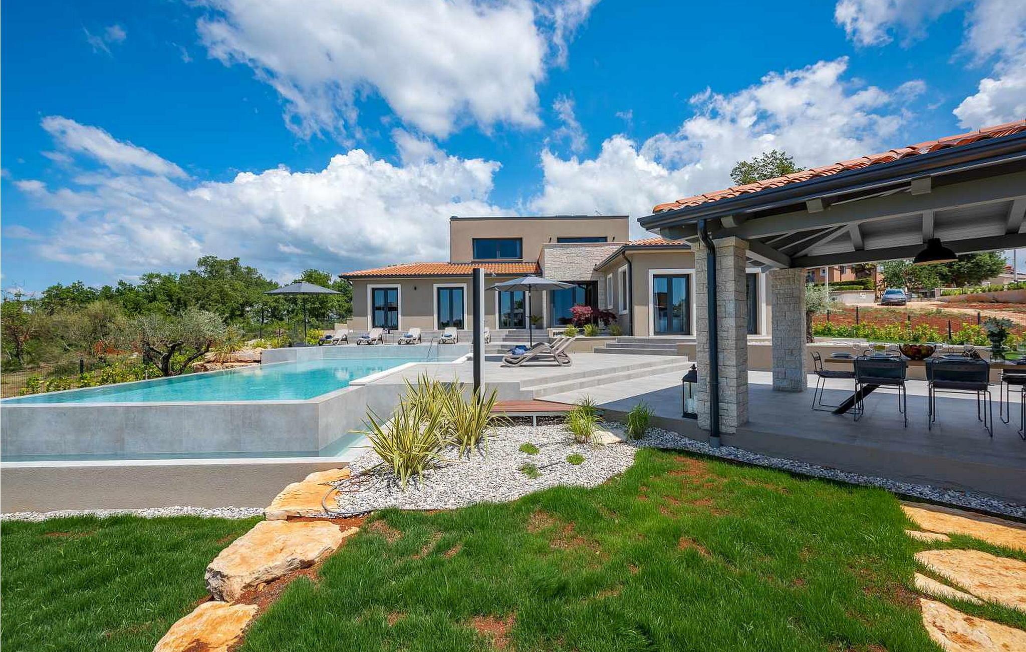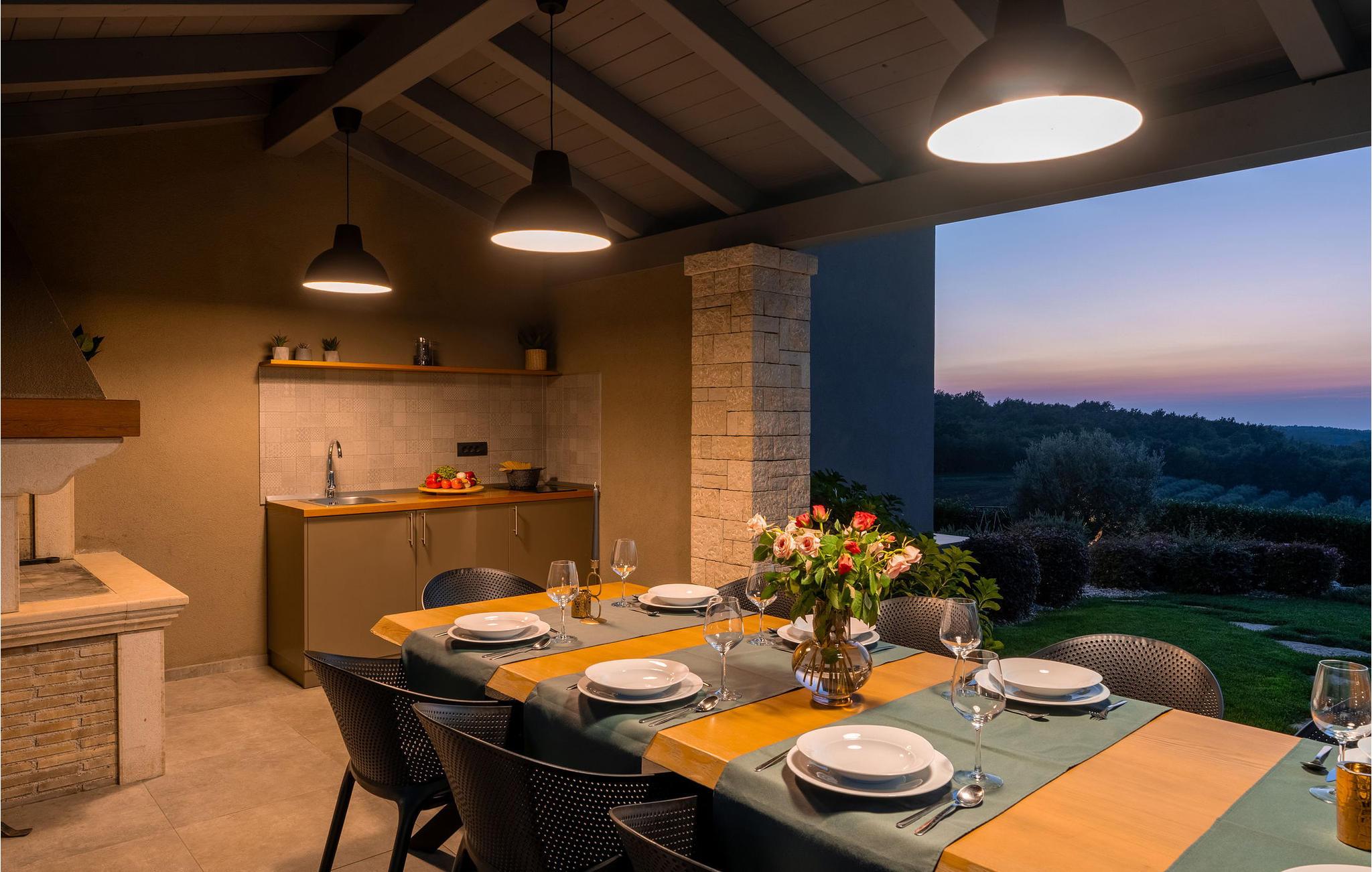 På klare dager kan du også se toppene i Alpene. På den inngjerdede tomten på 1900 kvm har gjestene tilgang til et basseng på 49 kvm, sommerkjøkken, overbygd terrasse med spisebord for uteservering, badminton-/volleyballbane, trampoline og husker for barn. Nærmeste butikk, kaffebar og minibank ligger i byen Vizinada, 3 km unna, mens pizzeriaen og en typisk taverna ligger bare 4 km fra huset. Omtrent 500 meter fra huset ligger en vinvei og en olivenoljevei. Feriebyen Lanterna, som byr på vakre og velholdte stein- og klippestrender, ligger bare 16 km fra villaen. For sykkelentusiaster går sykkel- og turstien Parenzana rett foran huset og strekker seg fra Koper til Trieste. Frem til begynnelsen av 1900-tallet var dette en av de viktigste jernbanelinjene i Istria.