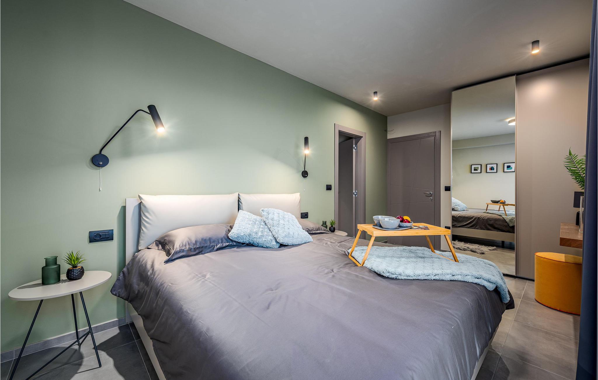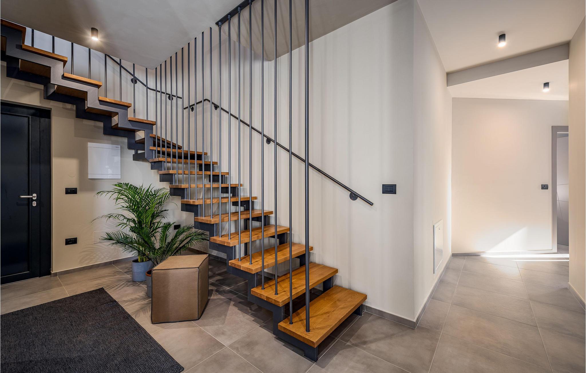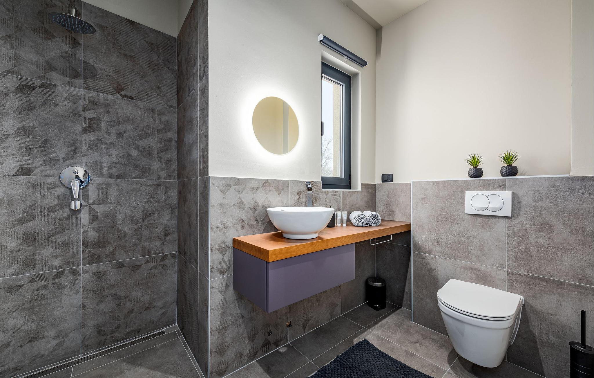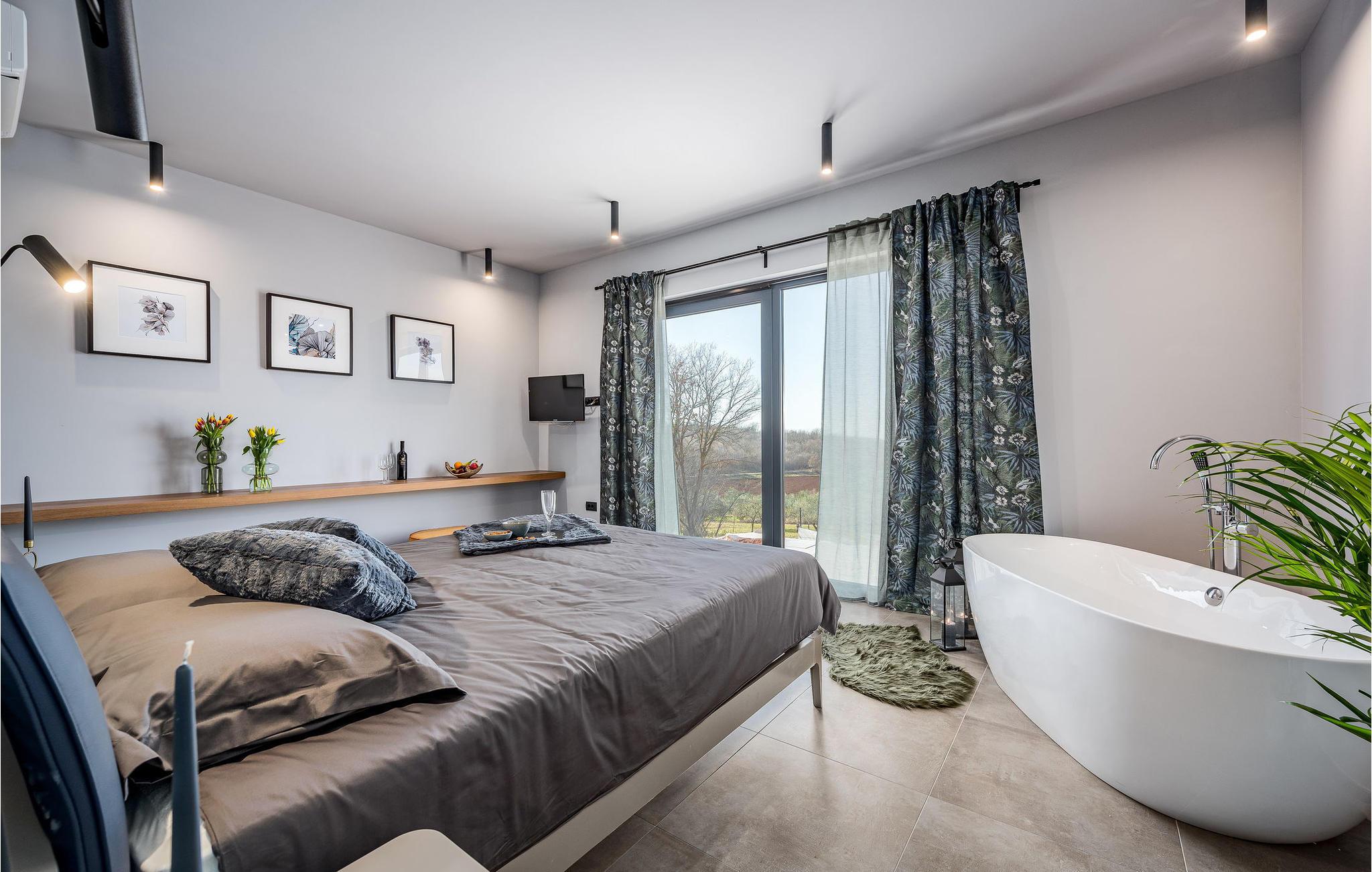 På klare dager kan du også se toppene i Alpene. På den inngjerdede tomten på 1900 kvm har gjestene tilgang til et basseng på 49 kvm, sommerkjøkken, overbygd terrasse med spisebord for uteservering, badminton-/volleyballbane, trampoline og husker for barn. Nærmeste butikk, kaffebar og minibank ligger i byen Vizinada, 3 km unna, mens pizzeriaen og en typisk taverna ligger bare 4 km fra huset. Omtrent 500 meter fra huset ligger en vinvei og en olivenoljevei. Feriebyen Lanterna, som byr på vakre og velholdte stein- og klippestrender, ligger bare 16 km fra villaen. For sykkelentusiaster går sykkel- og turstien Parenzana rett foran huset og strekker seg fra Koper til Trieste. Frem til begynnelsen av 1900-tallet var dette en av de viktigste jernbanelinjene i Istria.