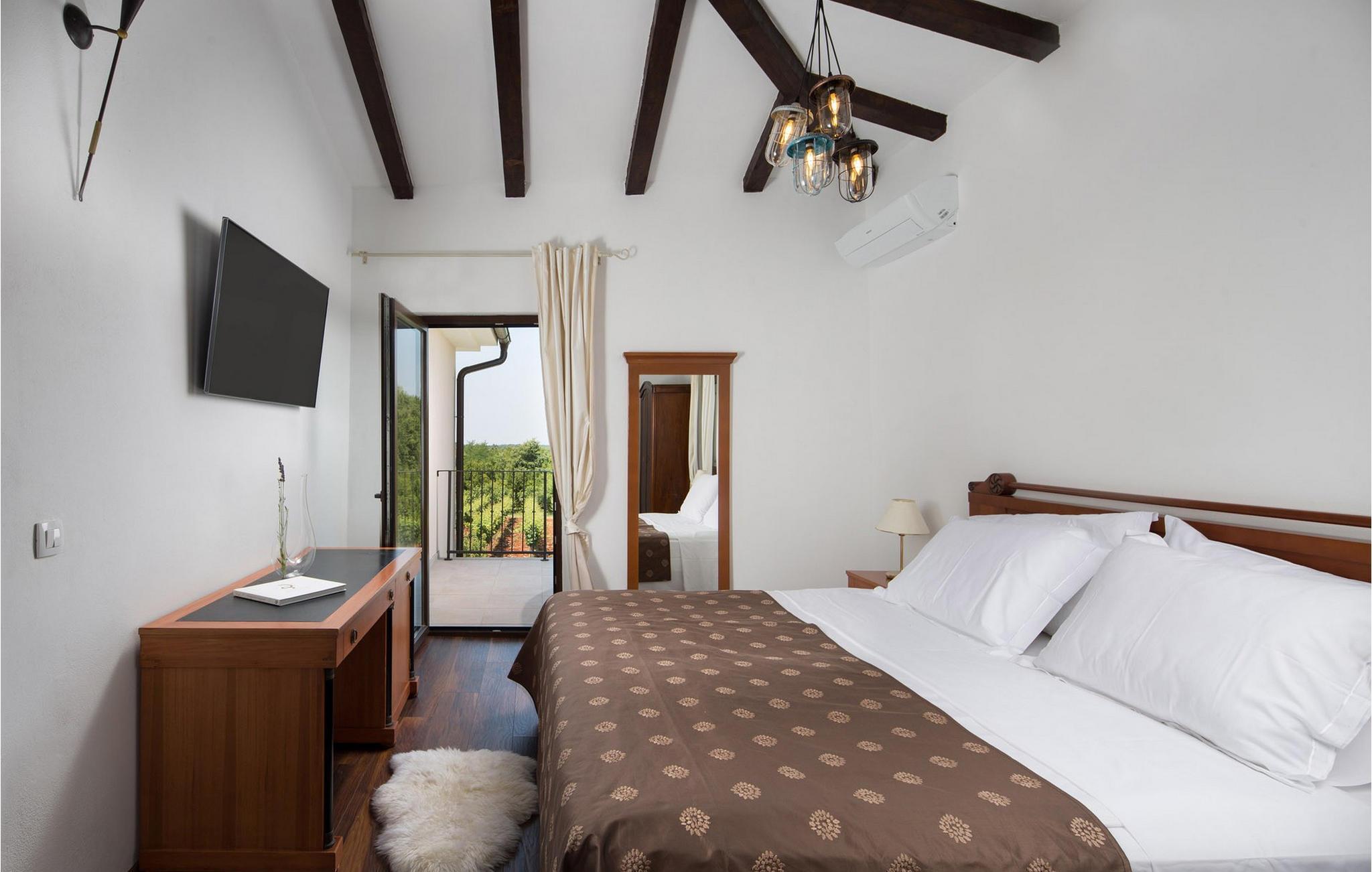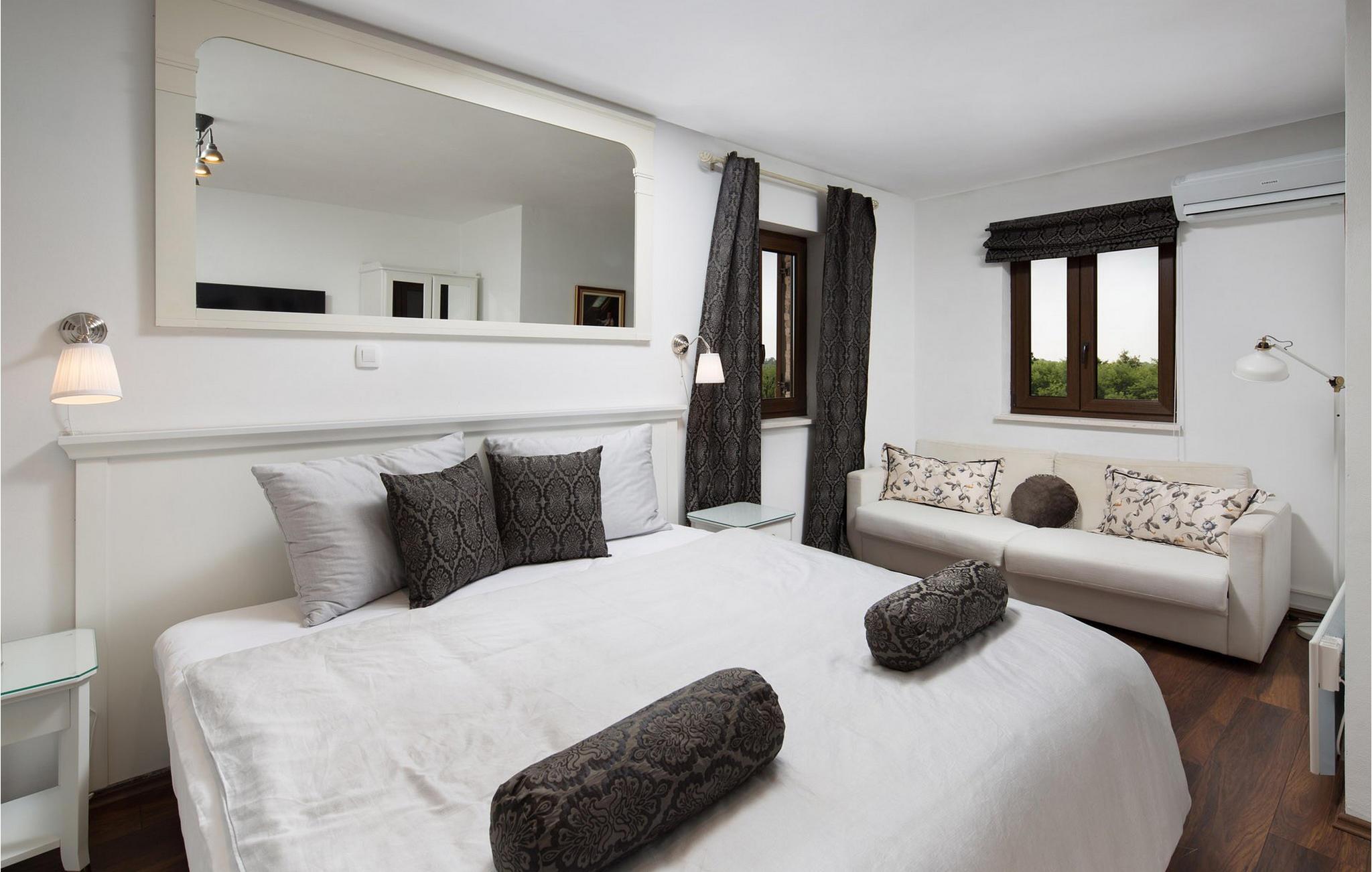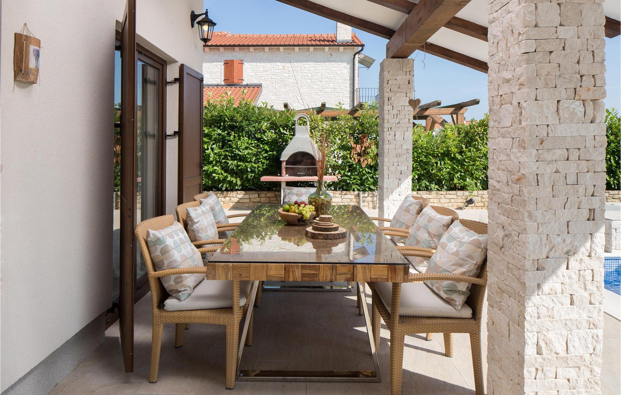Villa Theo ligger i den pittoreske byen Vi?njan i den vestlige delen av Istria og er et godt valg for en familieferie. Hvis du vil nyte vakker natur, førsteklasses gastronomiske tilbud, mange aktiviteter og et luksuriøst hus, vil denne villaen gi deg ferien du venter på. Dette elegante huset med utsikt over sjarmerende istriske hus og vingårder kan være det midlertidige drømmehjemmet for 6 + 2 gjester. I første etasje finner du et fullt utstyrt kjøkken av høyeste kvalitet, en spisestue med plass til 8 personer og en koselig stue med peis. I den klimatiserte stuen kan du kose deg med hjemmekino eller PlayStation 4. I første etasje kan du slappe av i den infrarøde badstuen med egen dusj. Ovenpå er det 3 soverom med komfortable king-size-senger, og to av rommene har en sovesofa som ekstraseng. Alle rommene har aircondition og TV med internett og Netflix-abonnement. I andre etasje er det 3 elegante bad ? 2 bad med dusj og vask og ett med to vasker og badekar. I samme etasje er det et vaskerom med vaskemaskin og tørketrommel. På en inngjerdet tomt på 650 m2 er det en vakker hage hvor du kan slappe av med familie og venner. Her kan du forfriske deg i det 30 m² store bassenget med fossefall eller se på favorittserien din i boblebadet, som har TV med internettforbindelse. Rundt bassenget er det 4 solsenger og 1 rund solseng for avslappende dager - den andre står på terrassen til et av soverommene. Under den overbygde terrassen er det et utendørsbord med plass til 8 personer, som er et ideelt sted å nyte deilige måltider tilberedt på gass- og kullgrillen. Barna kan kose seg med ulike rekvisitter til bassenget, leker og rutsjebanen. Villaen har 2 overbygde parkeringsplasser. Den sjarmerende byen Vi?njan er en av de mange pittoreske byene i Istria og er mest kjent for sitt astronomiske observatorium. Den lille byen ligger 15 km fra Pore? og 20 km fra Novigrad. Fornøyelsesparkene Aquacolours og Aquapark Istralandia ligger i nærheten. Baredine-grotten ligger bare 7 km fra Visnjan og er et geomorfologisk naturmonument. Naturen i dette området byr på mange muligheter for utflukter, fotturer og sykling, og du vil bli begeistret over de berømte vin- og olivenoljerutene, samt det gastronomiske tilbudet med trøfler. Vær oppmerksom på at dette overnattingsstedet ikke tar imot ungdomsgrupper eller utdrikningslag. En ungdomsgruppe på dette overnattingsstedet består av personer under 30 år. Ikke bestill dette overnattingsstedet hvis du er en ungdomsgruppe eller et utdrikningslag, da bestillingen din vil bli avvist etter bestilling, noe som også kan være tilfelle ved ankomst til overnattingsstedet eller under oppholdet, og du vil ikke få refusjon.