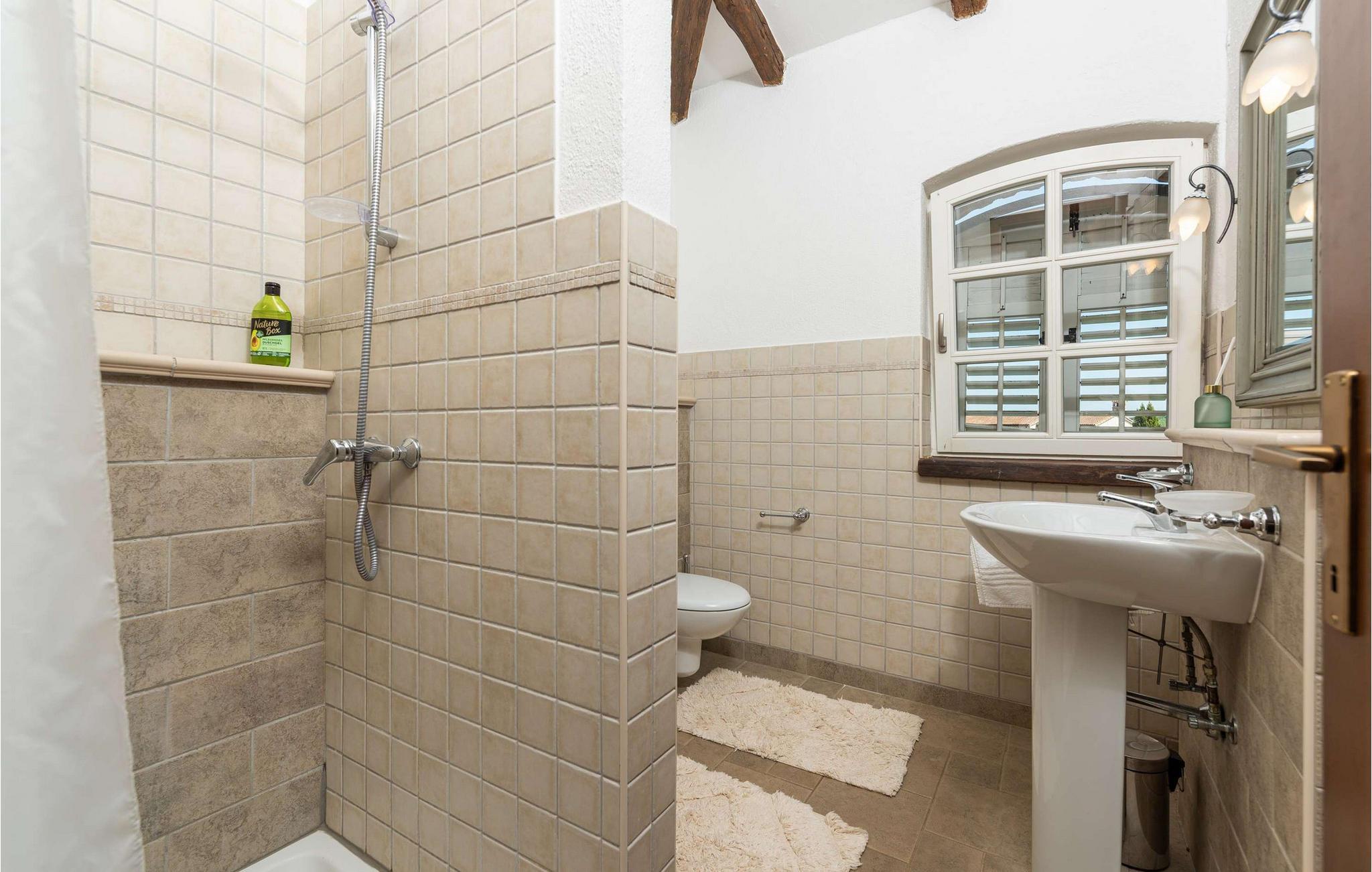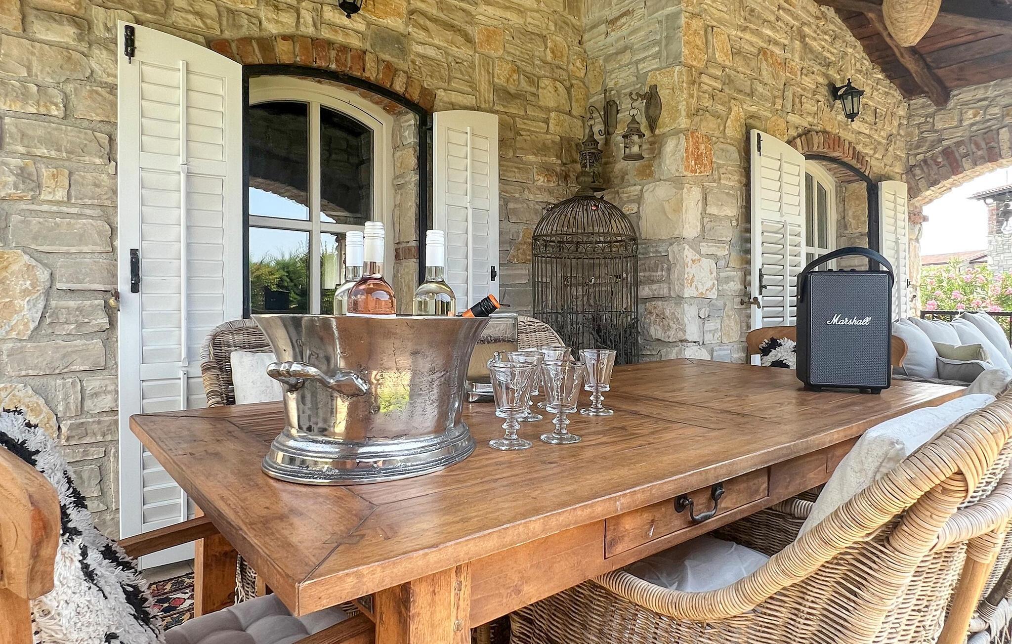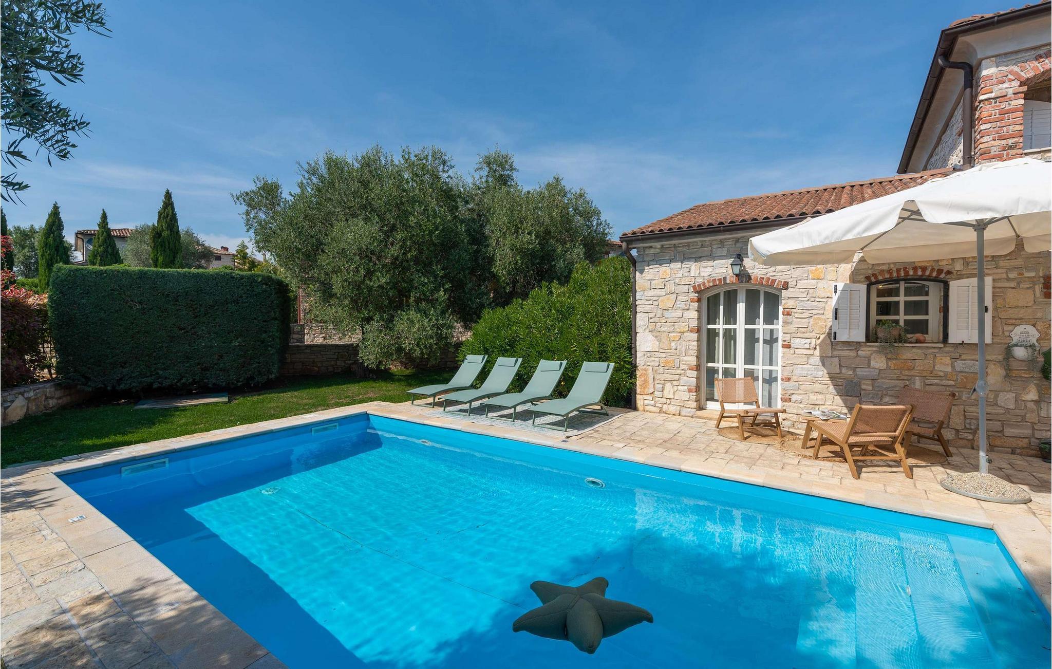 Villa Novel ligger i landsbyen Barat, bare 3 km fra byen Vi?njan. Dette stedet er det perfekte valget for alle som elsker tradisjoner og et rikt turistprogram som vil glede enhver gjest. Villa Novel vil tilby deg mer enn du trenger, og sammen med familie eller venner vil du nyte en perfekt ferie! Villa Novel ble renovert i 2022 i en rustikk arkitektonisk stil og tilbyr 165 m2 boareal, mens eiendommens totale areal er 750 m2. Villaen har aircondition og plass til maksimalt 9 personer, optimalt 8. Gjestene har første etasje og andre etasje til disposisjon. I første etasje er det to soverom med dobbeltsenger, og det er også to bad med badekar. Det rustikke og velutstyrte kjøkkenet vil glede deg med sitt utseende, og du vil nyte å tilberede måltider for hele familien der. Ved siden av kjøkkenet ligger spisestuen og stuen, som er utstyrt med en sofa, to lenestoler, et salongbord, en TV og en romantisk peis. Ovenpå er det ytterligere to soverom med dobbeltsenger og to bad med dusjkabinett. Fra samme etasje har Villa Novel utsikt over Adriaterhavet. På utendørsterrassen er det et 32 m2 stort svømmebasseng med en dybde på 1,8 meter. Ved siden av bassenget kan du sole deg på 9 solsenger, lese favorittboken din eller bare nyte solen. Terrassen har også et overbygd utendørs spisebord, en utendørs kull- eller vedgrill og uteservering. Villaen har også vaskemaskin og tørketrommel som kan være nyttige under oppholdet. I tillegg har villaen et separat toalett. Hvis du har barn med på ferie, er det et fôringskar og en barneseng tilgjengelig. Villaens gårdsplass er inngjerdet, så barna kan leke ubekymret i den vakkert anlagte hagen. Det er 3 private parkeringsplasser til disposisjon, og ytterligere to ligger utenfor. Vi?njan er en av Istrias vakreste byer med en spesiell sjarm og er kjent for sitt observatorium, som du kan besøke. Turistsentrene ? Pore? og Novigrad ? ligger ca. 20 km unna, og i nærheten finner du en rekke utmerkede vingårder og restauranter for de mest krevende gourmeter, som kan nyte spesialiteter med trøfler og andre istriske delikatesser. I Vi?njan kan du nyte romantiske kvelder med musikkonserter, filmvisninger, festivaler og messer om sommeren. Unn deg en ferie i Villa Novel og nyt et vakkert steinhus, eventyrlig natur og mange strender med et rikt turisttilbud. Velkommen til oss!