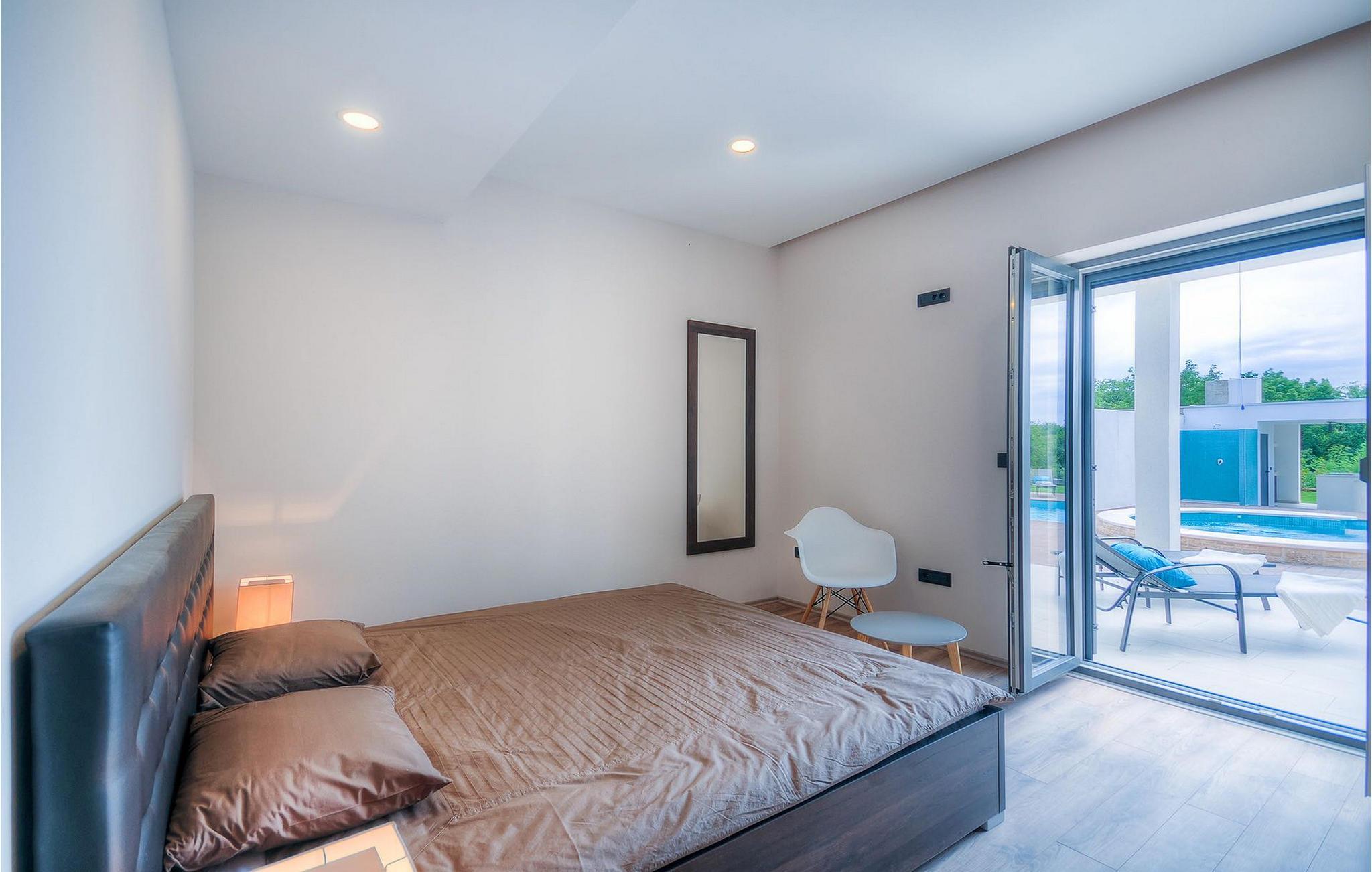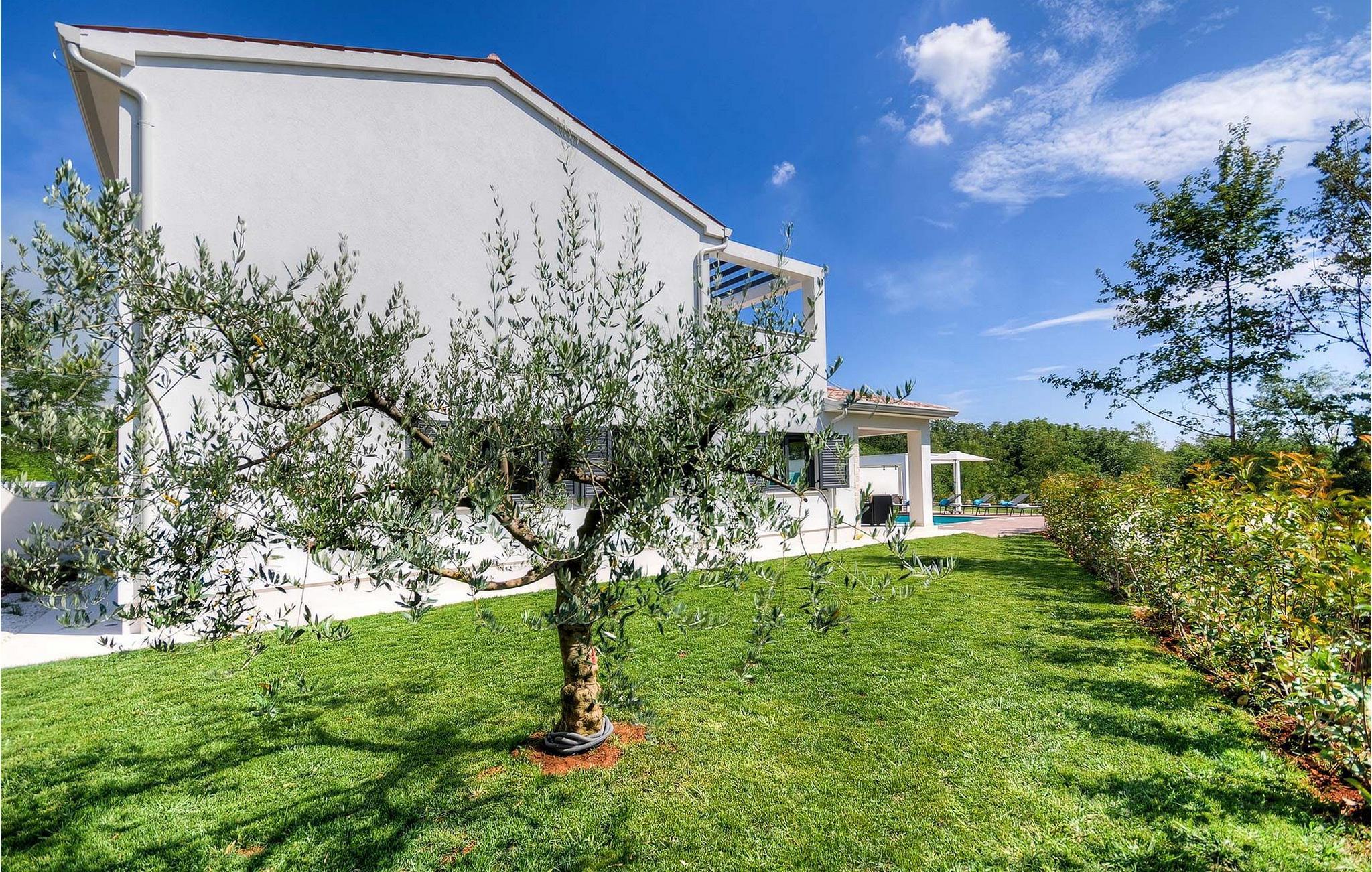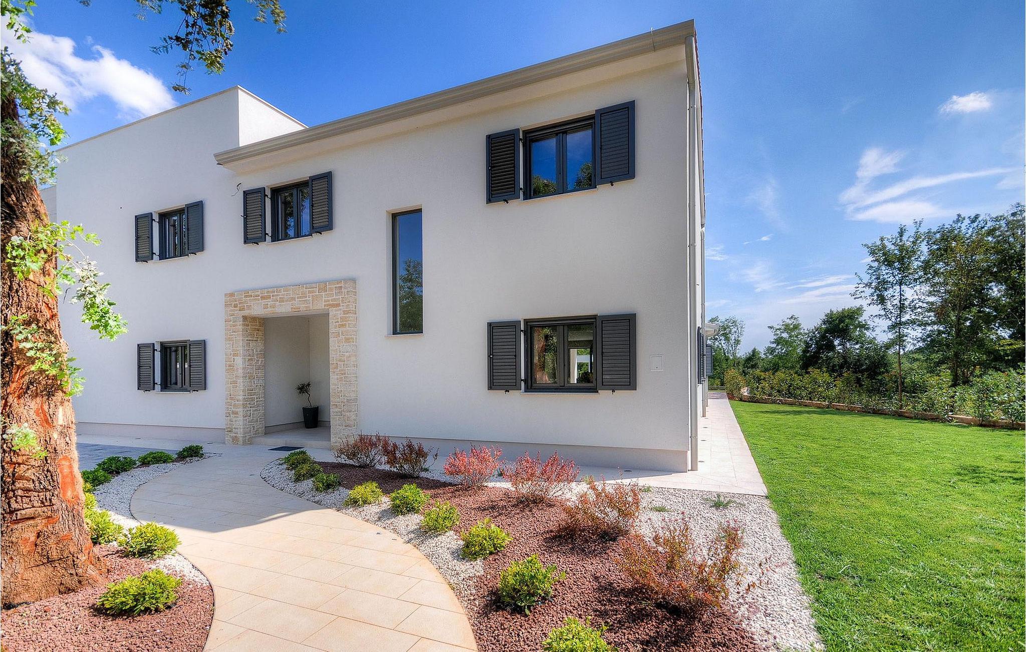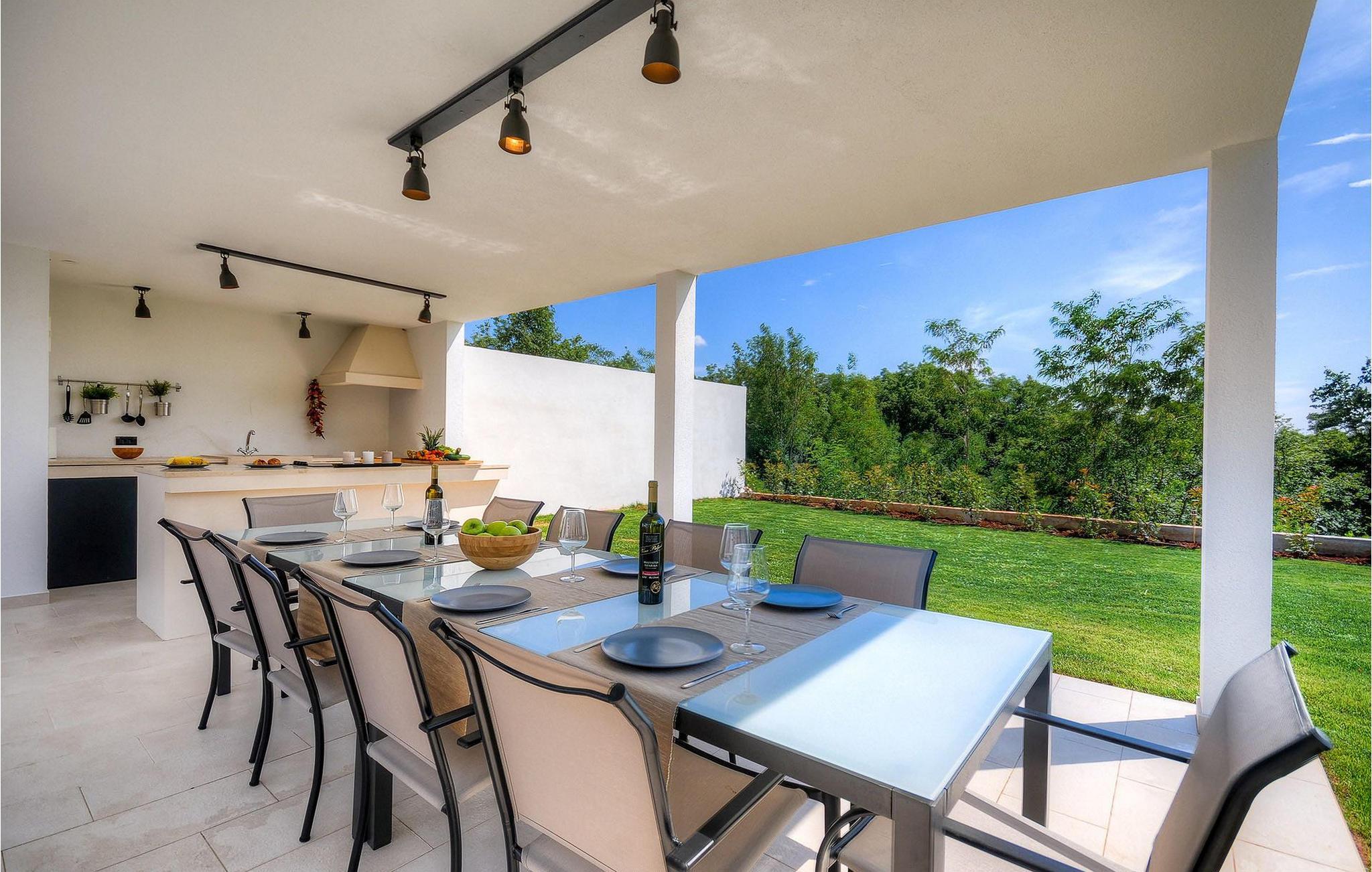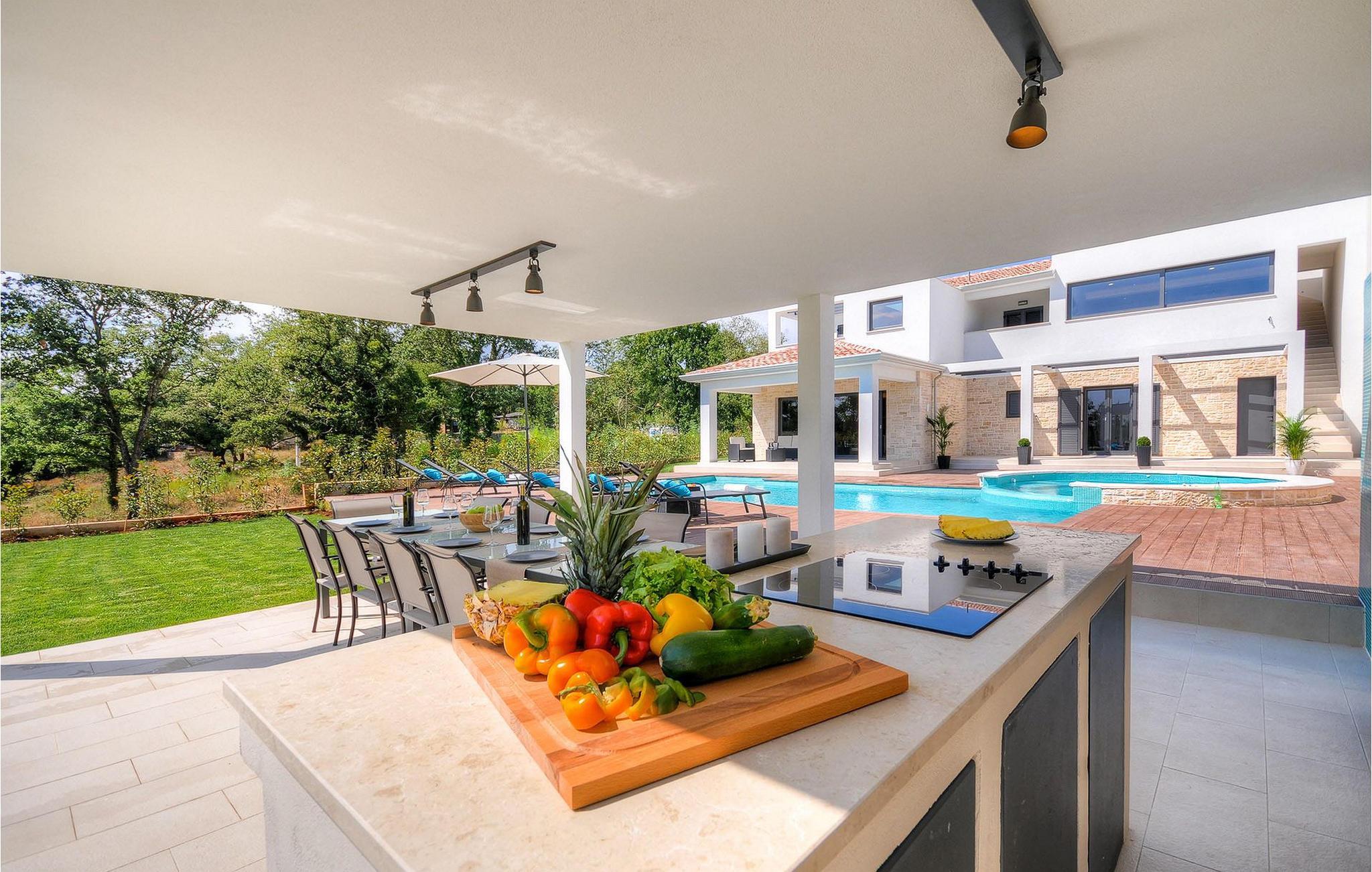 Uteområdet består av en inngjerdet, grønn hage hvor det doble bassenget med hydromassasje ligger. Terrassen har et vakkert sommerkjøkken med gassgrill og en annen uteservering hvor du kan tilberede deilige måltider. Villa Onyx har klimaanlegg, WiFi, privat parkering for 2 biler og alt du trenger for en hyggelig ferie. Denne moderne villaen ligger i rolige omgivelser og er et perfekt sted å trekke seg tilbake fra den moderne hverdagen. Likevel er det bare en kort kjøretur unna Istrias turistsentre og historiske steder. Strendene ligger 12 km fra villaen, og du kan velge mellom mange forskjellige strender i Porec-regionen. Turismen rundt Porec er mye mer enn bare hav, sol og turister. Det er lett å kjenne igjen at byen har bevart sitt historiske image. Her finner du museer, gallerier og mange severdigheter som er verdt å se. Hele sentrum er et levende kulturminne. I gatene ligger det mange gallerier og utstillingslokaler som tar vare på tradisjonen på en moderne måte. En fin måte å bli kjent med Istria på er gjennom den eksepsjonelle gastronomien.