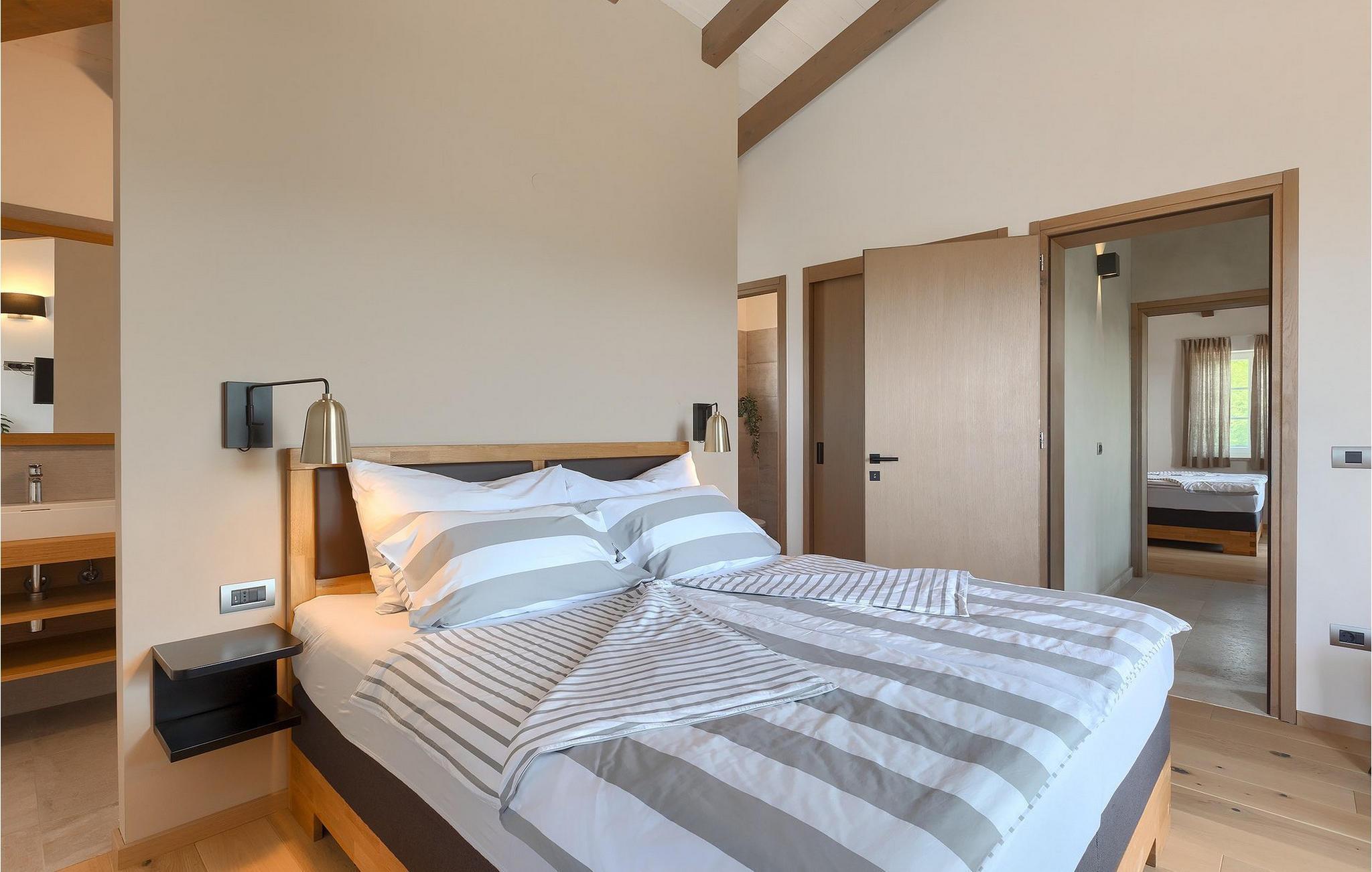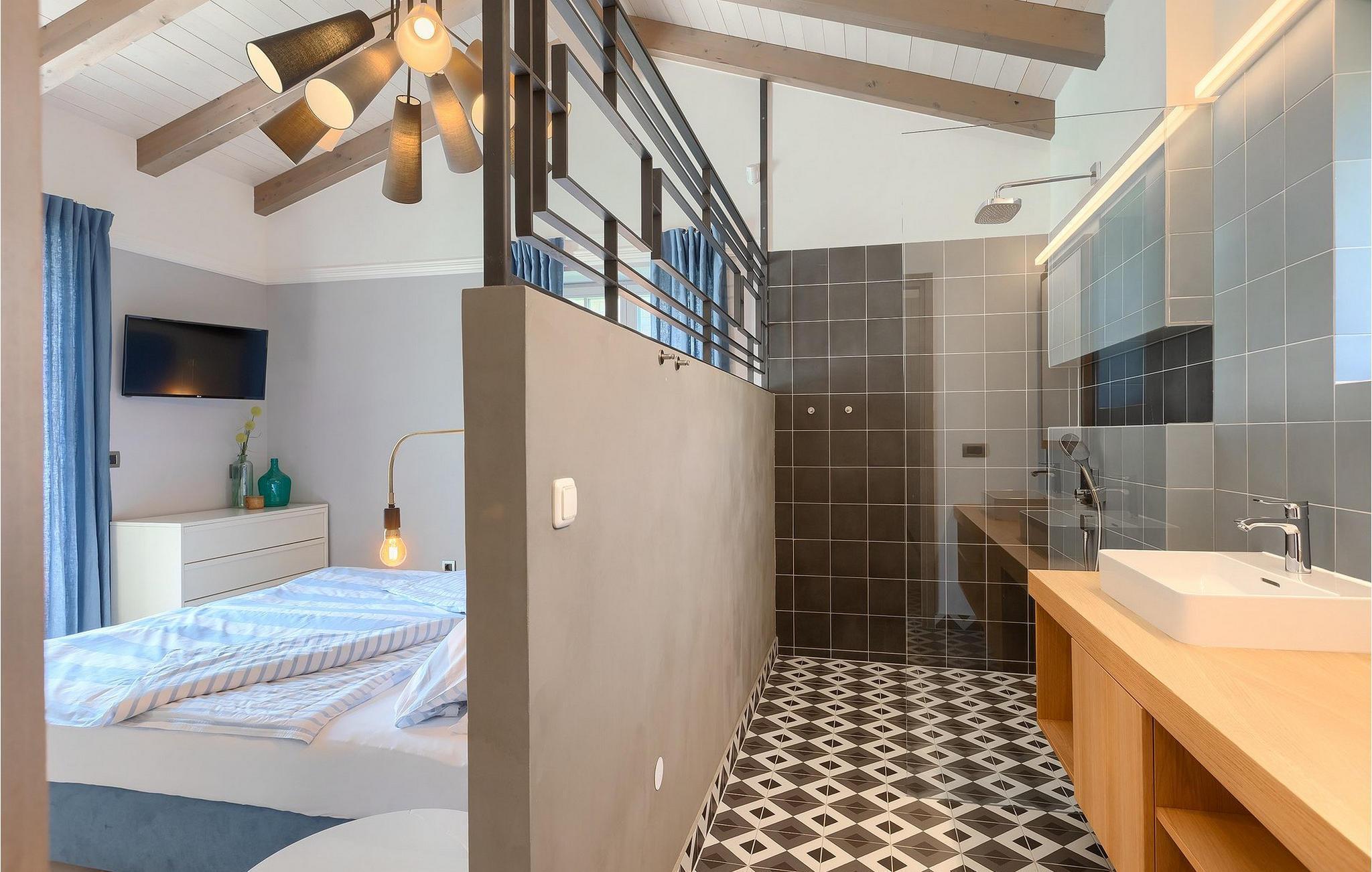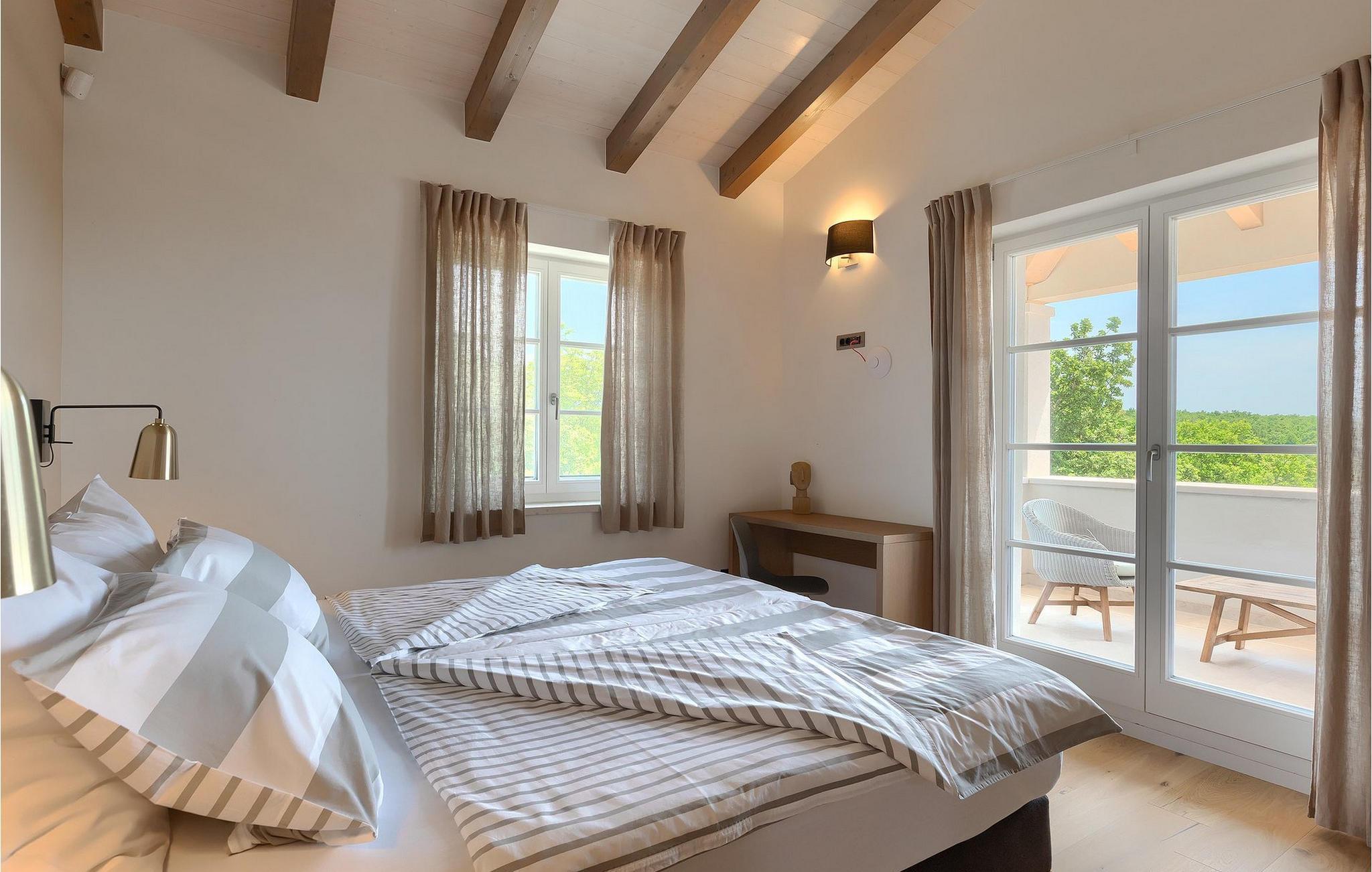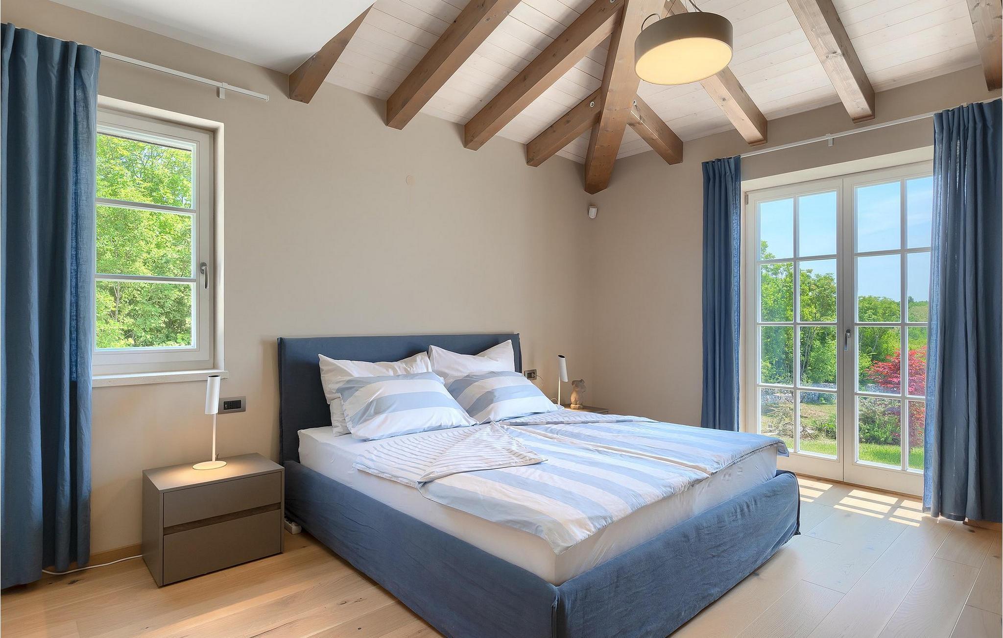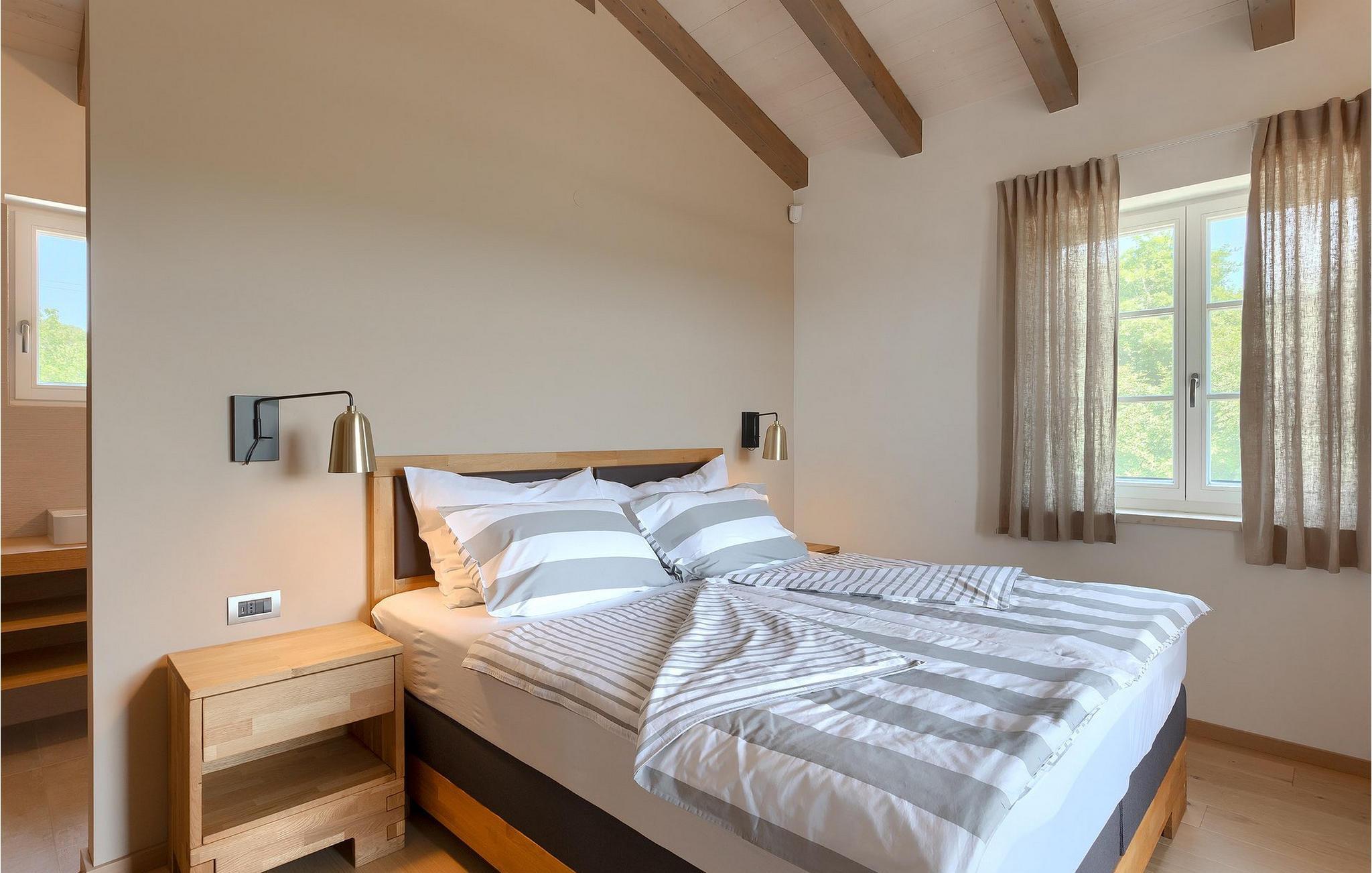 Første etasje har to soverom, begge med elegant privat bad integrert i rommet. Alle soverommene er elegant innredet med stilfulle, nøye utvalgte detaljer i harmoniske fargetoner. Trebjelkene på veggene gir det vakre interiøret i Villa Carinzia et rustikt preg med moderne stil, slik at du vil føle at drømmeferien i Istria starter riktig!