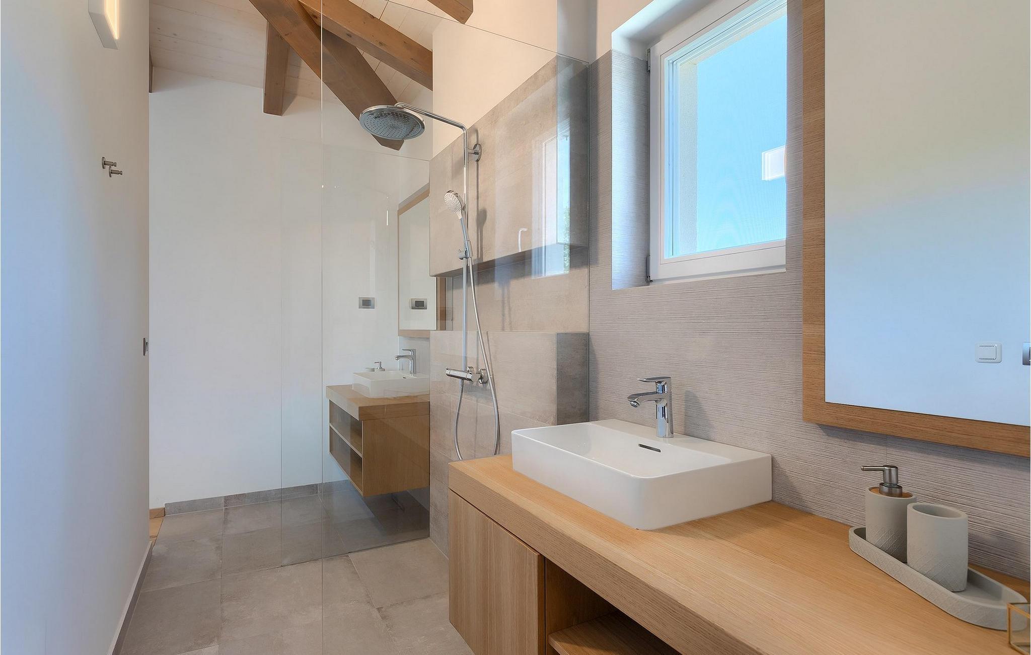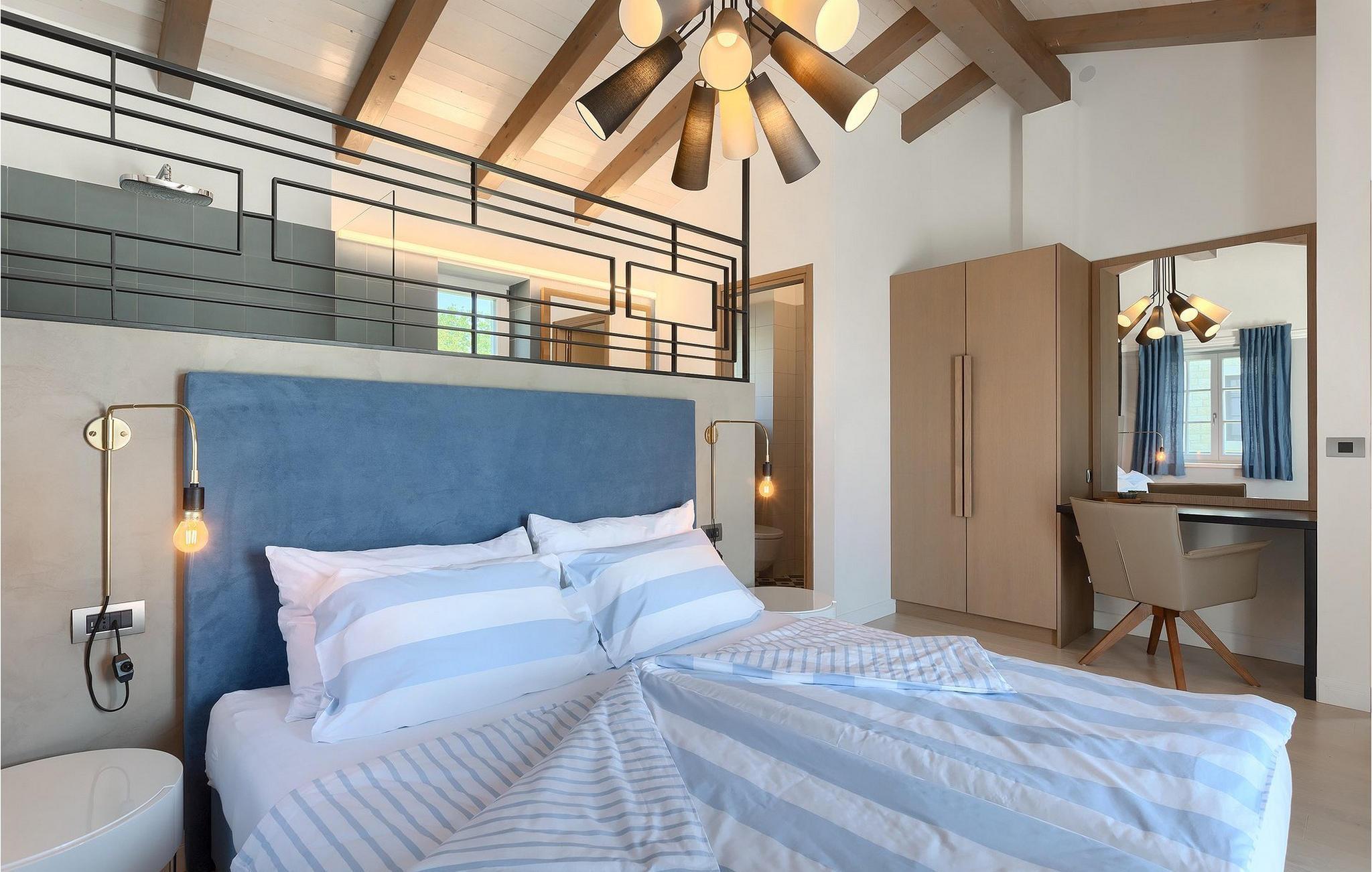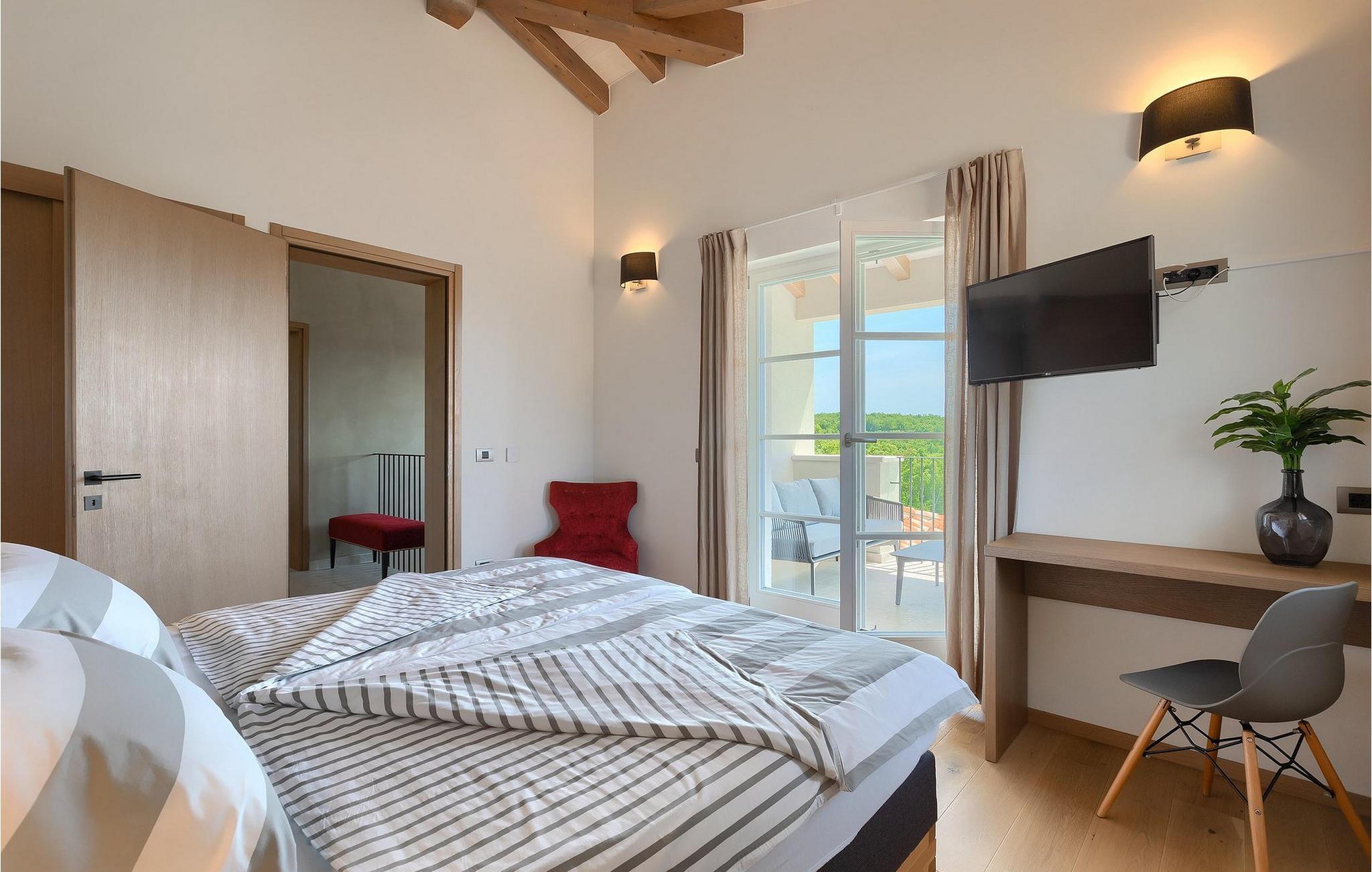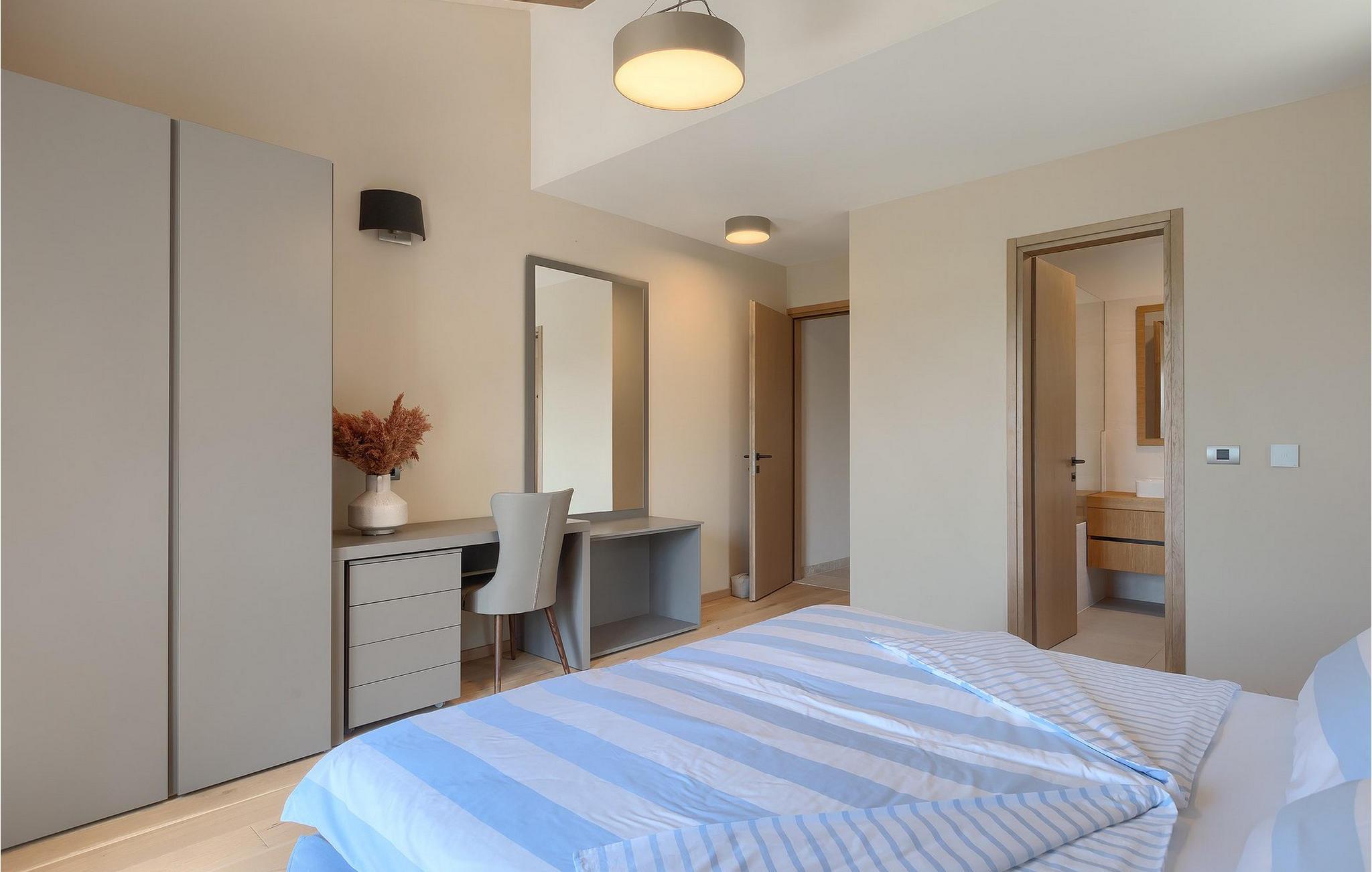 Første etasje har to soverom, begge med elegant privat bad integrert i rommet. Alle soverommene er elegant innredet med stilfulle, nøye utvalgte detaljer i harmoniske fargetoner. Trebjelkene på veggene gir det vakre interiøret i Villa Carinzia et rustikt preg med moderne stil, slik at du vil føle at drømmeferien i Istria starter riktig!