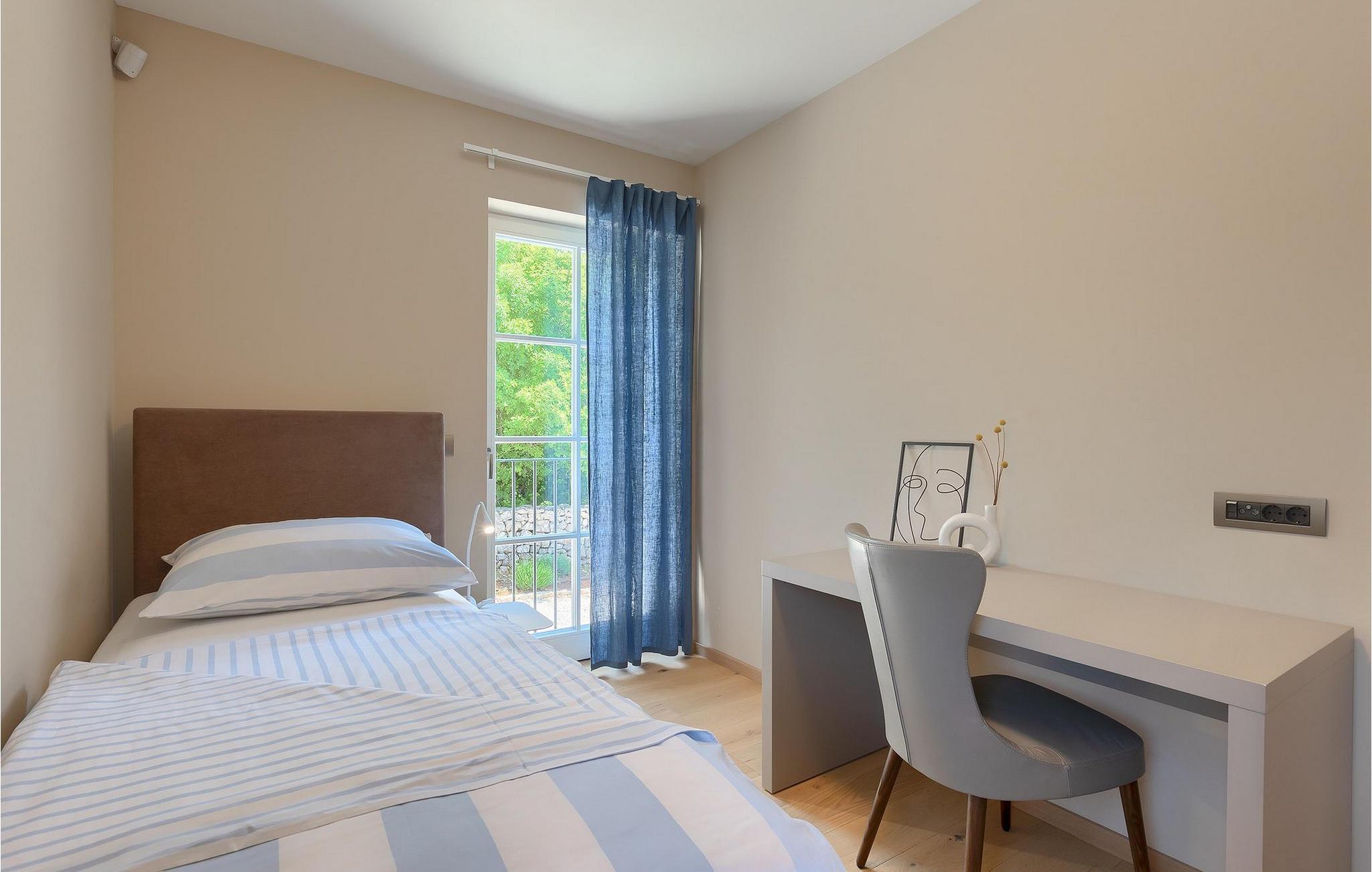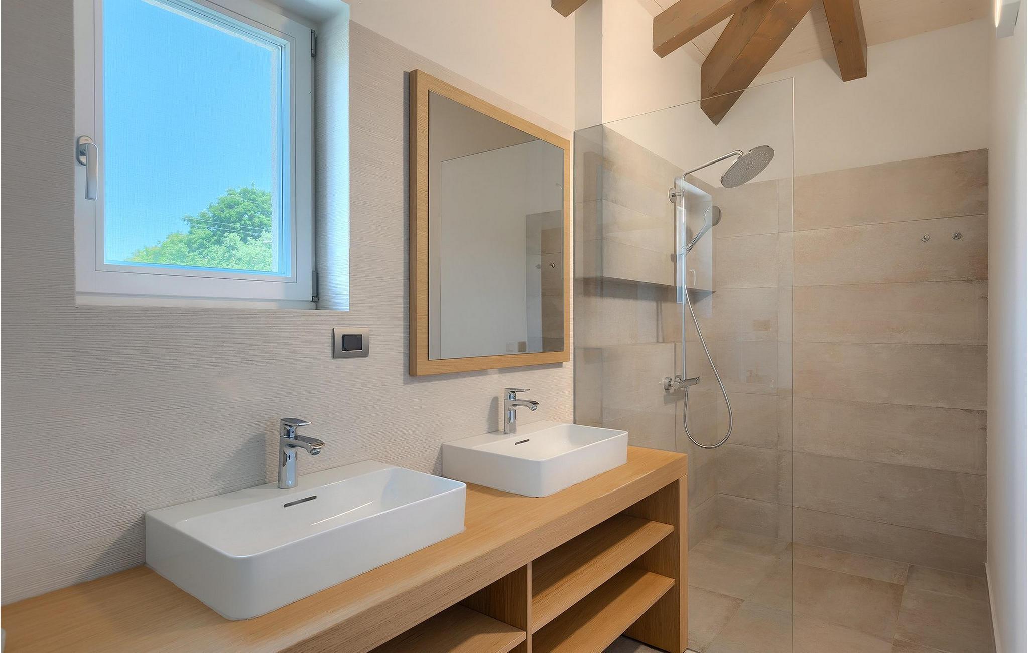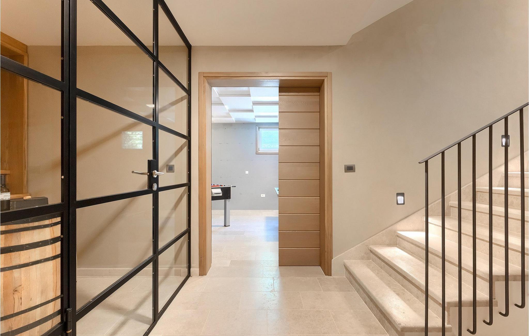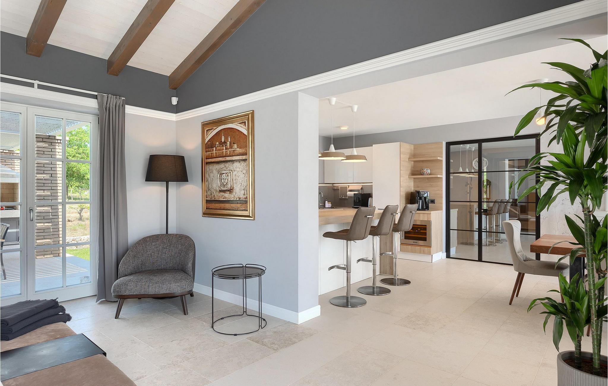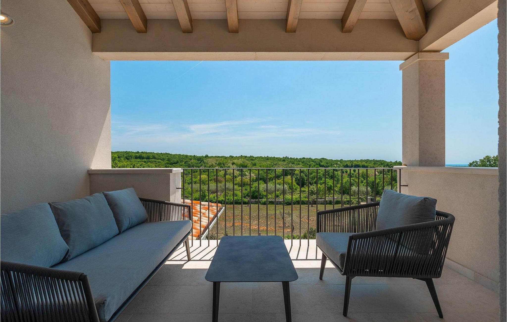 Første etasje har to soverom, begge med elegant privat bad integrert i rommet. Alle soverommene er elegant innredet med stilfulle, nøye utvalgte detaljer i harmoniske fargetoner. Trebjelkene på veggene gir det vakre interiøret i Villa Carinzia et rustikt preg med moderne stil, slik at du vil føle at drømmeferien i Istria starter riktig!