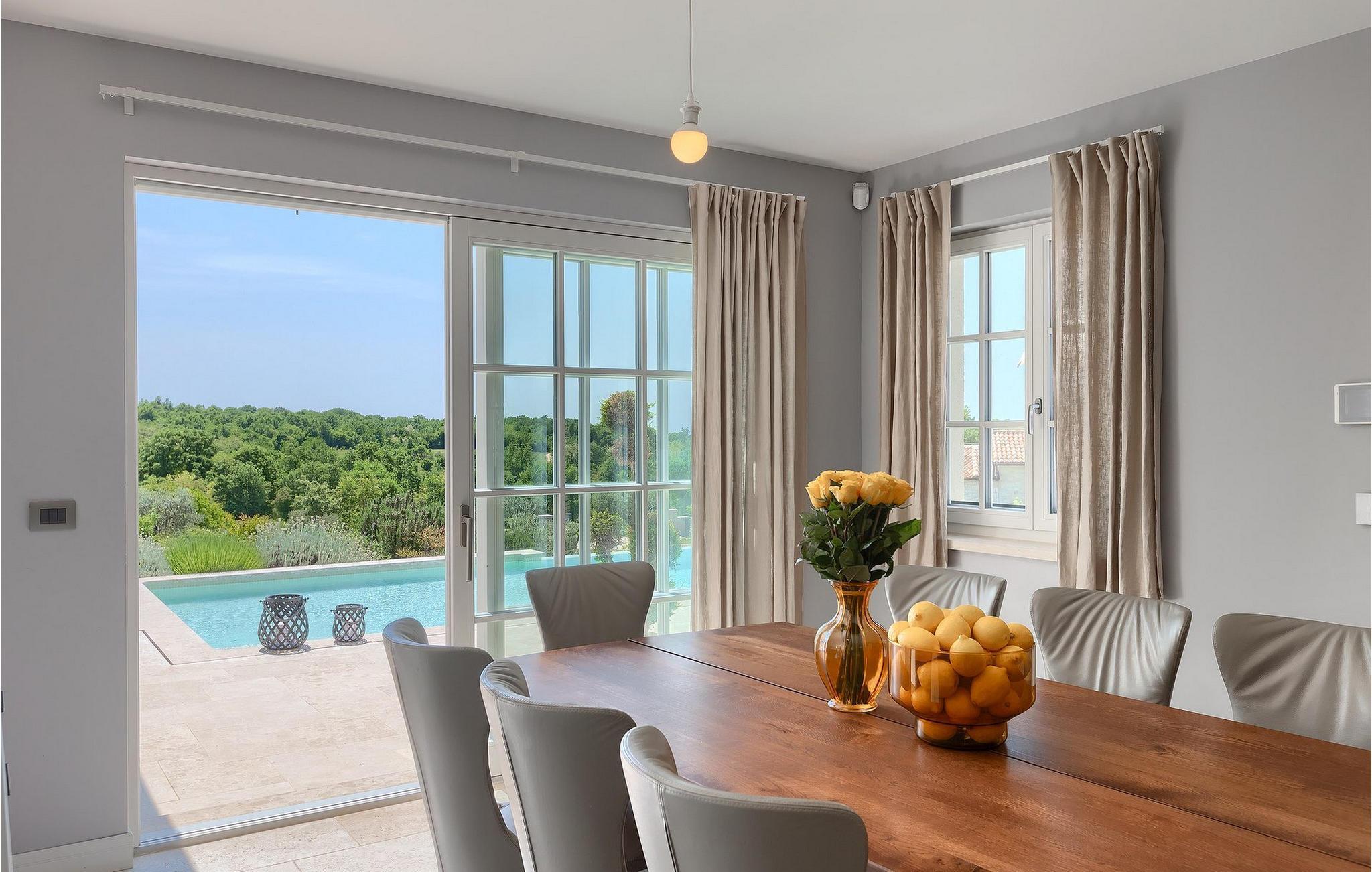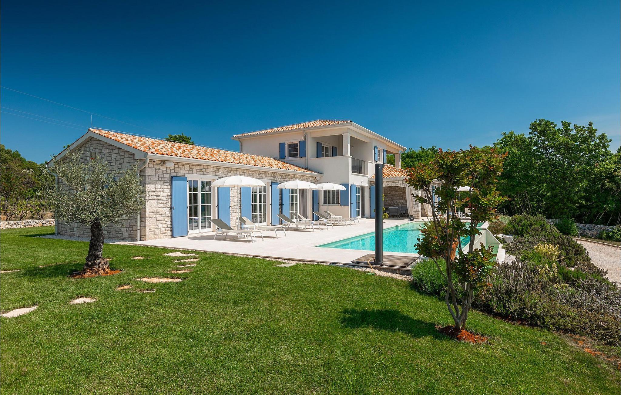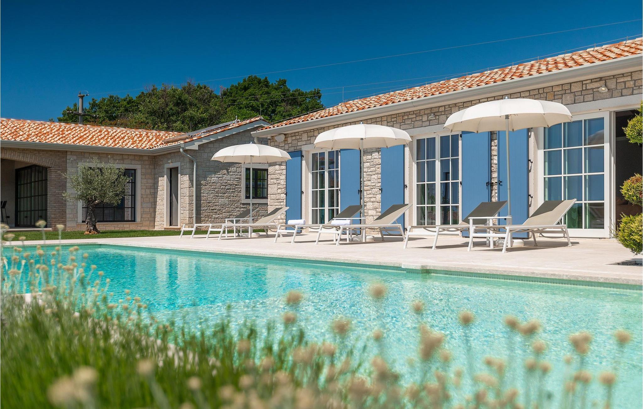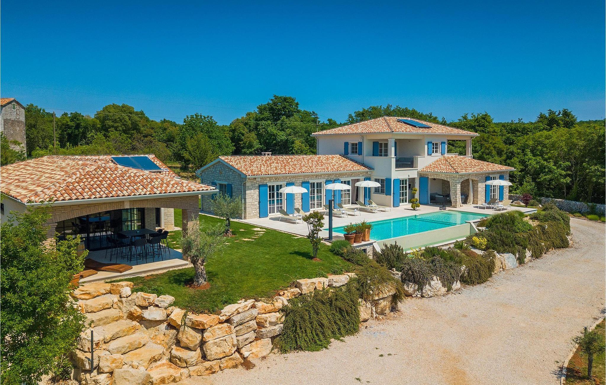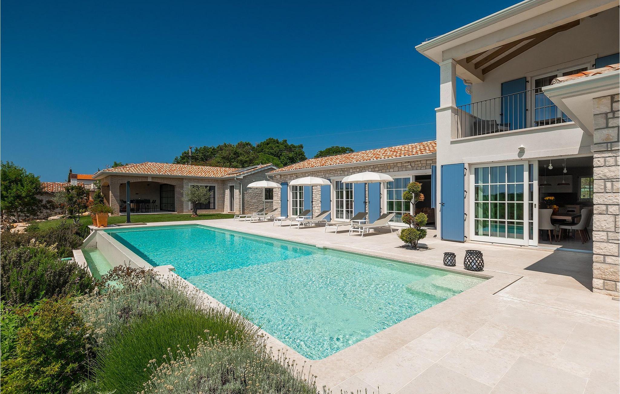 Er du på utkikk etter en romslig villa med vakker hage, privat basseng og lekkert interiør i nærheten av turistbyene? Med sin vakre steinfasade og blå skodder i middelhavsstil ser denne flotte villaen innbydende ut også fra utsiden. Midt i den store hagen ligger det innbydende, store private bassenget med mange solsenger og parasoller for dem som foretrekker å ligge i skyggen. Bassenget strekker seg ut slik at du kan nyte det vakre, grønne panoramaet over Istrias innland mens du slapper av på en solseng i middagsvarmen. I den velstelte hagen finner du også en grill og en overbygd uteservering med god plass til felles middager.