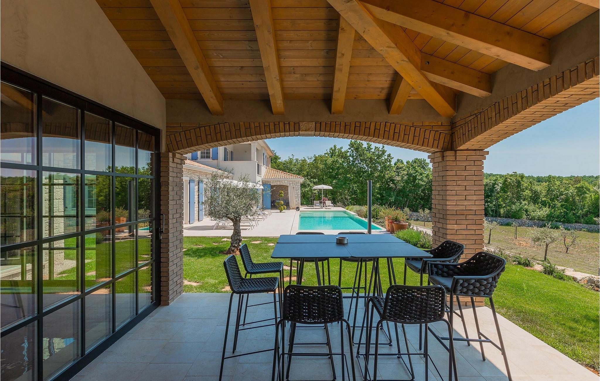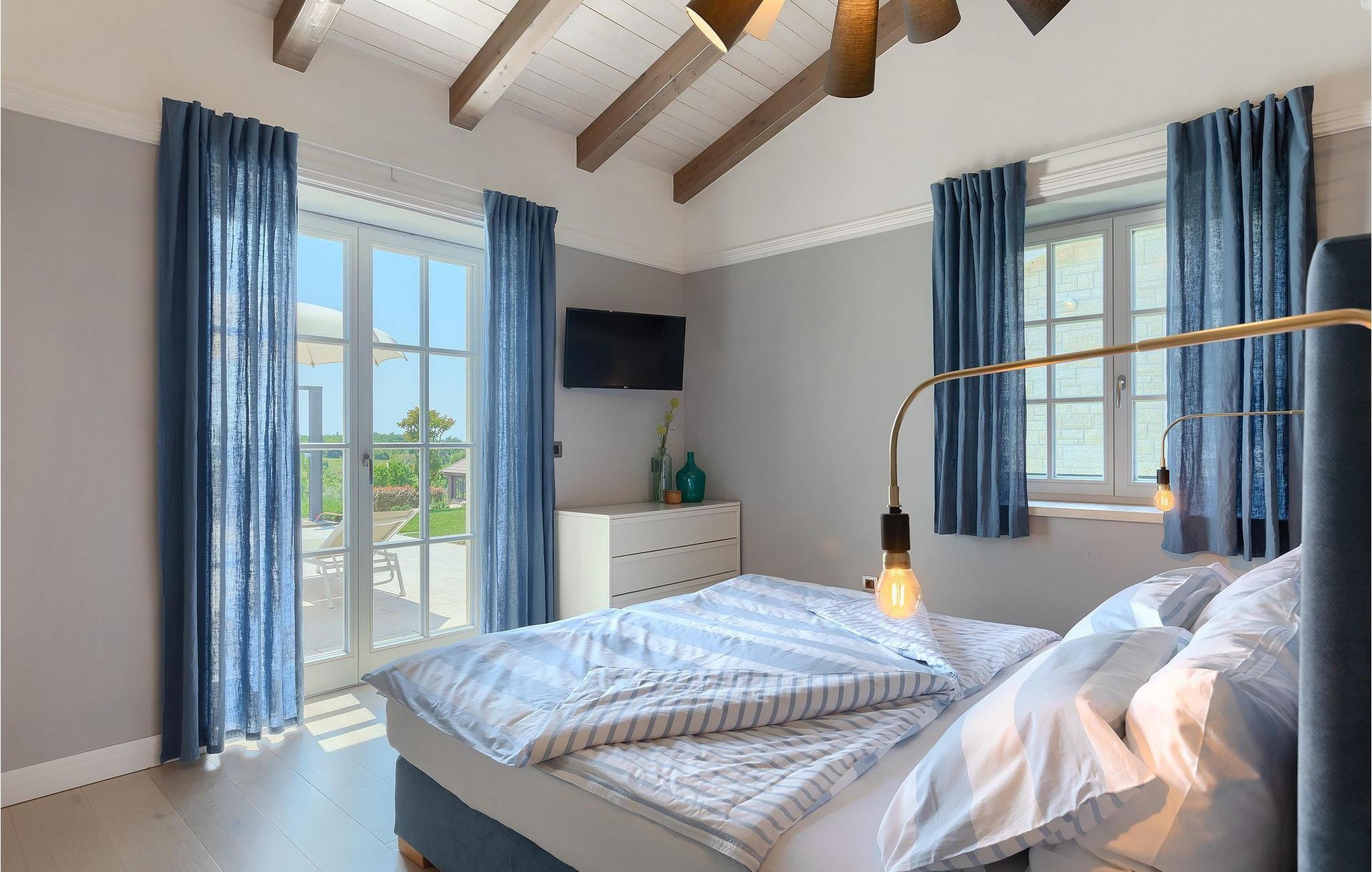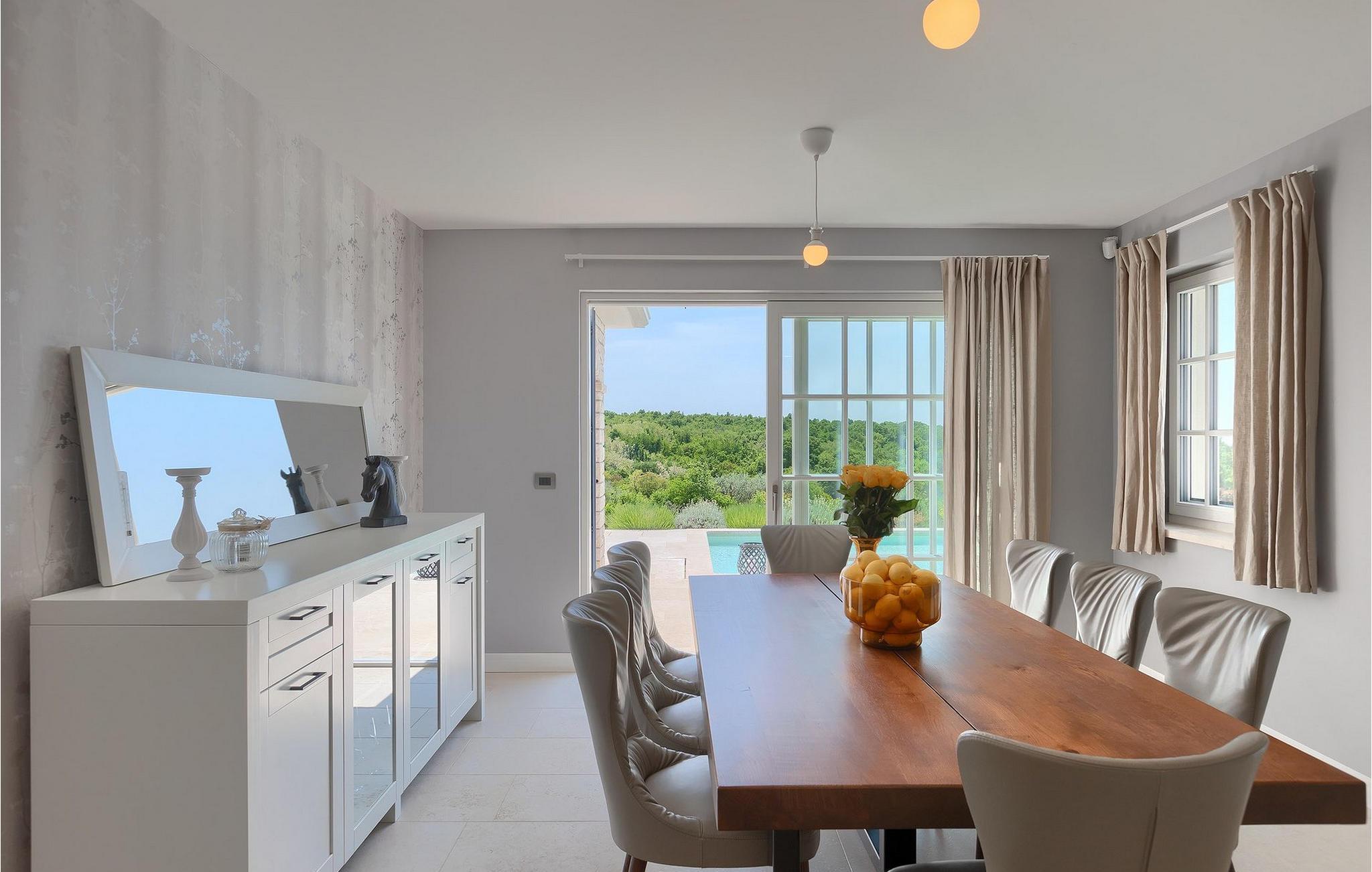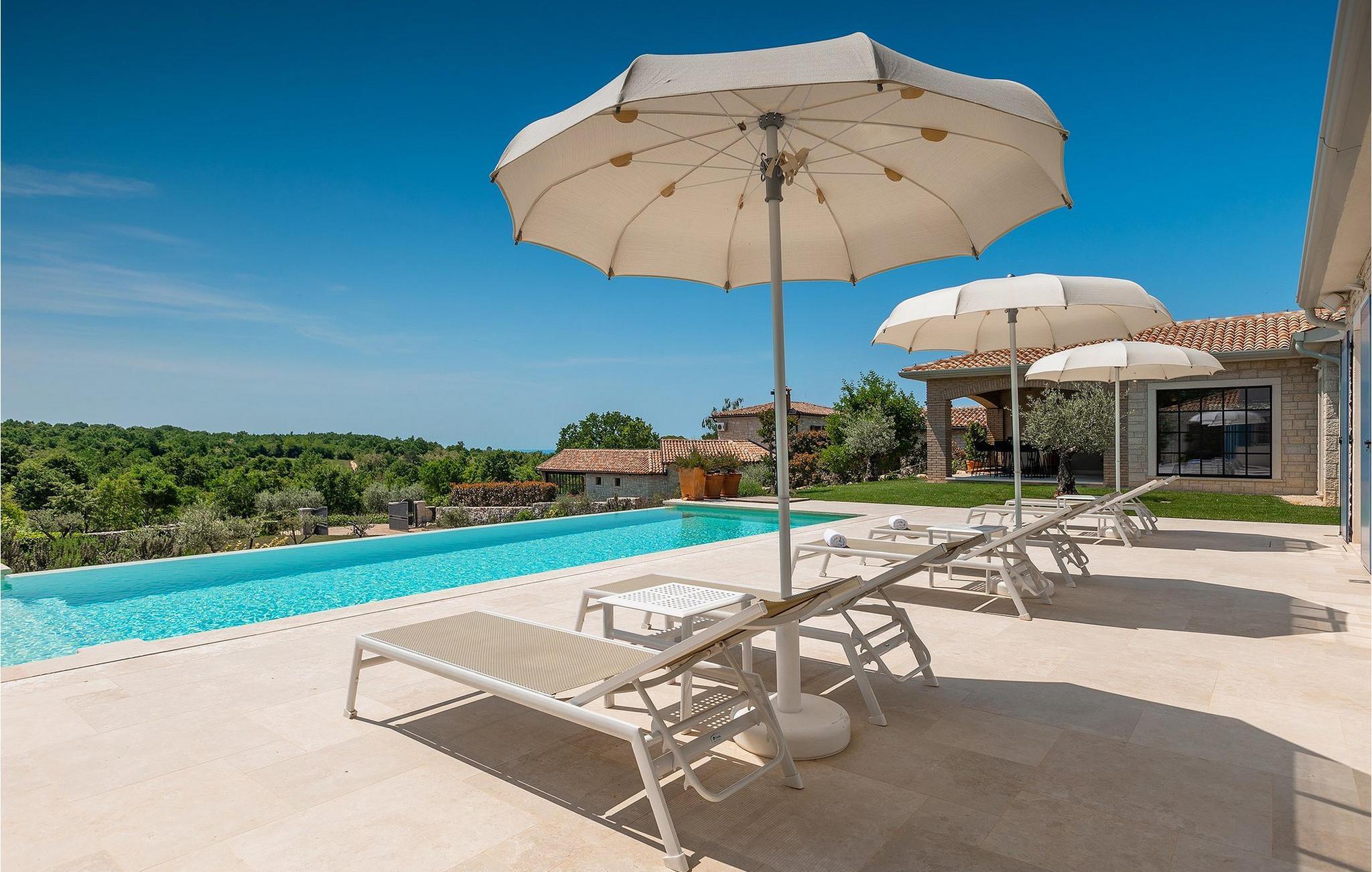 Er du på utkikk etter en romslig villa med vakker hage, privat basseng og lekkert interiør i nærheten av turistbyene? Med sin vakre steinfasade og blå skodder i middelhavsstil ser denne flotte villaen innbydende ut også fra utsiden. Midt i den store hagen ligger det innbydende, store private bassenget med mange solsenger og parasoller for dem som foretrekker å ligge i skyggen. Bassenget strekker seg ut slik at du kan nyte det vakre, grønne panoramaet over Istrias innland mens du slapper av på en solseng i middagsvarmen. I den velstelte hagen finner du også en grill og en overbygd uteservering med god plass til felles middager.