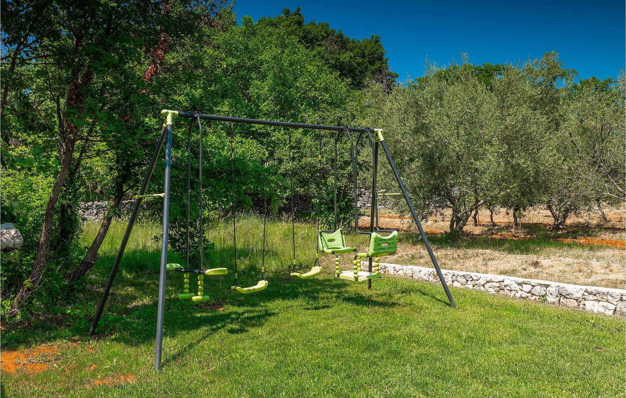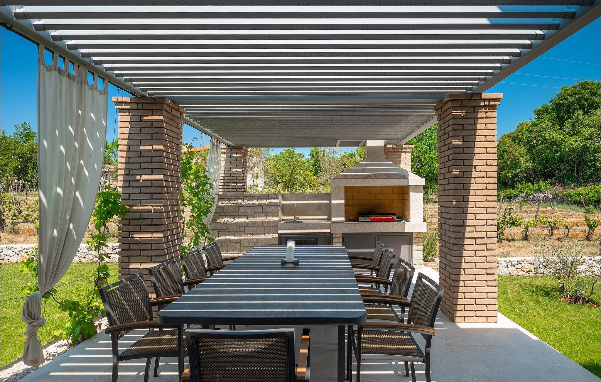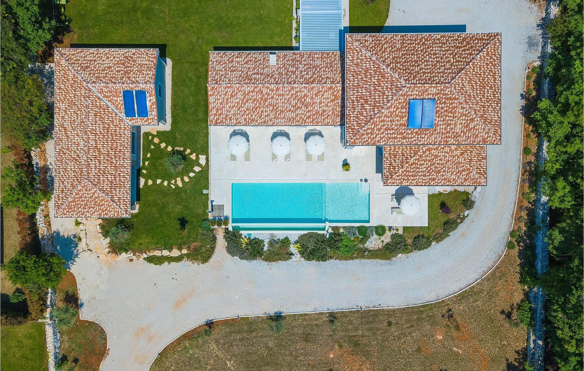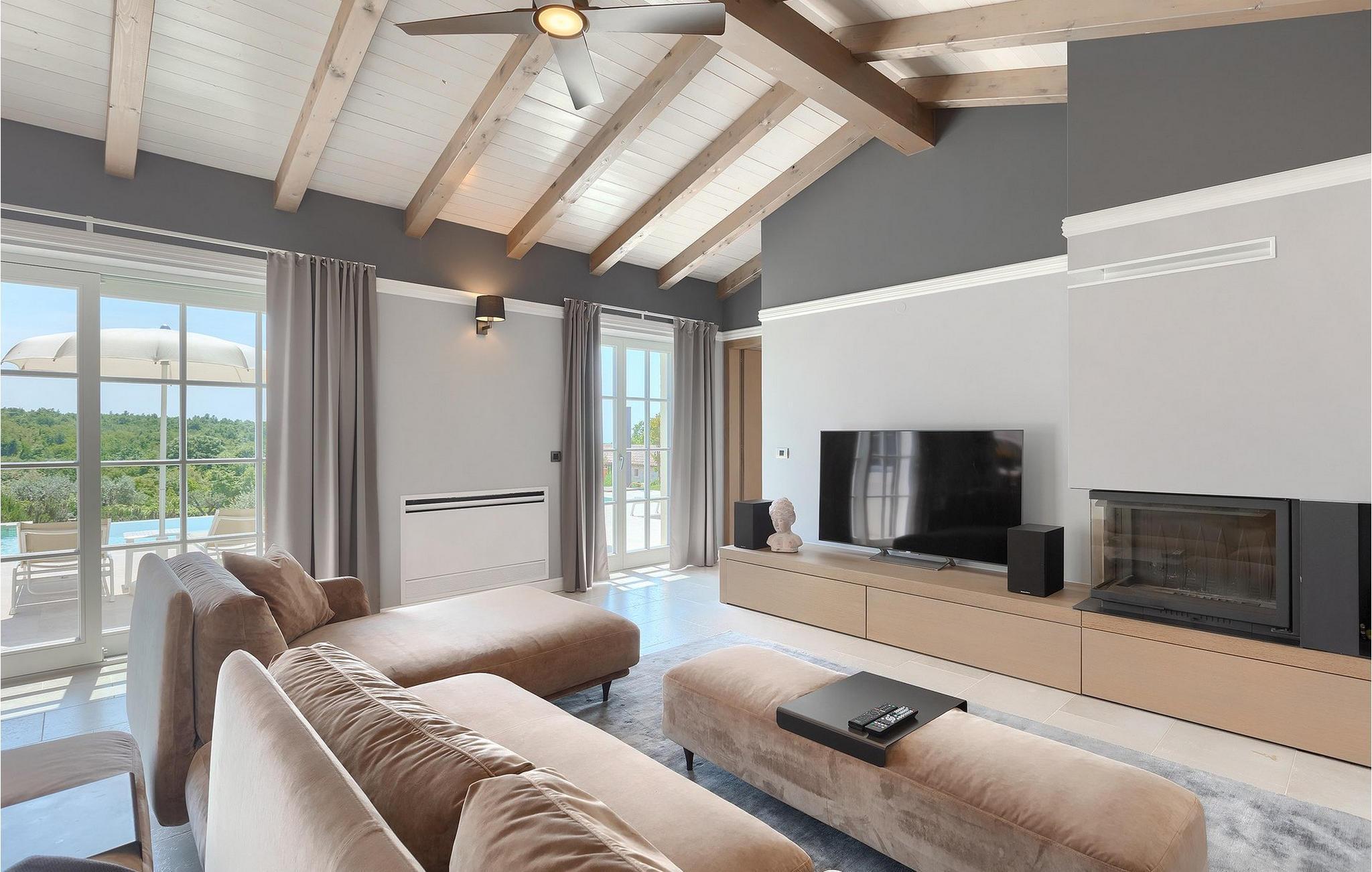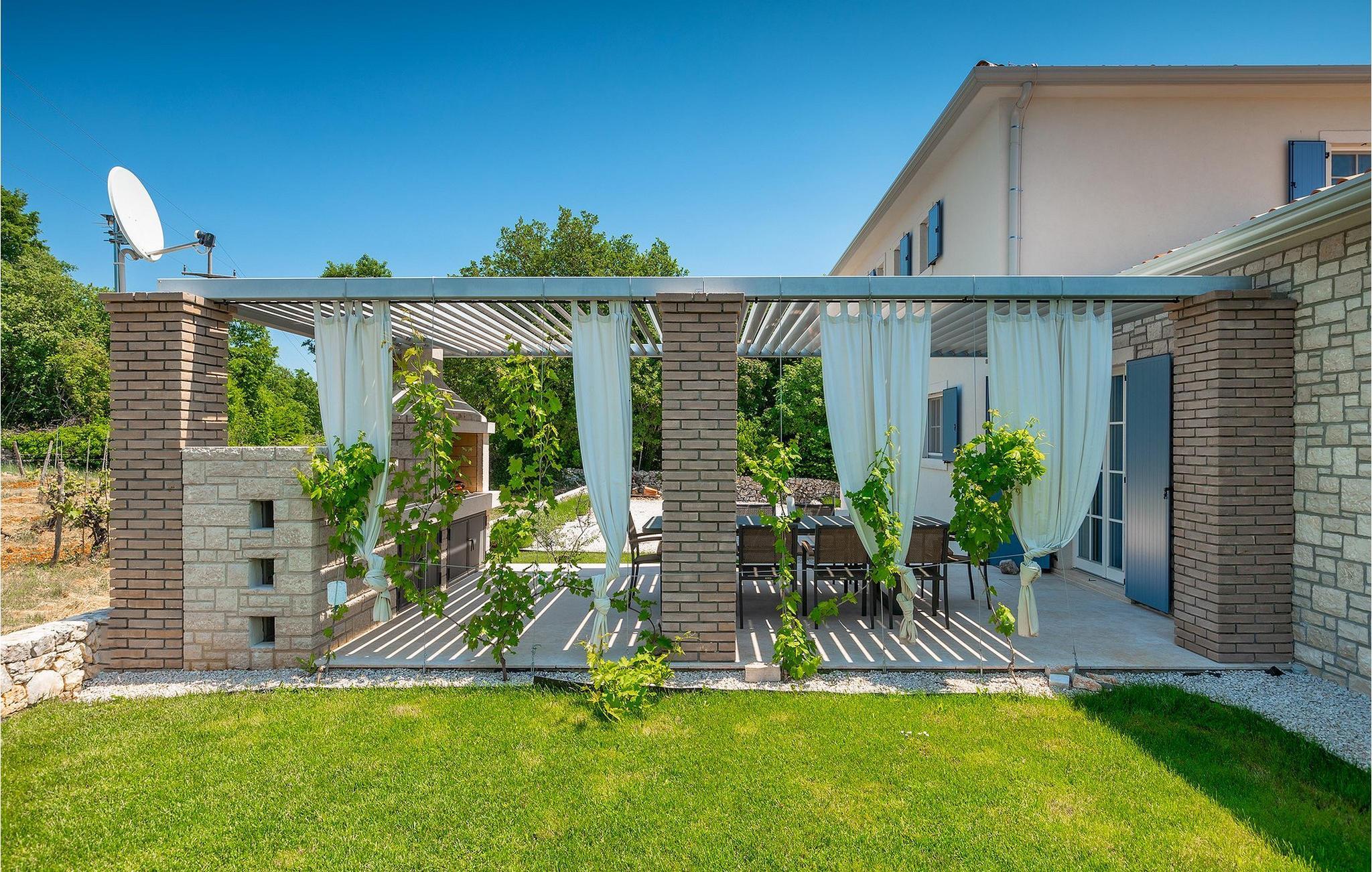 Er du på utkikk etter en romslig villa med vakker hage, privat basseng og lekkert interiør i nærheten av turistbyene? Med sin vakre steinfasade og blå skodder i middelhavsstil ser denne flotte villaen innbydende ut også fra utsiden. Midt i den store hagen ligger det innbydende, store private bassenget med mange solsenger og parasoller for dem som foretrekker å ligge i skyggen. Bassenget strekker seg ut slik at du kan nyte det vakre, grønne panoramaet over Istrias innland mens du slapper av på en solseng i middagsvarmen. I den velstelte hagen finner du også en grill og en overbygd uteservering med god plass til felles middager.