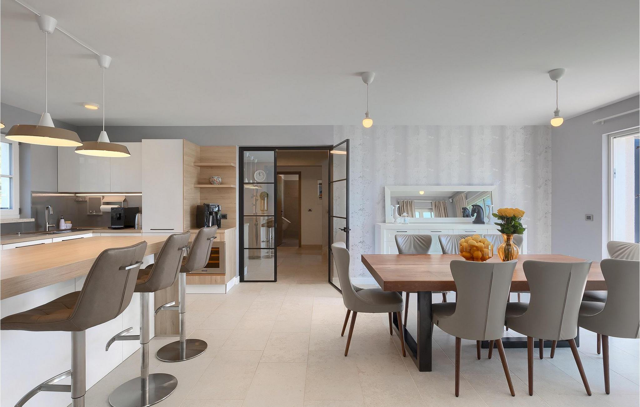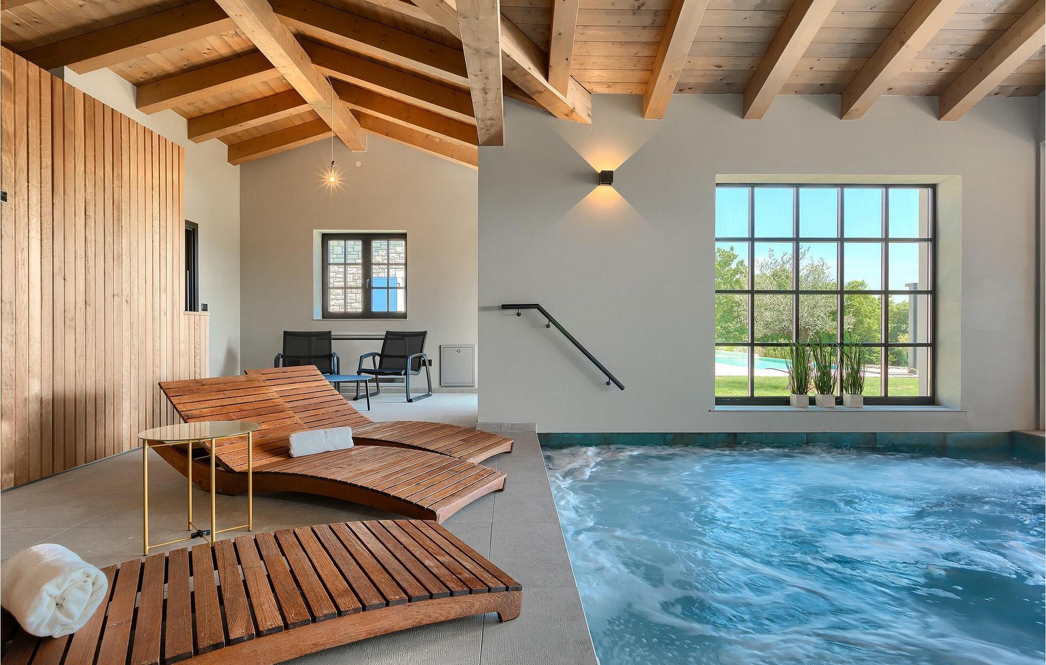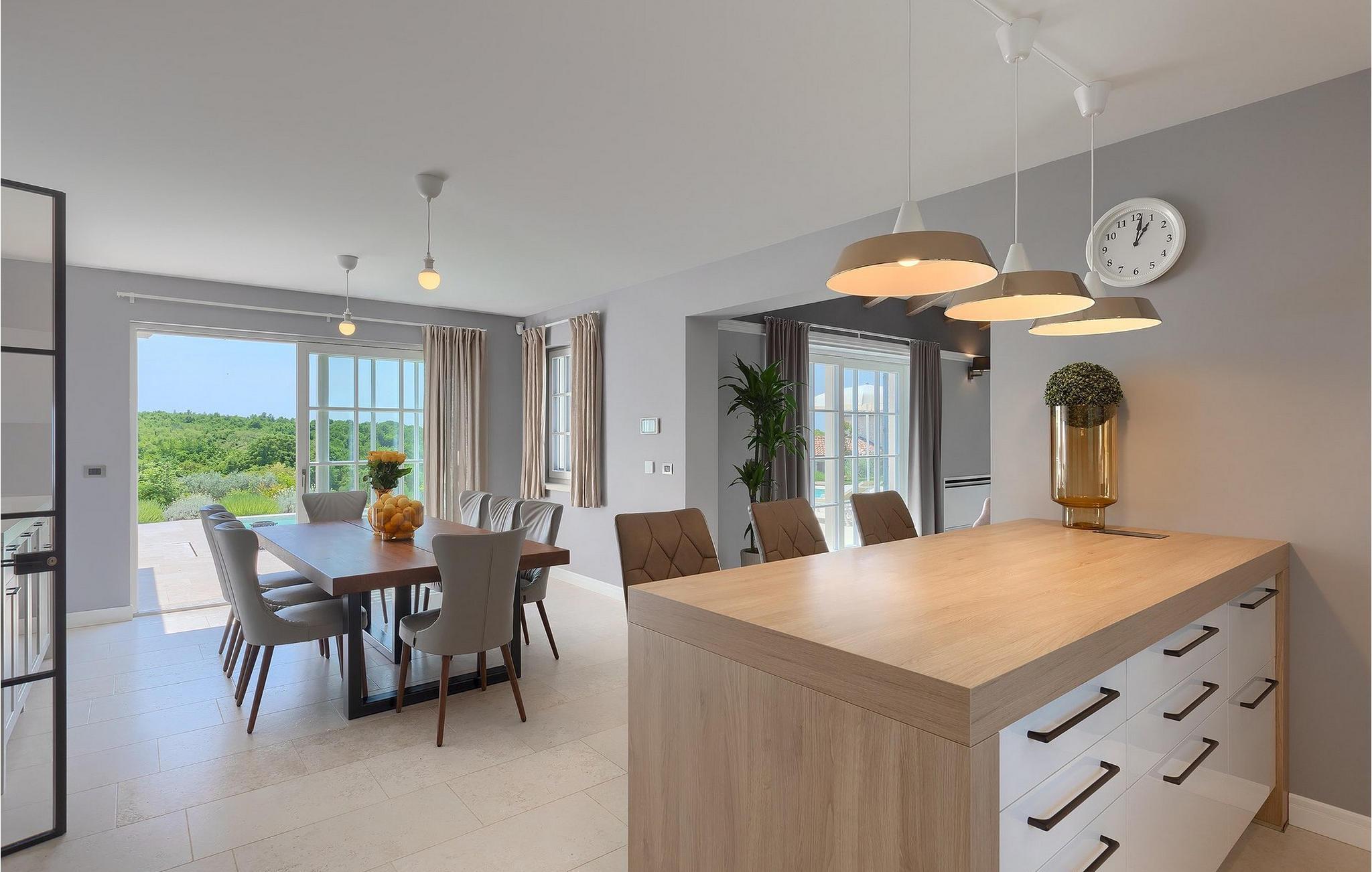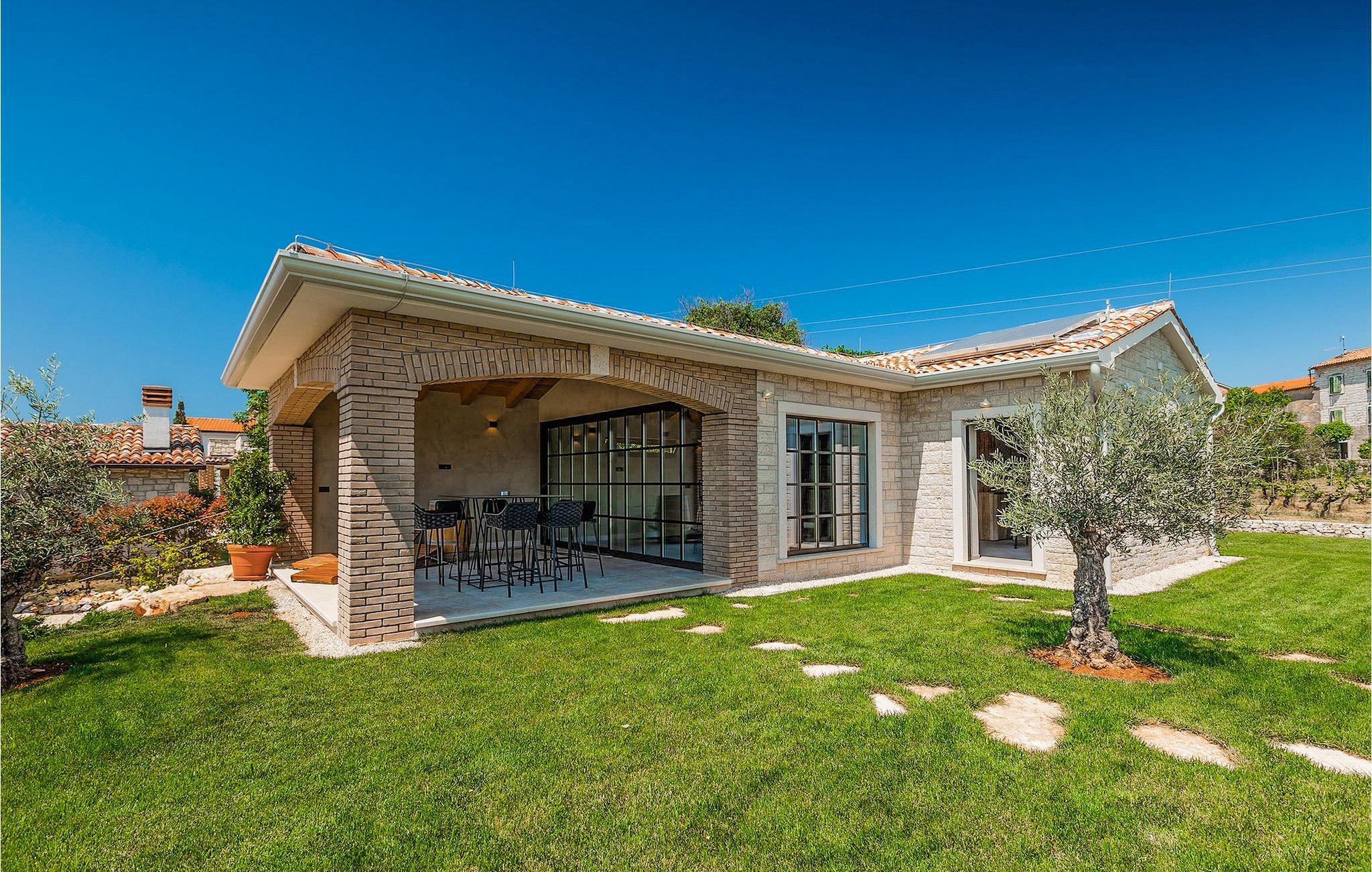I hovedhuset har kjelleren blitt omgjort til en vinkjeller hvor du kan smake på flytende delikatesser til gode priser. Denne fantastiske villaen ligger i den sjarmerende lille byen Visnjan, i den vestlige delen av Istria-halvøya. Den praktiske beliggenheten og nærheten til turistbyer som Novigrad (20 km), Porec (16 km) og den romantiske byen Rovinj (38 km), som ligger litt lenger unna, gjør dette til et perfekt utgangspunkt for videre utflukter. Selv om Visnjan er liten, har den mye å by på med sin historiske bakgrunn og mange severdigheter (vakkert gammelt sentrum med kirker og murer med klokketårn fra 1200-tallet). I nærheten av Visnjan kan du også besøke et observatorium, lære om himmellegemer og beundre stjerner. I dette området kan du utforske det magiske istriske innlandet gjennom sykkelturer i naturen eller eno-gastro-utflukter. En av turistattraksjonene du kan besøke her, er Baredine-grotten - et karstfenomen, et geomorfologisk naturmonument og det første speleologiske området i Istria som har vært åpent for turister siden 1995. Den nærmeste stranden ligger bare 14 km unna, og innenfor en radius på 1 km fra villaen finner du også butikker, barer og restauranter.