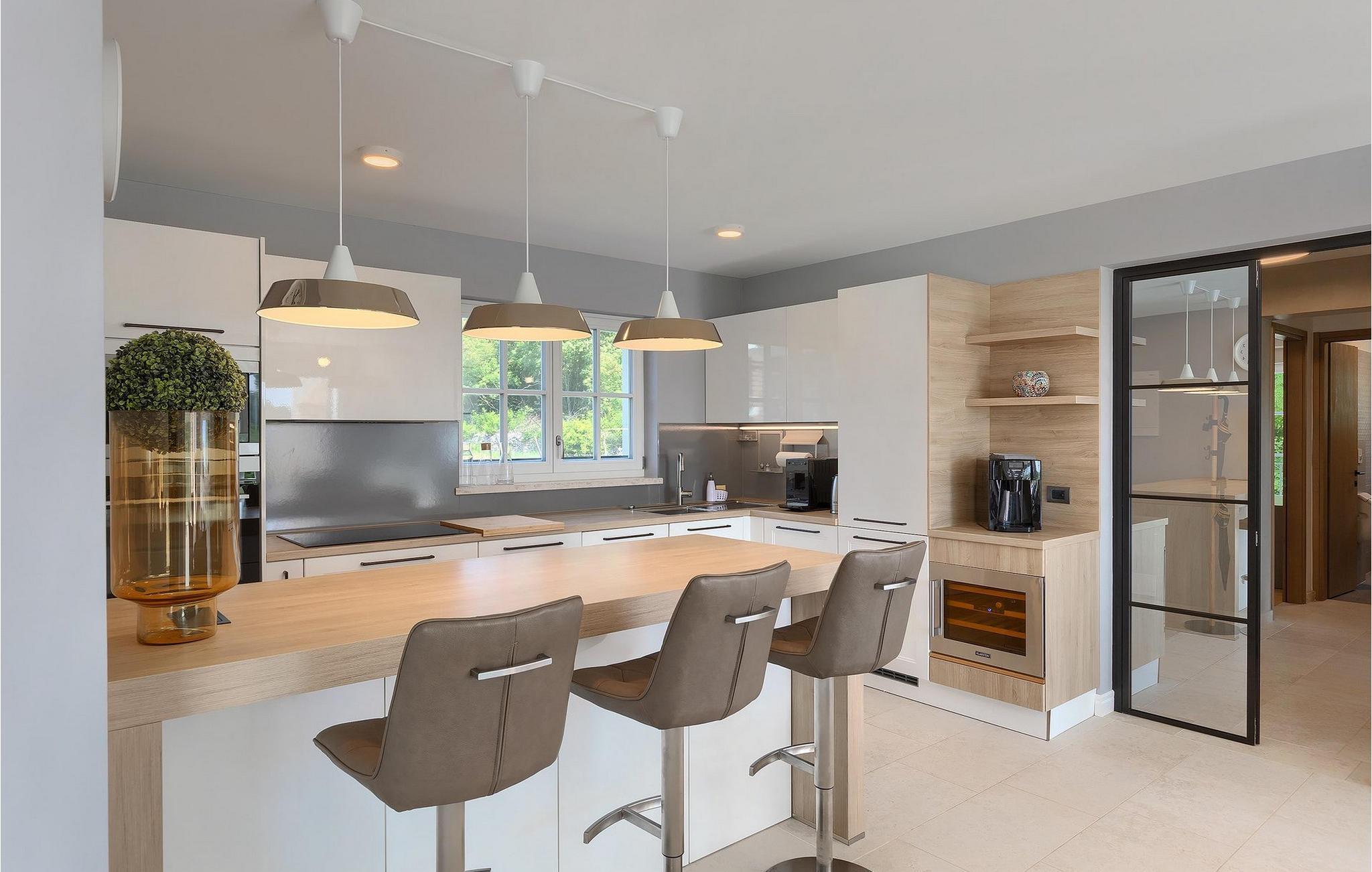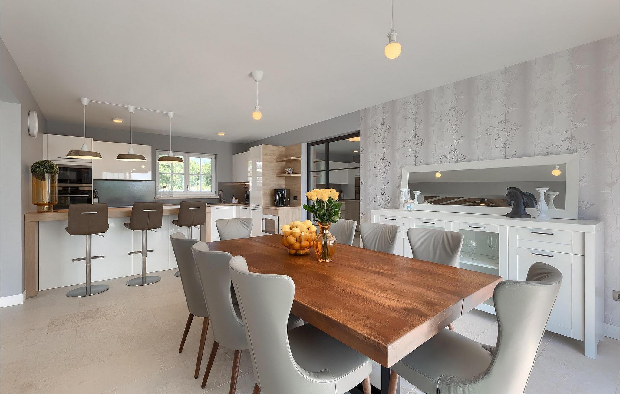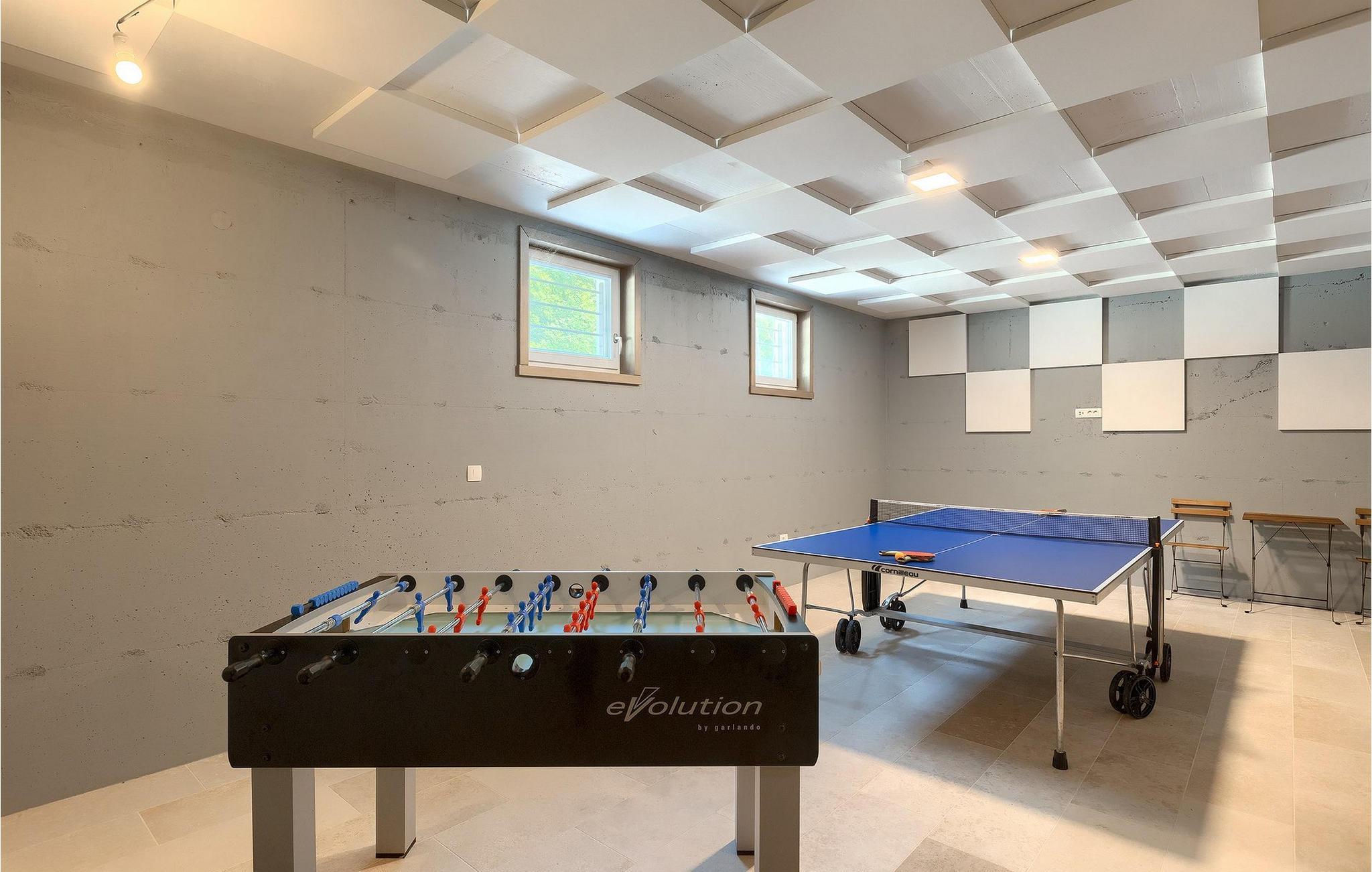 Når du kommer inn i villaen, kommer du direkte til trappeområdet som tar deg til første etasje med soverommene eller til kjelleren med underholdningsrommet med dart, bordtennis og bordfotball. I første etasje finner du en stor spisestue med et moderne, fullt utstyrt kjøkken som strekker seg inn i den koselige og trendy stuen med peis. Det er også 3 soverom, to med dobbeltseng, ett med enkeltseng og en ekstra seng for en ekstra gjest eller ulike soveromsmuligheter. Rommene i første etasje har direkte utgang til bassengområdet, slik at du kan våkne opp med utsikt over det klare vannet og de grønne trærne i bakgrunnen.