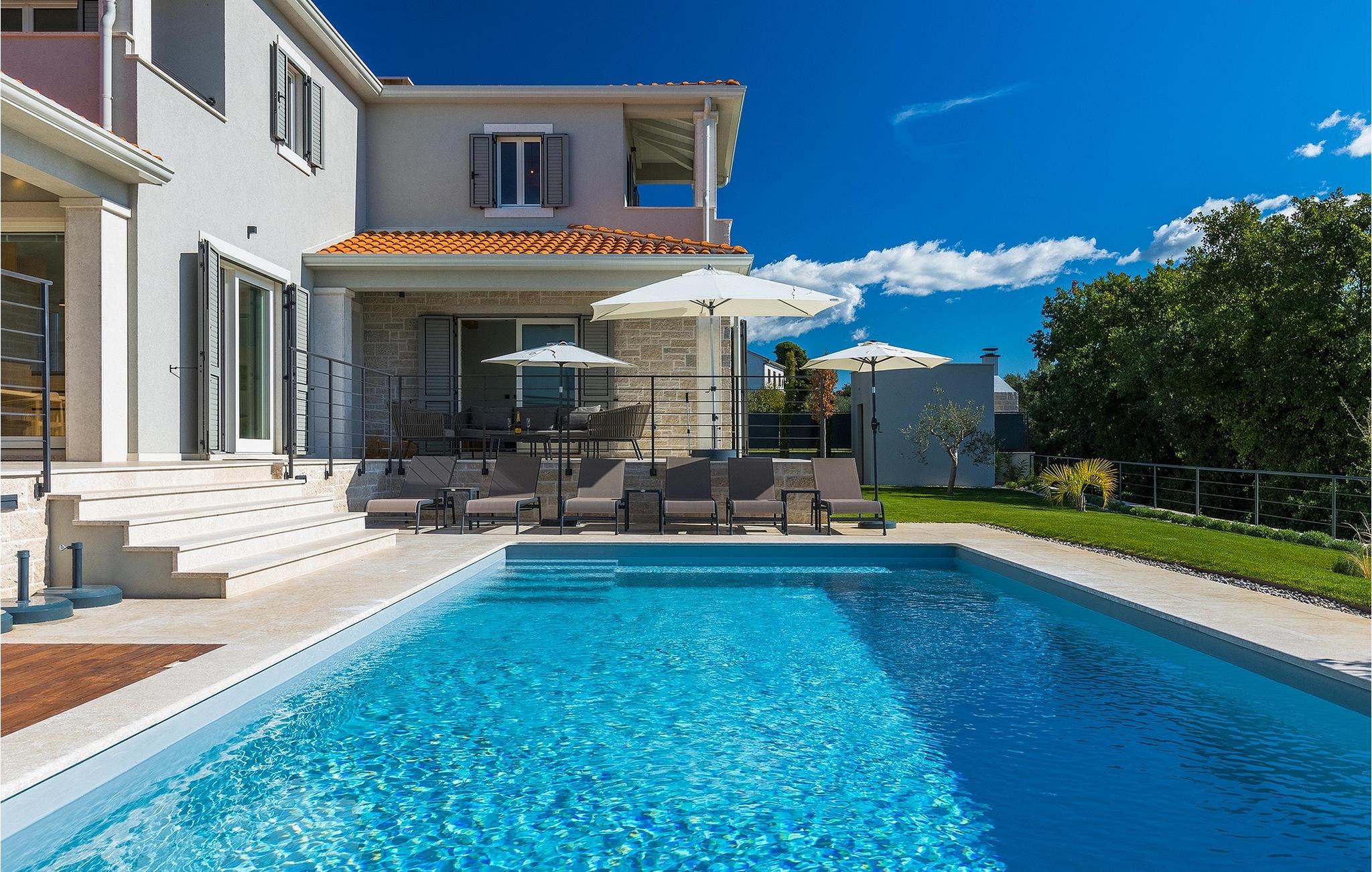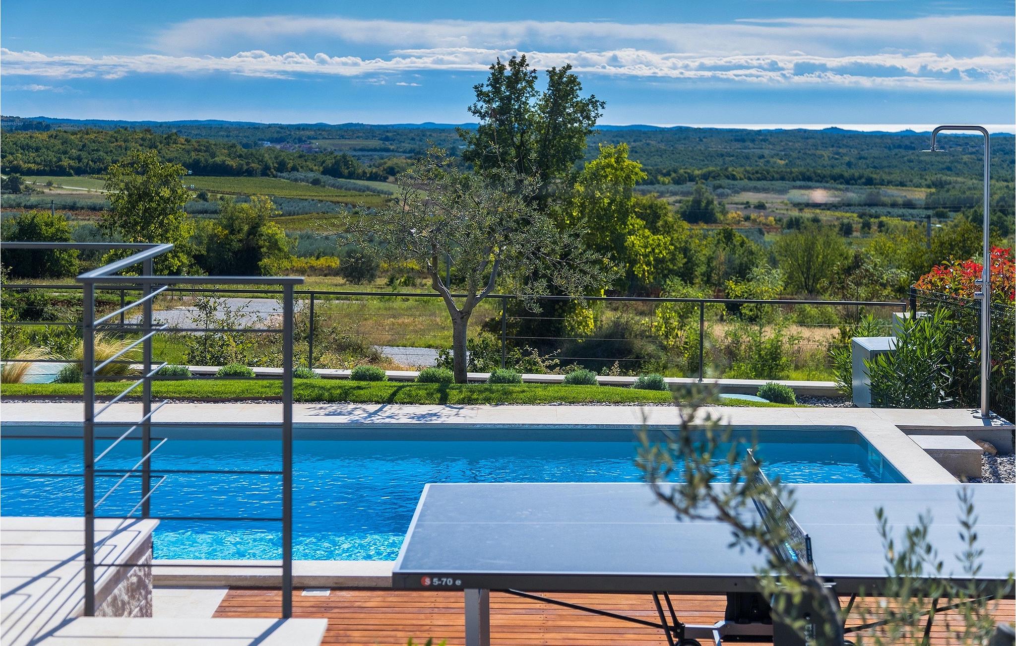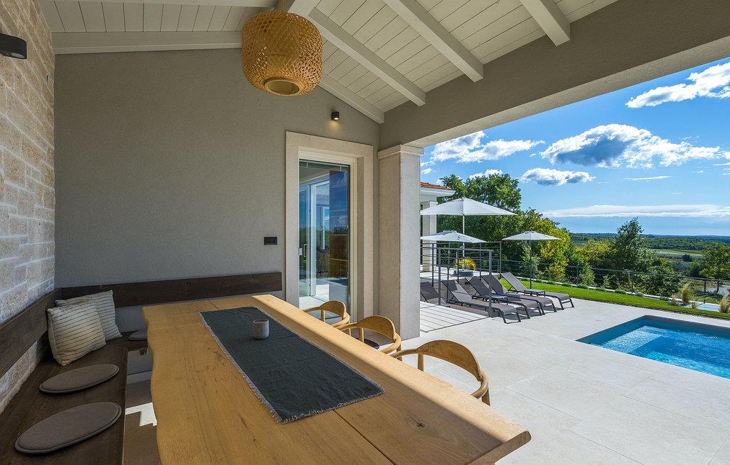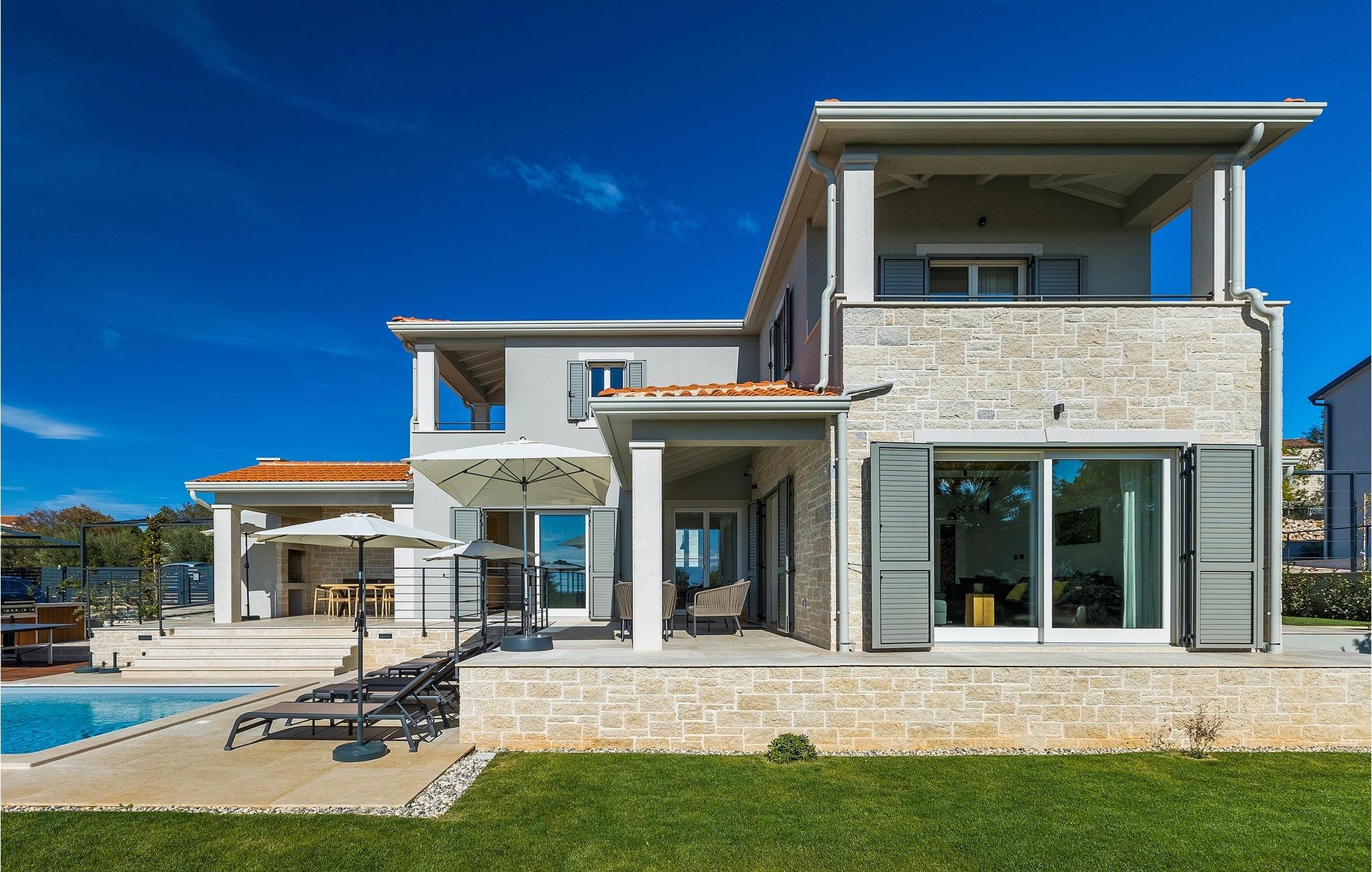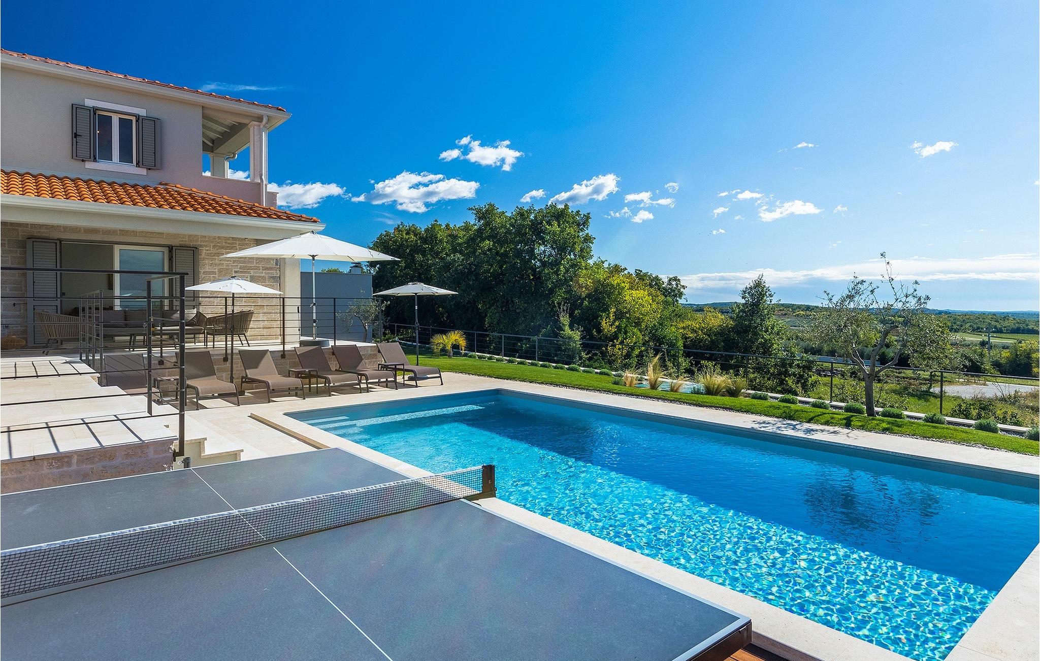 Fra første etasje kommer du ut på den store terrassen med en overbygd uteservering med et stort spisebord og åpen peis for kjøligere kvelder. Her kan du kjøle deg ned i bassenget, slappe av i den overbygde salongen eller spille et slag bordtennis. Vis frem grillferdighetene dine på gassgrillen på utekjøkkenet, som ligger rett ved siden av den overbygde uteserveringen, og nyt måltidene du har tilberedt ute i det fri. De resterende soverommene ligger i første etasje, to med dobbeltseng og overbygd balkong og ett med to enkeltsenger. Ett av dobbeltrommene har eget bad, mens de to andre rommene deler bad. Du kan også nyte den vakre havutsikten fra soverommene. Det er gulvvarme i hele første etasje og på badene for de kjøligere årstidene. Villa Regina er det beste valget for en uforglemmelig ferie med familie og venner. Bestill Villa Regina og nyt omgivelsene i PorecVilla Regina ligger i den rolige landsbyen Markovac, som hører til den sjarmerende byen Visnjan. Visnjan ligger på en høyde med spektakulær utsikt over havet. Hvis du vil ta en uforstyrret titt på stjernene, må du besøke observatoriet i Visnjan. Spaser gjennom de svingete brosteinsbelagte gatene og nyt den rike kulturarven i denne byen. På restaurantene i gamlebyen kan du dessuten nyte deilige retter tilberedt etter tradisjonelle oppskrifter. En tur til den historiske middelalderbyen Porec, bare en kort kjøretur fra villaen, anbefales på det sterkeste. Den UNESCO-listede Eufrasius-basilikaen, det historiske sentrum av Porec, mange attraktive strender og utmerkede restauranter er bare noen av grunnene til at Porec er et av de viktigste turistmålene i Istria. Hvis du foretrekker roligere steder, er byen Novigrad et must for deg. Fiskebyen fortryller alle besøkende med sine bymurer og tårn. Novigrad er også kjent for sitt rike gastronomiske tilbud. Alle sykkelelskere vil definitivt få valuta for pengene i denne villaen, da den ligger bare 30 meter fra den berømte sykkelveien Parenzana.