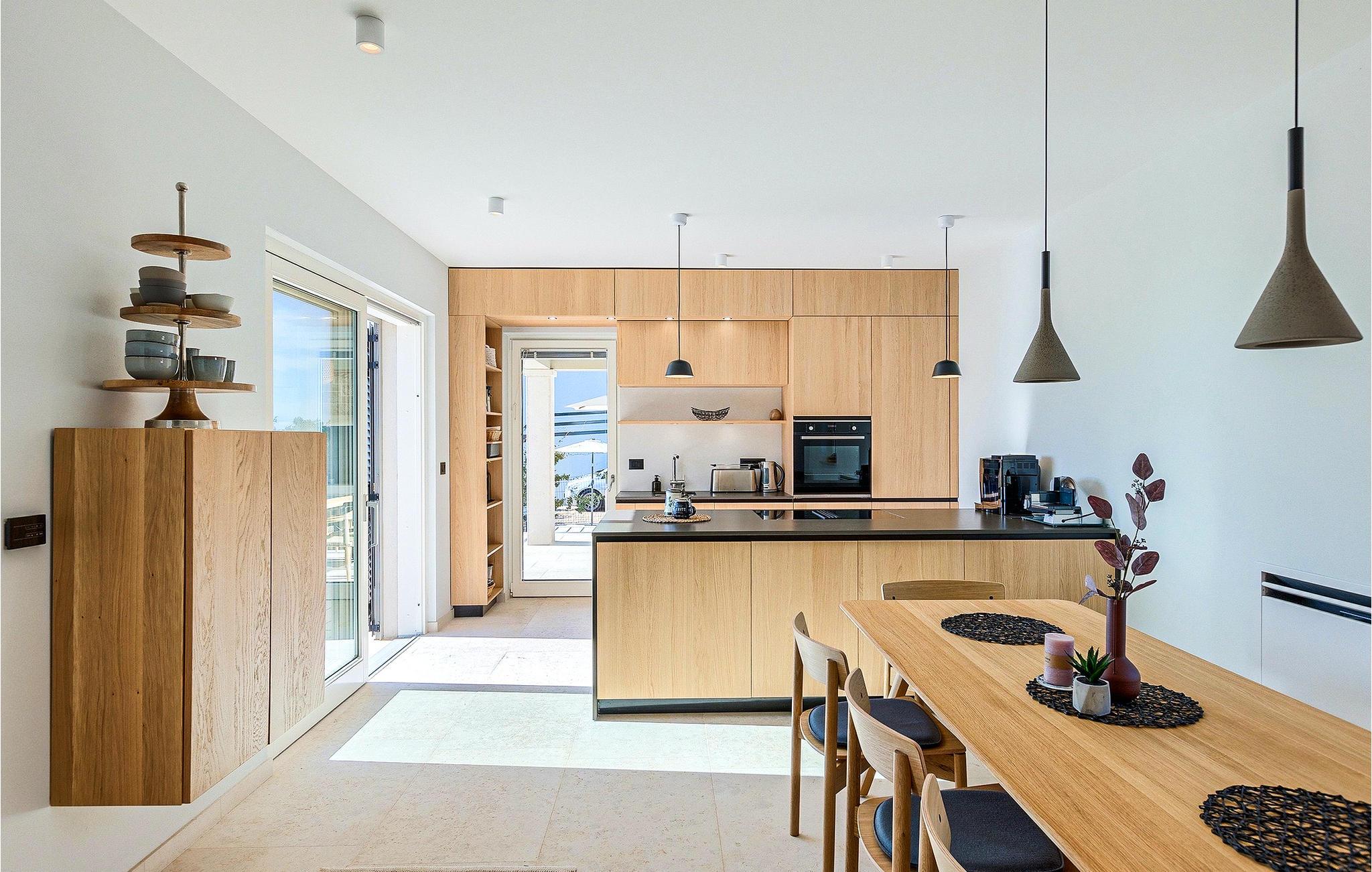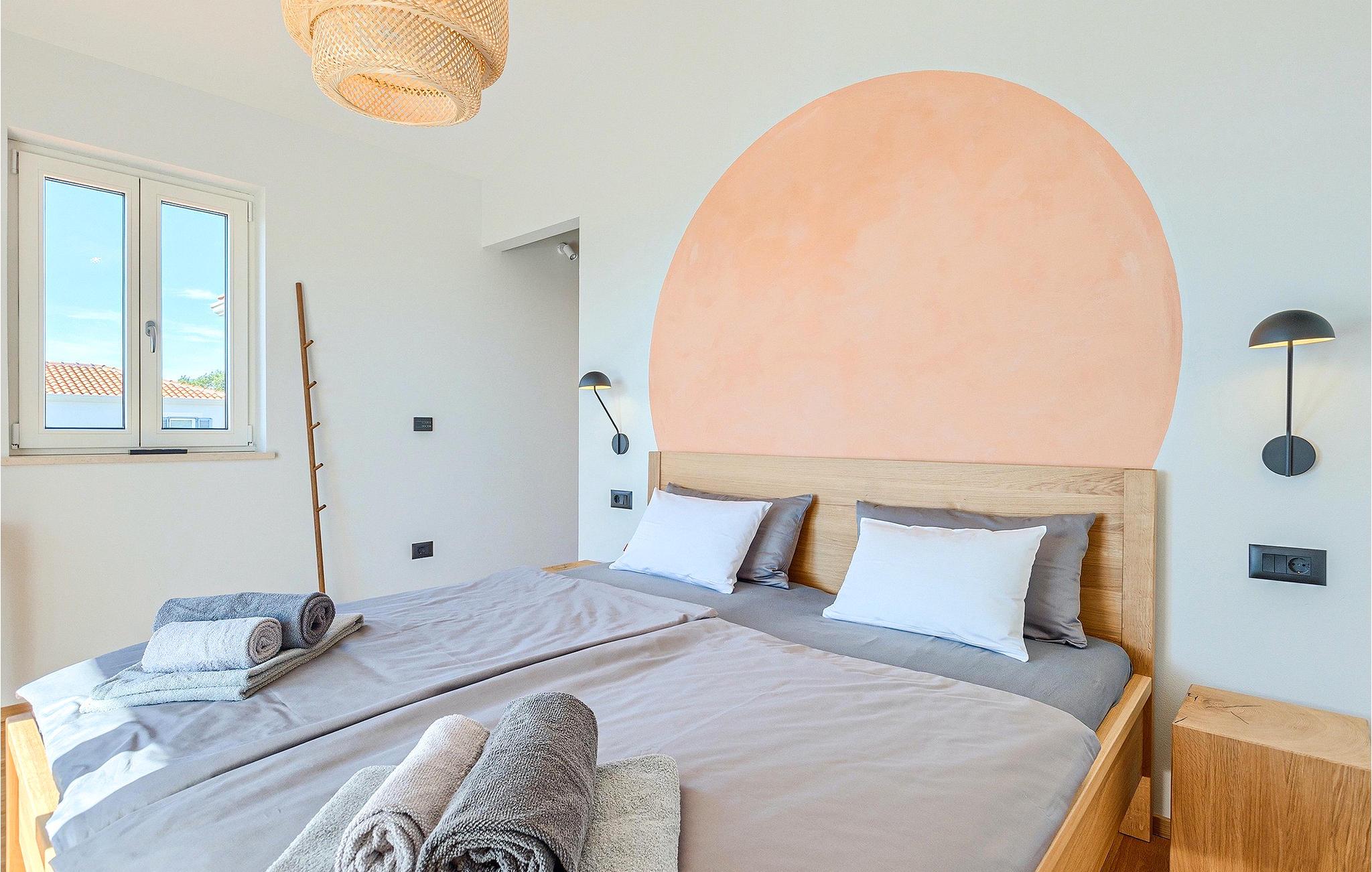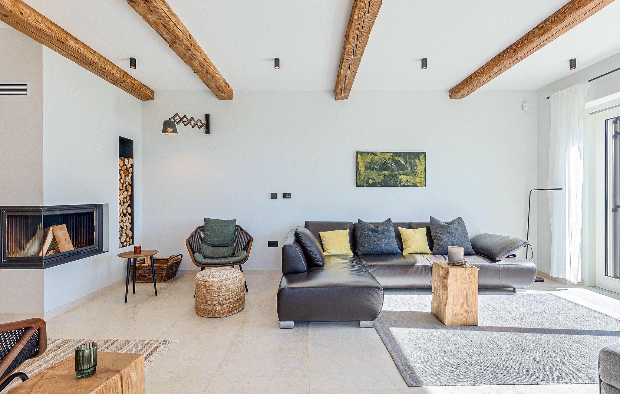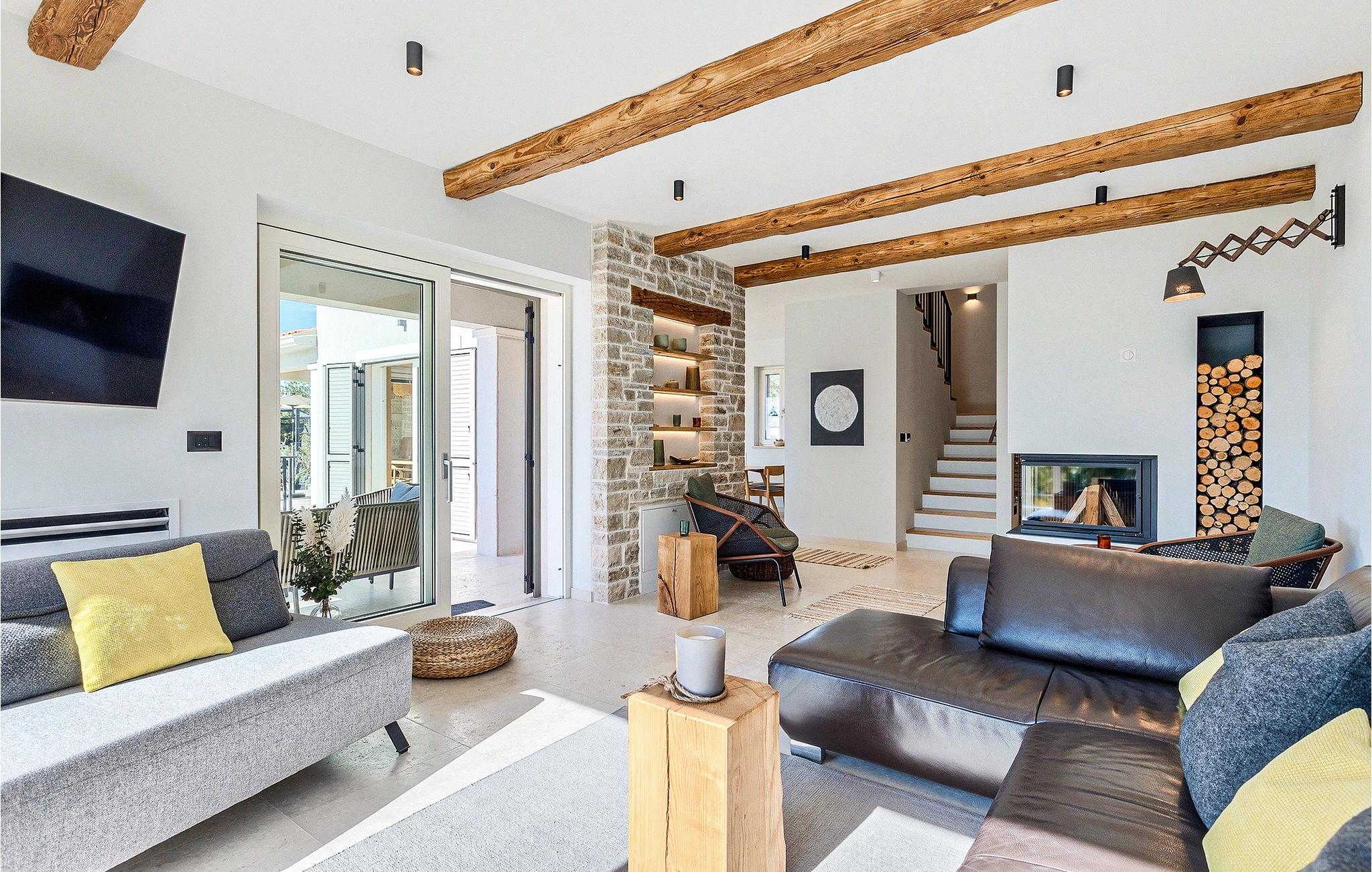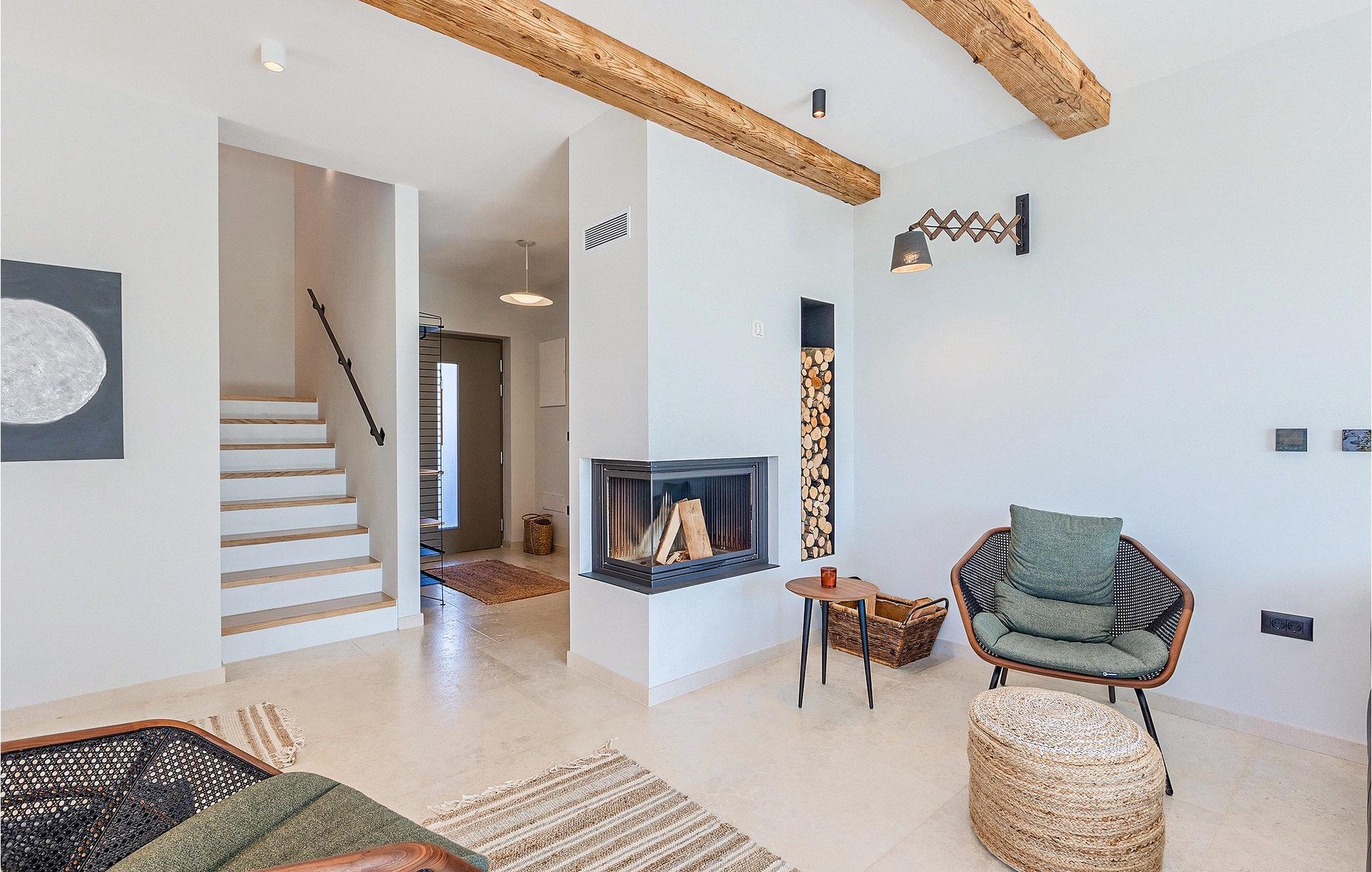Villaen er innredet med naturlige materialer. Villa Regina har totalt fire vakkert innredede soverom fordelt på to etasjer, og har plass til opptil åtte personer. I første etasje av den fullt klimatiserte villaen er det en stue med peis og koselig skinnsofa, et moderne kjøkken og spiseplass, et separat toalett og et dobbelt soverom med eget bad. Den koselige stuen er full av lys takket være de store terrassedørene og har en fantastisk havutsikt. Dette er det perfekte stedet å tilbringe tid med familie og venner.