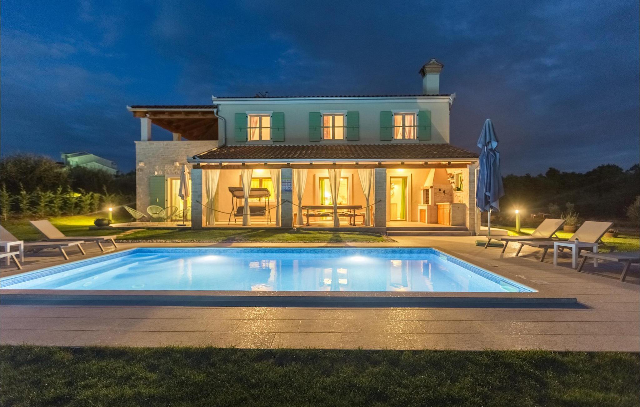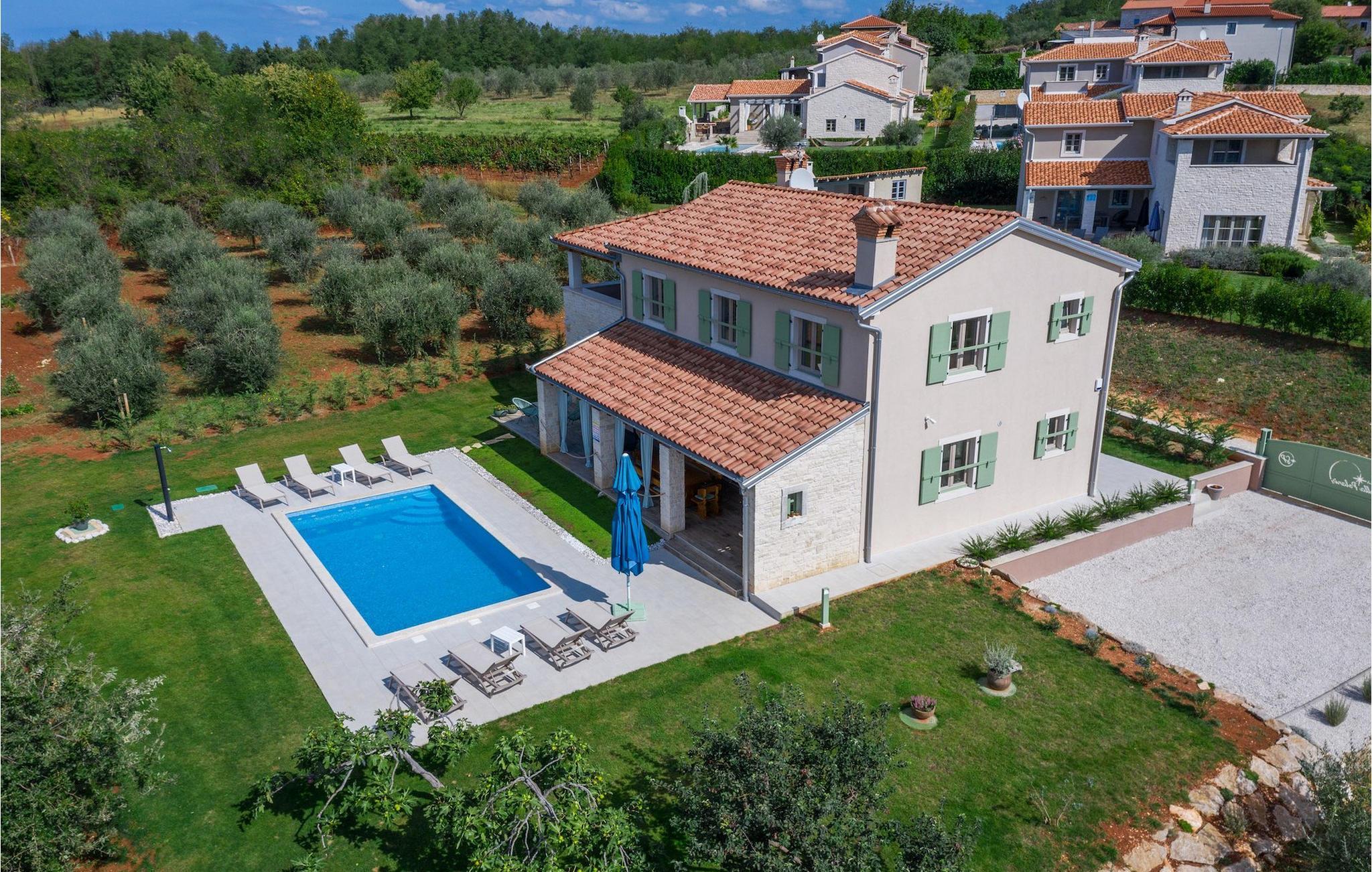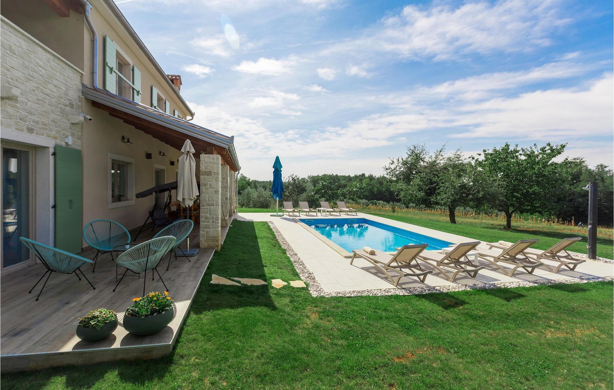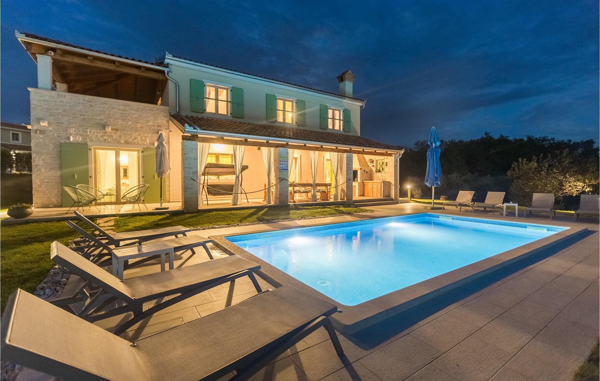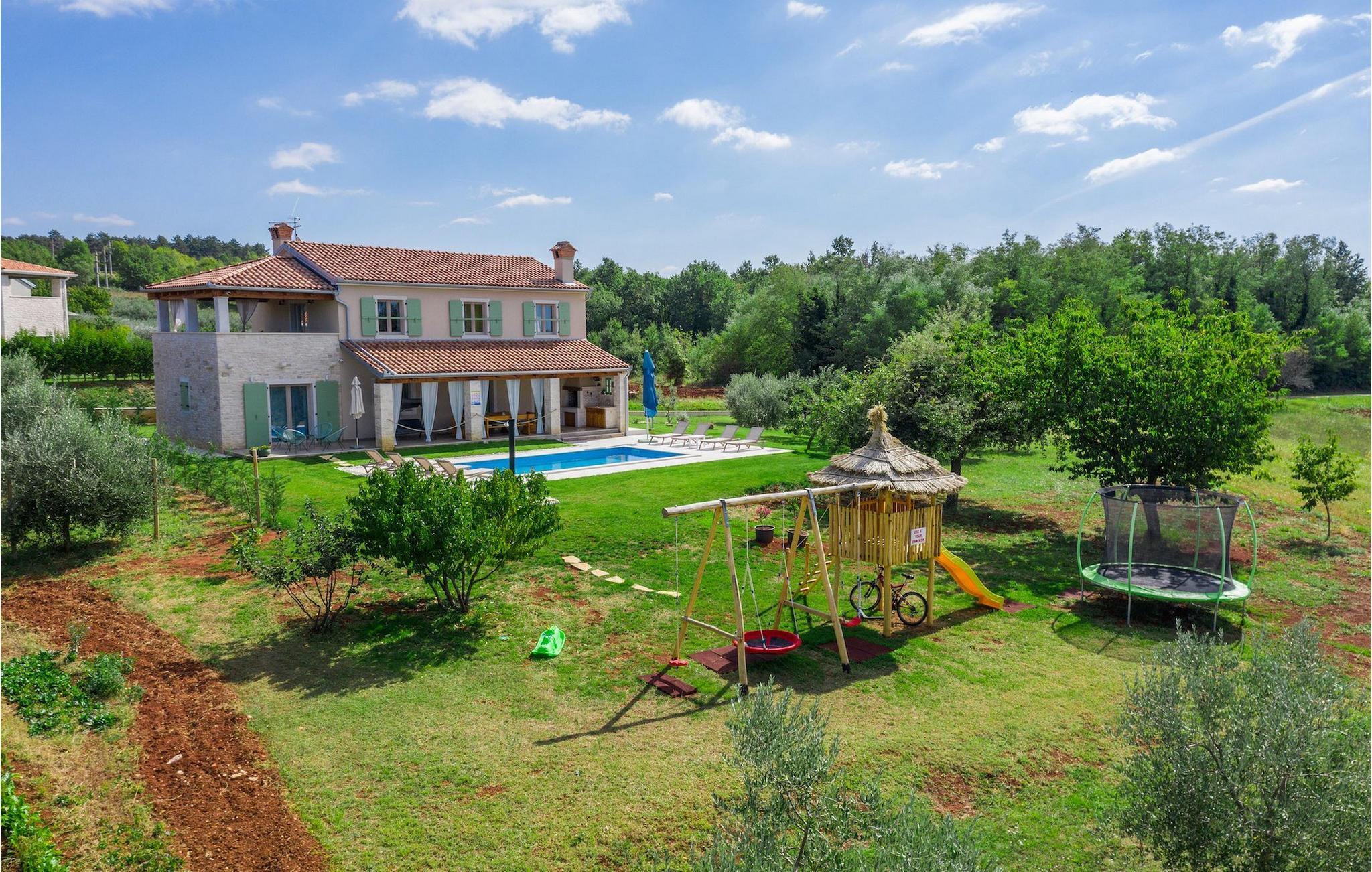 Er du på utkikk etter en koselig villa på Istria-halvøya med plass til opptil 8 personer? Da bør du definitivt vurdere Villa Stella Polaris for din kommende ferie. Når du nærmer deg villaen, vil du legge merke til de vakre, uberørte omgivelsene - perfekt for en avslappende stund borte fra byens kjas og mas. Det er også en olivenlund på eiendommen, noe som gir villaen et typisk middelhavspreg. Inne i villaen ønsker den varmt innredede første etasje deg velkommen til feriehuset. Den åpne planløsningen, som omfatter kjøkken, spisestue og stue, vil med sin gjennomtenkte innredning vekke din sans for detaljer. Det fullt utstyrte kjøkkenet er innredet i en moderne landlig stil som matcher spisestuen. I stuen kan du sette deg godt til rette i sofaen og lytte til musikk eller slå på TV-en. Det er også en peis for de kaldere dagene. I tillegg har første etasje et soverom med eget bad. I øverste etasje er det et soverom i rustikk stil. Dette har ikke bare eget bad, men også en romslig balkong med sittegruppe og vakker utsikt. Ytterligere to soverom med separate dobbeltsenger deler bad. Alle badene i villaen har dusjkabinett med regndusj. På terrassen kan du enten slå deg ned på den romantiske hagegyngen, i salonghjørnet eller i uteserveringen - sistnevnte spesielt hvis du foretrekker å nyte måltidene i frisk luft. Du kan også tilberede delikatessene dine på terrassen takket være sommerkjøkkenet med steingrill. For å nyte det hele kan du legge deg på solsengene ved siden av det forfriskende bassenget og nyte de varme solstrålene. Hagen har også noe for de minste - en egen lekeplass og en trampoline. Tilbring en avslappende ferie full av uforglemmelige øyeblikk og bestill Villa Stella Polaris nåI den vestlige delen av Istria, nær Porec, finner du den lille landsbyen Visnjan. Her kan du spasere gjennom de brosteinsbelagte gatene i gamlebyen og beundre den historiske arven. Spør gjerne lokalbefolkningen om en liten leksjon i Visnjans historie - de forteller deg gjerne legender om landsbyen sin. Når du rusler gjennom gamlebyen eller utforsker området rundt Visnjan, vil du støte på tradisjonelle vertshus der du kan smake på delikatesser fra det istriske kjøkkenet og kvalitetsviner. Noen av dem faller inn under kategorien agriturisme, noe som betyr at de kun tilbyr produkter fra egen gård - det er en helt spesiell opplevelse å spise der. Glem ikke å besøke det berømte observatoriet. La deg inspirere til å se opp på himmelen og bare nyte. Ikke langt fra Visnjan kan du også besøke Baredine-hulen og fossen Zarecki krov - du vil bli forbløffet over synet. Og selvfølgelig må du ikke gå glipp av muligheten til å besøke to av de mest populære stedene på Istrias kyst - Porec og Novigrad. Her kan du nyte en avslappende dag på stranden eller en hyggelig kveld i sentrum av byene.