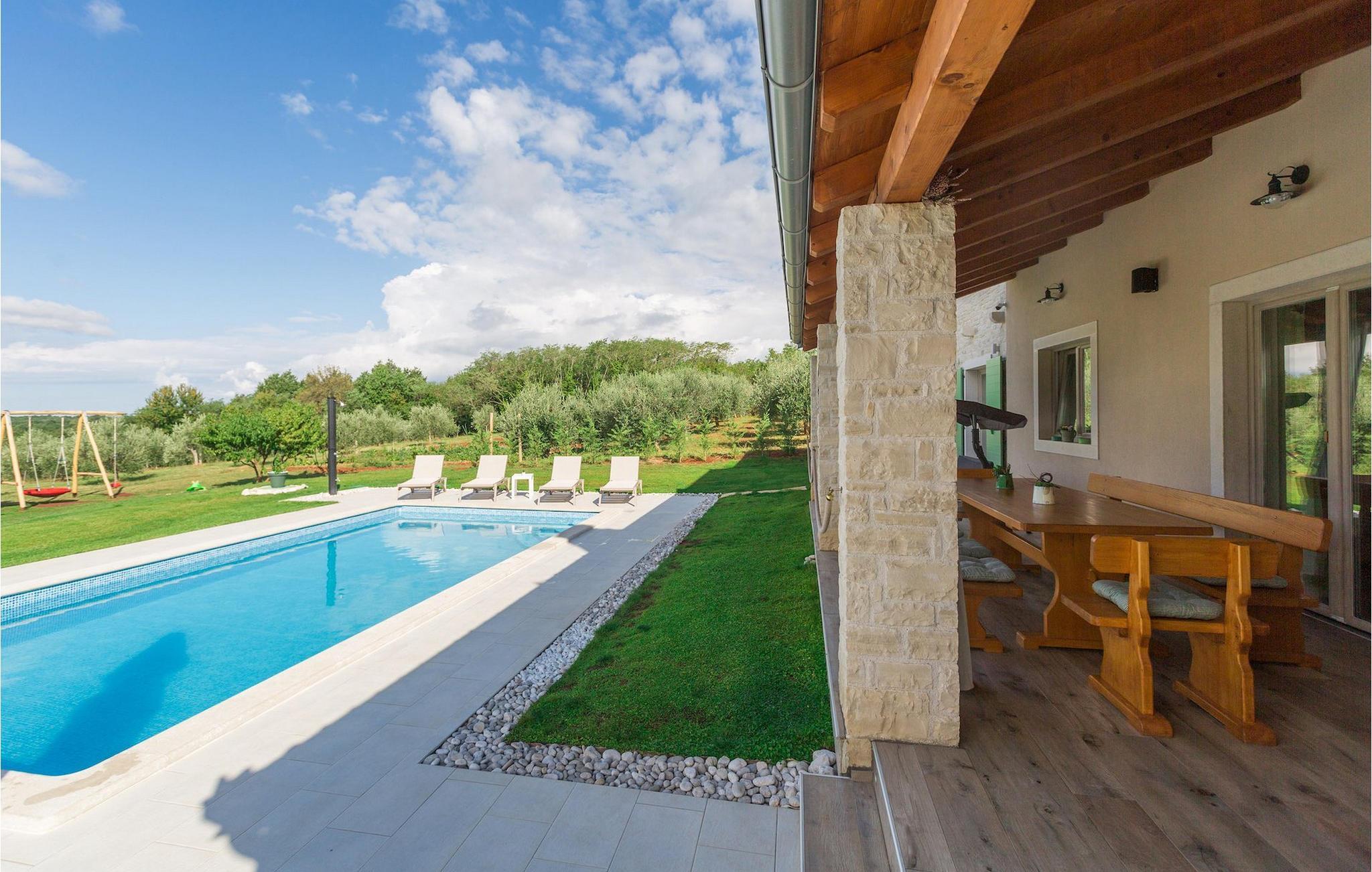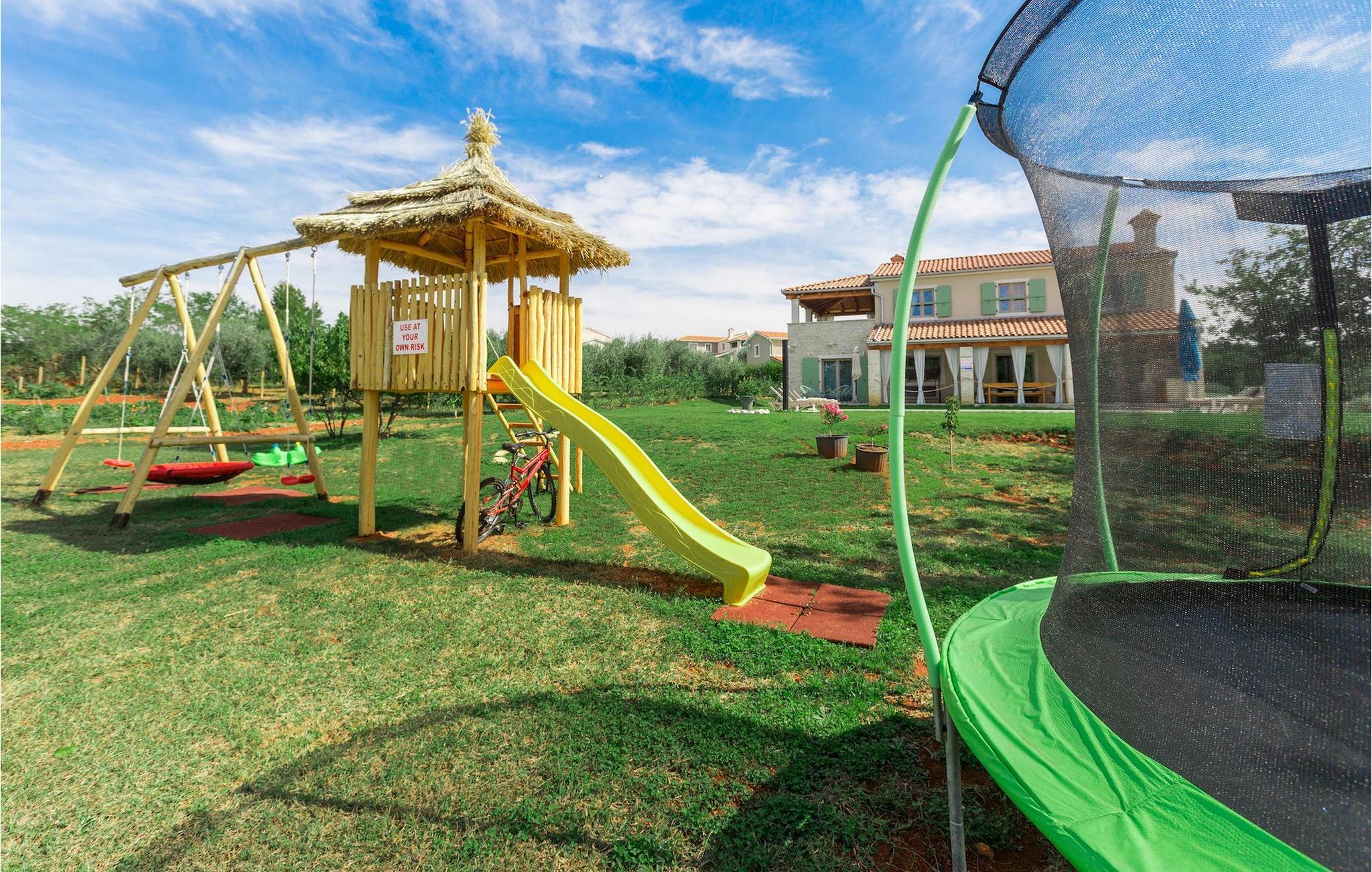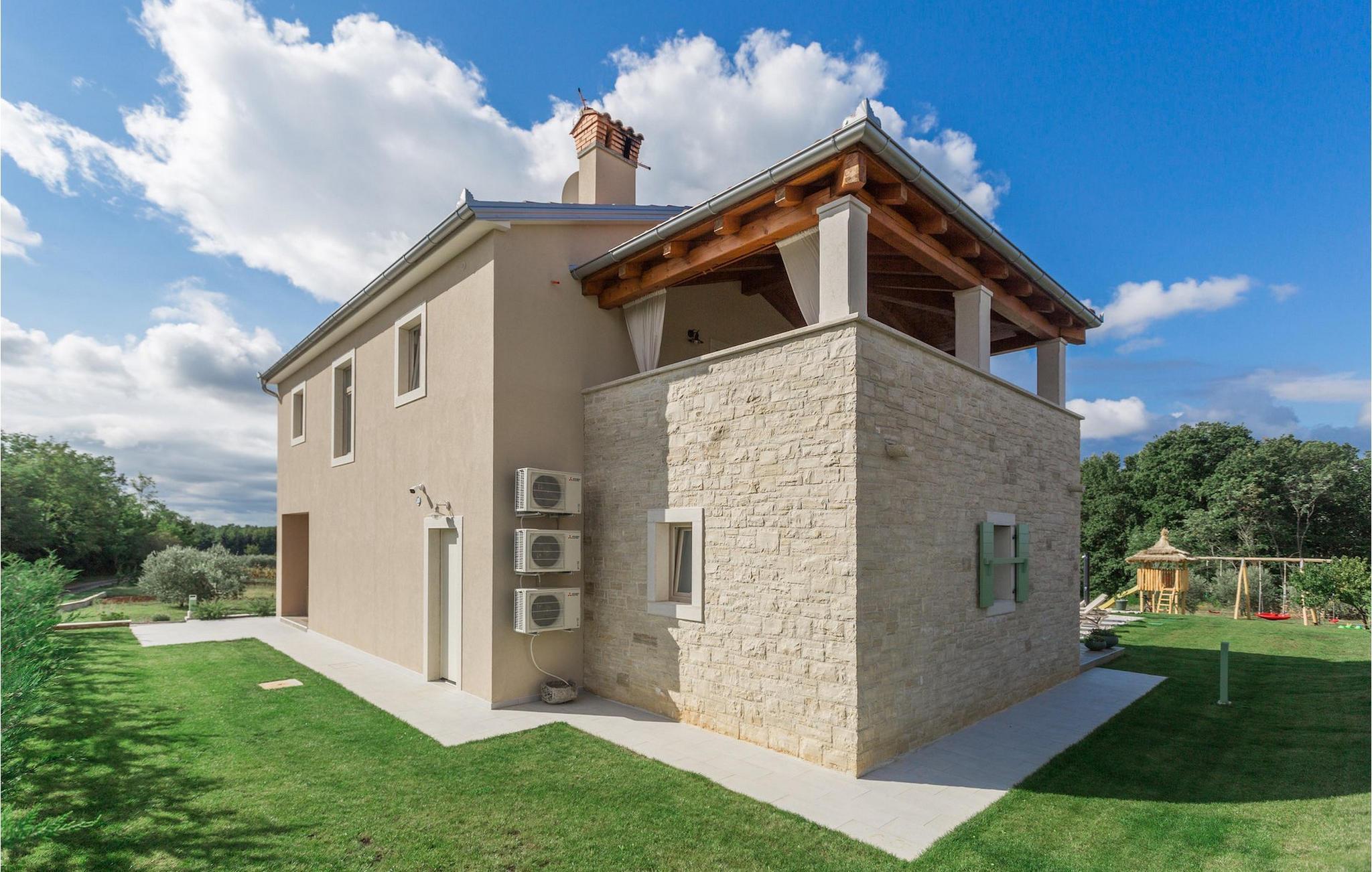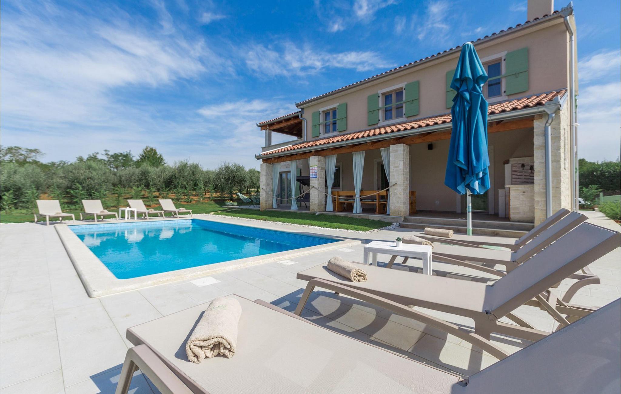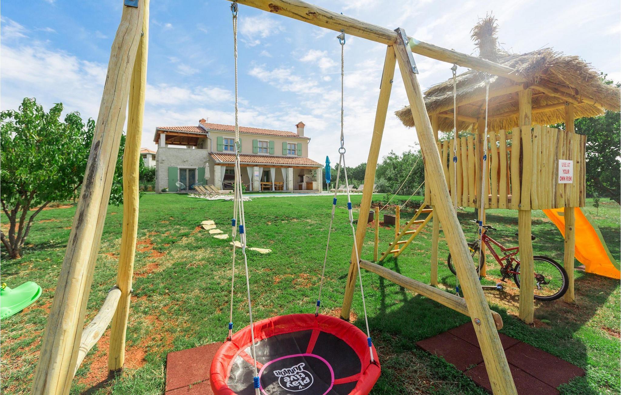 Er du på utkikk etter en koselig villa på Istria-halvøya med plass til opptil 8 personer? Da bør du definitivt vurdere Villa Stella Polaris for din kommende ferie. Når du nærmer deg villaen, vil du legge merke til de vakre, uberørte omgivelsene - perfekt for en avslappende stund borte fra byens kjas og mas. Det er også en olivenlund på eiendommen, noe som gir villaen et typisk middelhavspreg. Inne i villaen ønsker den varmt innredede første etasje deg velkommen til feriehuset. Den åpne planløsningen, som omfatter kjøkken, spisestue og stue, vil med sin gjennomtenkte innredning vekke din sans for detaljer. Det fullt utstyrte kjøkkenet er innredet i en moderne landlig stil som matcher spisestuen. I stuen kan du sette deg godt til rette i sofaen og lytte til musikk eller slå på TV-en. Det er også en peis for de kaldere dagene. I tillegg har første etasje et soverom med eget bad. I øverste etasje er det et soverom i rustikk stil. Dette har ikke bare eget bad, men også en romslig balkong med sittegruppe og vakker utsikt. Ytterligere to soverom med separate dobbeltsenger deler bad. Alle badene i villaen har dusjkabinett med regndusj. På terrassen kan du enten slå deg ned på den romantiske hagegyngen, i salonghjørnet eller i uteserveringen - sistnevnte spesielt hvis du foretrekker å nyte måltidene i frisk luft. Du kan også tilberede delikatessene dine på terrassen takket være sommerkjøkkenet med steingrill. For å nyte det hele kan du legge deg på solsengene ved siden av det forfriskende bassenget og nyte de varme solstrålene. Hagen har også noe for de minste - en egen lekeplass og en trampoline. Tilbring en avslappende ferie full av uforglemmelige øyeblikk og bestill Villa Stella Polaris nåI den vestlige delen av Istria, nær Porec, finner du den lille landsbyen Visnjan. Her kan du spasere gjennom de brosteinsbelagte gatene i gamlebyen og beundre den historiske arven. Spør gjerne lokalbefolkningen om en liten leksjon i Visnjans historie - de forteller deg gjerne legender om landsbyen sin. Når du rusler gjennom gamlebyen eller utforsker området rundt Visnjan, vil du støte på tradisjonelle vertshus der du kan smake på delikatesser fra det istriske kjøkkenet og kvalitetsviner. Noen av dem faller inn under kategorien agriturisme, noe som betyr at de kun tilbyr produkter fra egen gård - det er en helt spesiell opplevelse å spise der. Glem ikke å besøke det berømte observatoriet. La deg inspirere til å se opp på himmelen og bare nyte. Ikke langt fra Visnjan kan du også besøke Baredine-hulen og fossen Zarecki krov - du vil bli forbløffet over synet. Og selvfølgelig må du ikke gå glipp av muligheten til å besøke to av de mest populære stedene på Istrias kyst - Porec og Novigrad. Her kan du nyte en avslappende dag på stranden eller en hyggelig kveld i sentrum av byene.