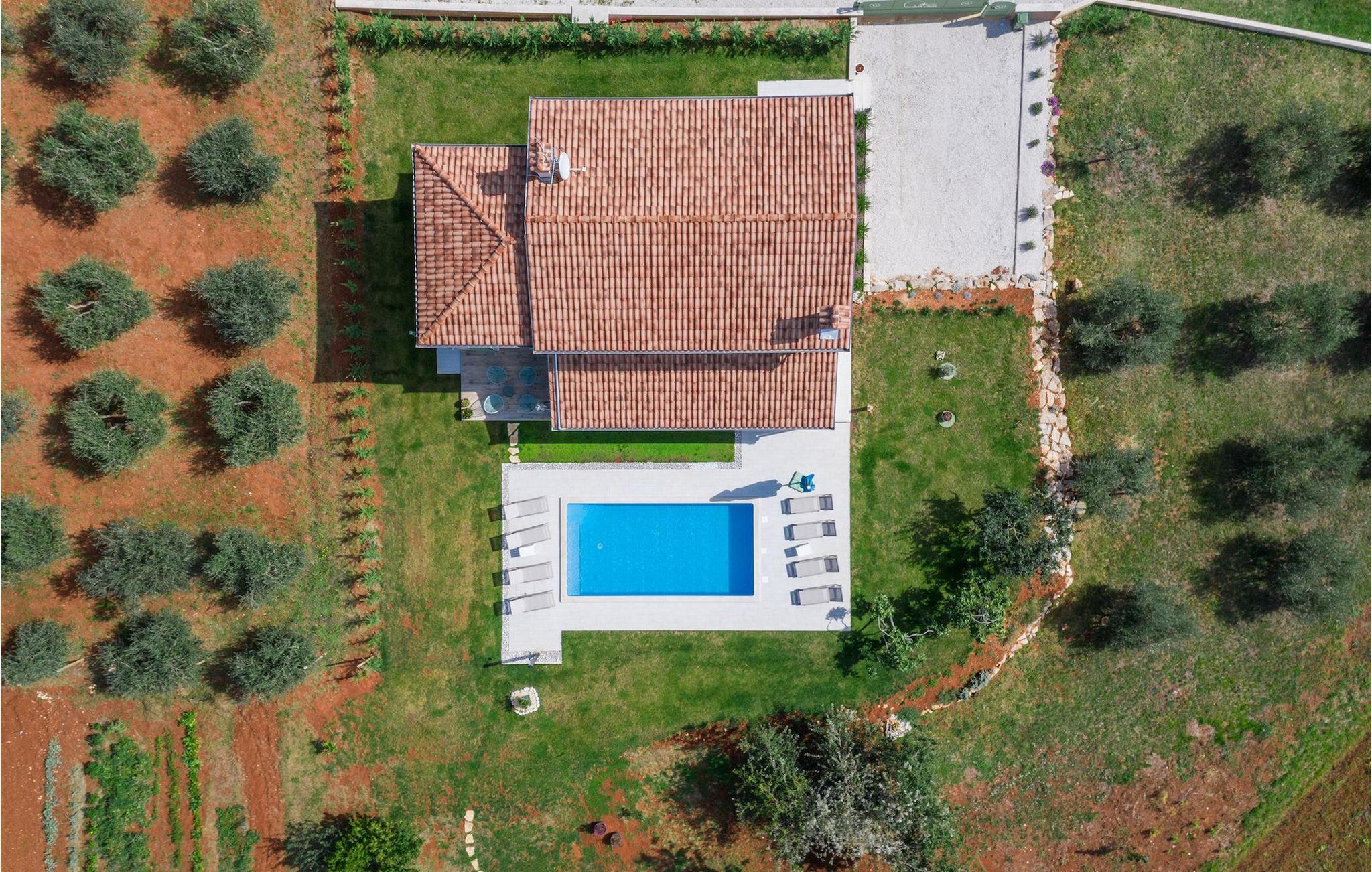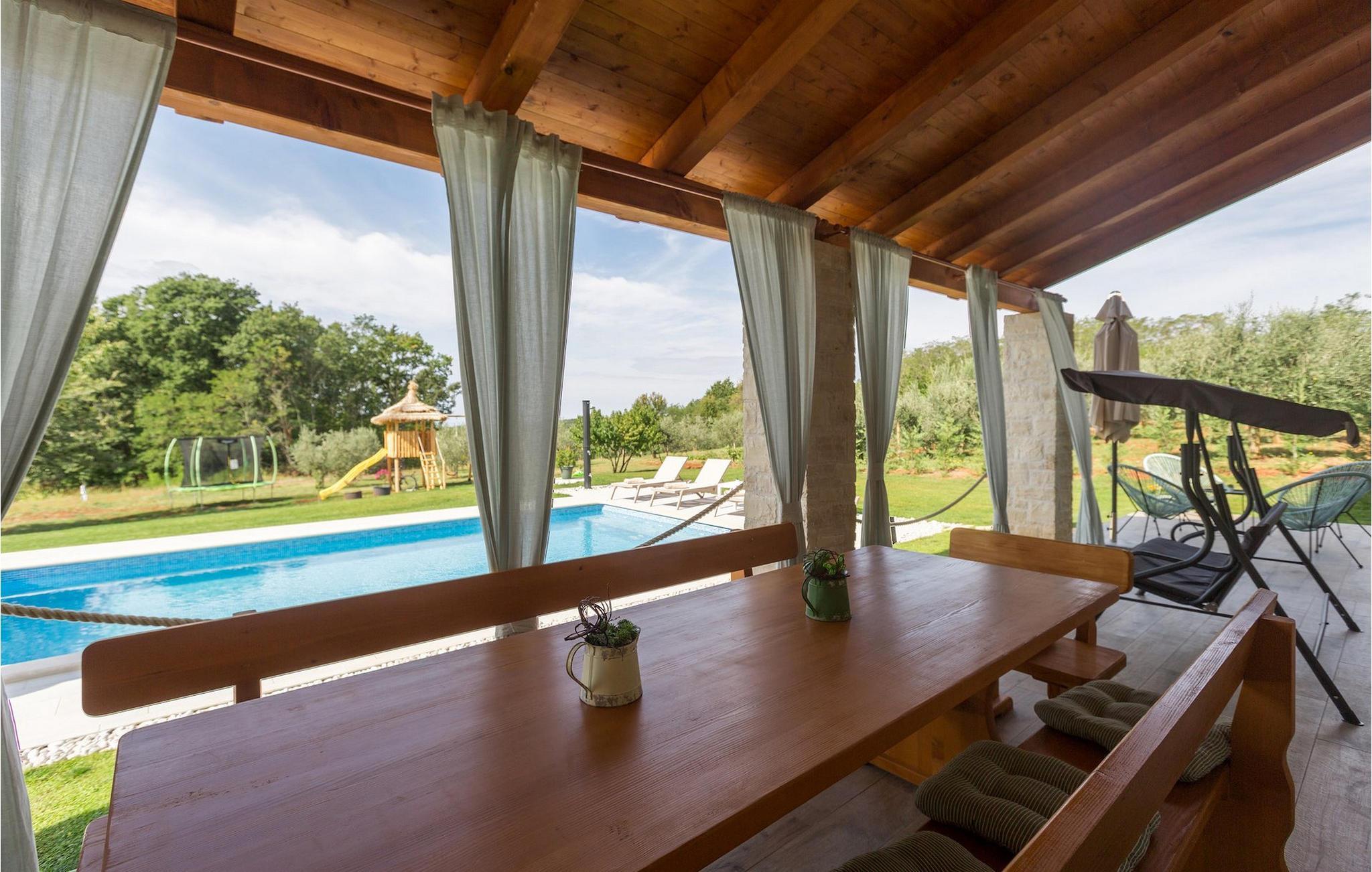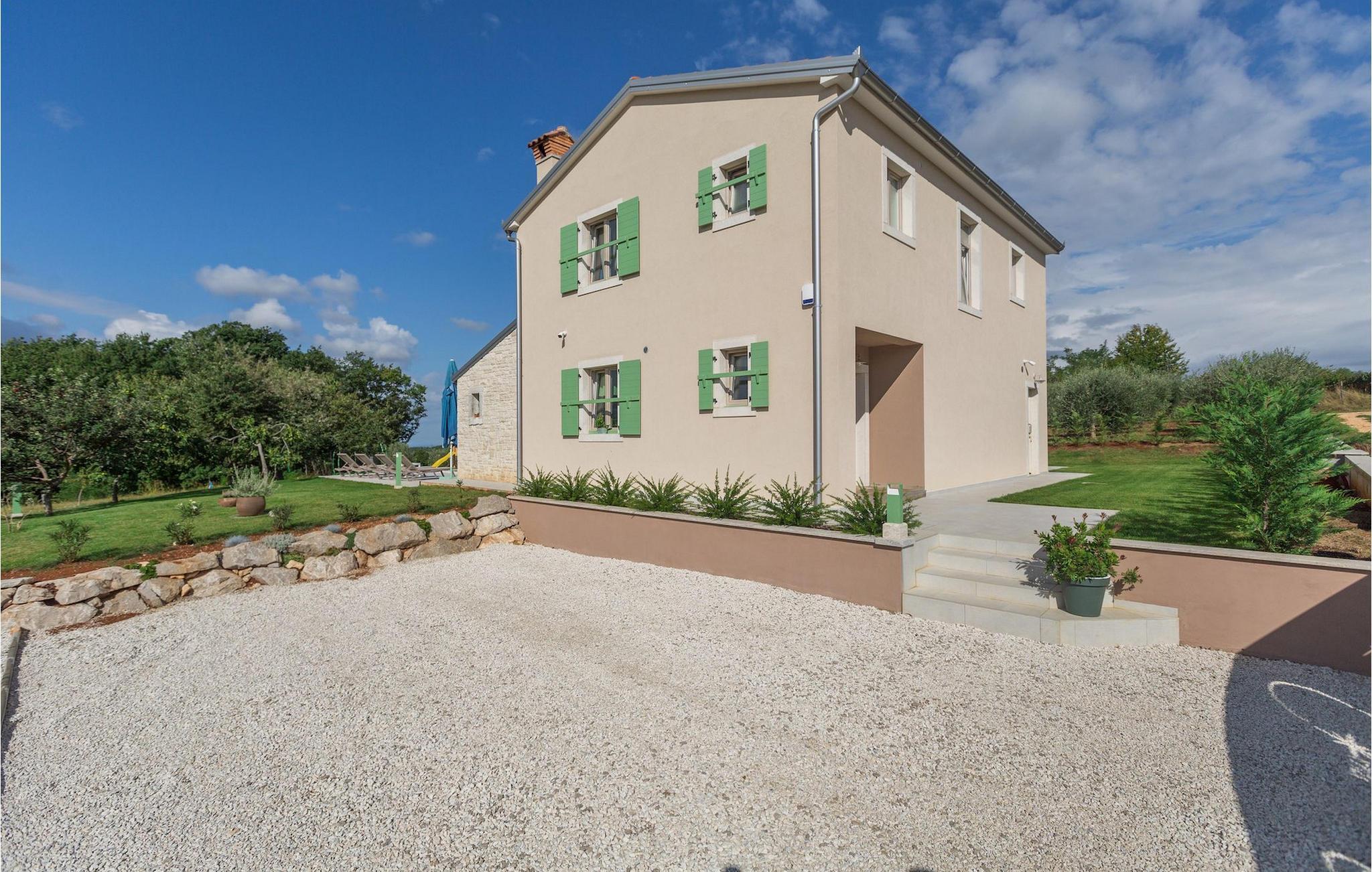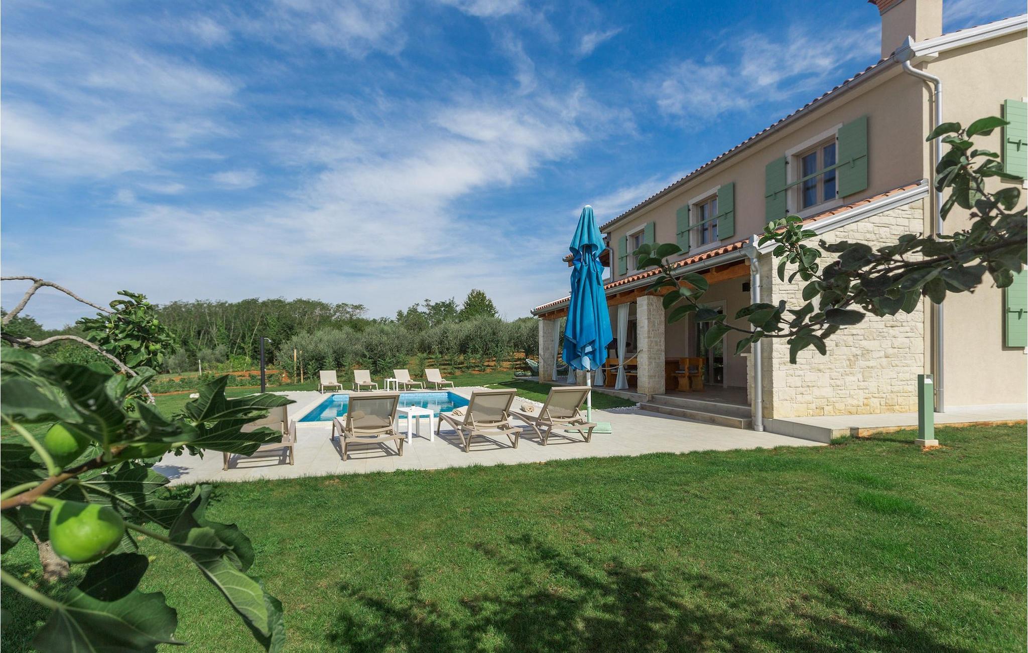 Er du på utkikk etter en koselig villa på Istria-halvøya med plass til opptil 8 personer? Da bør du definitivt vurdere Villa Stella Polaris for din kommende ferie. Når du nærmer deg villaen, vil du legge merke til de vakre, uberørte omgivelsene - perfekt for en avslappende stund borte fra byens kjas og mas. Det er også en olivenlund på eiendommen, noe som gir villaen et typisk middelhavspreg. Inne i villaen ønsker den varmt innredede første etasje deg velkommen til feriehuset. Den åpne planløsningen, som omfatter kjøkken, spisestue og stue, vil med sin gjennomtenkte innredning vekke din sans for detaljer. Det fullt utstyrte kjøkkenet er innredet i en moderne landlig stil som matcher spisestuen. I stuen kan du sette deg godt til rette i sofaen og lytte til musikk eller slå på TV-en. Det er også en peis for de kaldere dagene. I tillegg har første etasje et soverom med eget bad. I øverste etasje er det et soverom i rustikk stil. Dette har ikke bare eget bad, men også en romslig balkong med sittegruppe og vakker utsikt. Ytterligere to soverom med separate dobbeltsenger deler bad. Alle badene i villaen har dusjkabinett med regndusj. På terrassen kan du enten slå deg ned på den romantiske hagegyngen, i salonghjørnet eller i uteserveringen - sistnevnte spesielt hvis du foretrekker å nyte måltidene i frisk luft. Du kan også tilberede delikatessene dine på terrassen takket være sommerkjøkkenet med steingrill. For å nyte det hele kan du legge deg på solsengene ved siden av det forfriskende bassenget og nyte de varme solstrålene. Hagen har også noe for de minste - en egen lekeplass og en trampoline. Tilbring en avslappende ferie full av uforglemmelige øyeblikk og bestill Villa Stella Polaris nåI den vestlige delen av Istria, nær Porec, finner du den lille landsbyen Visnjan. Her kan du spasere gjennom de brosteinsbelagte gatene i gamlebyen og beundre den historiske arven. Spør gjerne lokalbefolkningen om en liten leksjon i Visnjans historie - de forteller deg gjerne legender om landsbyen sin. Når du rusler gjennom gamlebyen eller utforsker området rundt Visnjan, vil du støte på tradisjonelle vertshus der du kan smake på delikatesser fra det istriske kjøkkenet og kvalitetsviner. Noen av dem faller inn under kategorien agriturisme, noe som betyr at de kun tilbyr produkter fra egen gård - det er en helt spesiell opplevelse å spise der. Glem ikke å besøke det berømte observatoriet. La deg inspirere til å se opp på himmelen og bare nyte. Ikke langt fra Visnjan kan du også besøke Baredine-hulen og fossen Zarecki krov - du vil bli forbløffet over synet. Og selvfølgelig må du ikke gå glipp av muligheten til å besøke to av de mest populære stedene på Istrias kyst - Porec og Novigrad. Her kan du nyte en avslappende dag på stranden eller en hyggelig kveld i sentrum av byene.