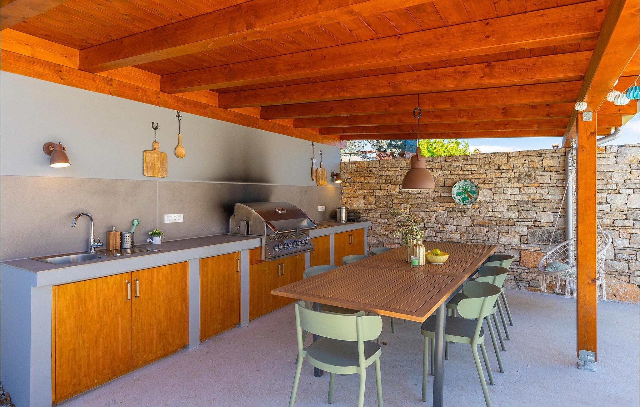 Bare bassenget med sin uvanlige form er et blikkfang. Her finner du den forfriskningen du trenger på varme sommerdager. Det overbygde sommerkjøkkenet med grill og spisebord er det ideelle stedet å samle familie og venner for å planlegge utflukter eller tilbringe koselige kvelder. Nyt den istriske solen på en av solsengene ved bassenget eller ta et slag basketball. Her finner alle sin favorittplass.