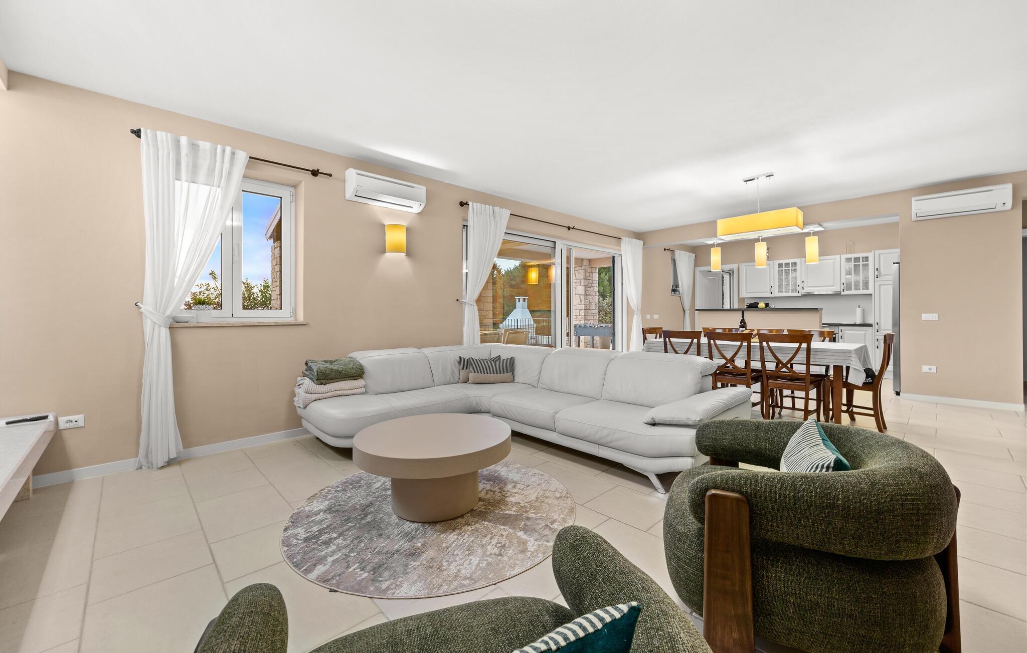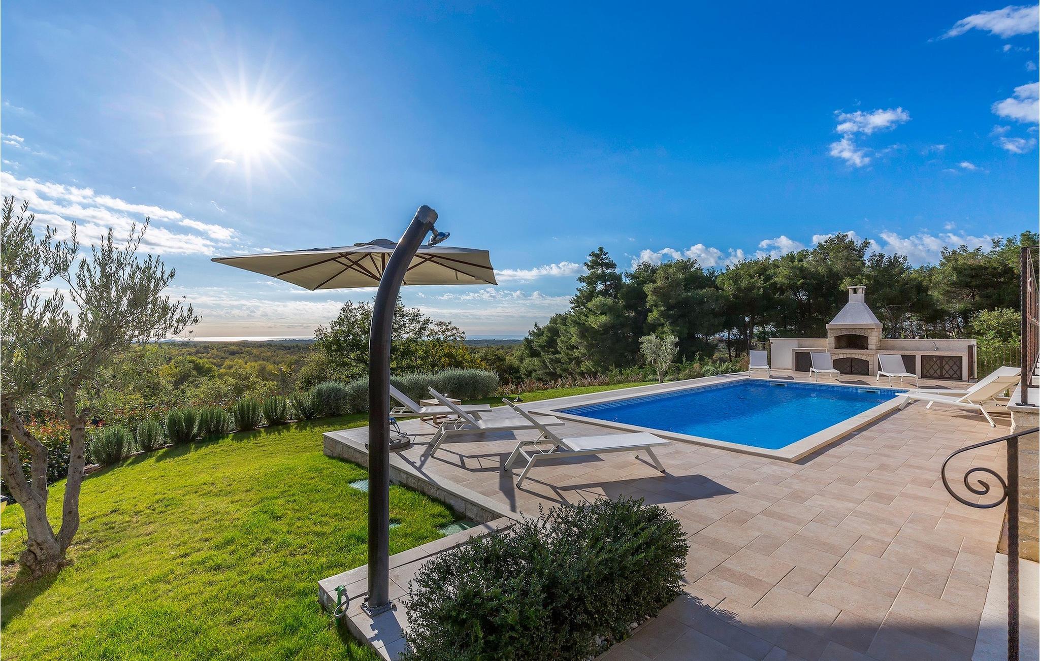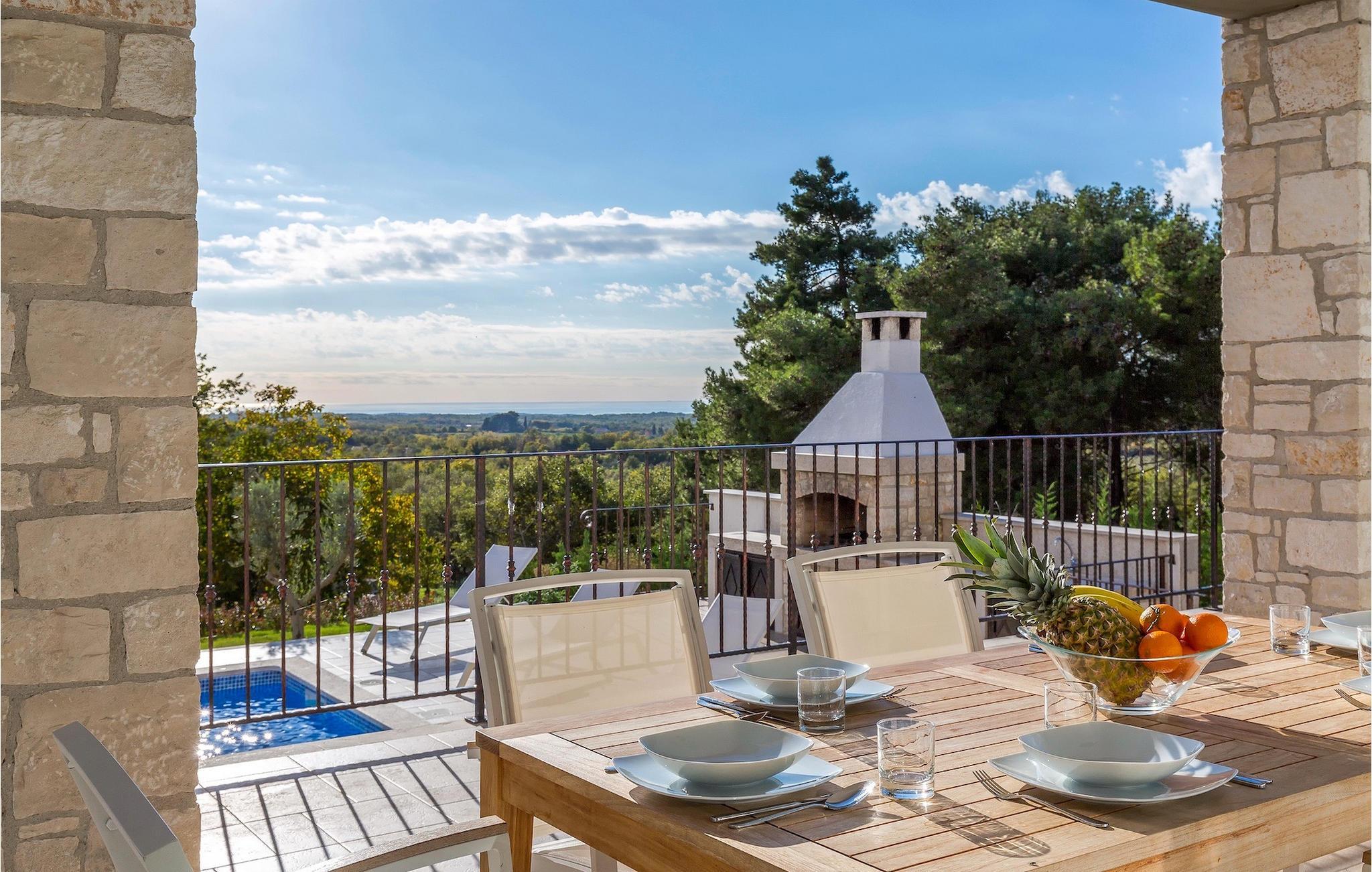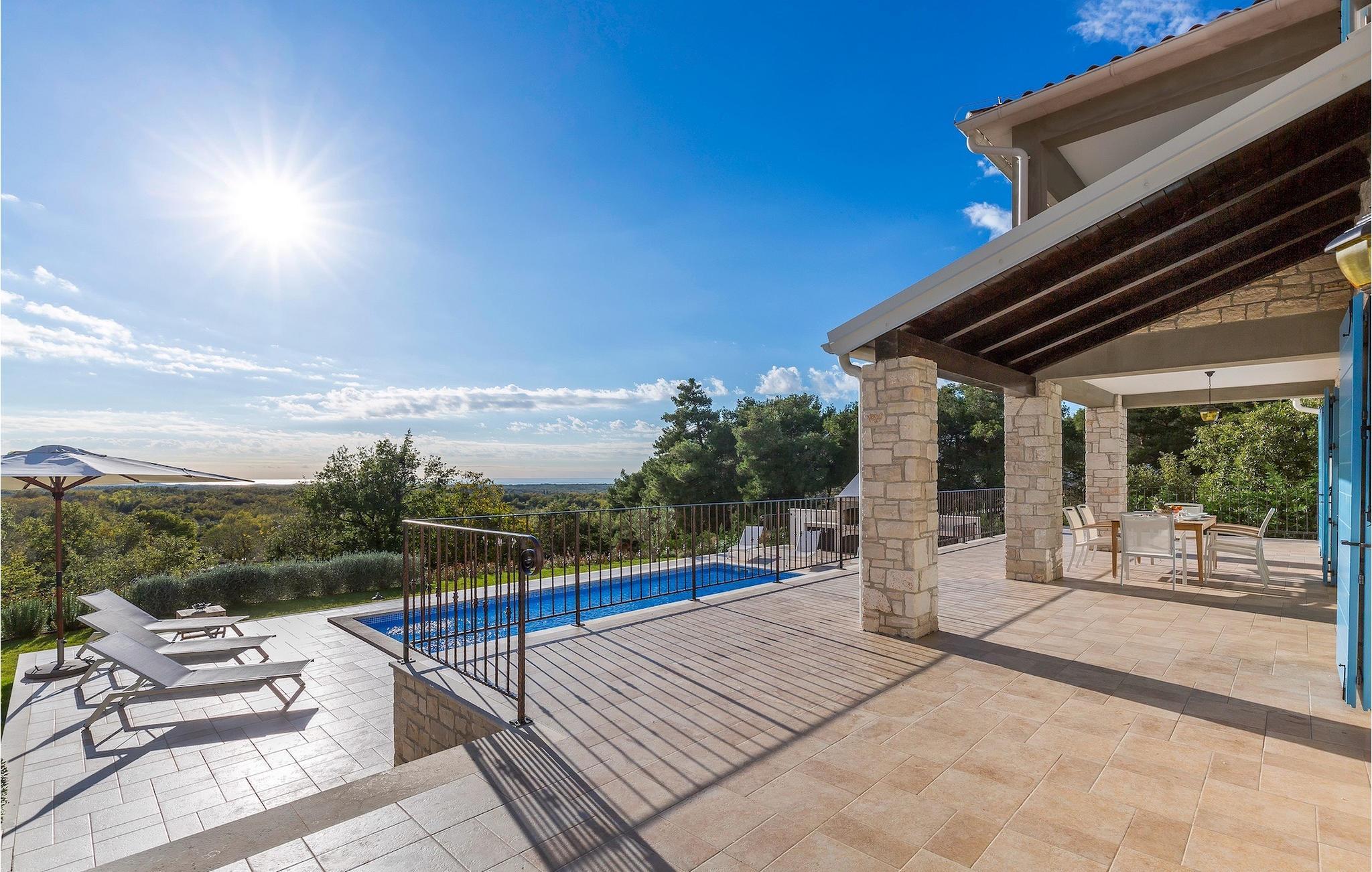 Ta en pause fra den stressende hverdagen i denne sjarmerende, rustikke villaen for 8 personer med utsikt over åsene og havet. Start din velfortjente ferie med en dukkert i det private bassenget eller les en bok på solsengene under parasollen. Den romslige overbygde terrassen er det perfekte stedet å nyte måltider tilberedt på utegrillen eller på det fullt utstyrte kjøkkenet. I første etasje danner kjøkkenet, spisestuen og stuen en romslig åpen planløsning som er direkte forbundet med terrassen via glassdører. Et spesielt tilskudd til stuen er peisen, som skaper en spesiell atmosfære i vinter- eller sommermånedene. Til tross for det rustikke eksteriøret er denne spesielle villaen utstyrt med alle bekvemmeligheter som er nødvendige for et moderne liv - den har klimaanlegg og gulvvarme i hele huset. For ekstra komfort, spesielt for barnefamilier, er det også et romslig soverom med eget bad og et ekstra separat toalett i første etasje.