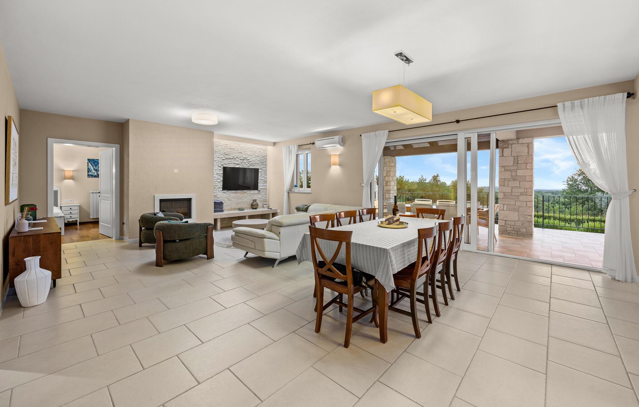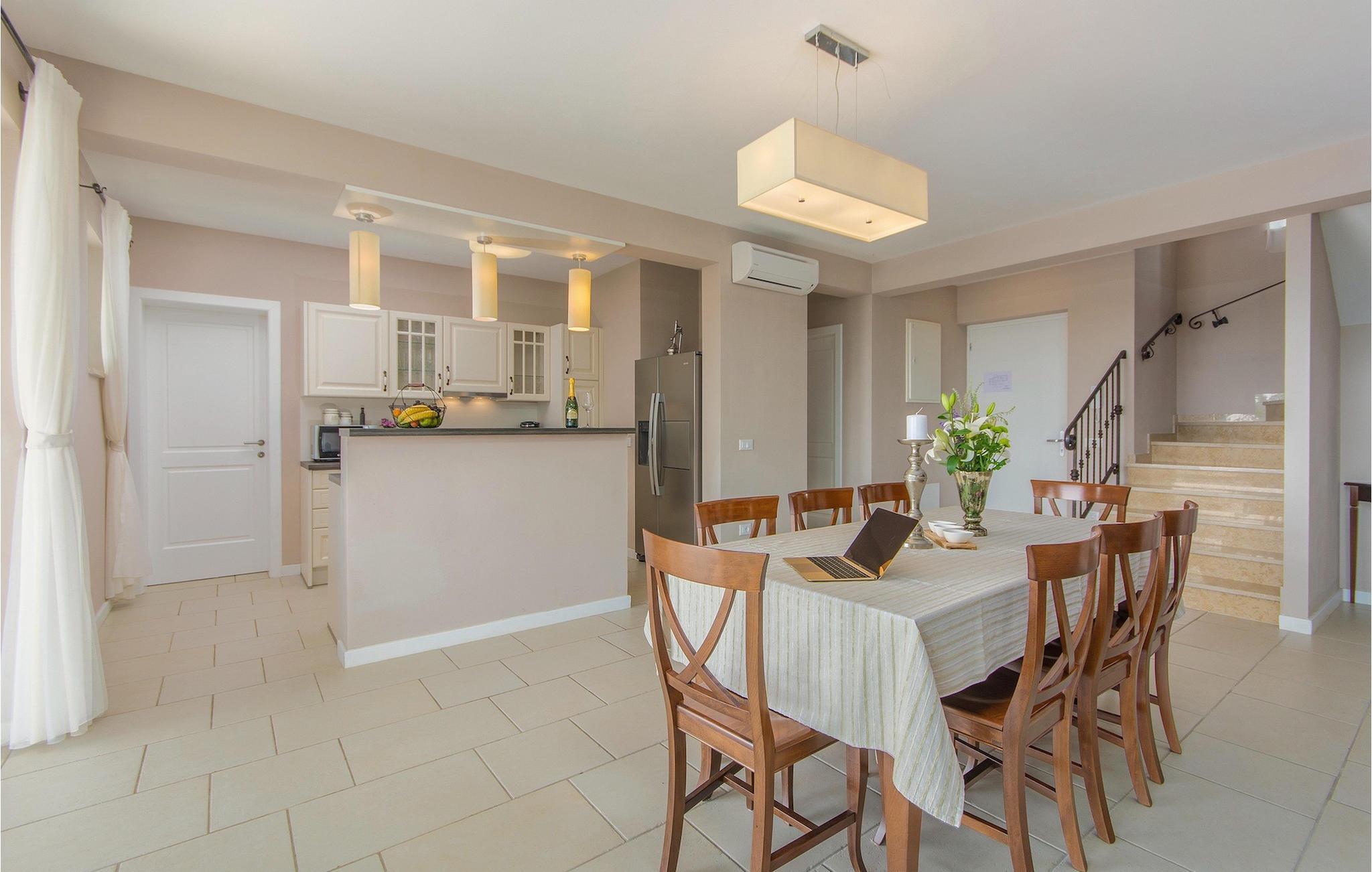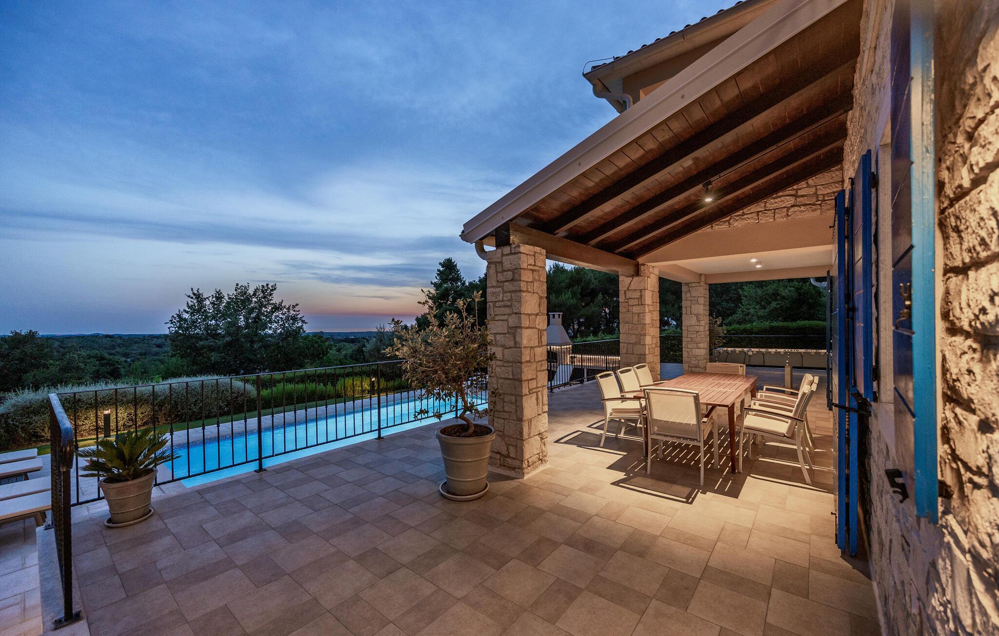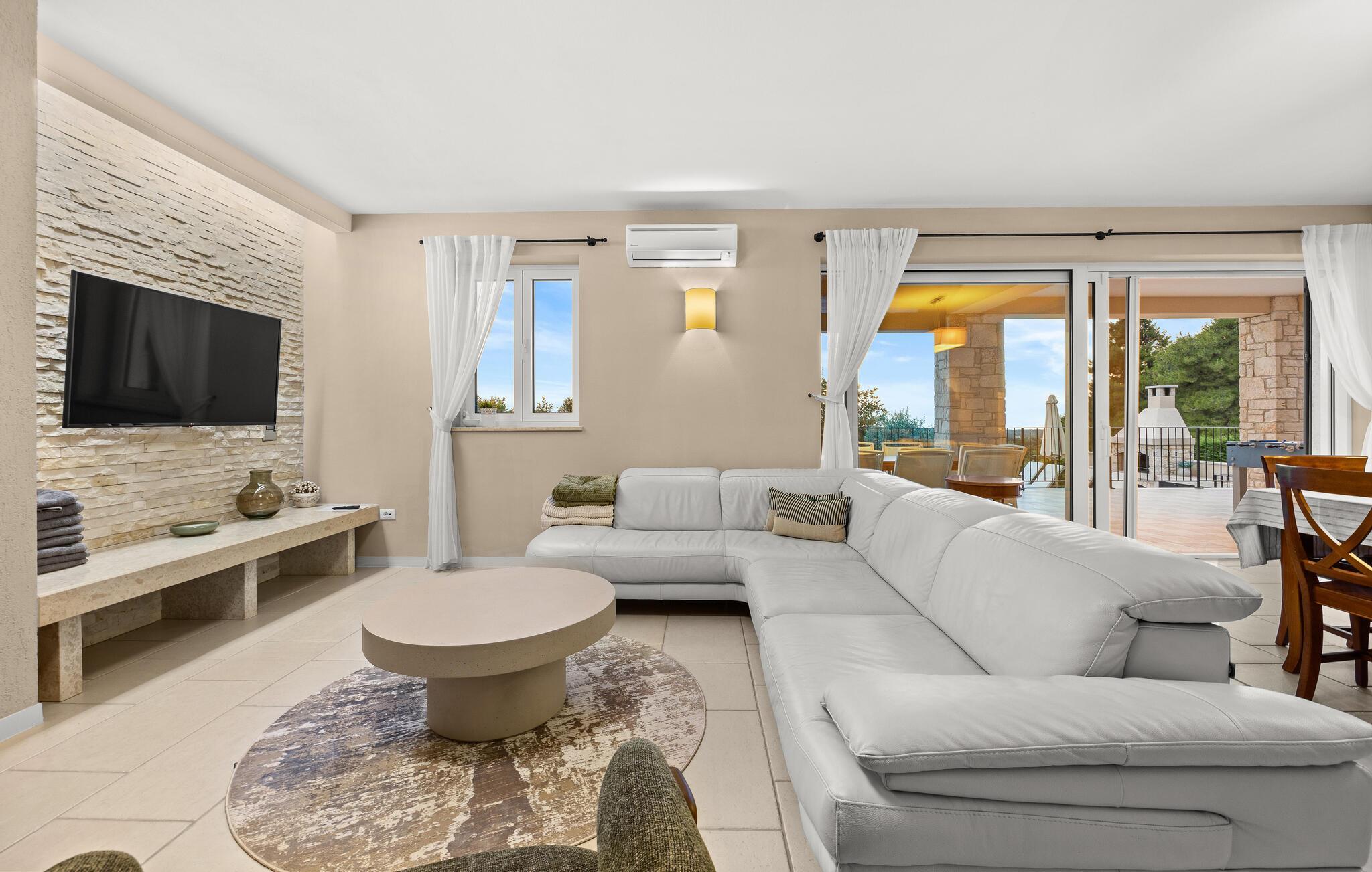 Ta en pause fra den stressende hverdagen i denne sjarmerende, rustikke villaen for 8 personer med utsikt over åsene og havet. Start din velfortjente ferie med en dukkert i det private bassenget eller les en bok på solsengene under parasollen. Den romslige overbygde terrassen er det perfekte stedet å nyte måltider tilberedt på utegrillen eller på det fullt utstyrte kjøkkenet. I første etasje danner kjøkkenet, spisestuen og stuen en romslig åpen planløsning som er direkte forbundet med terrassen via glassdører. Et spesielt tilskudd til stuen er peisen, som skaper en spesiell atmosfære i vinter- eller sommermånedene. Til tross for det rustikke eksteriøret er denne spesielle villaen utstyrt med alle bekvemmeligheter som er nødvendige for et moderne liv - den har klimaanlegg og gulvvarme i hele huset. For ekstra komfort, spesielt for barnefamilier, er det også et romslig soverom med eget bad og et ekstra separat toalett i første etasje.