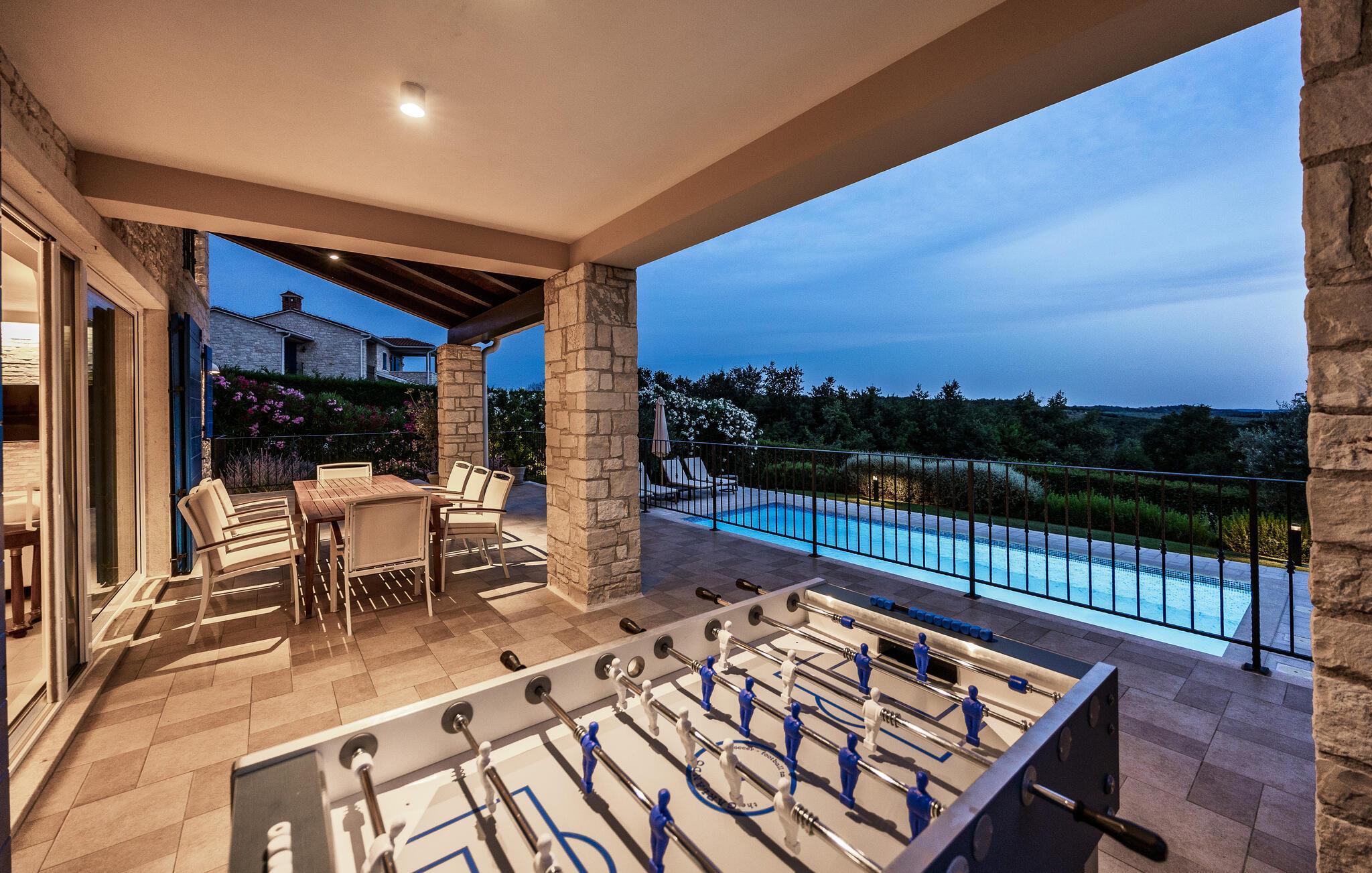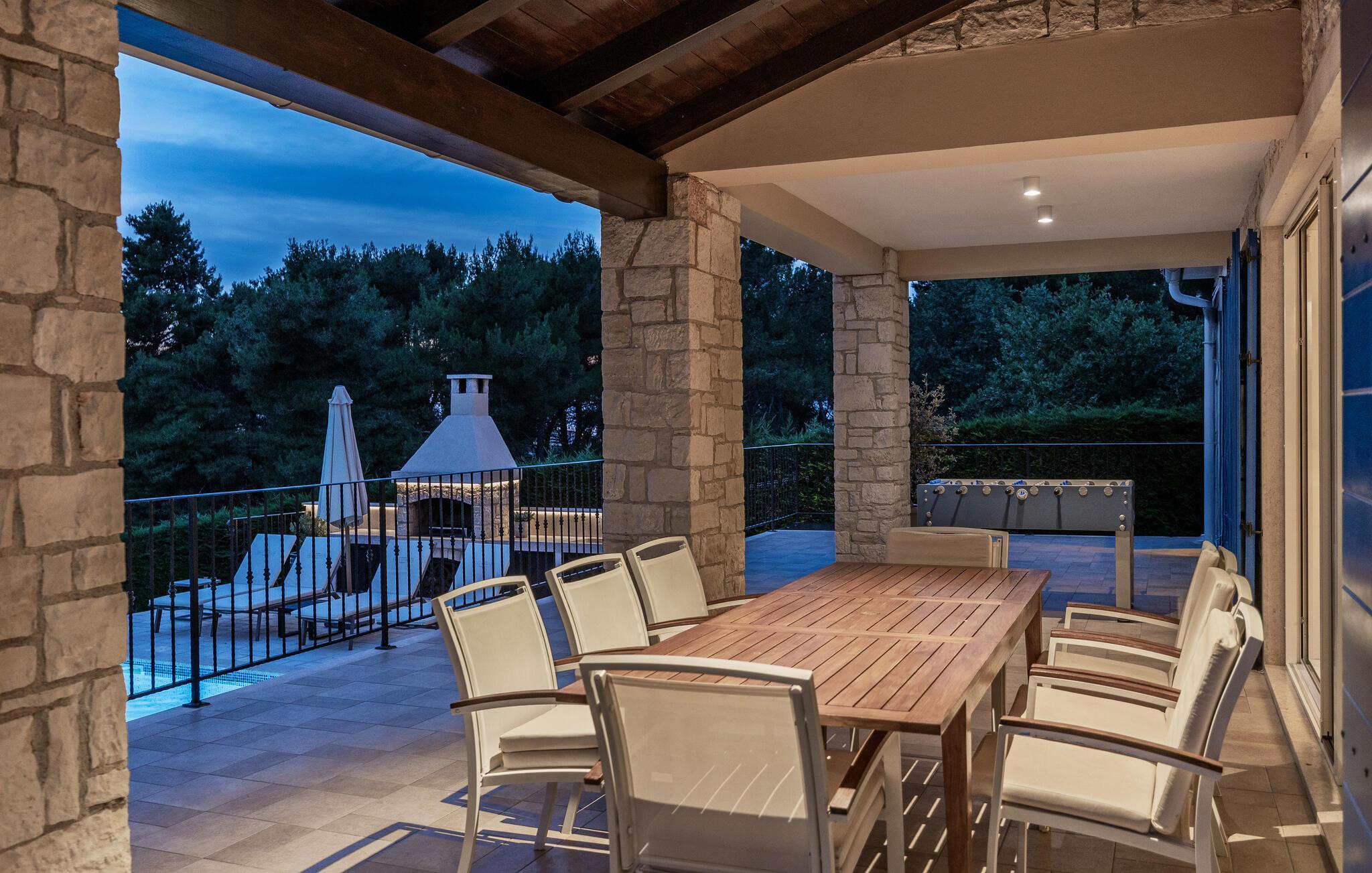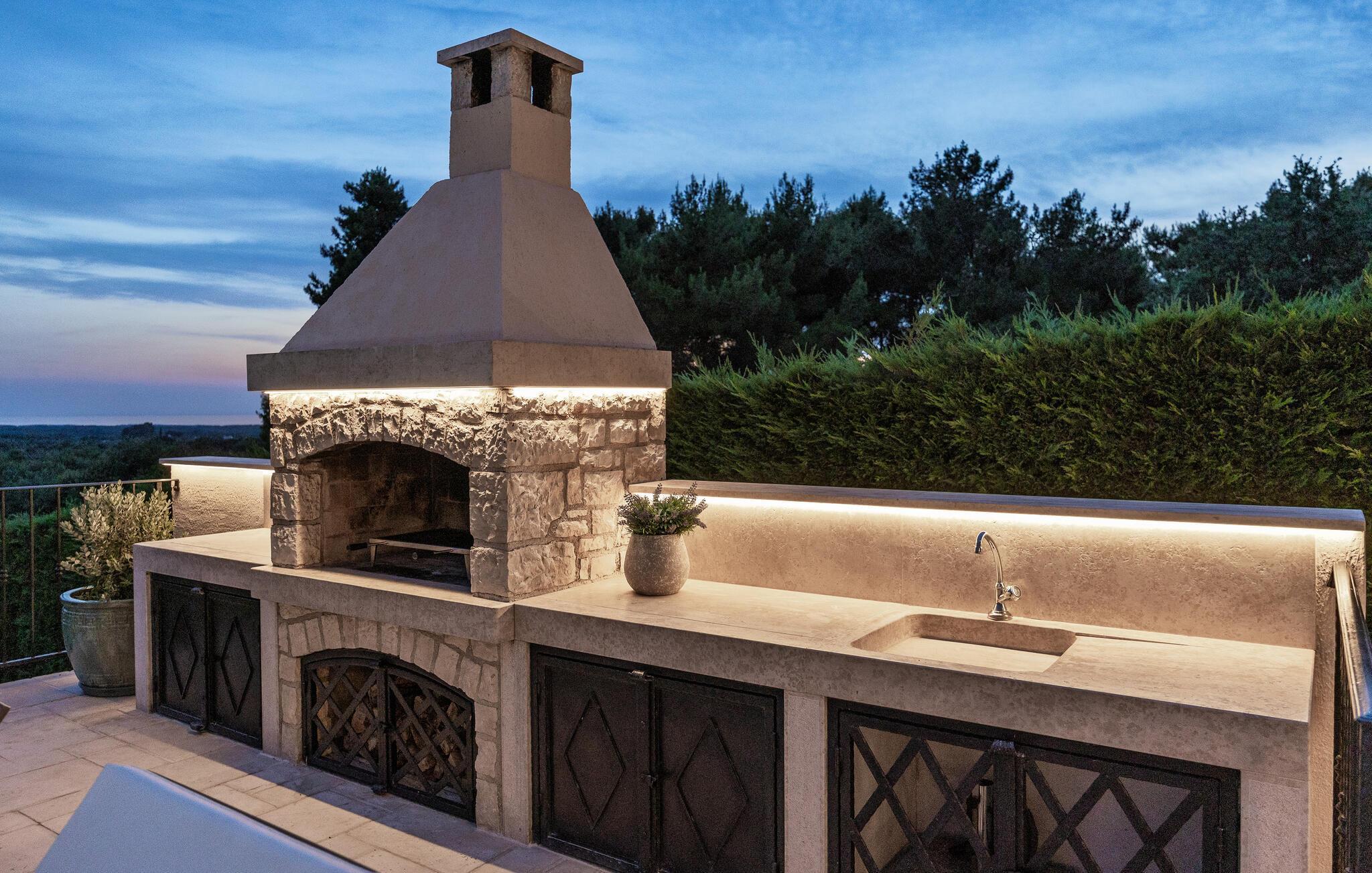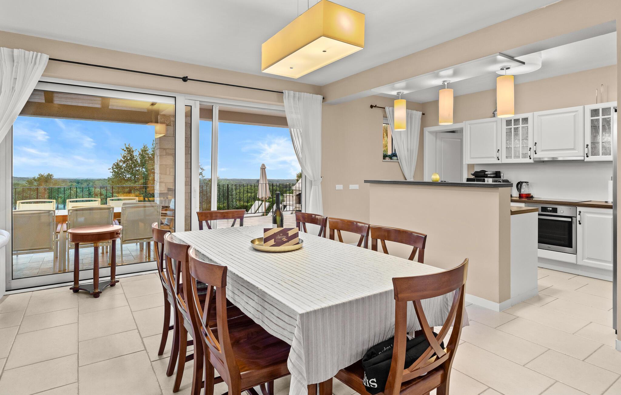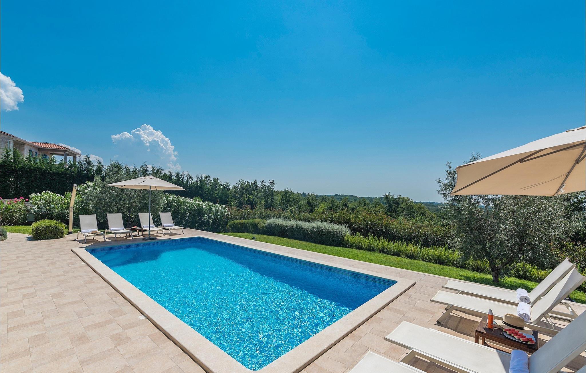 Ta en pause fra den stressende hverdagen i denne sjarmerende, rustikke villaen for 8 personer med utsikt over åsene og havet. Start din velfortjente ferie med en dukkert i det private bassenget eller les en bok på solsengene under parasollen. Den romslige overbygde terrassen er det perfekte stedet å nyte måltider tilberedt på utegrillen eller på det fullt utstyrte kjøkkenet. I første etasje danner kjøkkenet, spisestuen og stuen en romslig åpen planløsning som er direkte forbundet med terrassen via glassdører. Et spesielt tilskudd til stuen er peisen, som skaper en spesiell atmosfære i vinter- eller sommermånedene. Til tross for det rustikke eksteriøret er denne spesielle villaen utstyrt med alle bekvemmeligheter som er nødvendige for et moderne liv - den har klimaanlegg og gulvvarme i hele huset. For ekstra komfort, spesielt for barnefamilier, er det også et romslig soverom med eget bad og et ekstra separat toalett i første etasje.