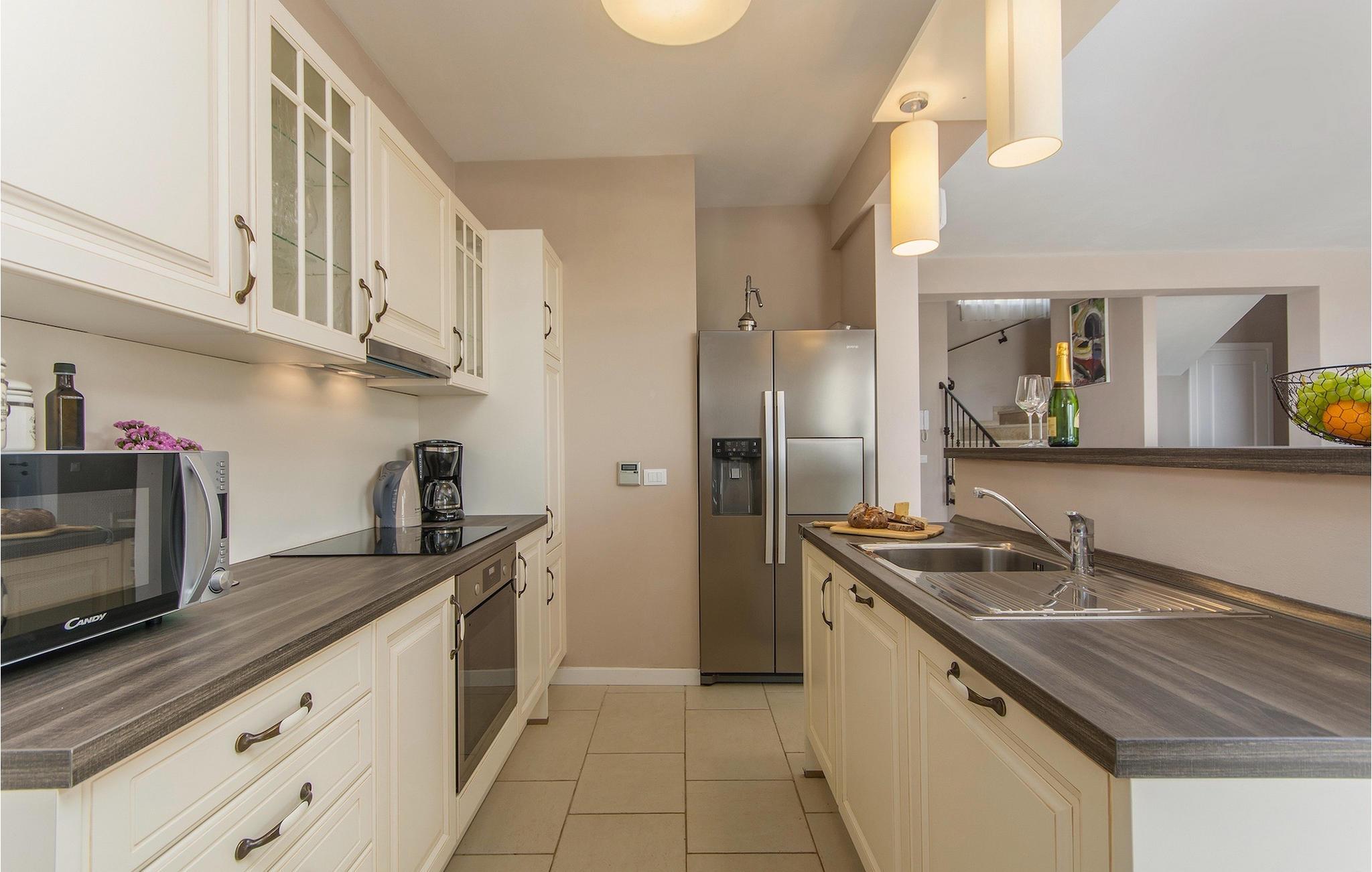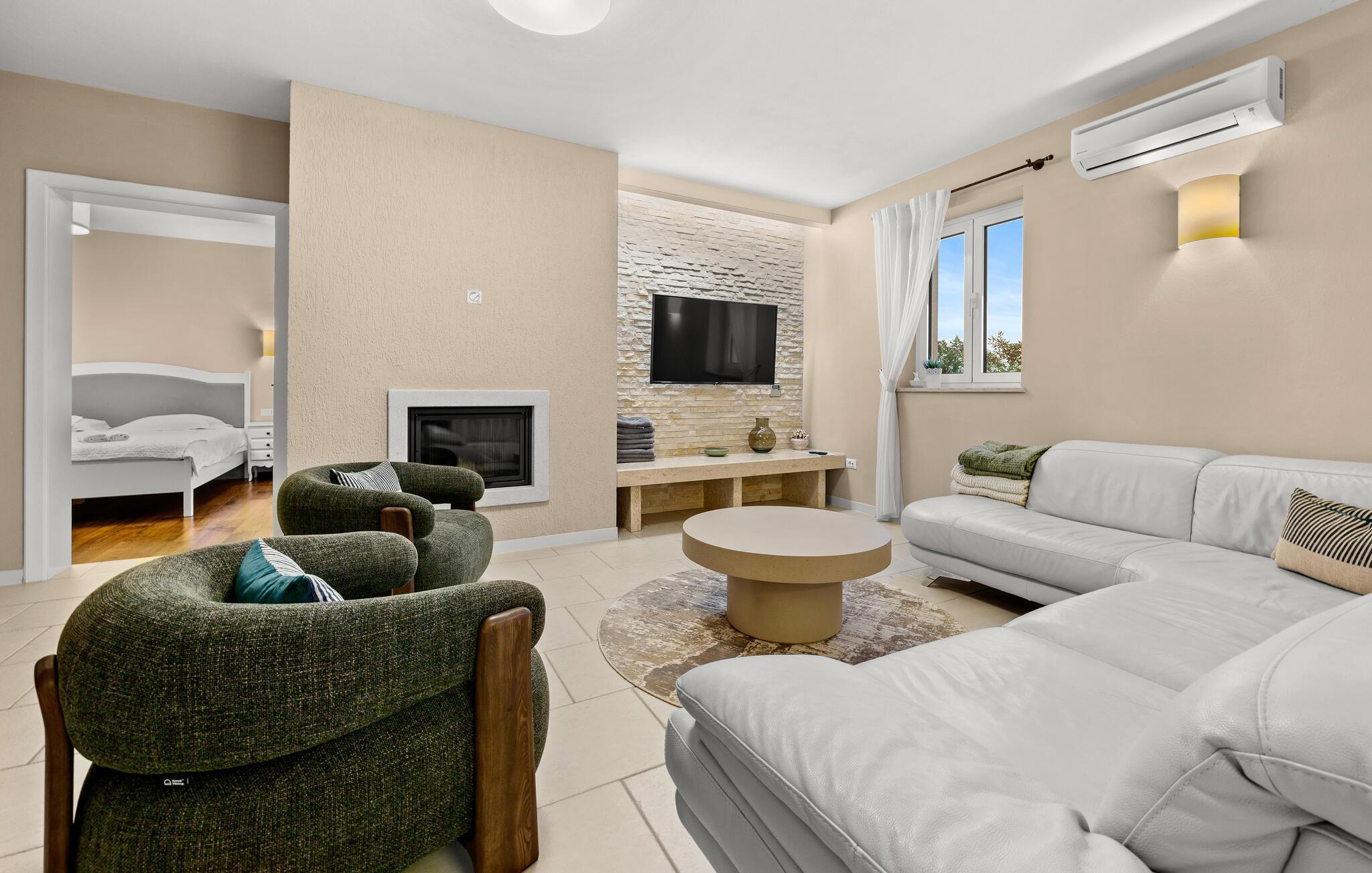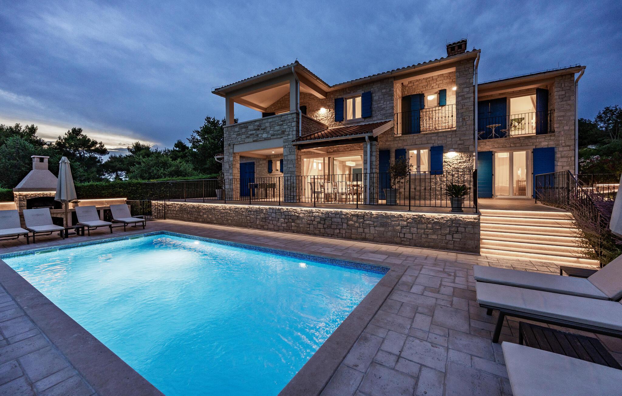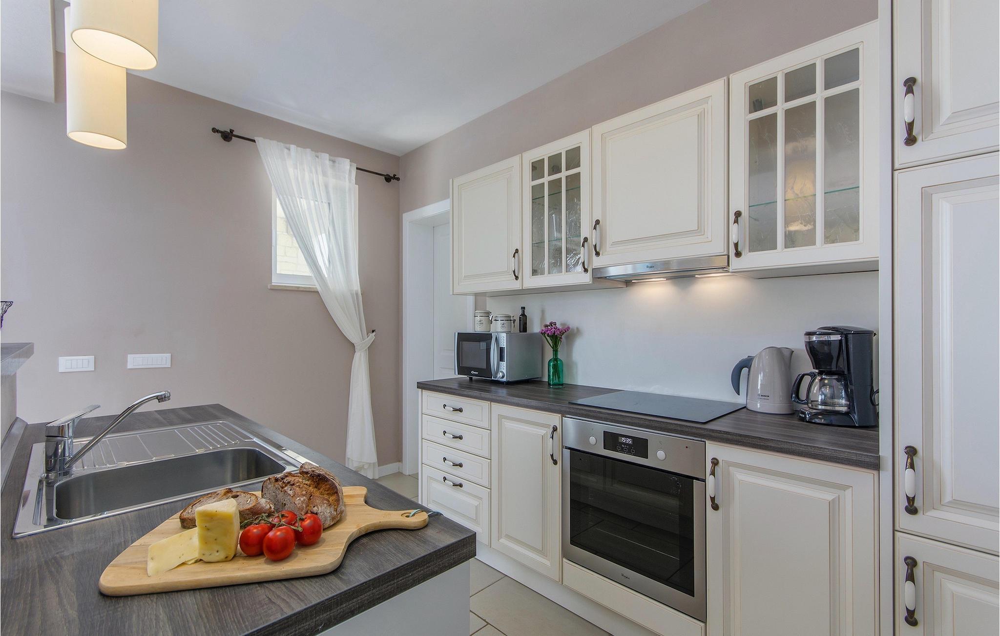 Ta en pause fra den stressende hverdagen i denne sjarmerende, rustikke villaen for 8 personer med utsikt over åsene og havet. Start din velfortjente ferie med en dukkert i det private bassenget eller les en bok på solsengene under parasollen. Den romslige overbygde terrassen er det perfekte stedet å nyte måltider tilberedt på utegrillen eller på det fullt utstyrte kjøkkenet. I første etasje danner kjøkkenet, spisestuen og stuen en romslig åpen planløsning som er direkte forbundet med terrassen via glassdører. Et spesielt tilskudd til stuen er peisen, som skaper en spesiell atmosfære i vinter- eller sommermånedene. Til tross for det rustikke eksteriøret er denne spesielle villaen utstyrt med alle bekvemmeligheter som er nødvendige for et moderne liv - den har klimaanlegg og gulvvarme i hele huset. For ekstra komfort, spesielt for barnefamilier, er det også et romslig soverom med eget bad og et ekstra separat toalett i første etasje.