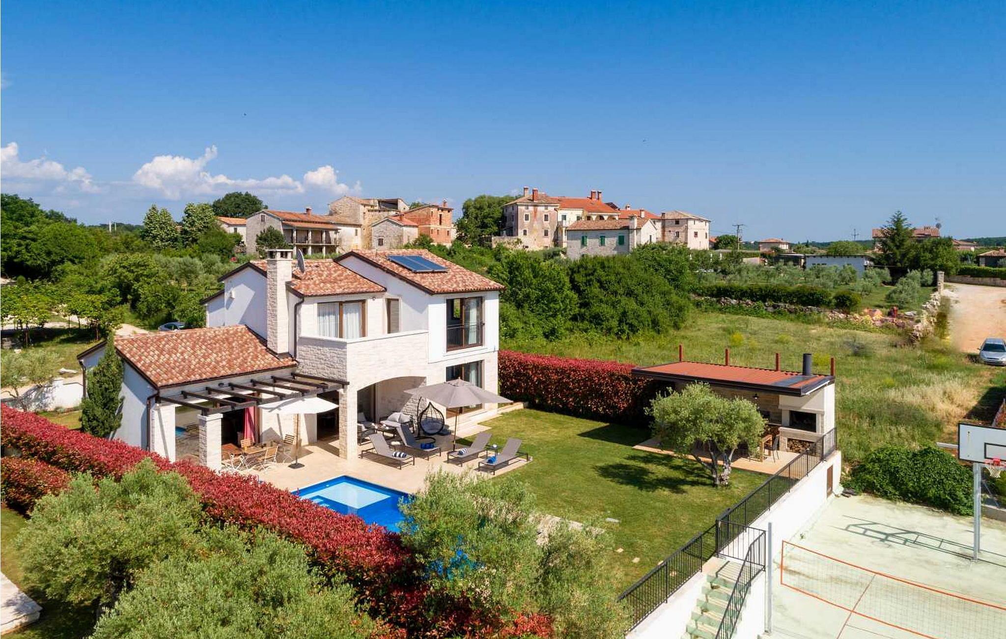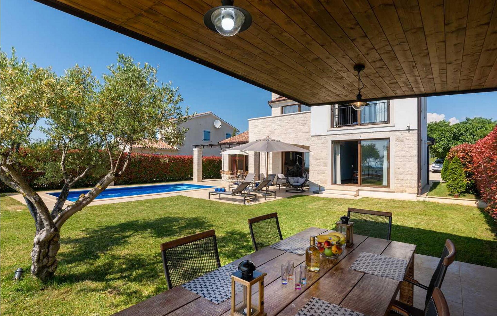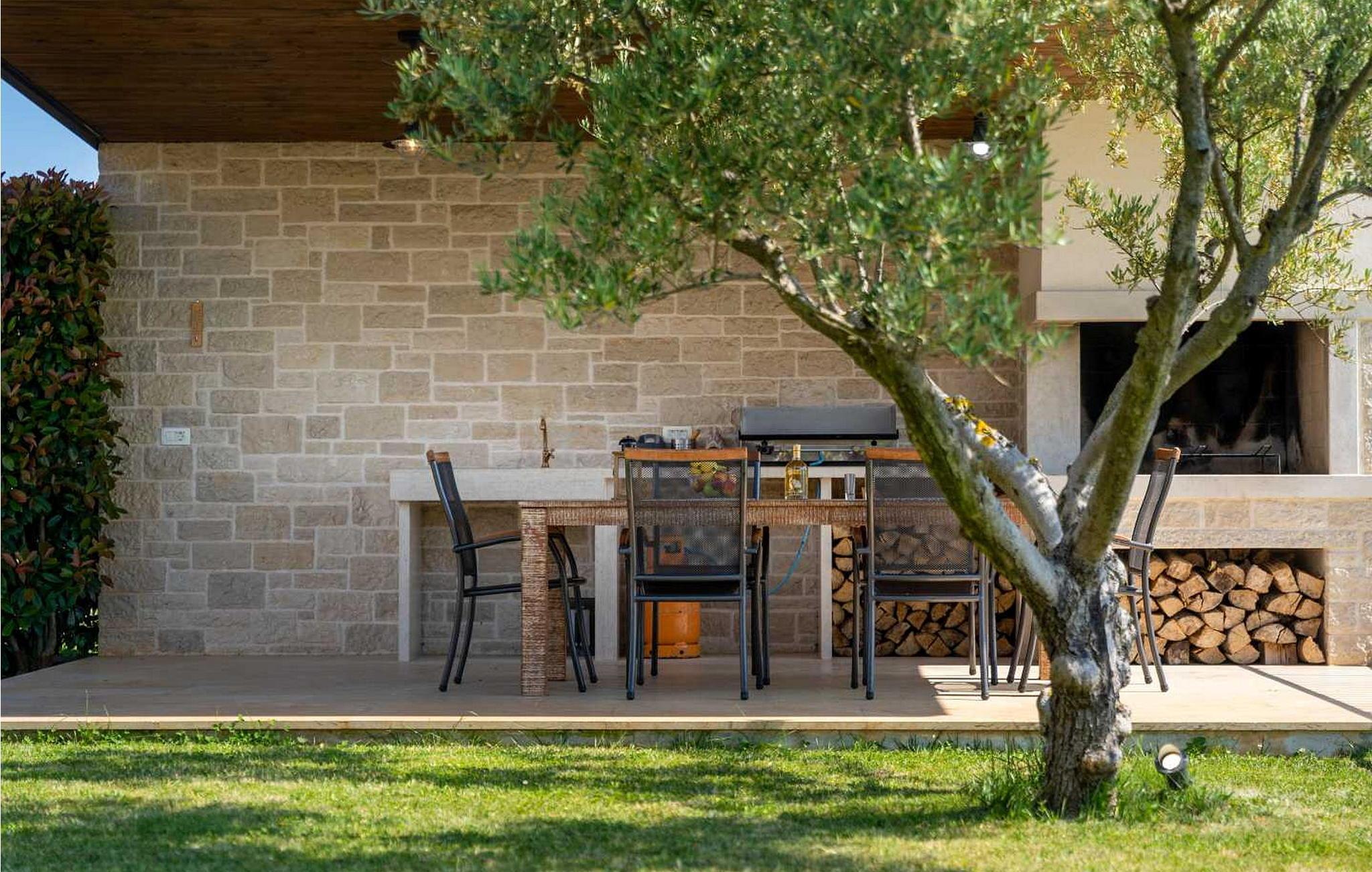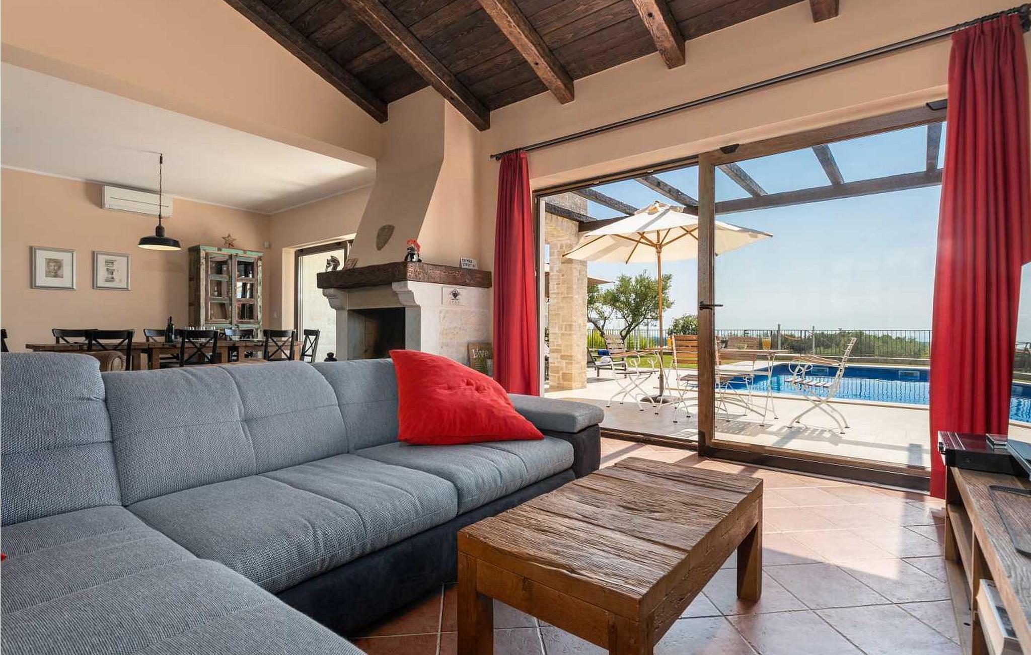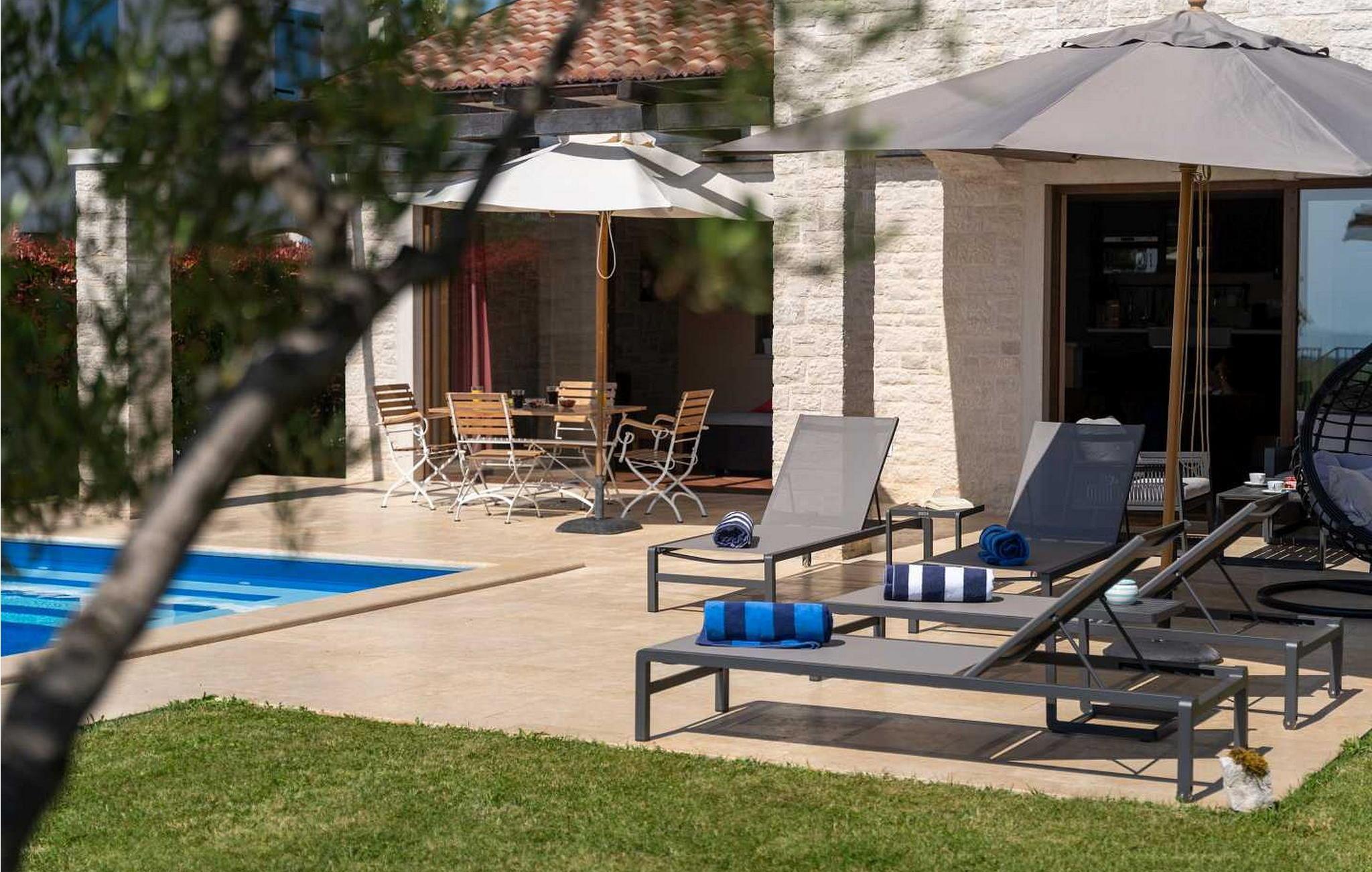 Villaen ble bygget i 2014 og har en inngjerdet tomt med en velstelt plen og olivenlund på 1500 kvadratmeter, som ligger på et rolig torg med vakker panoramautsikt over havet, noe som understrekes ytterligere av glassveggene i alle rommene som vender mot havet. Det unike med denne villaen er at stuen og soverommet i første etasje er forbundet med en stor terrasse gjennom flere glassvegger, slik at de to enhetene smelter sammen til én. Det utmerkede lydanlegget med 6 høyttalere, den store peisen i stuen og en attraktiv kombinasjon av solide rustikke (delvis antikke) møbler og steindetaljer sørger for at gjestene føler seg ekstra komfortable. Villaen har følgende utendørs fasiliteter: privat parkering for to biler, basseng på 32 kvadratmeter med solsenger, overbygd terrasse med sittegruppe.