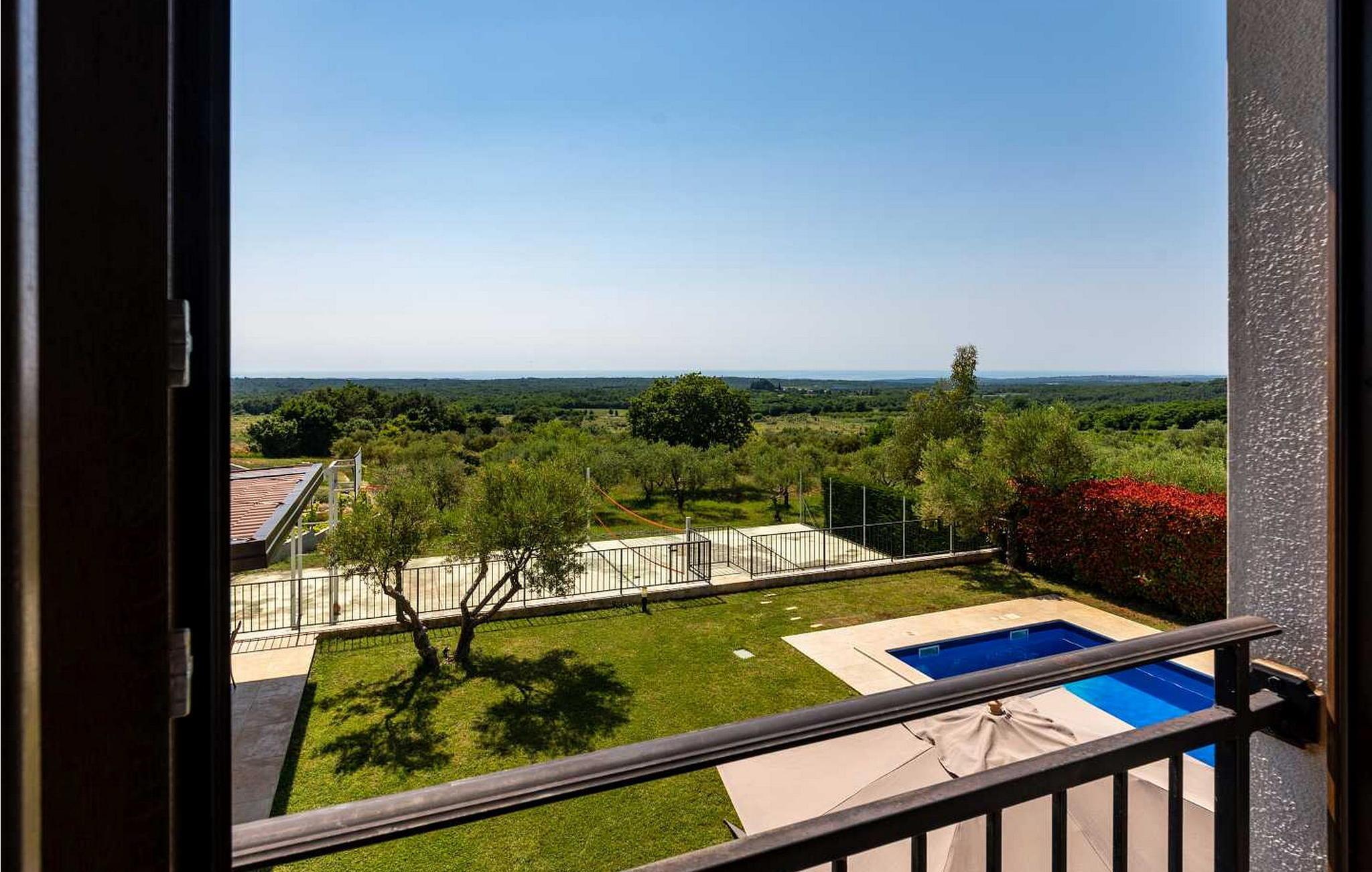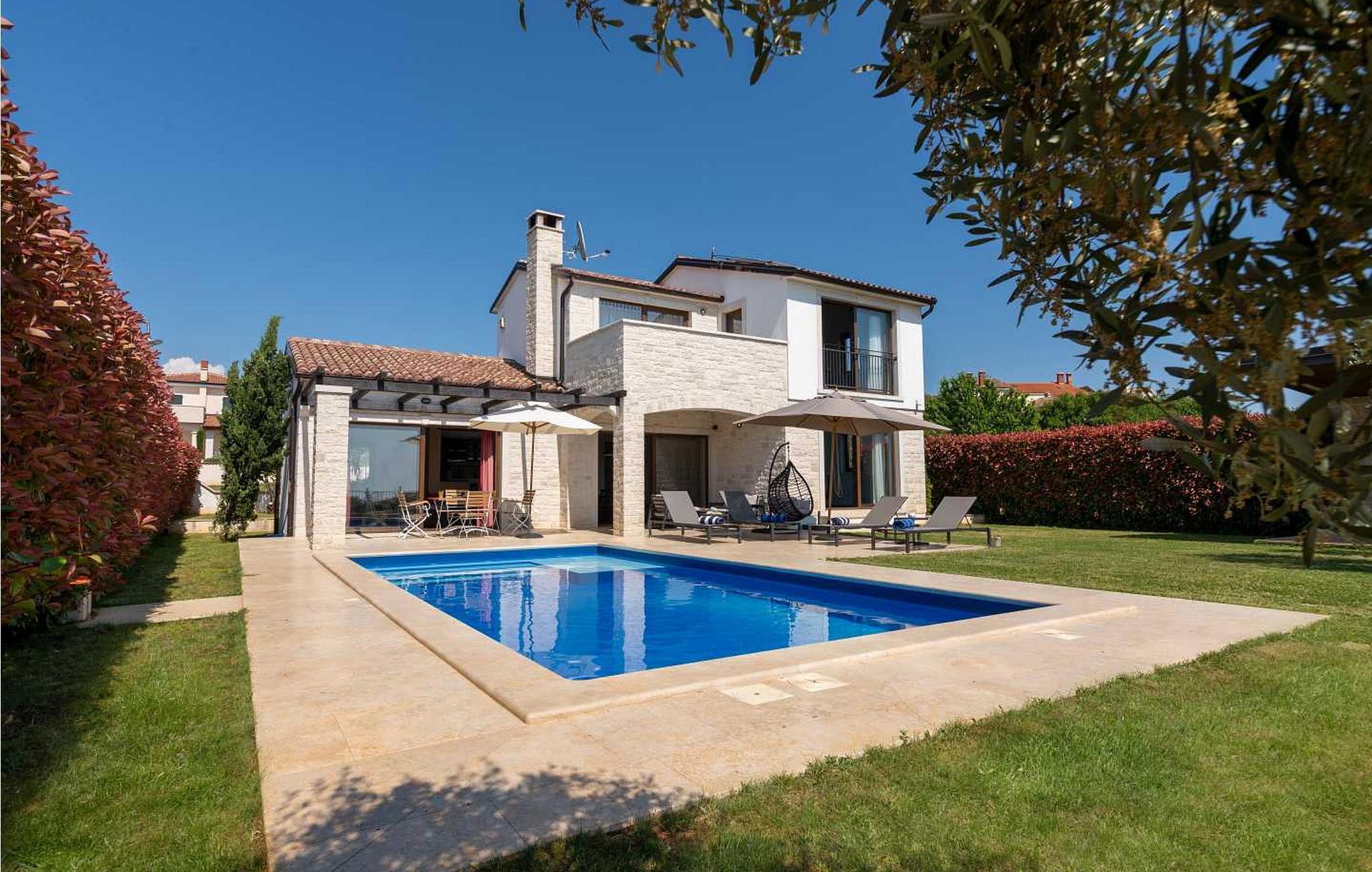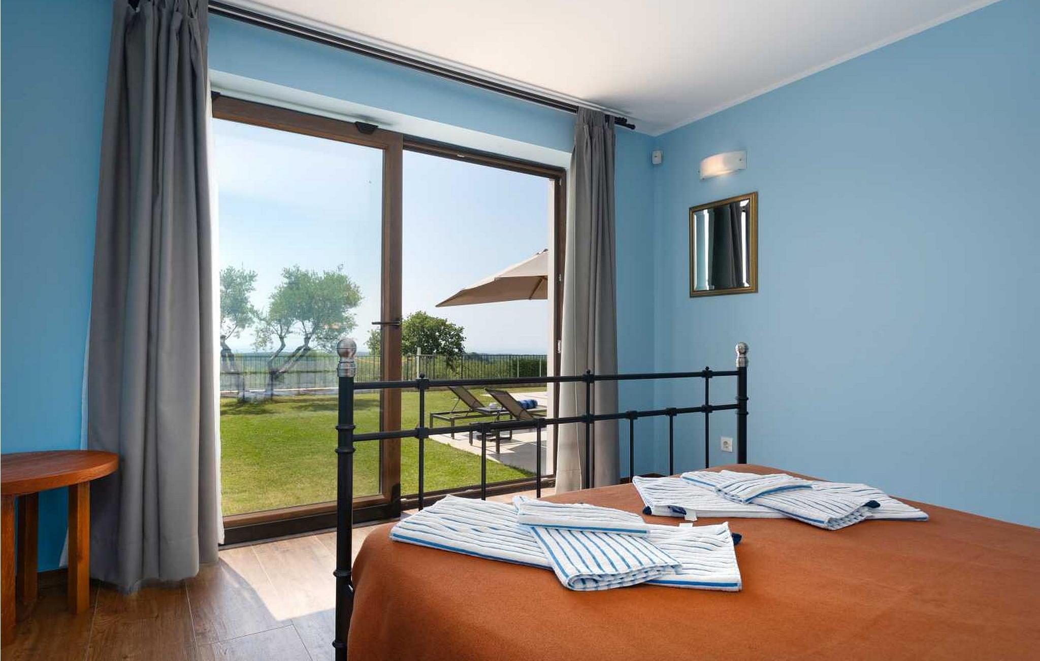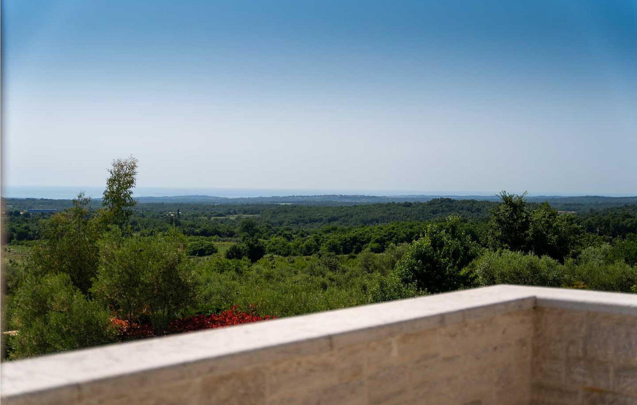 Villaen ble bygget i 2014 og har en inngjerdet tomt med en velstelt plen og olivenlund på 1500 kvadratmeter, som ligger på et rolig torg med vakker panoramautsikt over havet, noe som understrekes ytterligere av glassveggene i alle rommene som vender mot havet. Det unike med denne villaen er at stuen og soverommet i første etasje er forbundet med en stor terrasse gjennom flere glassvegger, slik at de to enhetene smelter sammen til én. Det utmerkede lydanlegget med 6 høyttalere, den store peisen i stuen og en attraktiv kombinasjon av solide rustikke (delvis antikke) møbler og steindetaljer sørger for at gjestene føler seg ekstra komfortable. Villaen har følgende utendørs fasiliteter: privat parkering for to biler, basseng på 32 kvadratmeter med solsenger, overbygd terrasse med sittegruppe.