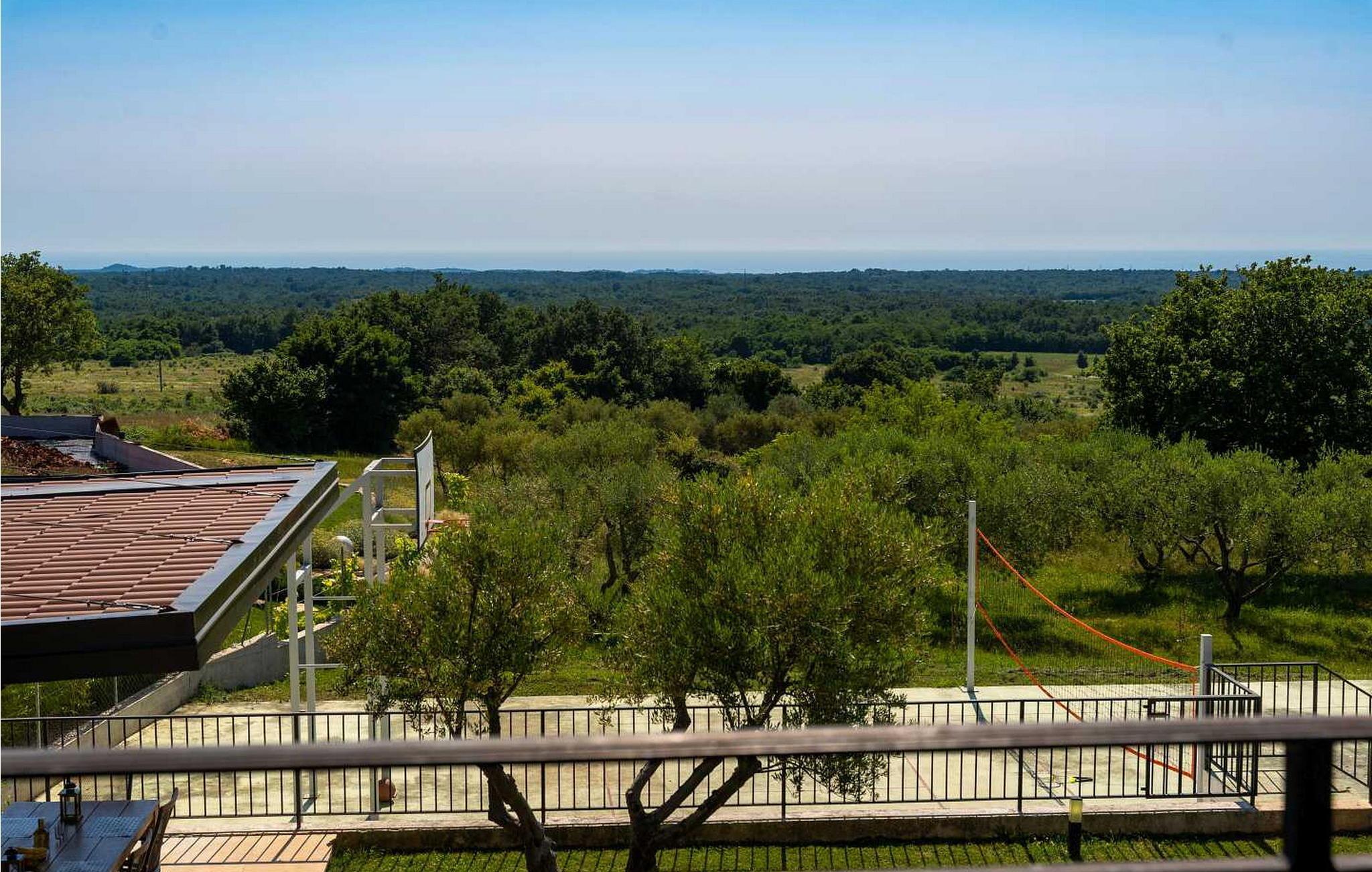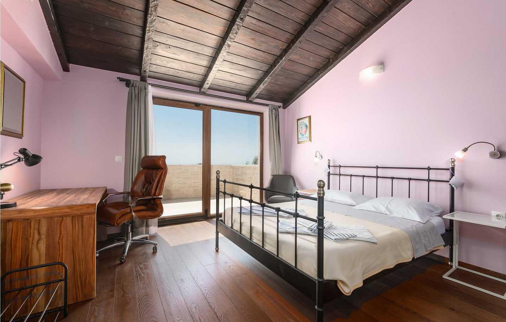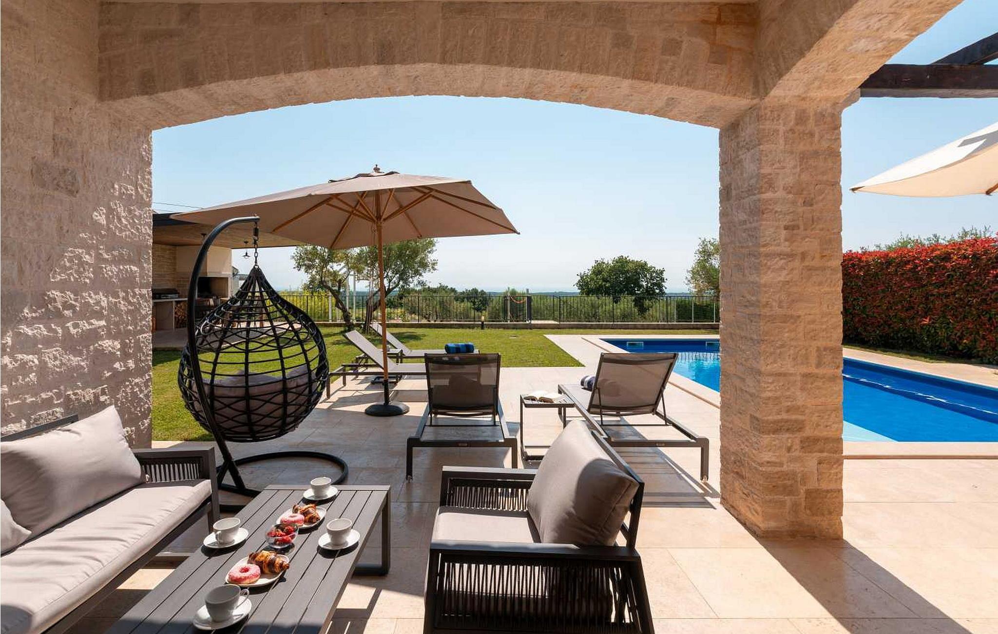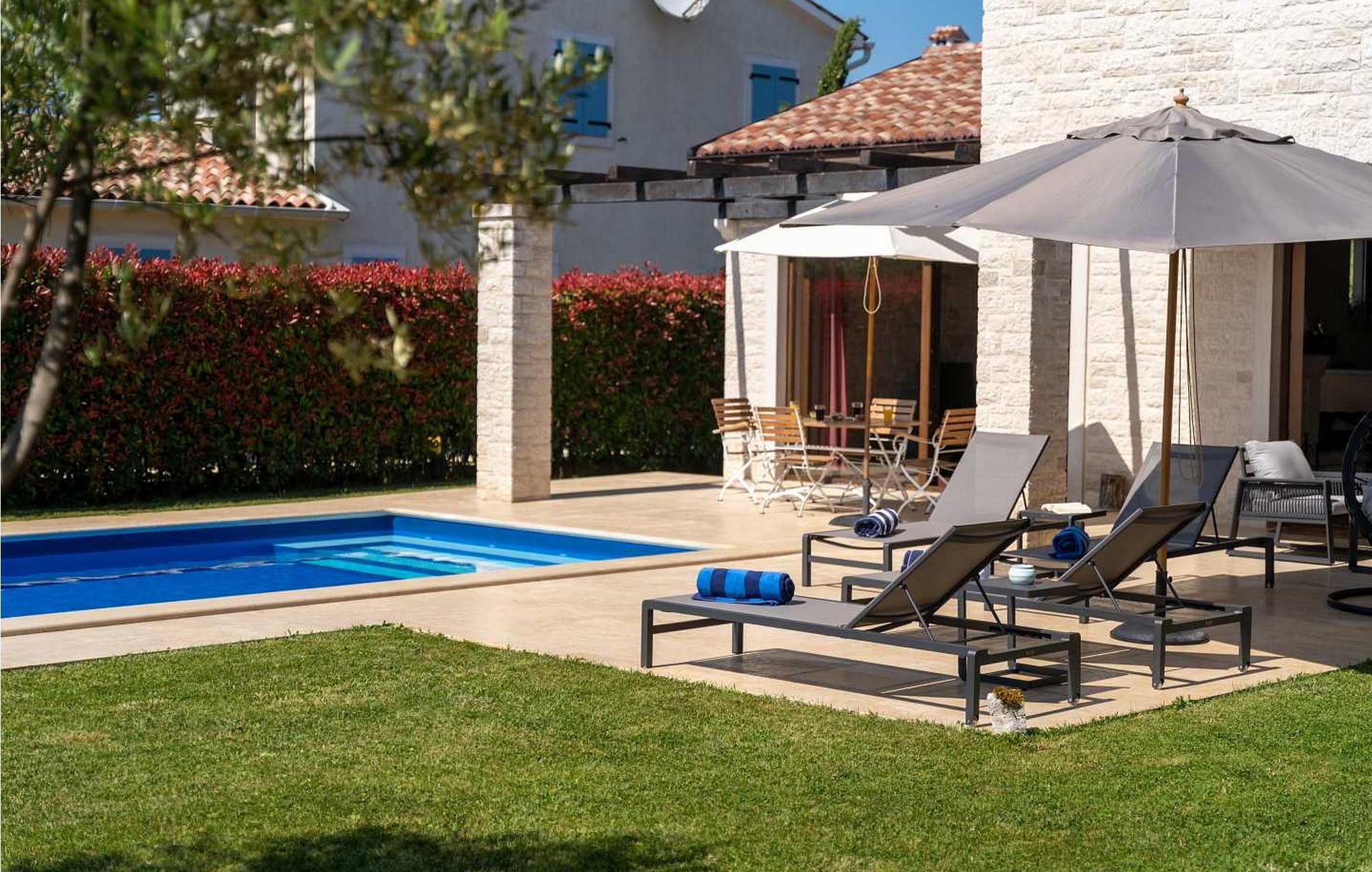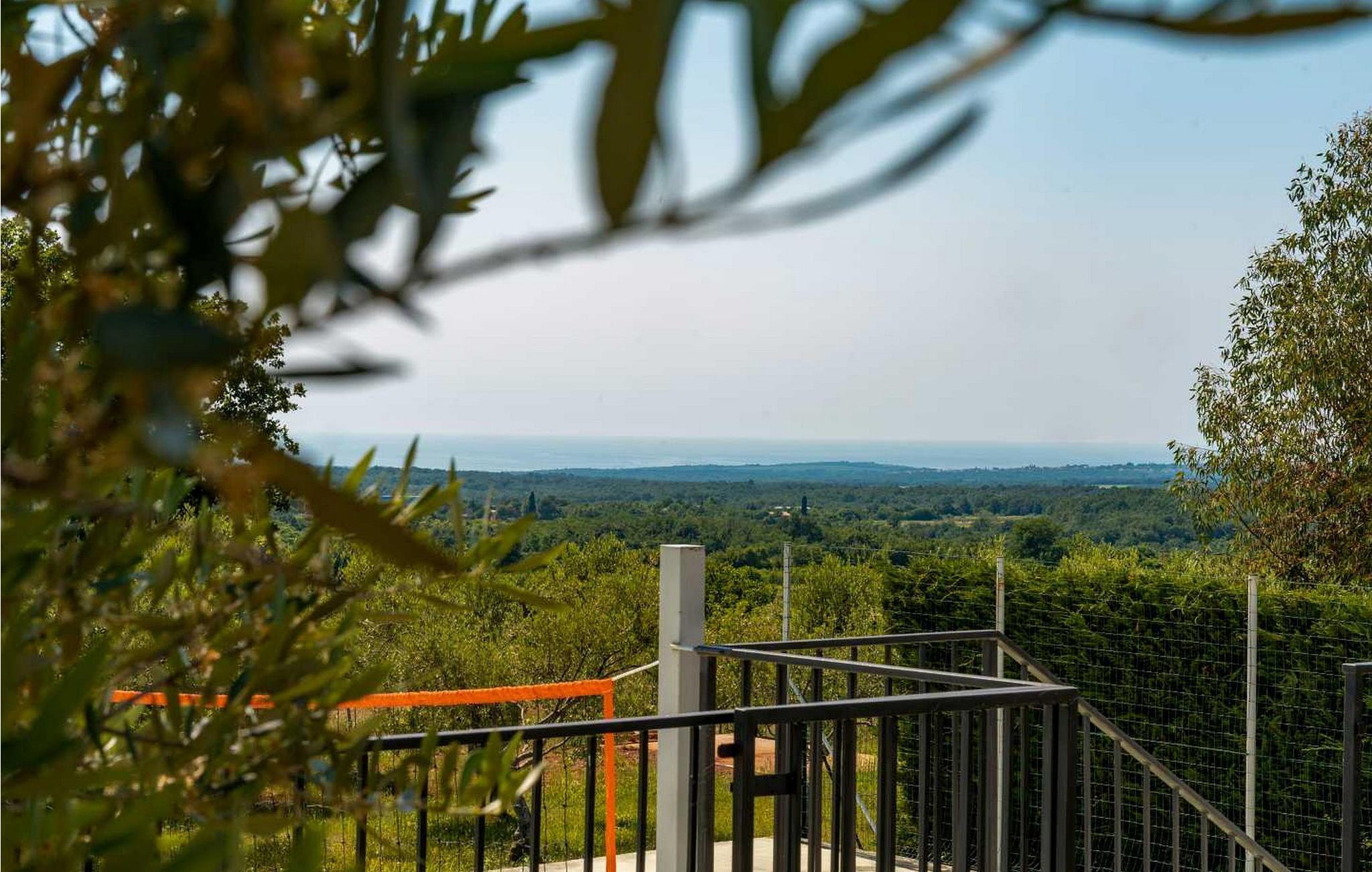 Villaen ble bygget i 2014 og har en inngjerdet tomt med en velstelt plen og olivenlund på 1500 kvadratmeter, som ligger på et rolig torg med vakker panoramautsikt over havet, noe som understrekes ytterligere av glassveggene i alle rommene som vender mot havet. Det unike med denne villaen er at stuen og soverommet i første etasje er forbundet med en stor terrasse gjennom flere glassvegger, slik at de to enhetene smelter sammen til én. Det utmerkede lydanlegget med 6 høyttalere, den store peisen i stuen og en attraktiv kombinasjon av solide rustikke (delvis antikke) møbler og steindetaljer sørger for at gjestene føler seg ekstra komfortable. Villaen har følgende utendørs fasiliteter: privat parkering for to biler, basseng på 32 kvadratmeter med solsenger, overbygd terrasse med sittegruppe.