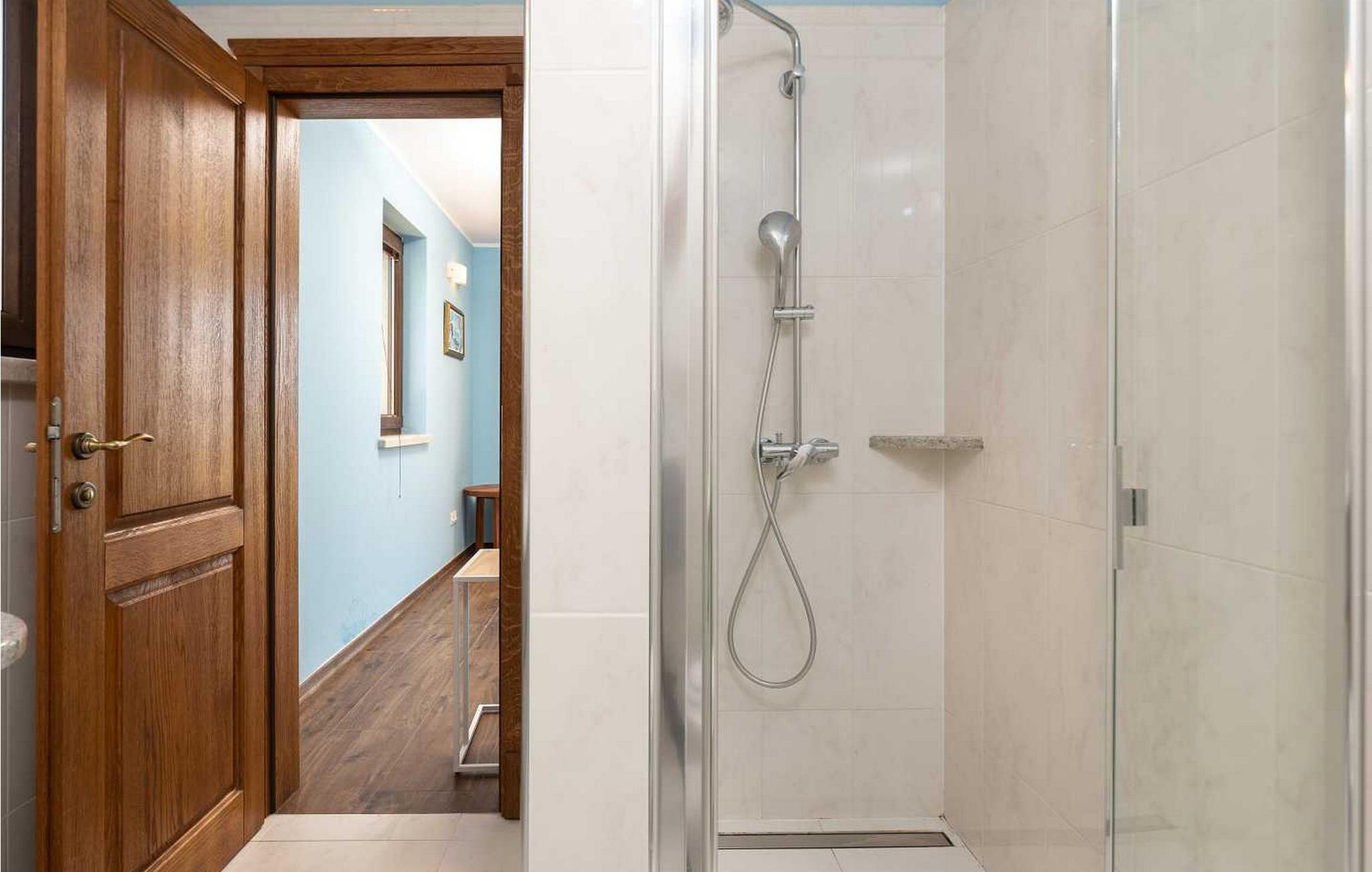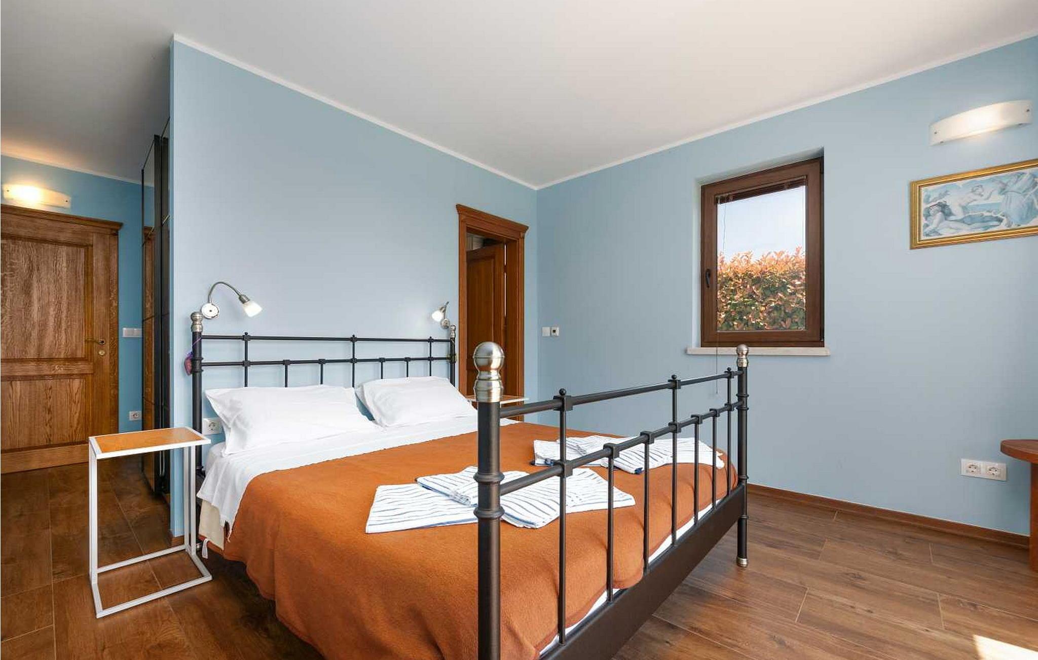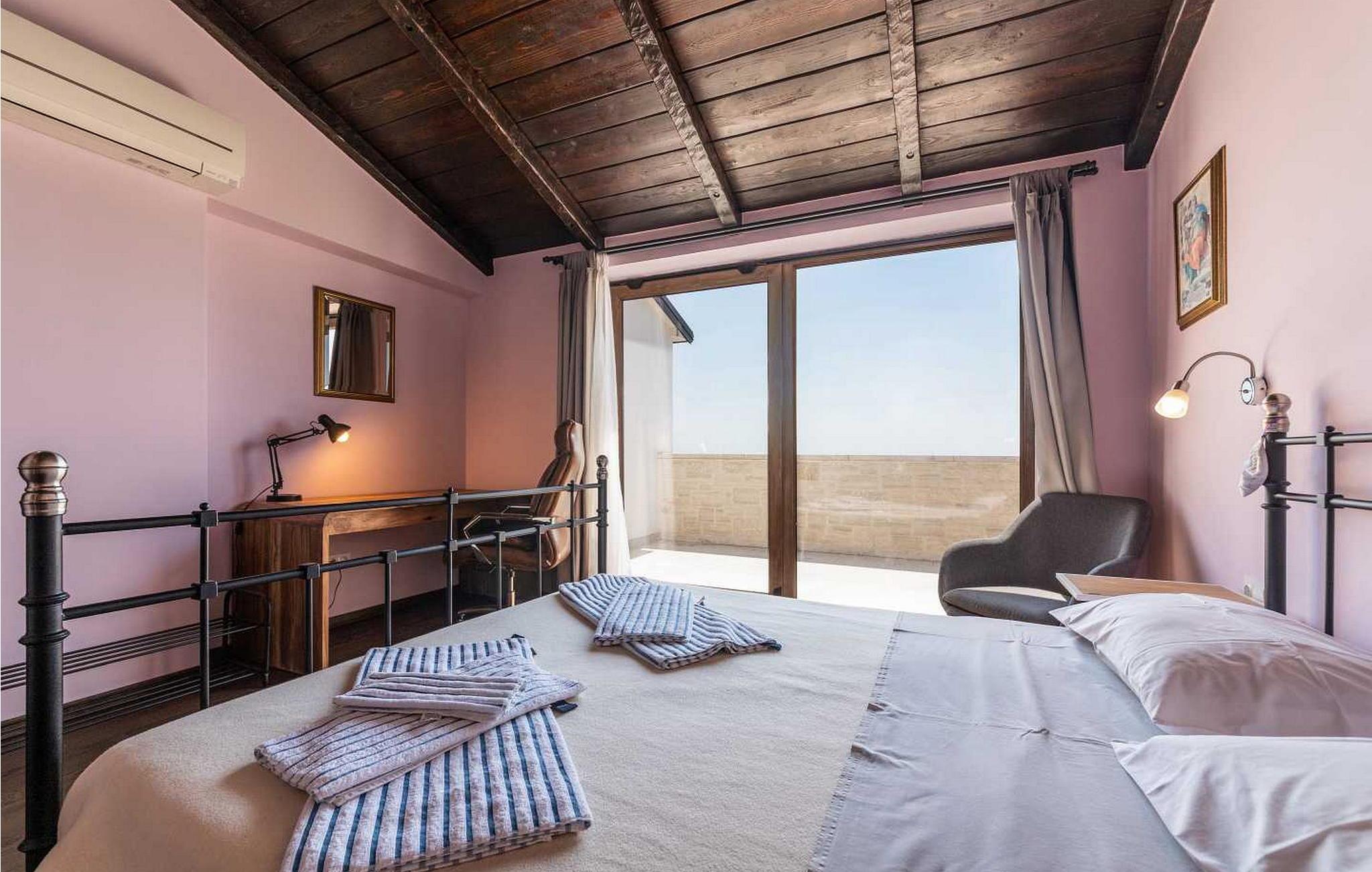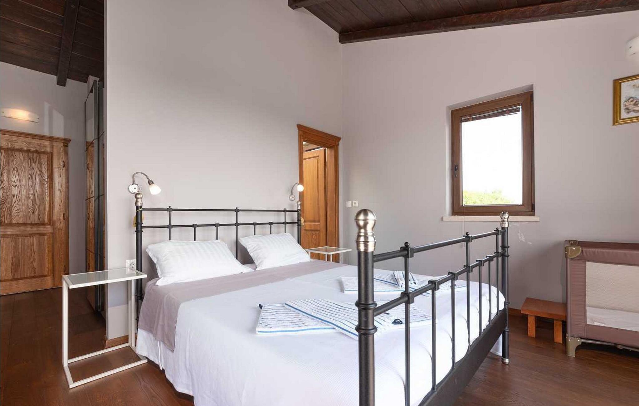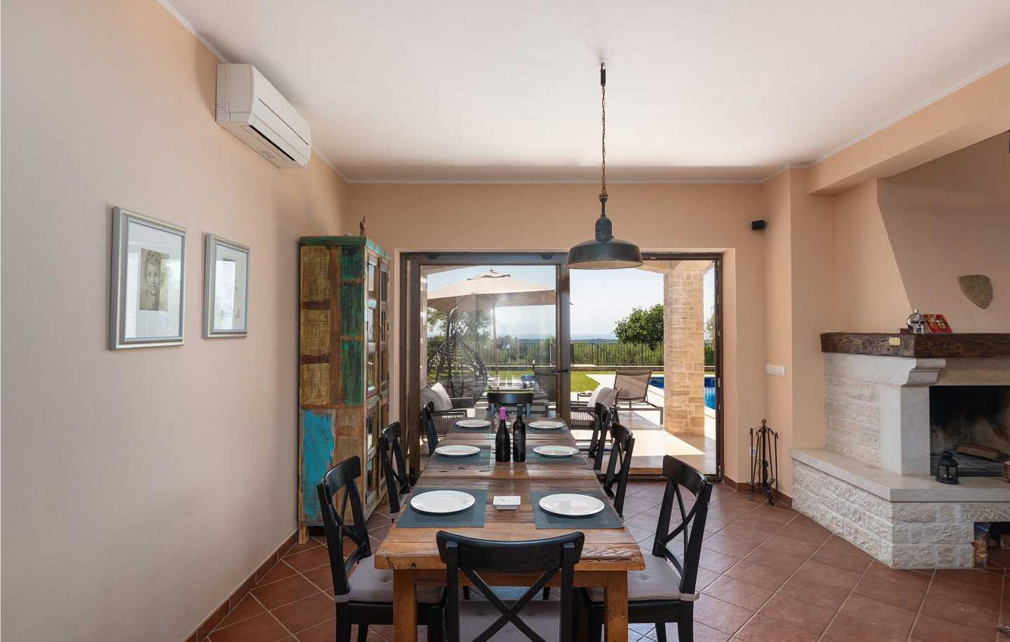 Villaen ble bygget i 2014 og har en inngjerdet tomt med en velstelt plen og olivenlund på 1500 kvadratmeter, som ligger på et rolig torg med vakker panoramautsikt over havet, noe som understrekes ytterligere av glassveggene i alle rommene som vender mot havet. Det unike med denne villaen er at stuen og soverommet i første etasje er forbundet med en stor terrasse gjennom flere glassvegger, slik at de to enhetene smelter sammen til én. Det utmerkede lydanlegget med 6 høyttalere, den store peisen i stuen og en attraktiv kombinasjon av solide rustikke (delvis antikke) møbler og steindetaljer sørger for at gjestene føler seg ekstra komfortable. Villaen har følgende utendørs fasiliteter: privat parkering for to biler, basseng på 32 kvadratmeter med solsenger, overbygd terrasse med sittegruppe.