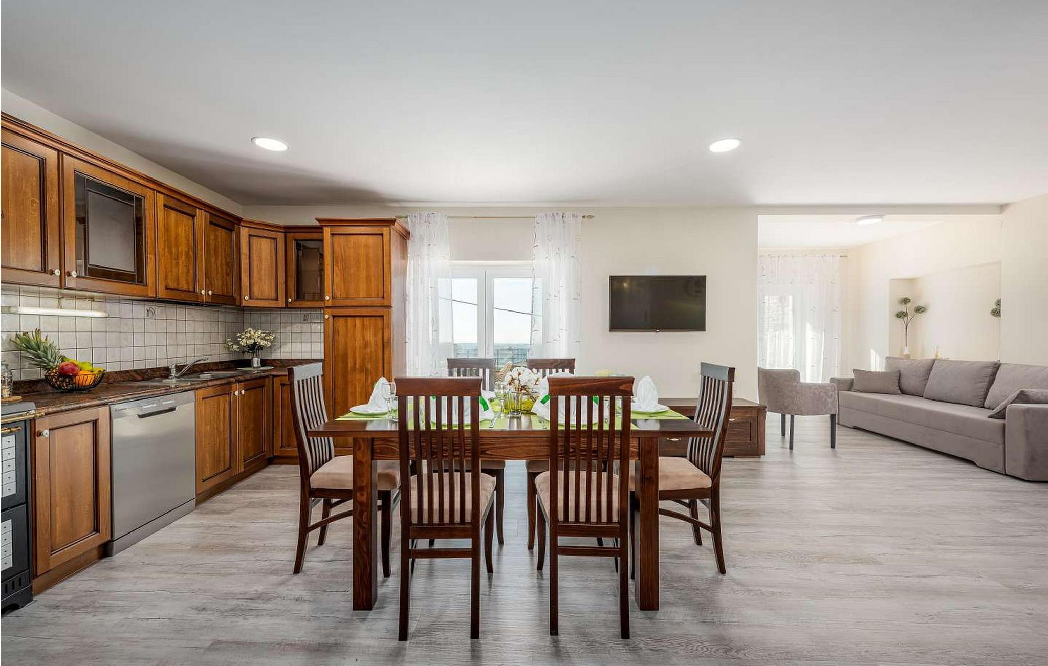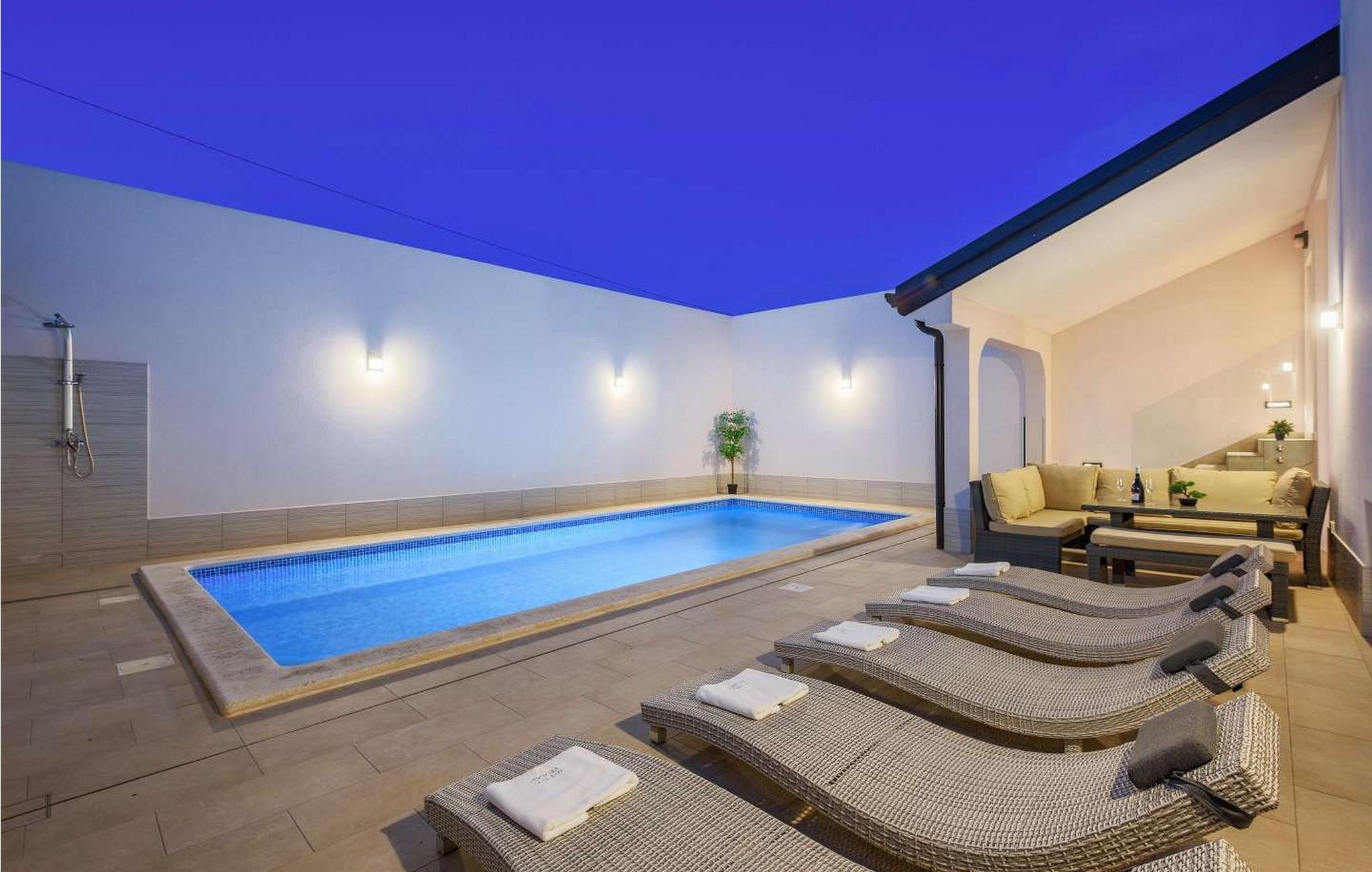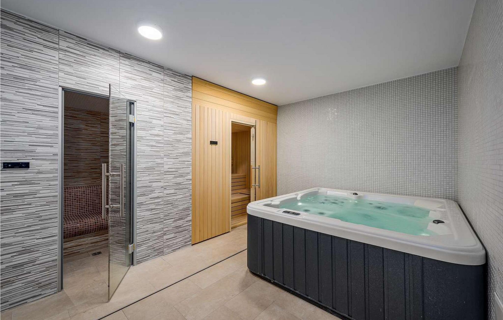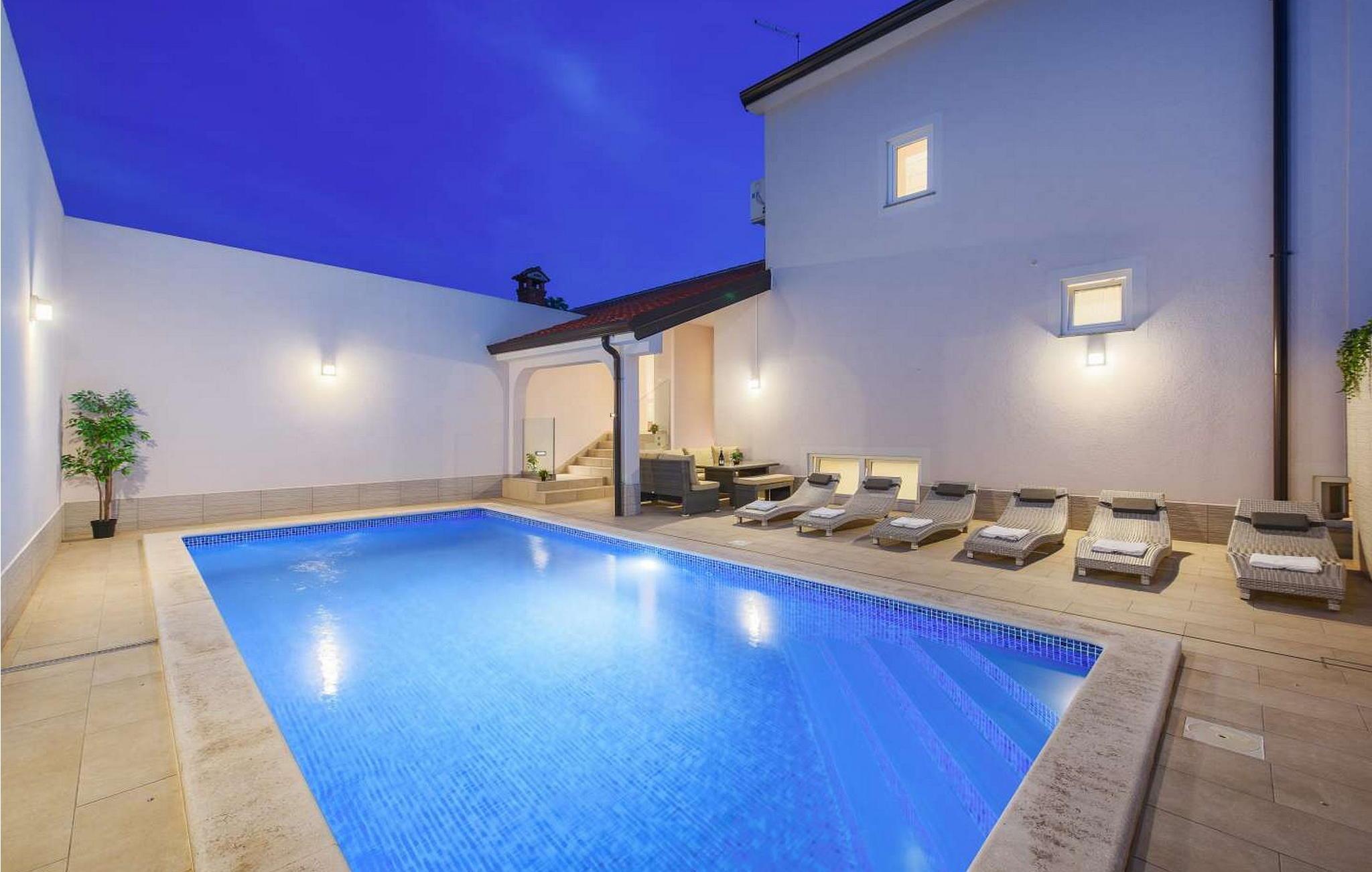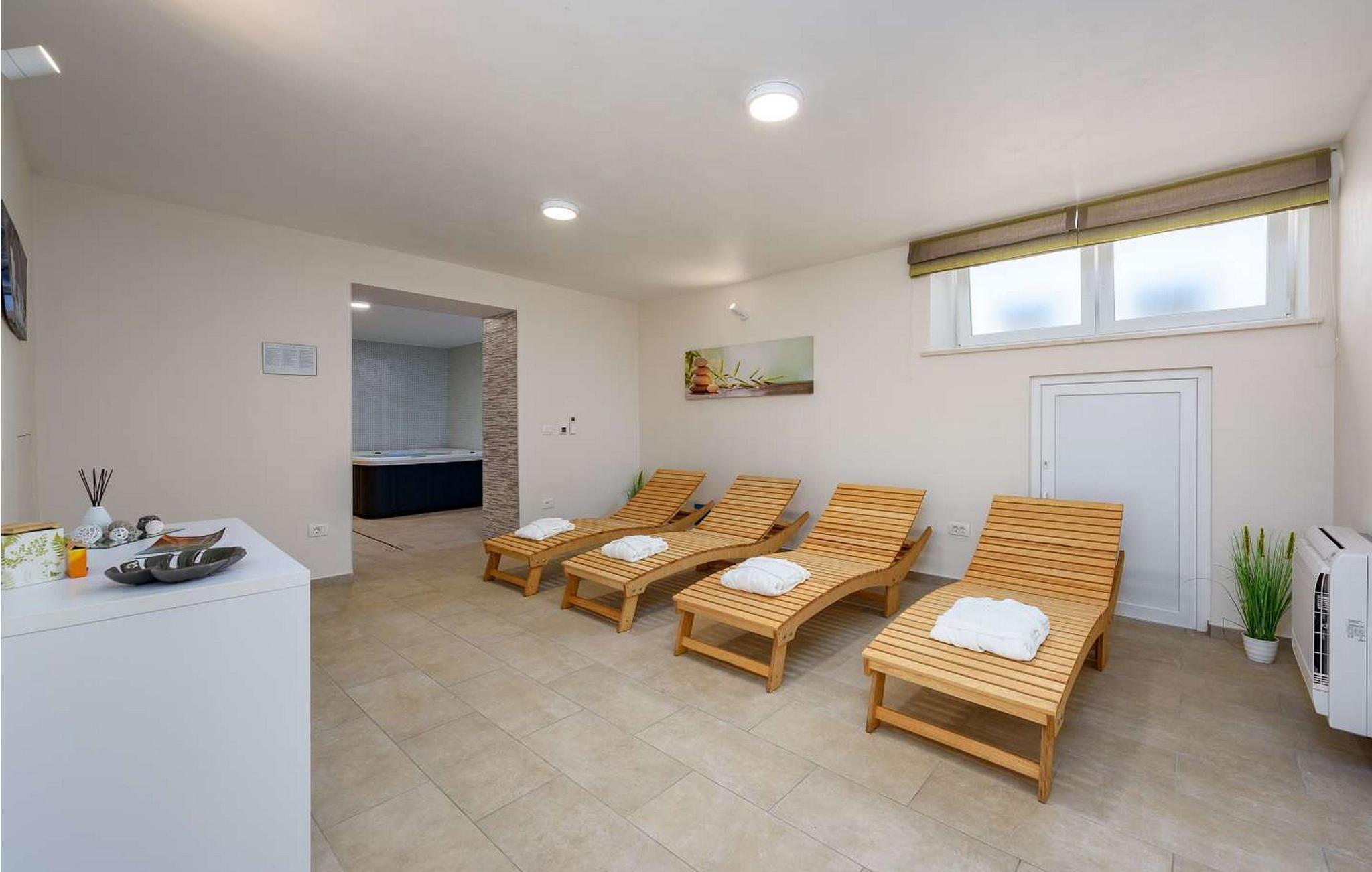 Velkommen til Villa Marija Prodan, et utsøkt feriehus for opptil 16 gjester, som tilbyr både luksuriøse velværefasiliteter og fantastisk havutsikt. Denne villaen er perfekt for store grupper som ønsker en fredelig ferie med alle hjemmets bekvemmeligheter og mer til. Skjem deg bort i villaens overdådig utstyrte velværeavdeling med boblebad, badstue, dampbad, avslapningsrom og dusj. Enten du slapper av i avslapningsrommet eller nyter det oppvarmede bassenget utenfor, er hvert øyeblikk her designet for avslapning. Den store terrassen med sitteplasser og solsenger er ideell for uteservering og for å nyte Istrias sol. Villaen har god plass til felles stunder, med en romslig spisestue og et fellesområde med bord og stoler for alle gjester, i tillegg til et fullt utstyrt kjøkken. Bare en kort spasertur fra villaen ligger en privat lekeplass med huske, sklie og en liten fotballbane med kunstgress, noe som gjør villaen til et ideelt tilfluktssted for familier. Villa Marija Prodan er gjennomtenkt utformet og tilbyr både fellesrom og private retreats. Villaen har to leiligheter og fire dobbeltrom, noe som gir komfort og privatliv for alle gjester. Kombinasjonen av moderne fasiliteter, fantastisk utsikt og rolige omgivelser gjør denne villaen til det perfekte utgangspunkt for en uforglemmelig ferie i Istria. Vær oppmerksom på at denne eiendommen ikke tar imot ungdomsgrupper eller utdrikningslag. En ungdomsgruppe på denne eiendommen består av personer under 26 år. Dersom du er en ungdomsgruppe eller et utdrikningslag, må du ikke booke dette overnattingsstedet, da bookingen din vil bli avvist etter at du har booket, noe som også kan skje ved ankomst til overnattingsstedet eller under oppholdet, og du vil ikke få refusjon.