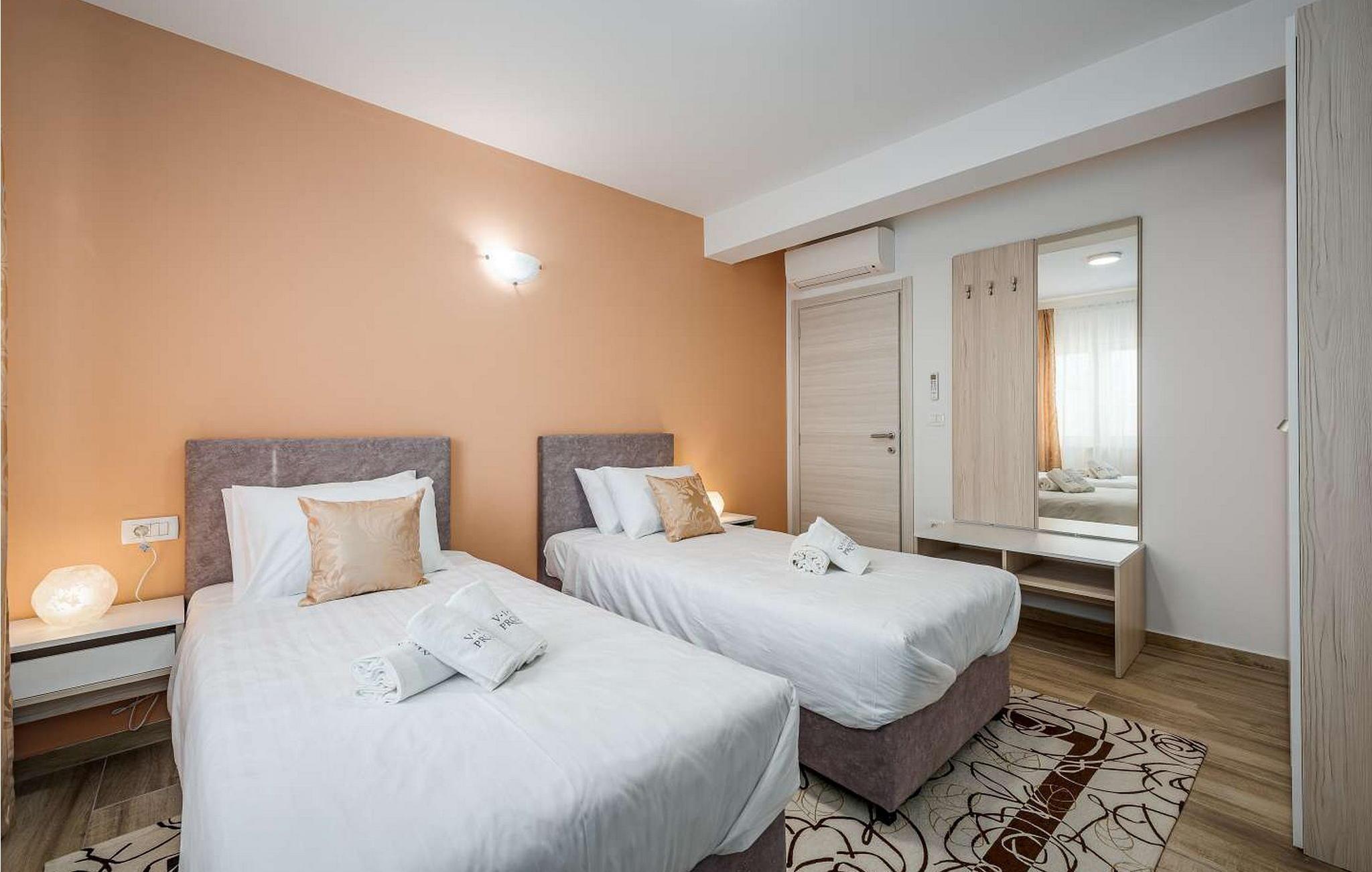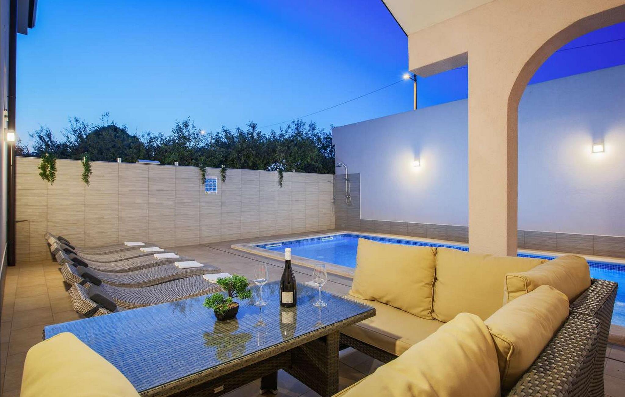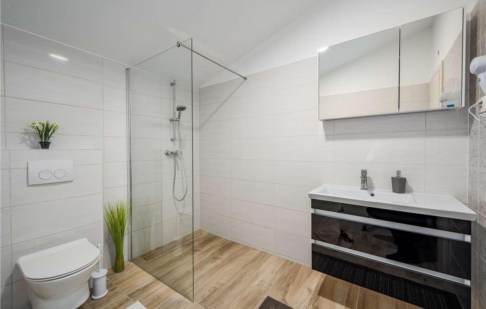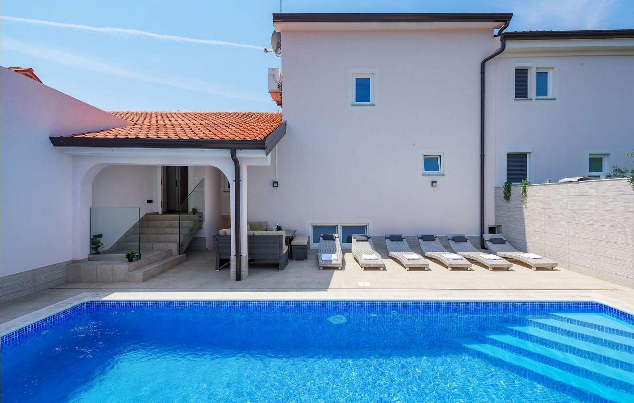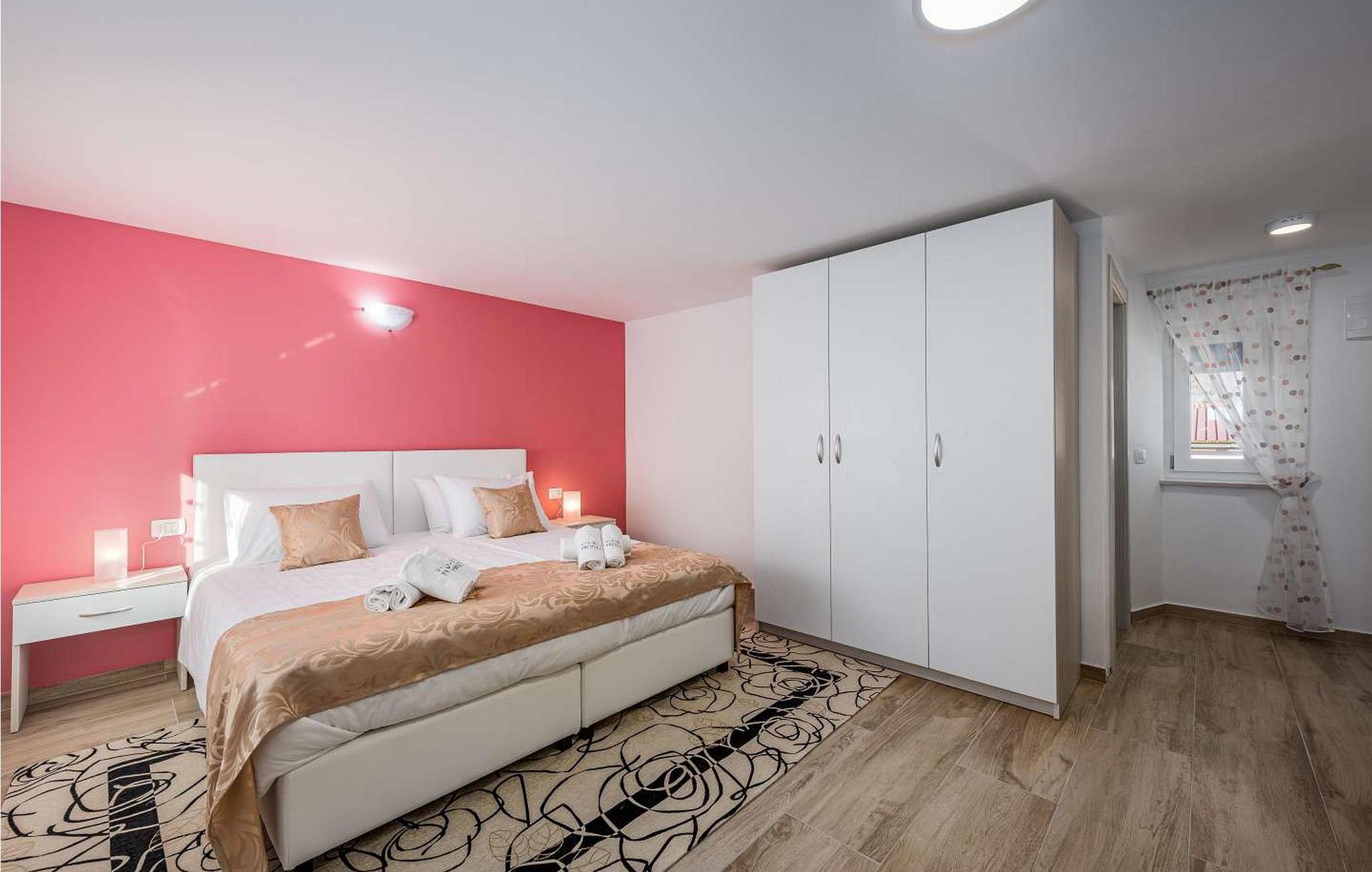 Velkommen til Villa Marija Prodan, et utsøkt feriehus for opptil 16 gjester, som tilbyr både luksuriøse velværefasiliteter og fantastisk havutsikt. Denne villaen er perfekt for store grupper som ønsker en fredelig ferie med alle hjemmets bekvemmeligheter og mer til. Skjem deg bort i villaens overdådig utstyrte velværeavdeling med boblebad, badstue, dampbad, avslapningsrom og dusj. Enten du slapper av i avslapningsrommet eller nyter det oppvarmede bassenget utenfor, er hvert øyeblikk her designet for avslapning. Den store terrassen med sitteplasser og solsenger er ideell for uteservering og for å nyte Istrias sol. Villaen har god plass til felles stunder, med en romslig spisestue og et fellesområde med bord og stoler for alle gjester, i tillegg til et fullt utstyrt kjøkken. Bare en kort spasertur fra villaen ligger en privat lekeplass med huske, sklie og en liten fotballbane med kunstgress, noe som gjør villaen til et ideelt tilfluktssted for familier. Villa Marija Prodan er gjennomtenkt utformet og tilbyr både fellesrom og private retreats. Villaen har to leiligheter og fire dobbeltrom, noe som gir komfort og privatliv for alle gjester. Kombinasjonen av moderne fasiliteter, fantastisk utsikt og rolige omgivelser gjør denne villaen til det perfekte utgangspunkt for en uforglemmelig ferie i Istria. Vær oppmerksom på at denne eiendommen ikke tar imot ungdomsgrupper eller utdrikningslag. En ungdomsgruppe på denne eiendommen består av personer under 26 år. Dersom du er en ungdomsgruppe eller et utdrikningslag, må du ikke booke dette overnattingsstedet, da bookingen din vil bli avvist etter at du har booket, noe som også kan skje ved ankomst til overnattingsstedet eller under oppholdet, og du vil ikke få refusjon.