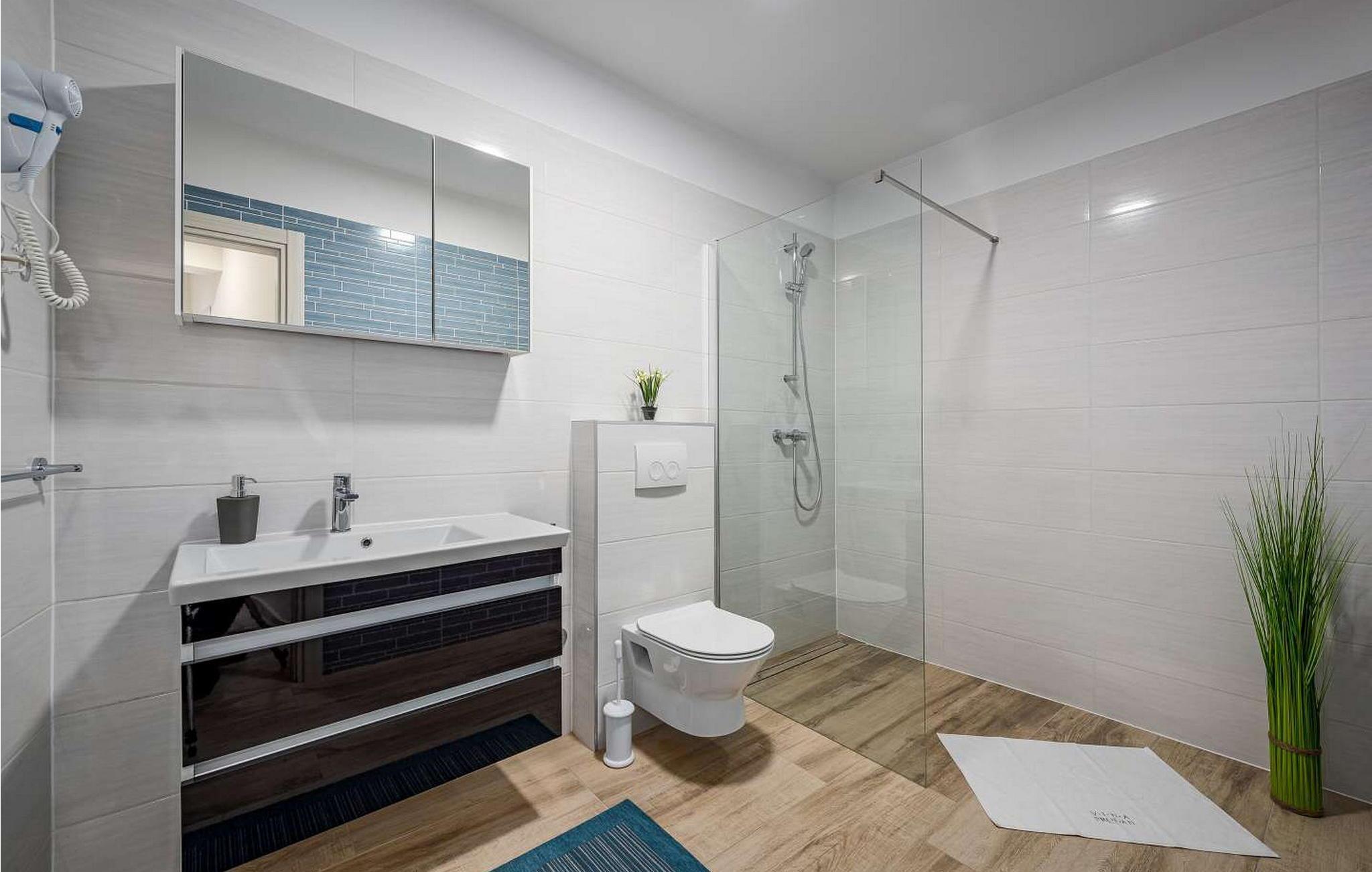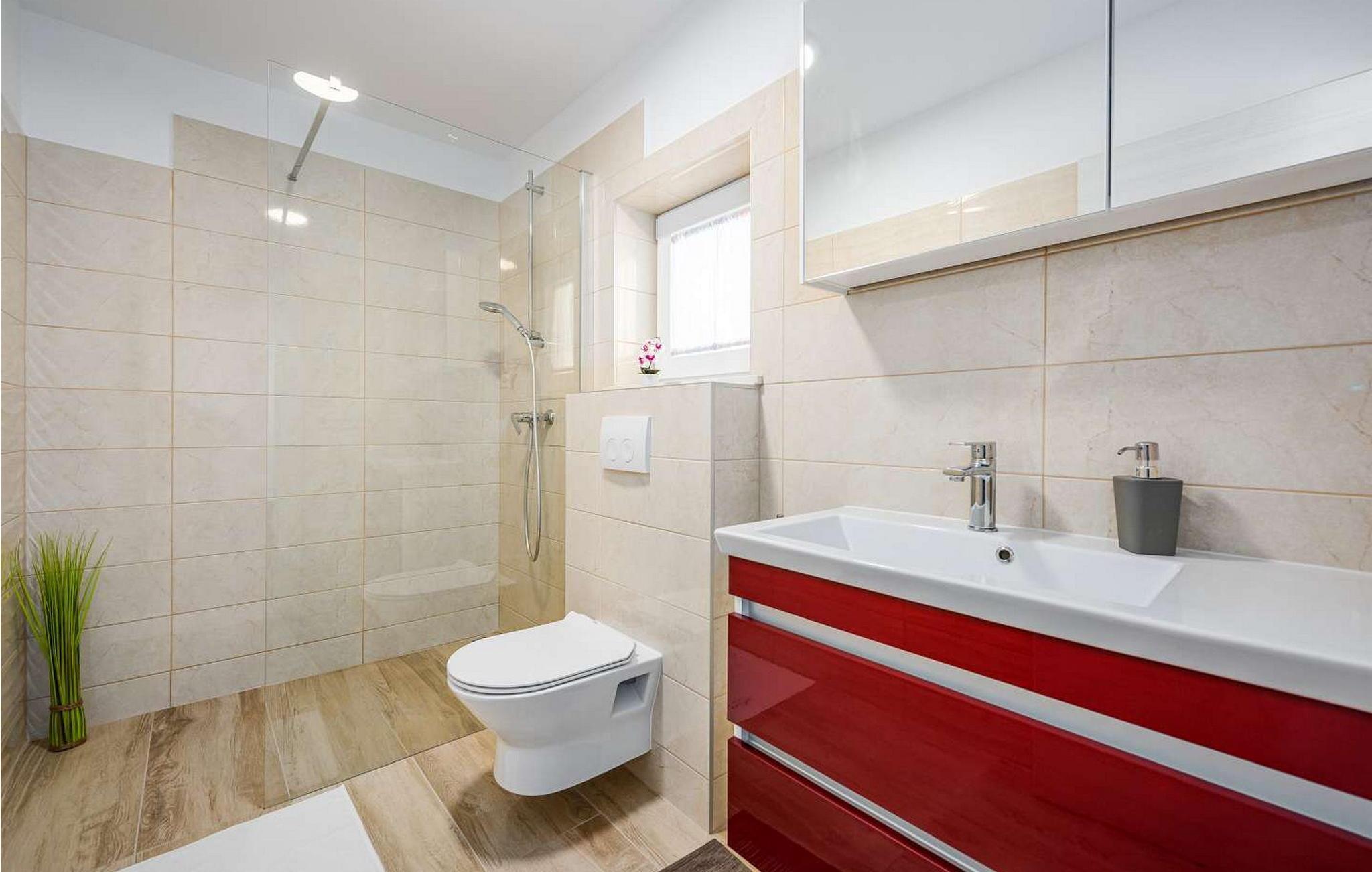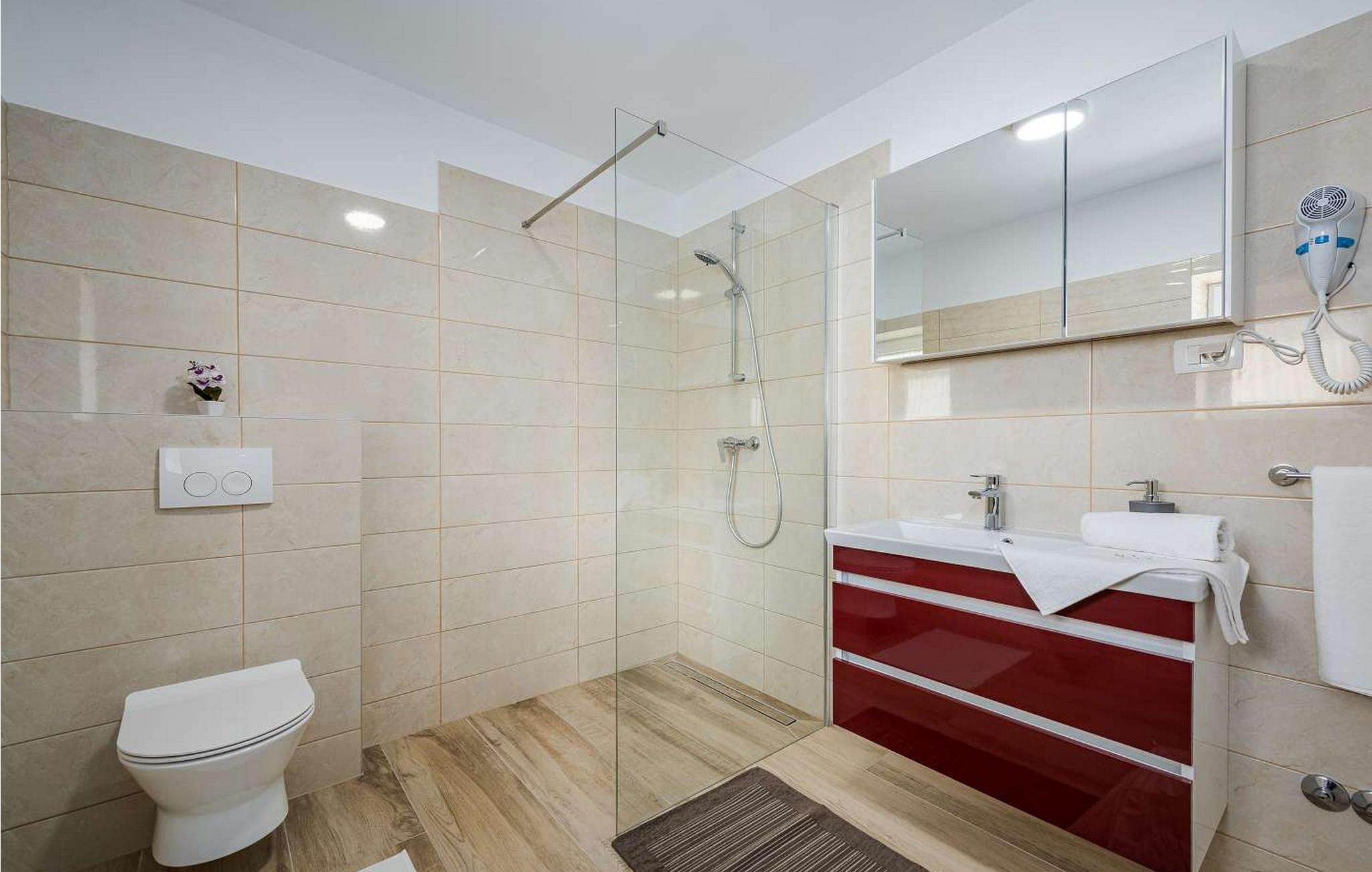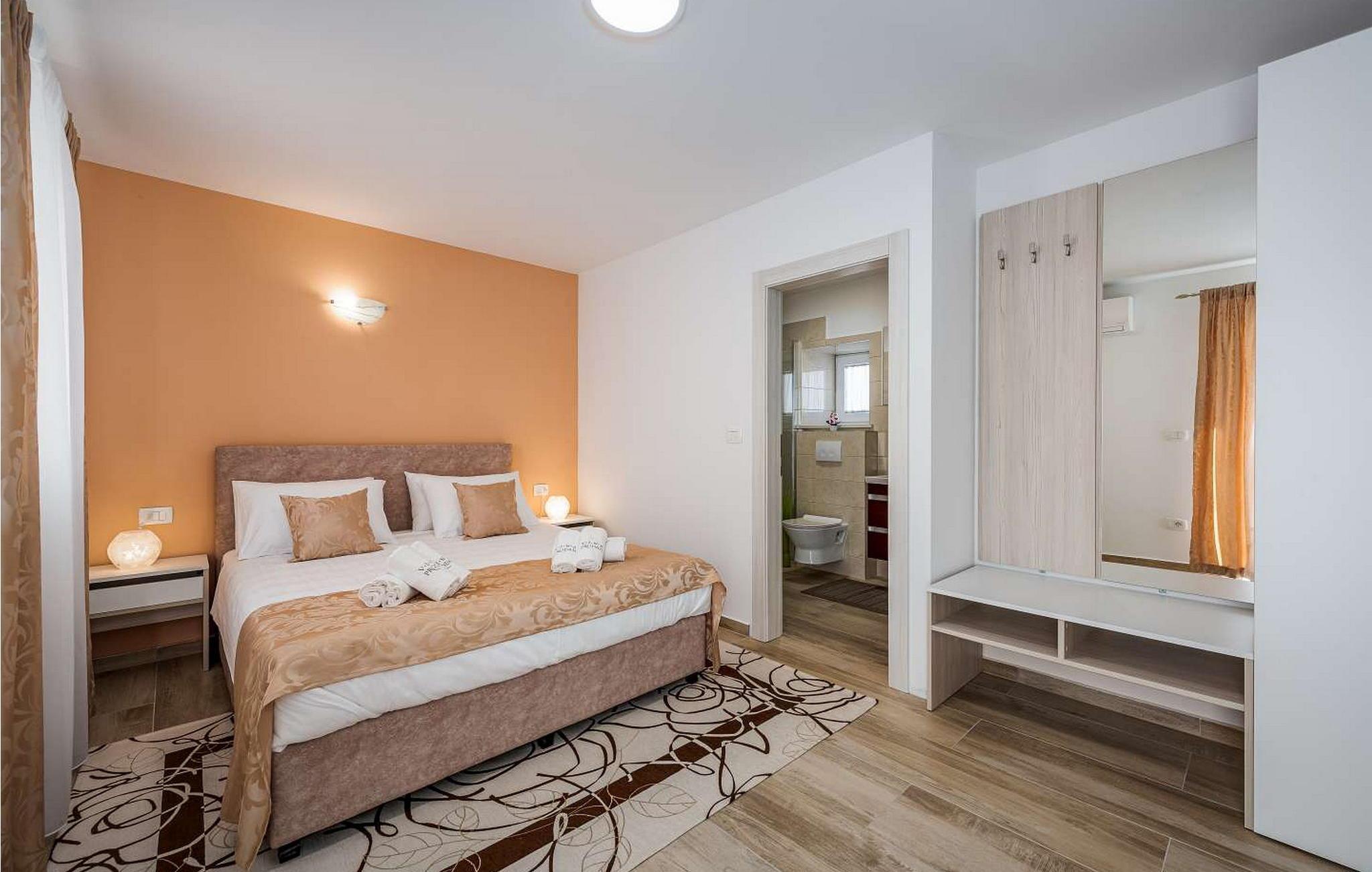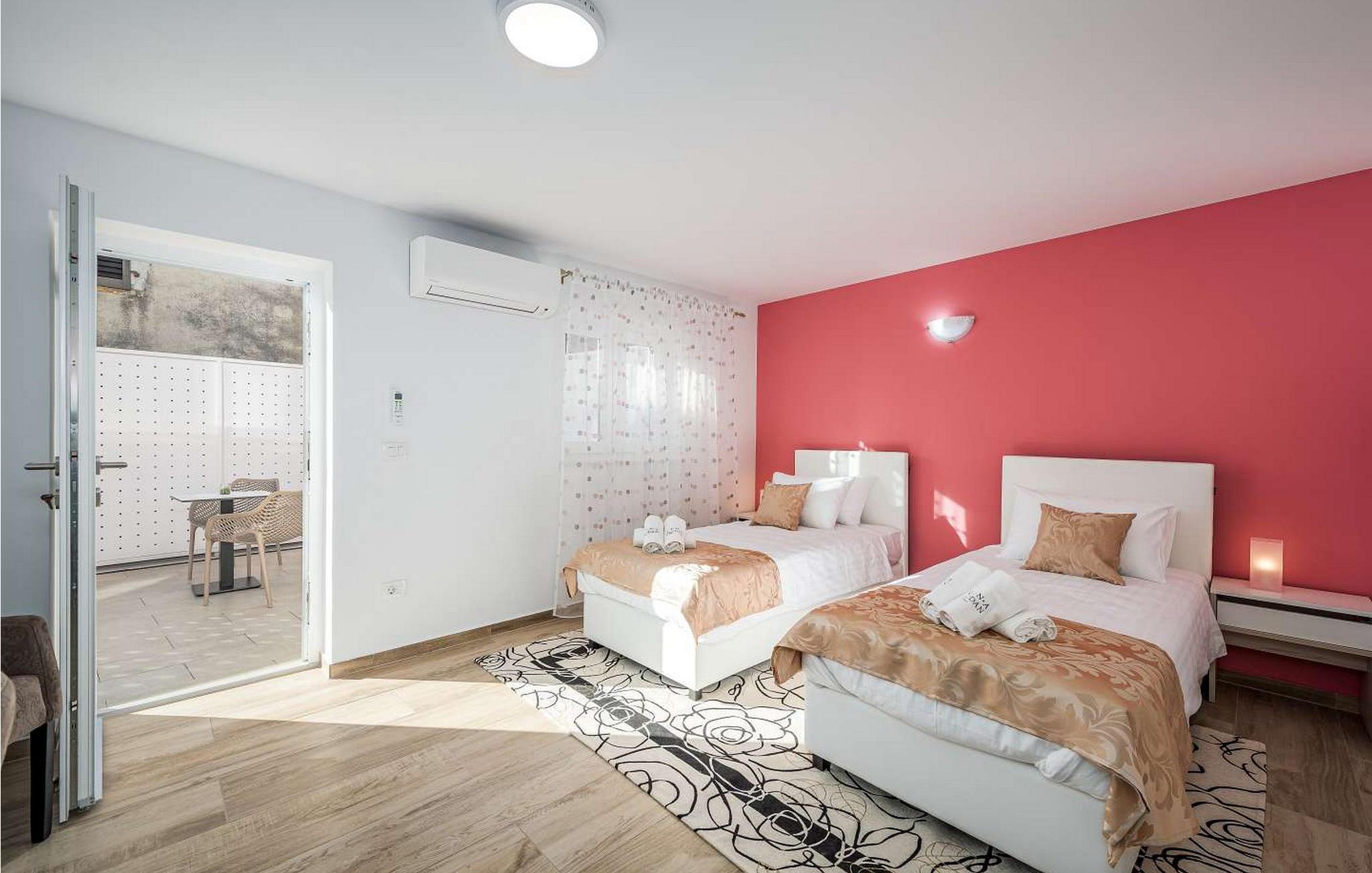 Velkommen til Villa Marija Prodan, et utsøkt feriehus for opptil 16 gjester, som tilbyr både luksuriøse velværefasiliteter og fantastisk havutsikt. Denne villaen er perfekt for store grupper som ønsker en fredelig ferie med alle hjemmets bekvemmeligheter og mer til. Skjem deg bort i villaens overdådig utstyrte velværeavdeling med boblebad, badstue, dampbad, avslapningsrom og dusj. Enten du slapper av i avslapningsrommet eller nyter det oppvarmede bassenget utenfor, er hvert øyeblikk her designet for avslapning. Den store terrassen med sitteplasser og solsenger er ideell for uteservering og for å nyte Istrias sol. Villaen har god plass til felles stunder, med en romslig spisestue og et fellesområde med bord og stoler for alle gjester, i tillegg til et fullt utstyrt kjøkken. Bare en kort spasertur fra villaen ligger en privat lekeplass med huske, sklie og en liten fotballbane med kunstgress, noe som gjør villaen til et ideelt tilfluktssted for familier. Villa Marija Prodan er gjennomtenkt utformet og tilbyr både fellesrom og private retreats. Villaen har to leiligheter og fire dobbeltrom, noe som gir komfort og privatliv for alle gjester. Kombinasjonen av moderne fasiliteter, fantastisk utsikt og rolige omgivelser gjør denne villaen til det perfekte utgangspunkt for en uforglemmelig ferie i Istria. Vær oppmerksom på at denne eiendommen ikke tar imot ungdomsgrupper eller utdrikningslag. En ungdomsgruppe på denne eiendommen består av personer under 26 år. Dersom du er en ungdomsgruppe eller et utdrikningslag, må du ikke booke dette overnattingsstedet, da bookingen din vil bli avvist etter at du har booket, noe som også kan skje ved ankomst til overnattingsstedet eller under oppholdet, og du vil ikke få refusjon.