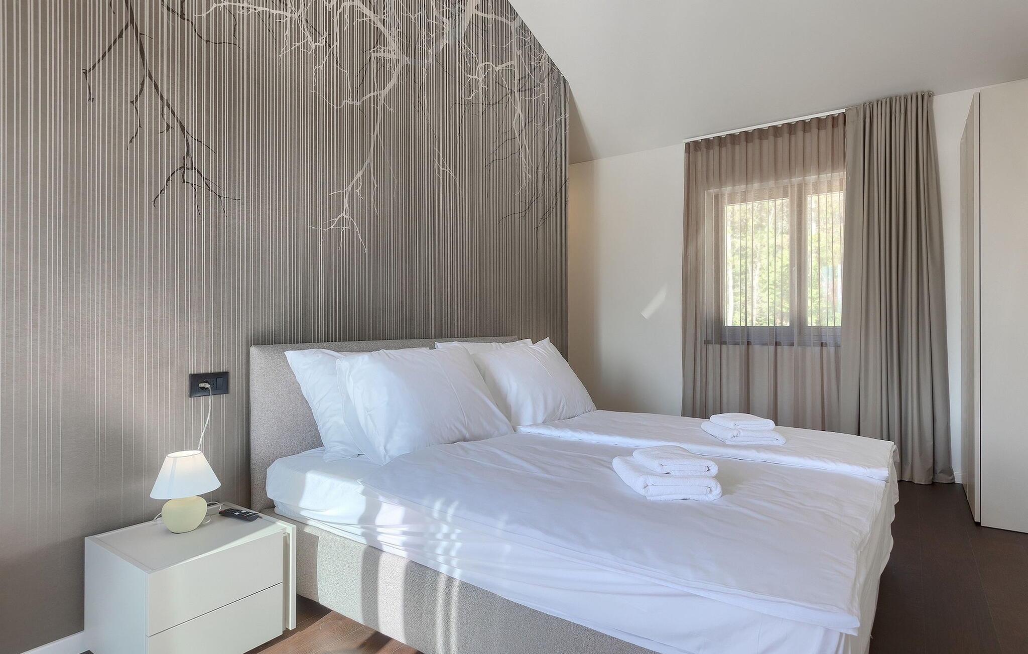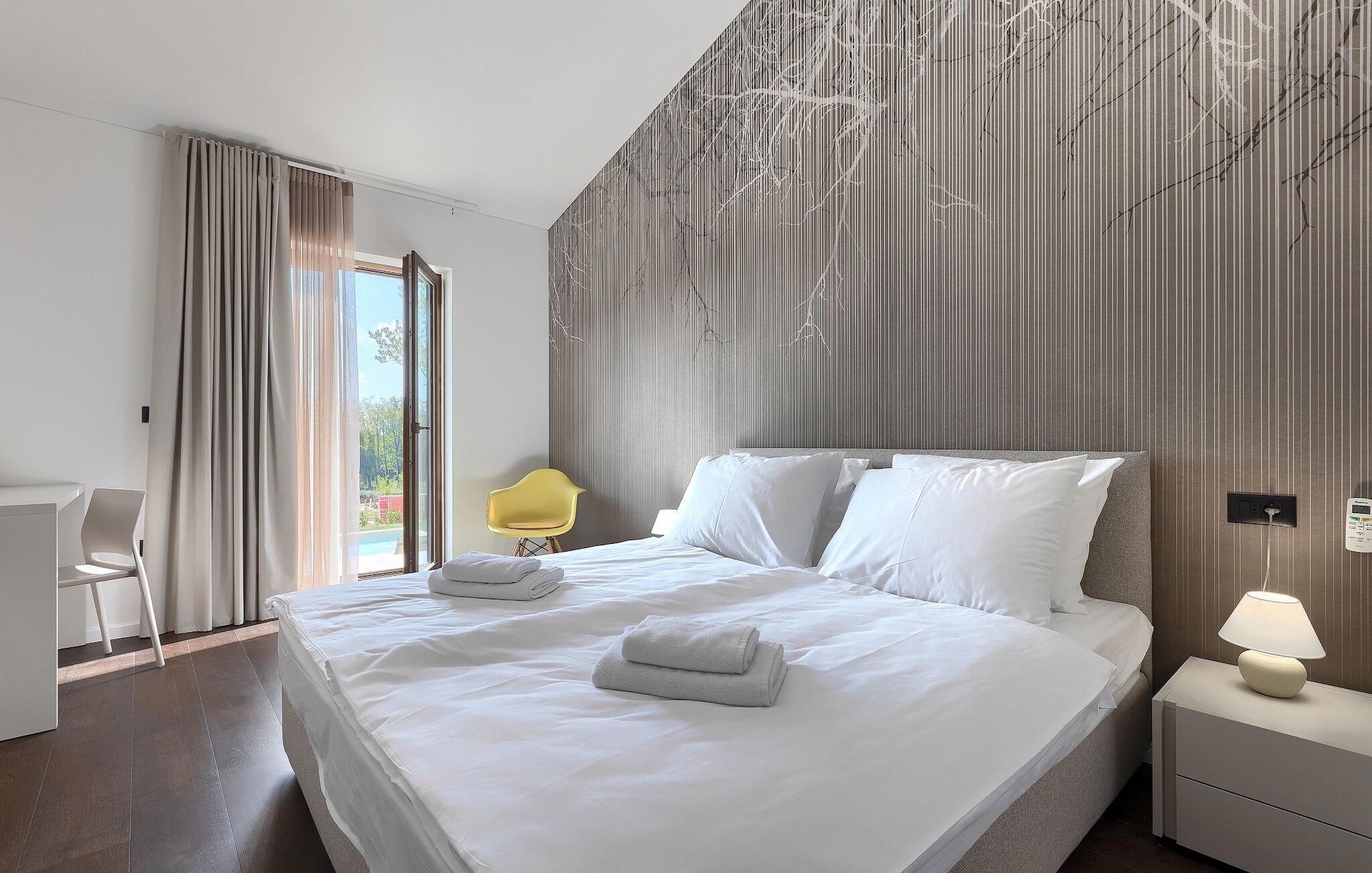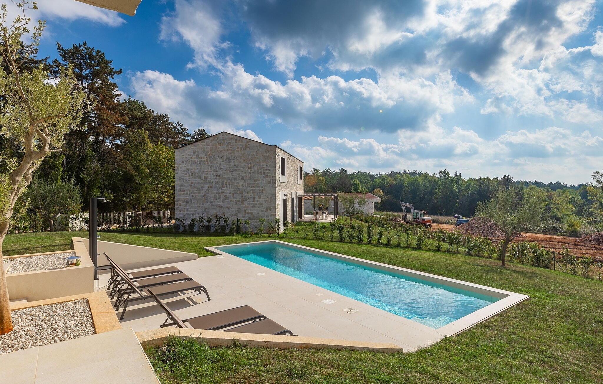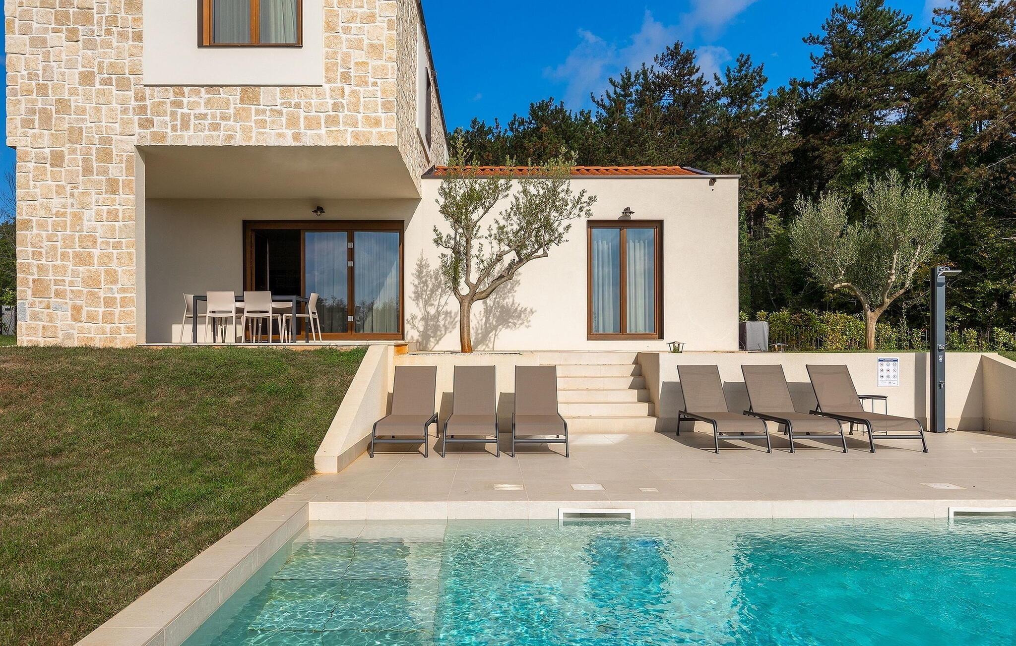 Tilbring en uforglemmelig sommer med familie og venner i denne drømmevillaen. Det forfriskende svømmebassenget på 35 m2 vil være midtpunktet på varme sommerdager. Svøm noen runder eller nyt solen på en av de komfortable solsengene mens du nyter din kjølige favorittdrink. På den overbygde terrassen kan du samles rundt spisebordet sammen med dine nærmeste og planlegge utflukter i regionen. Her kan du smake på lokale spesialiteter tilberedt på kullgrillen med utsikt over det fantastiske landskapet som magiske Istria legger for dine føtter.