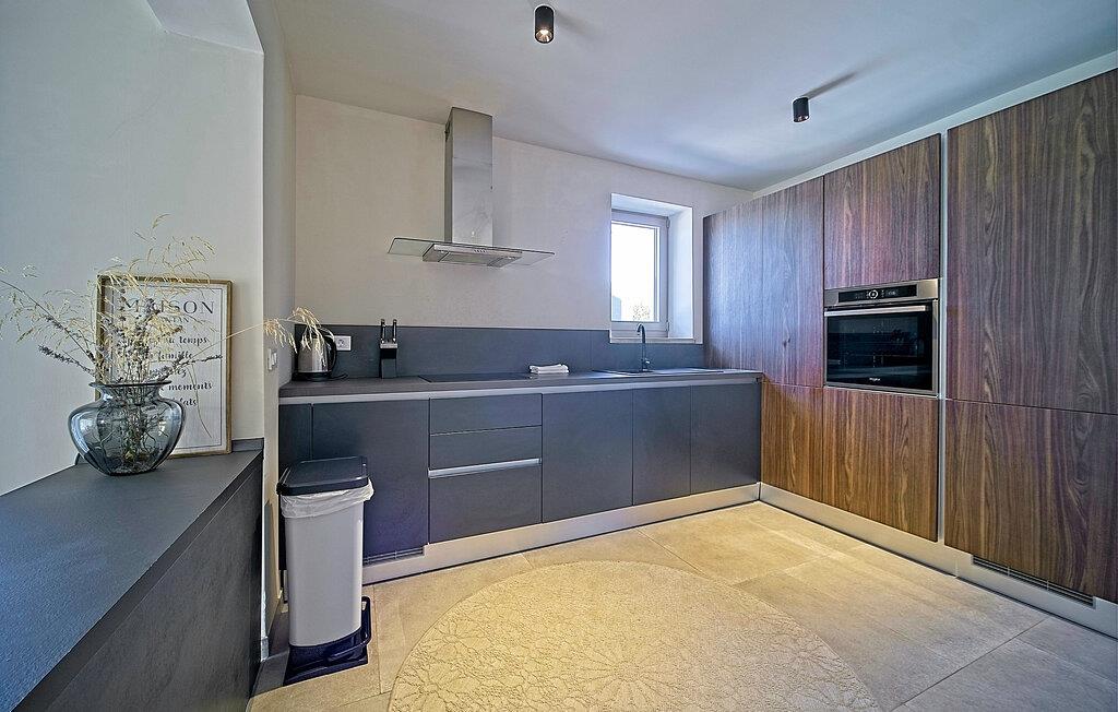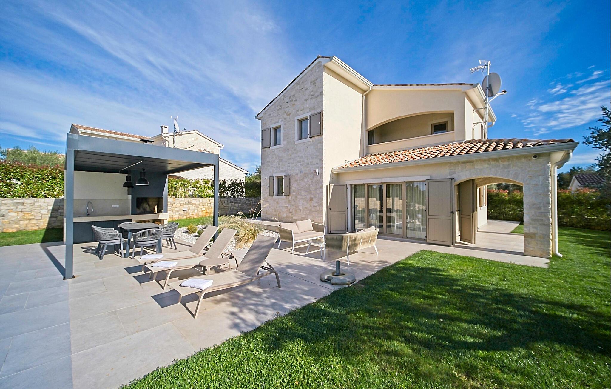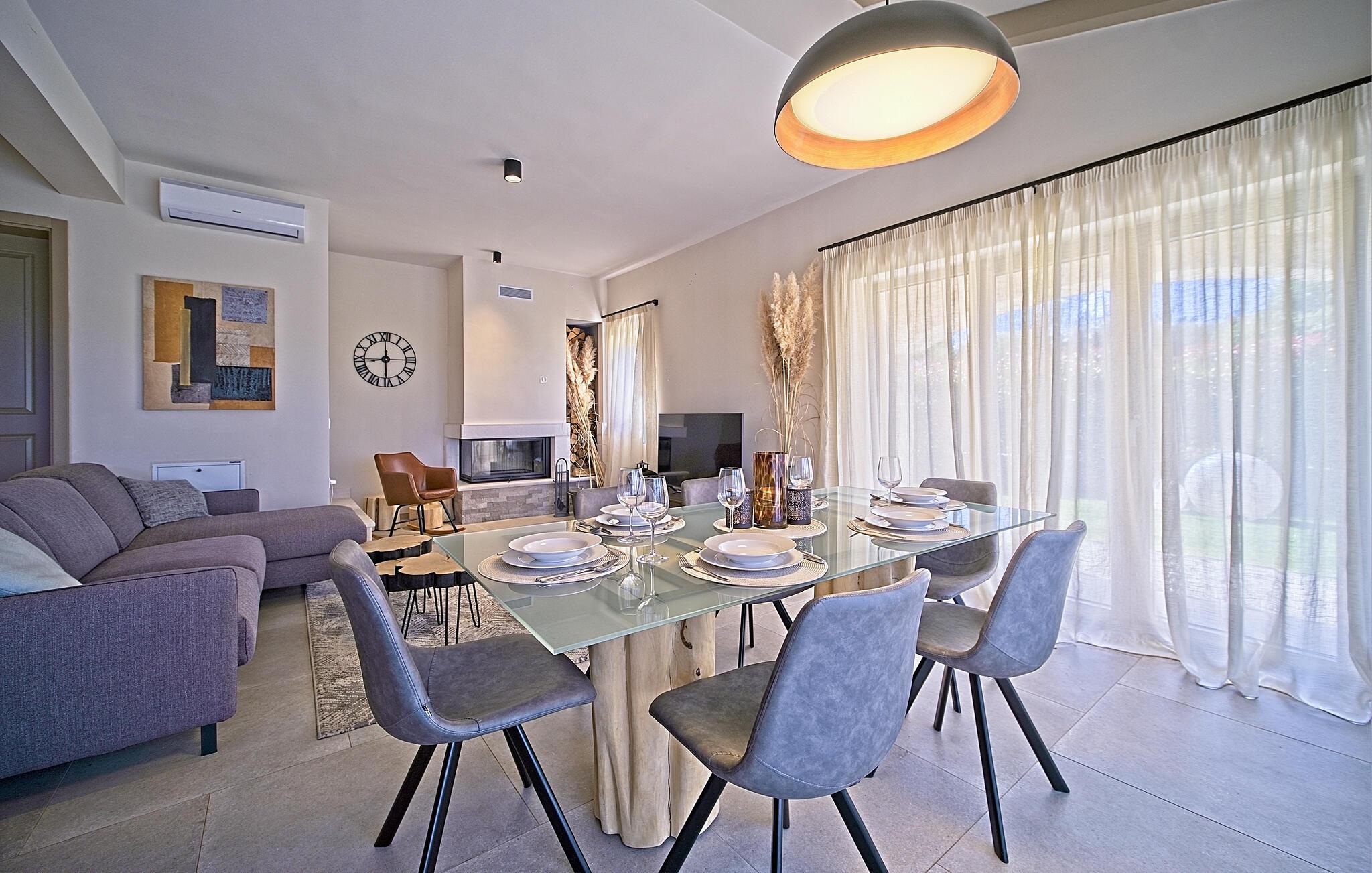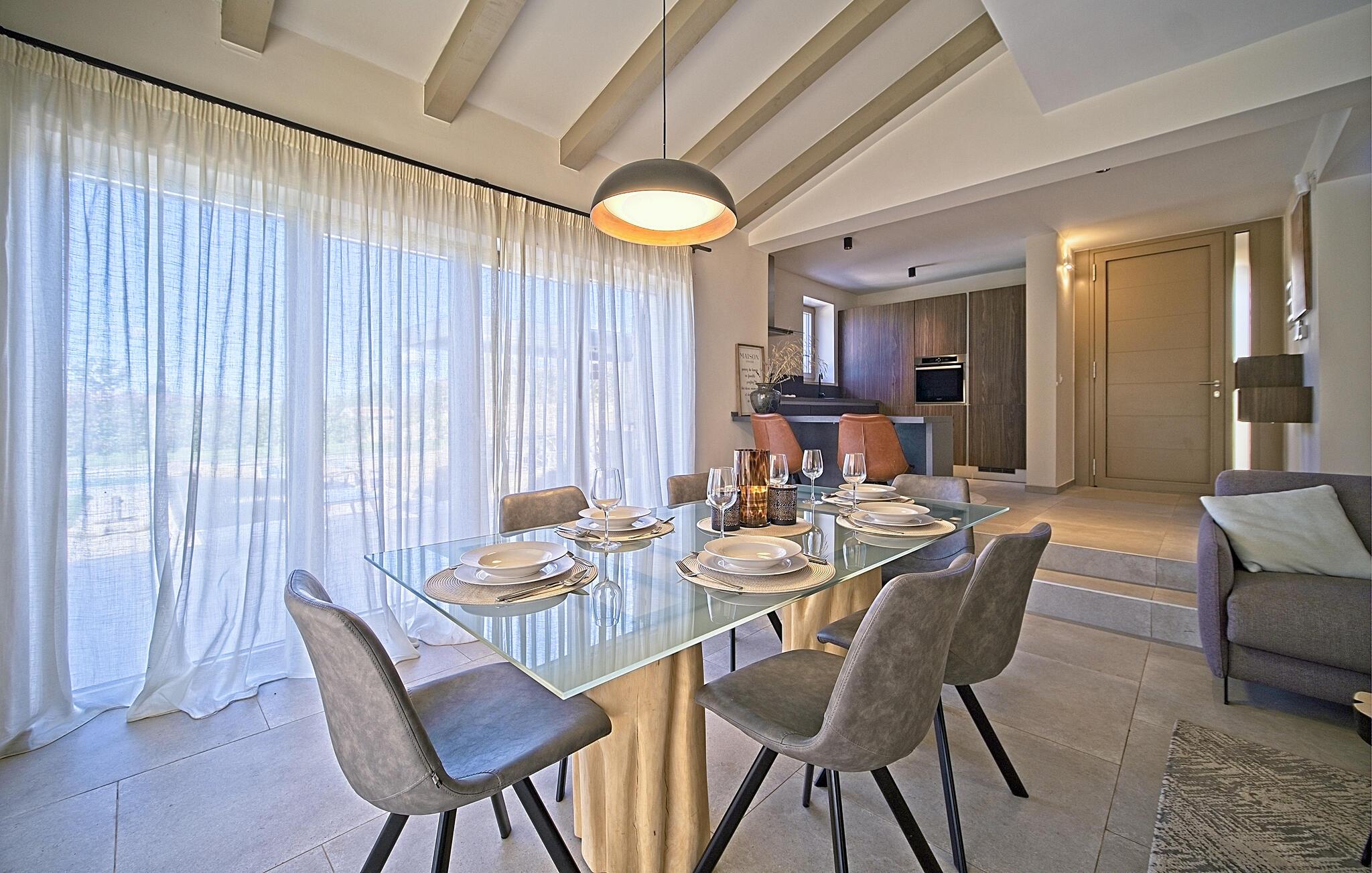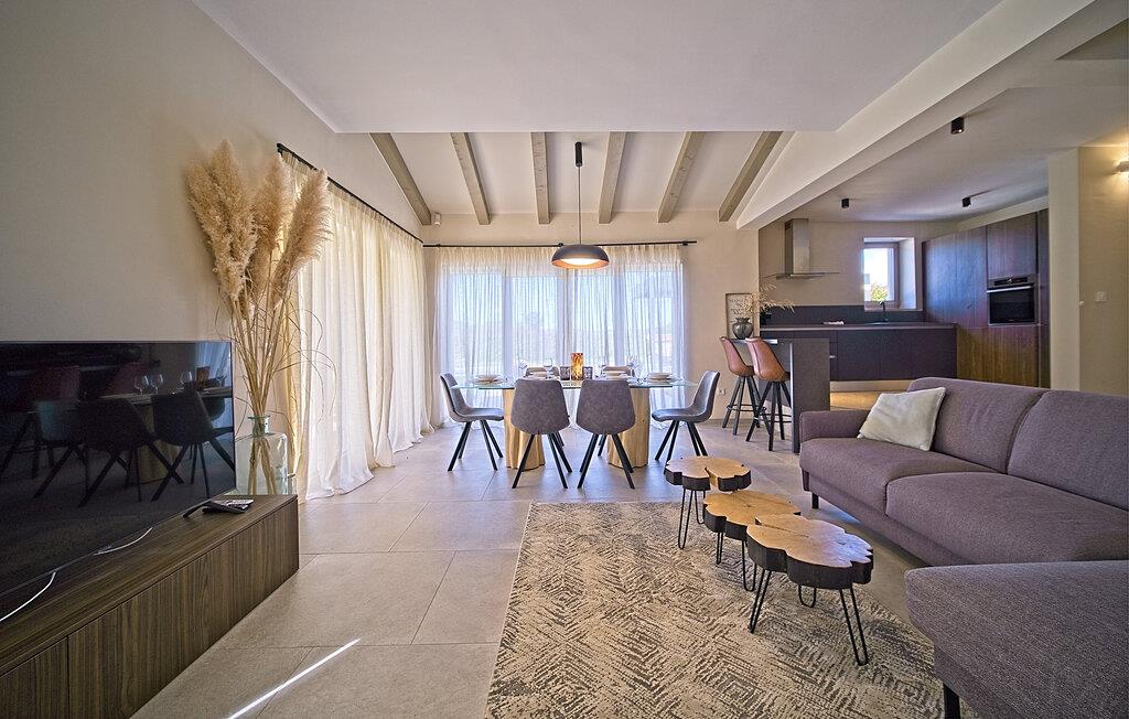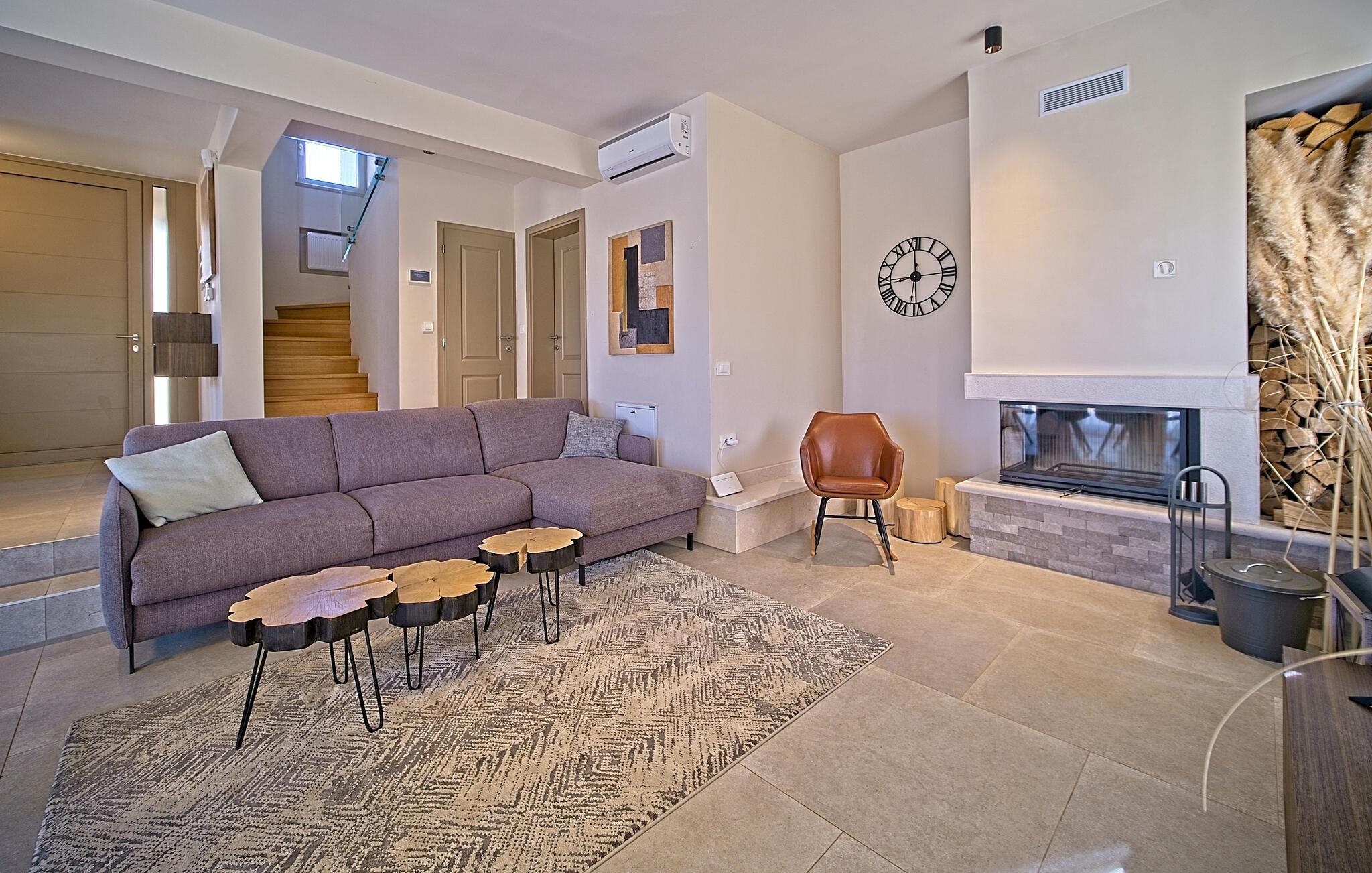 Dette vennlige huset imponerer med sin tidløse eleganse og behagelige komfort. Vinduer fra gulv til tak slipper inn rikelig med naturlig lys, mens en stor sofagruppe innbyr til avslapping og velvære. Her kan du lytte til favorittmusikken din eller streame favorittseriene dine. Du kan tilberede deilige måltider på det moderne kjøkkenet og servere dem med et glass kroatisk vin.