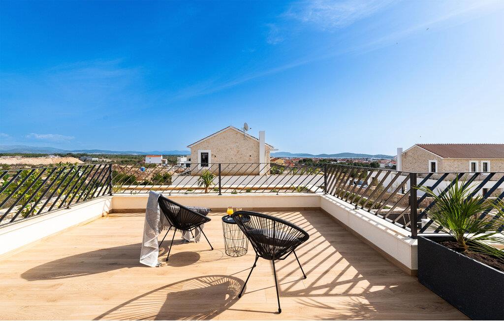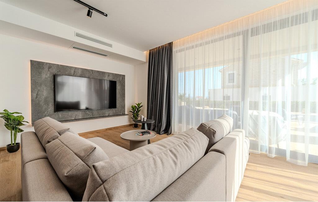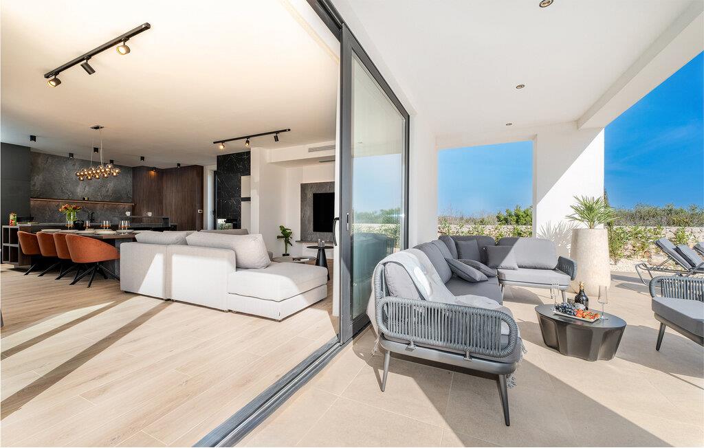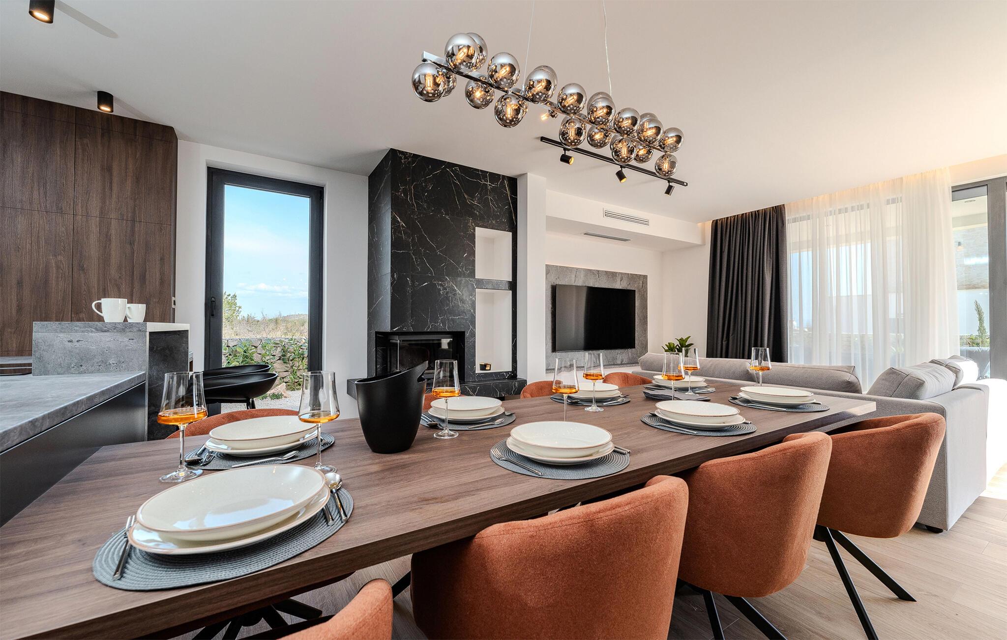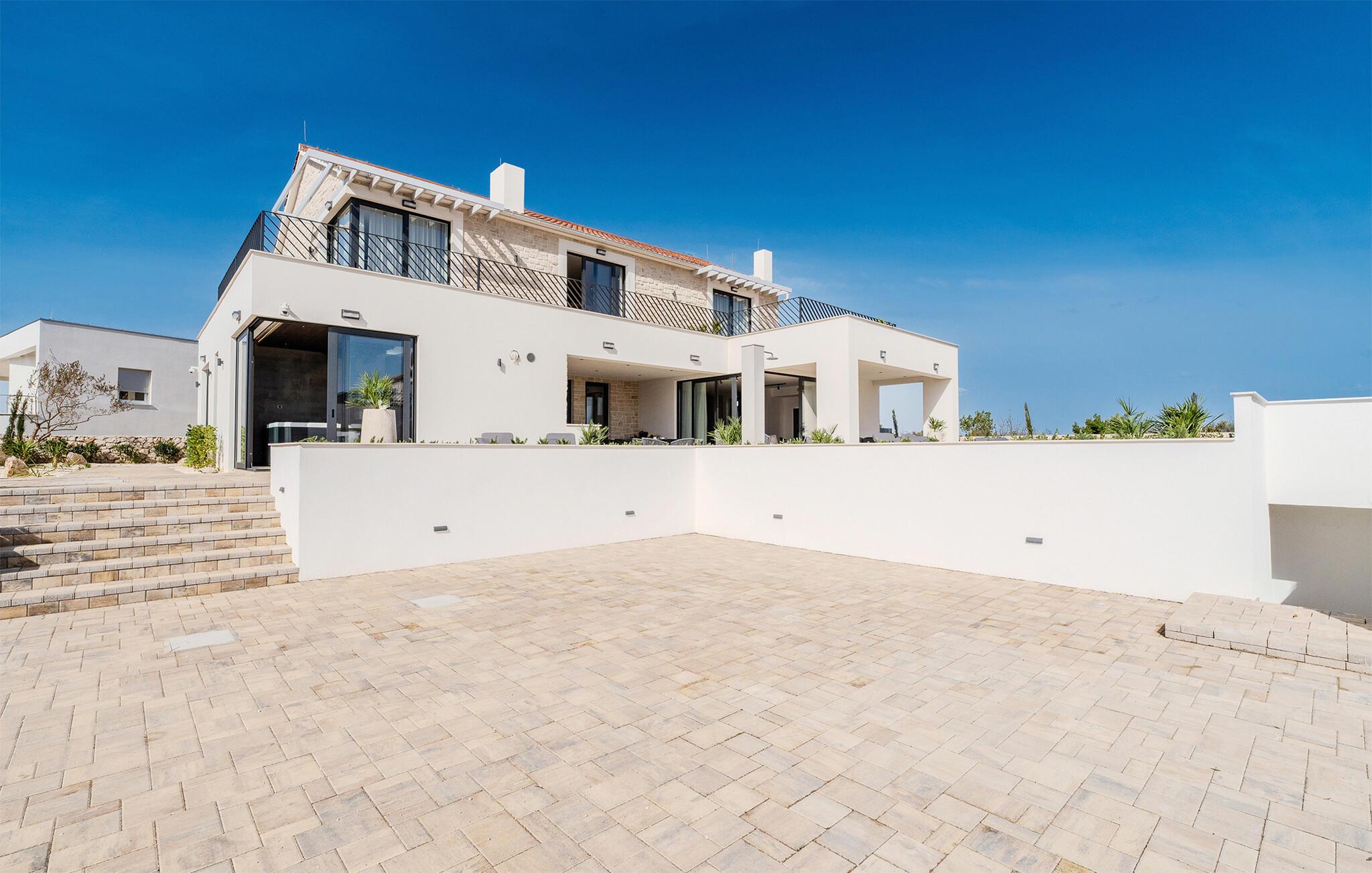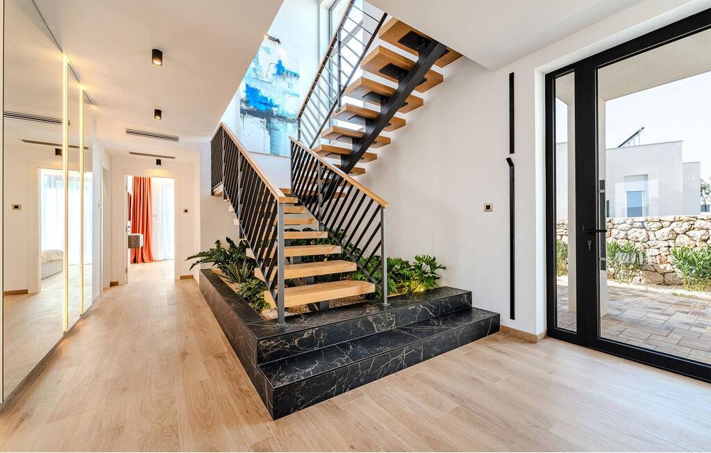 Start dagen i det luksuriøse feriehuset med en kopp kaffe på den romslige terrassen. I oppholdsrommet er det også god plass til å slappe av og hygge seg over måltider eller morsomme brettspill. Slå dere ned ved det elegante spisebordet eller legg føttene opp i sofakroken og se en spennende film. Utenfor byr huset på en rekke muligheter for å nyte feriefritiden. Sett deg på den øvre terrassen og la blikket vandre. Du kan se det glitrende Adriaterhavet i horisonten og glede deg til en herlig badedag med hele familien. Du kan også bruke det overbygde utekjøkkenet til å trylle frem kulinariske spesialiteter og servere dem ved det lange spisebordet. Bassenget byr på forfriskende øyeblikk og moro for store og små. Det er også mange muligheter for utendørs sportsaktiviteter.