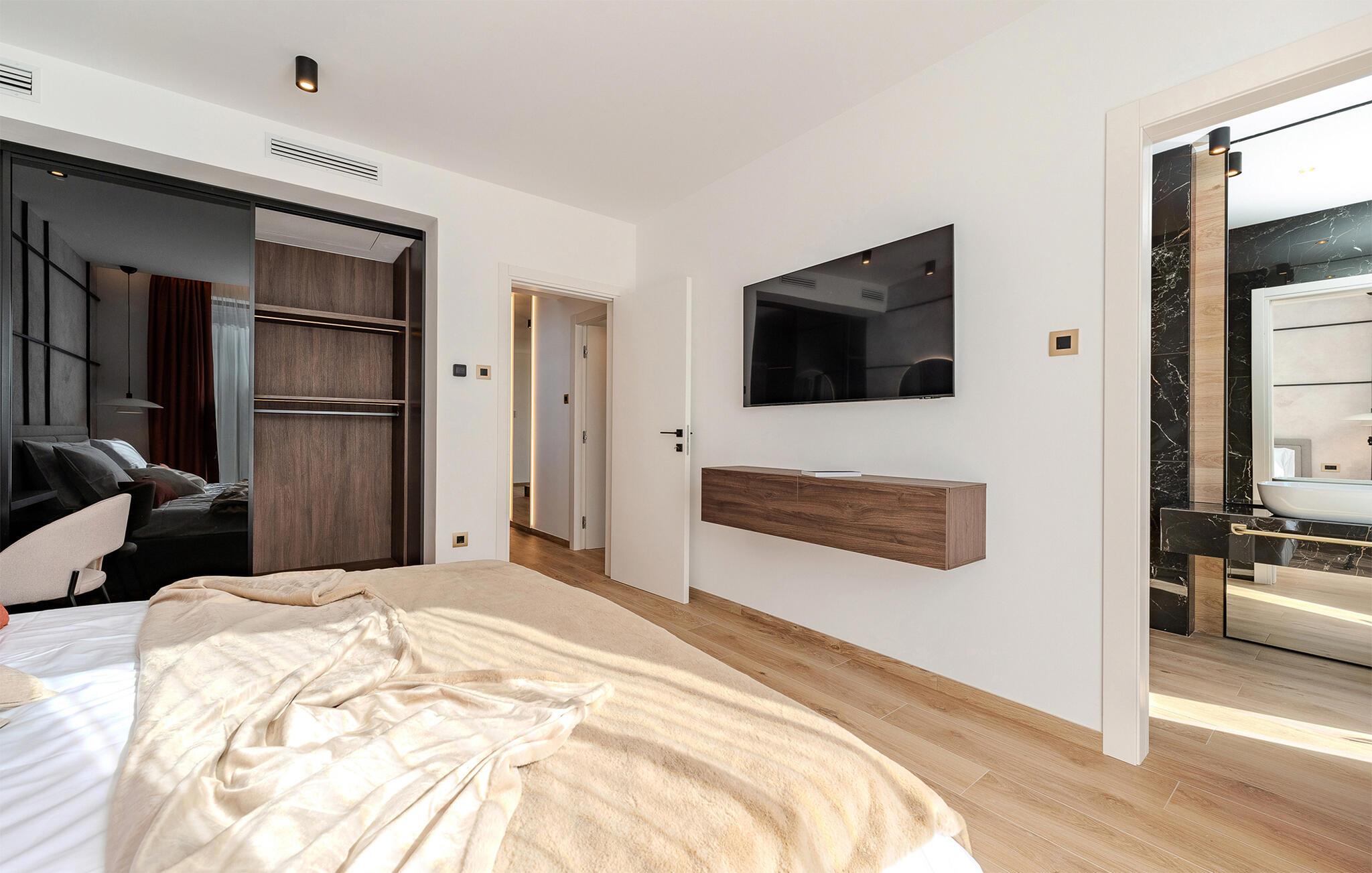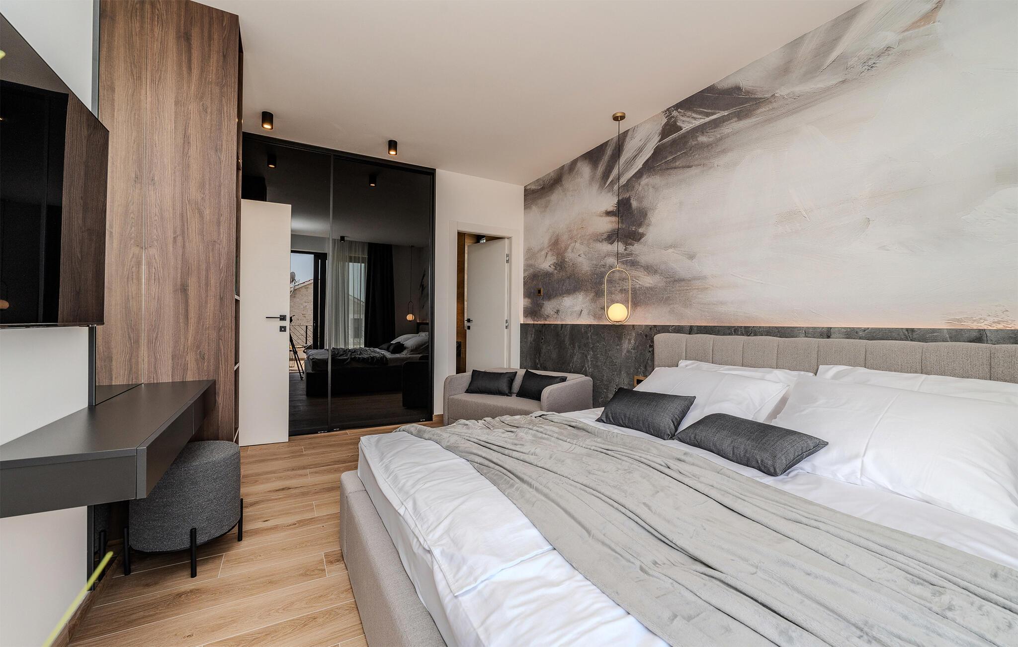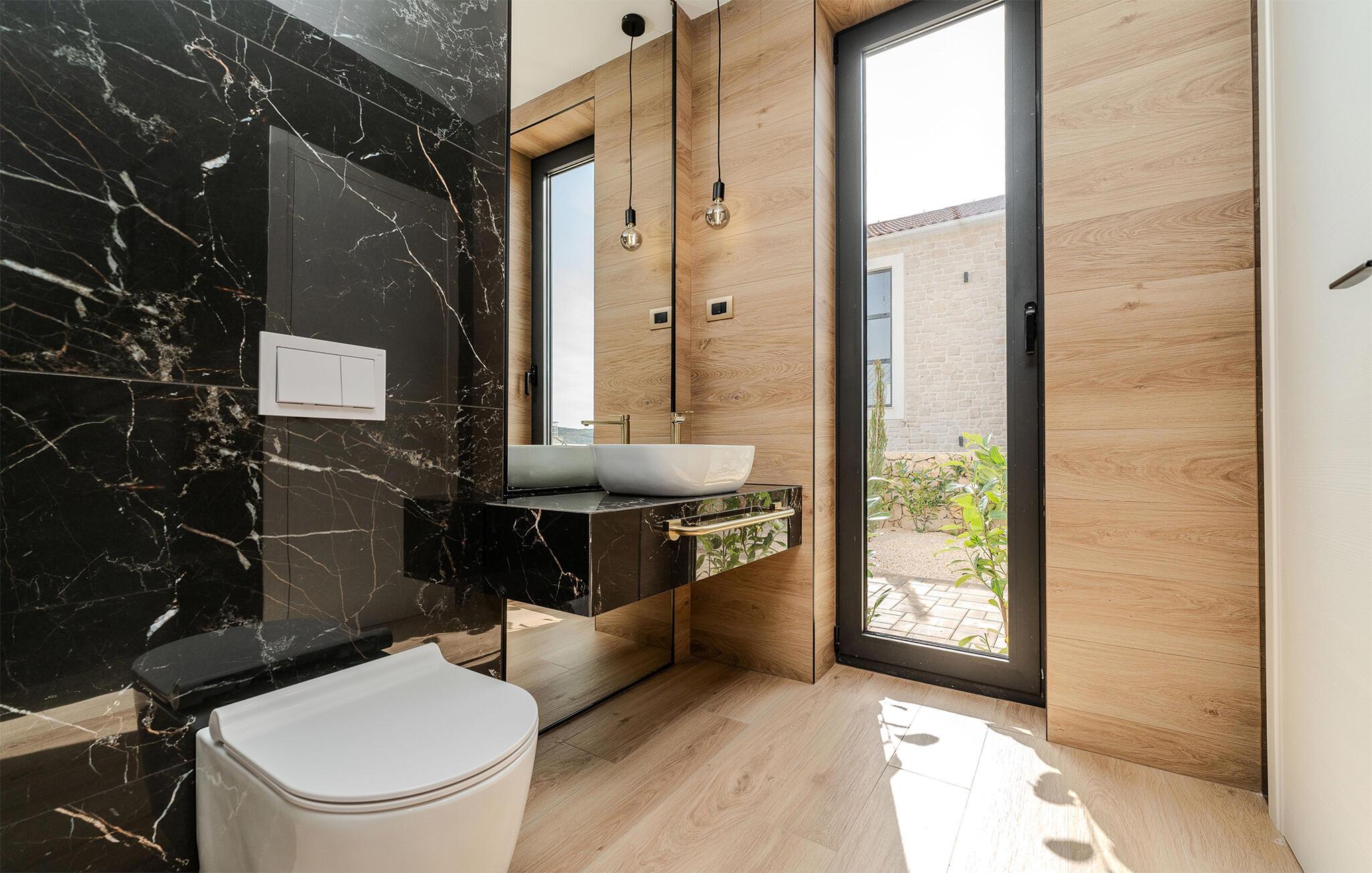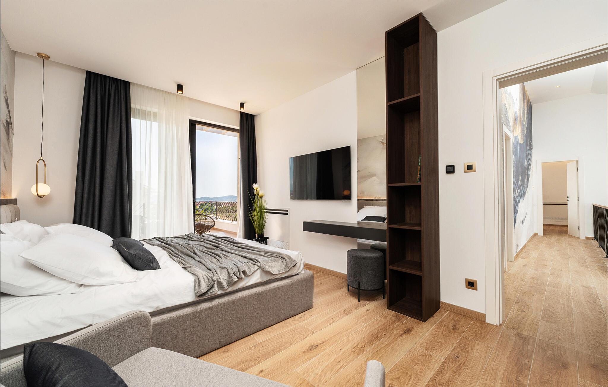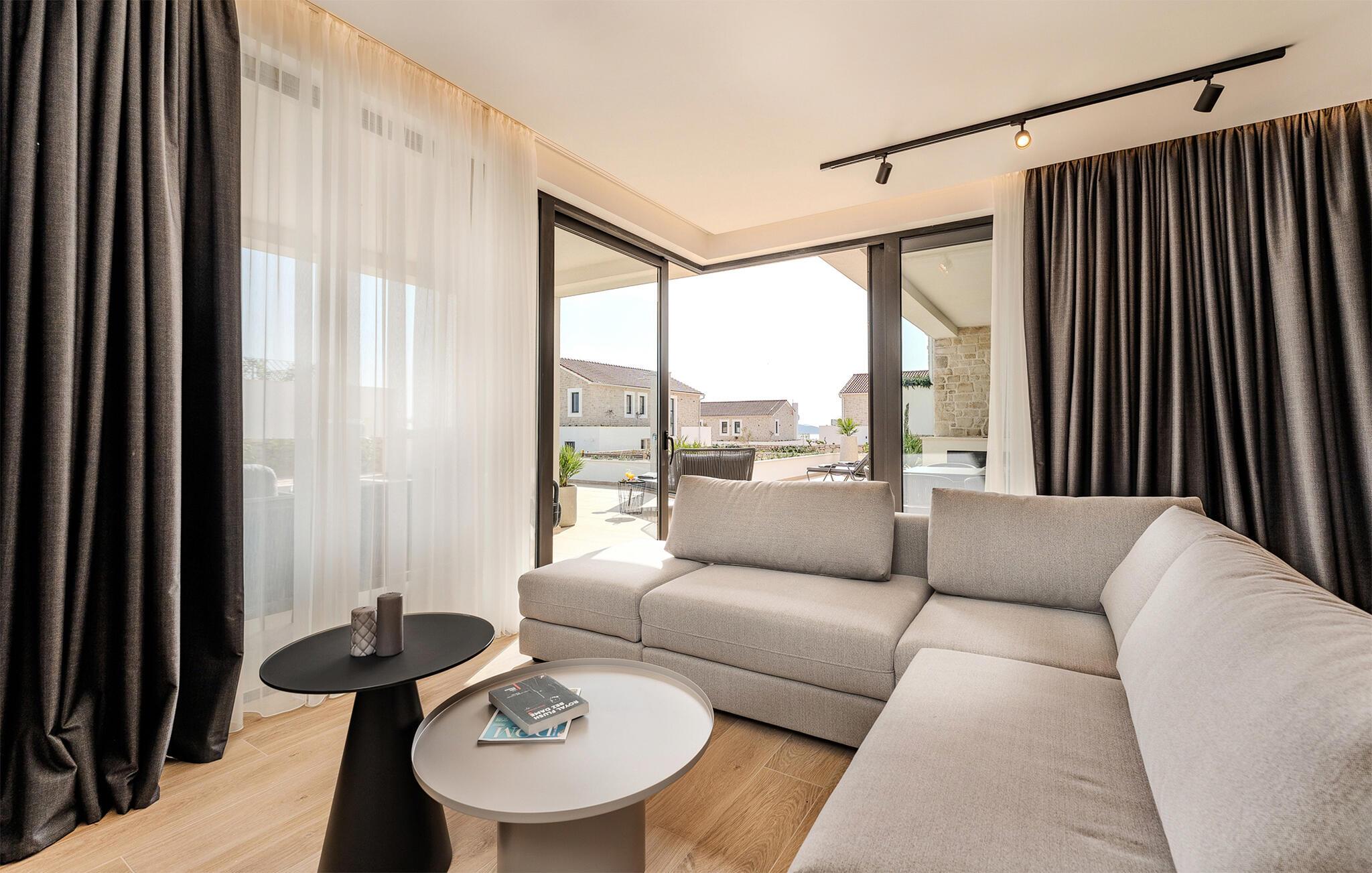 Start dagen i det luksuriøse feriehuset med en kopp kaffe på den romslige terrassen. I oppholdsrommet er det også god plass til å slappe av og hygge seg over måltider eller morsomme brettspill. Slå dere ned ved det elegante spisebordet eller legg føttene opp i sofakroken og se en spennende film. Utenfor byr huset på en rekke muligheter for å nyte feriefritiden. Sett deg på den øvre terrassen og la blikket vandre. Du kan se det glitrende Adriaterhavet i horisonten og glede deg til en herlig badedag med hele familien. Du kan også bruke det overbygde utekjøkkenet til å trylle frem kulinariske spesialiteter og servere dem ved det lange spisebordet. Bassenget byr på forfriskende øyeblikk og moro for store og små. Det er også mange muligheter for utendørs sportsaktiviteter.