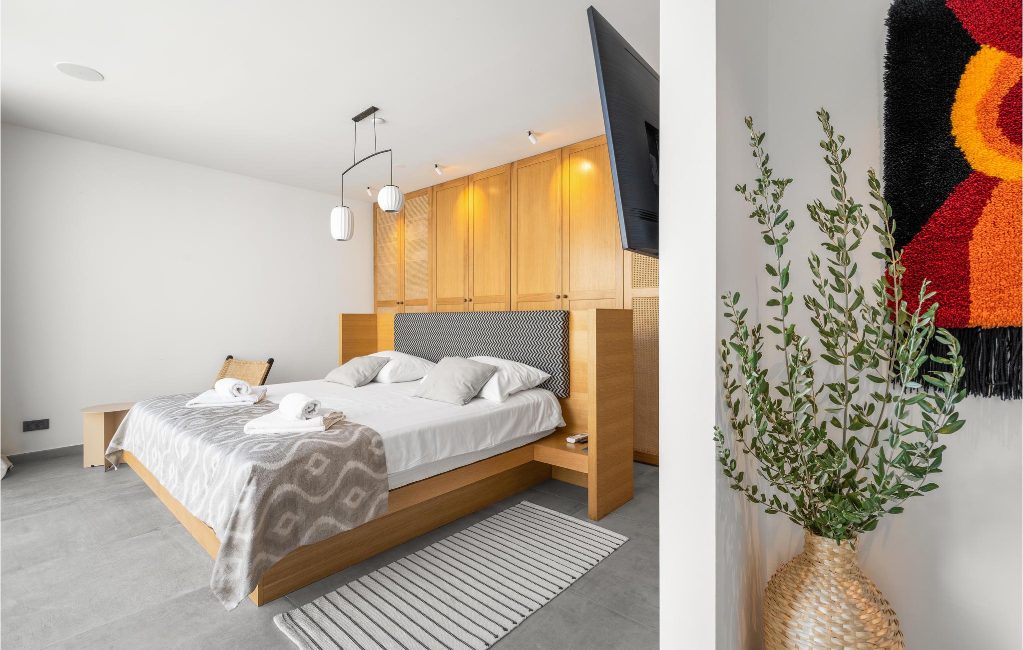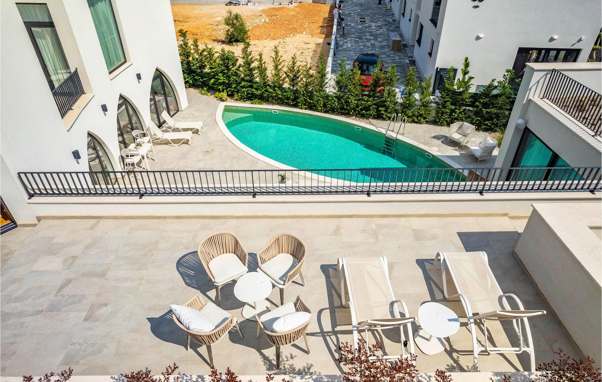 Utenfor tilbyr det vakre bassengområdet med terrasse ideelle forhold for å komme vekk fra alt og nyte ferien. Her kan du slappe av på solsengene og kjøle deg ned i bassenget på varme dager. Fra takterrassen har du en vakker utsikt over havet.